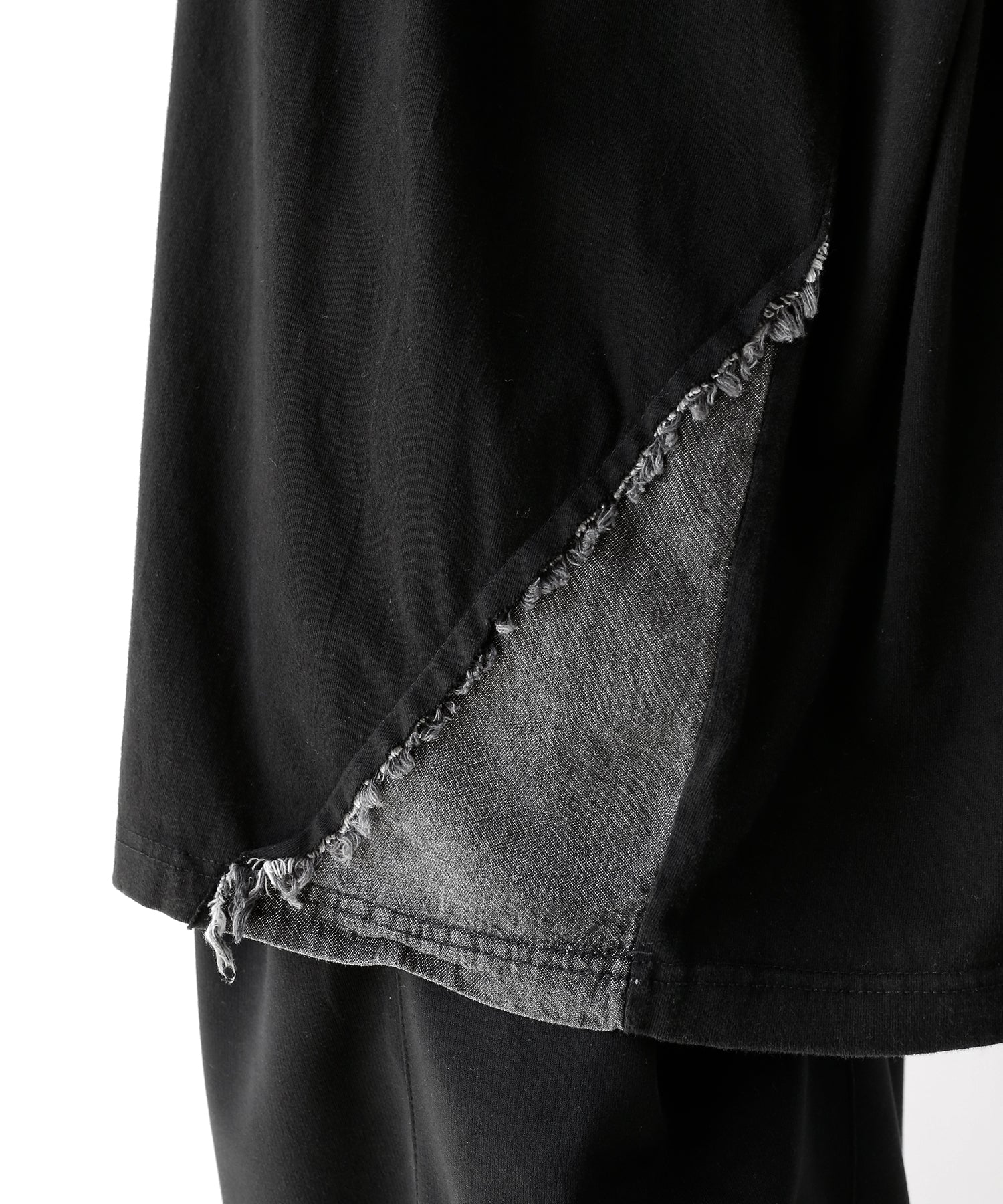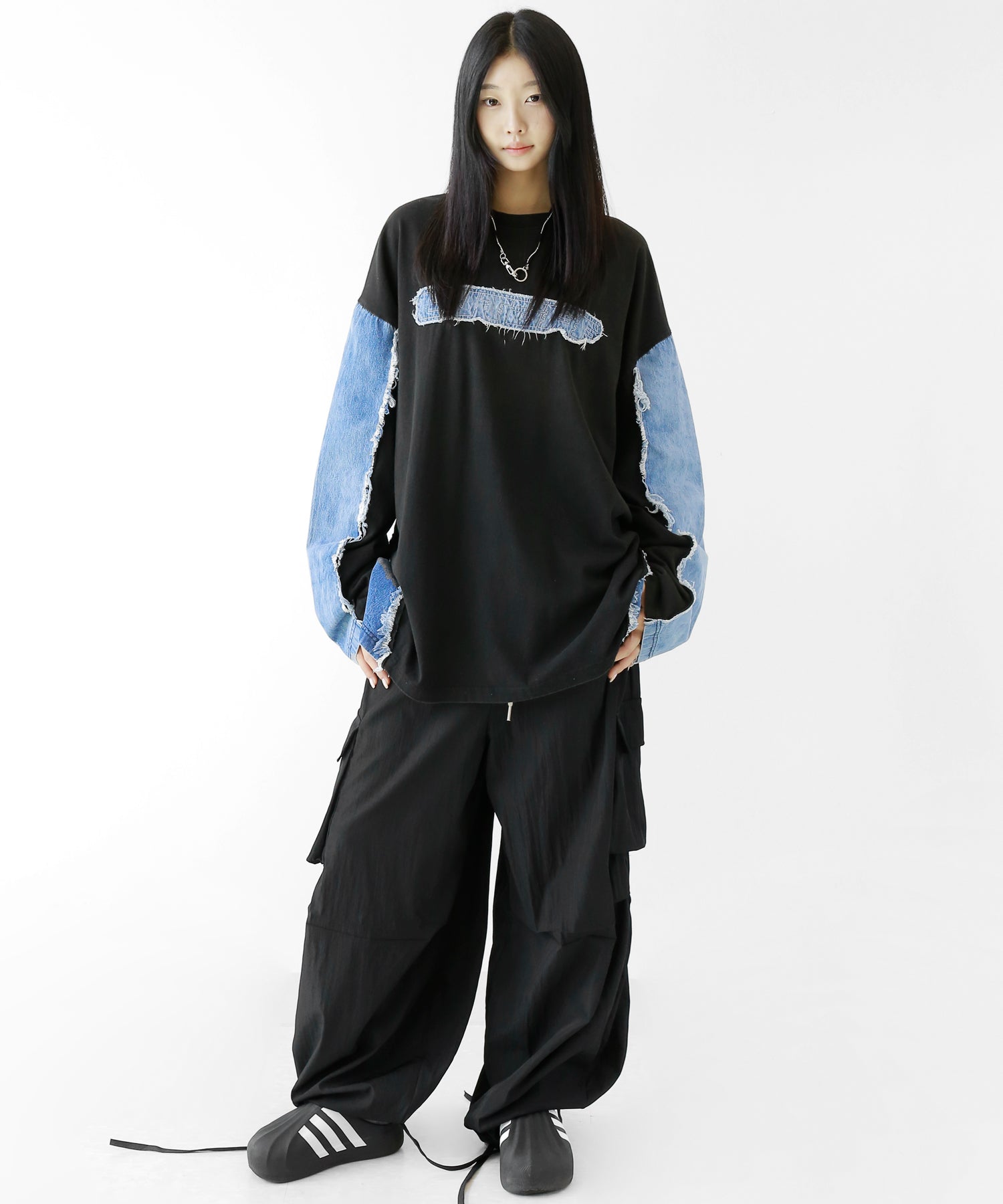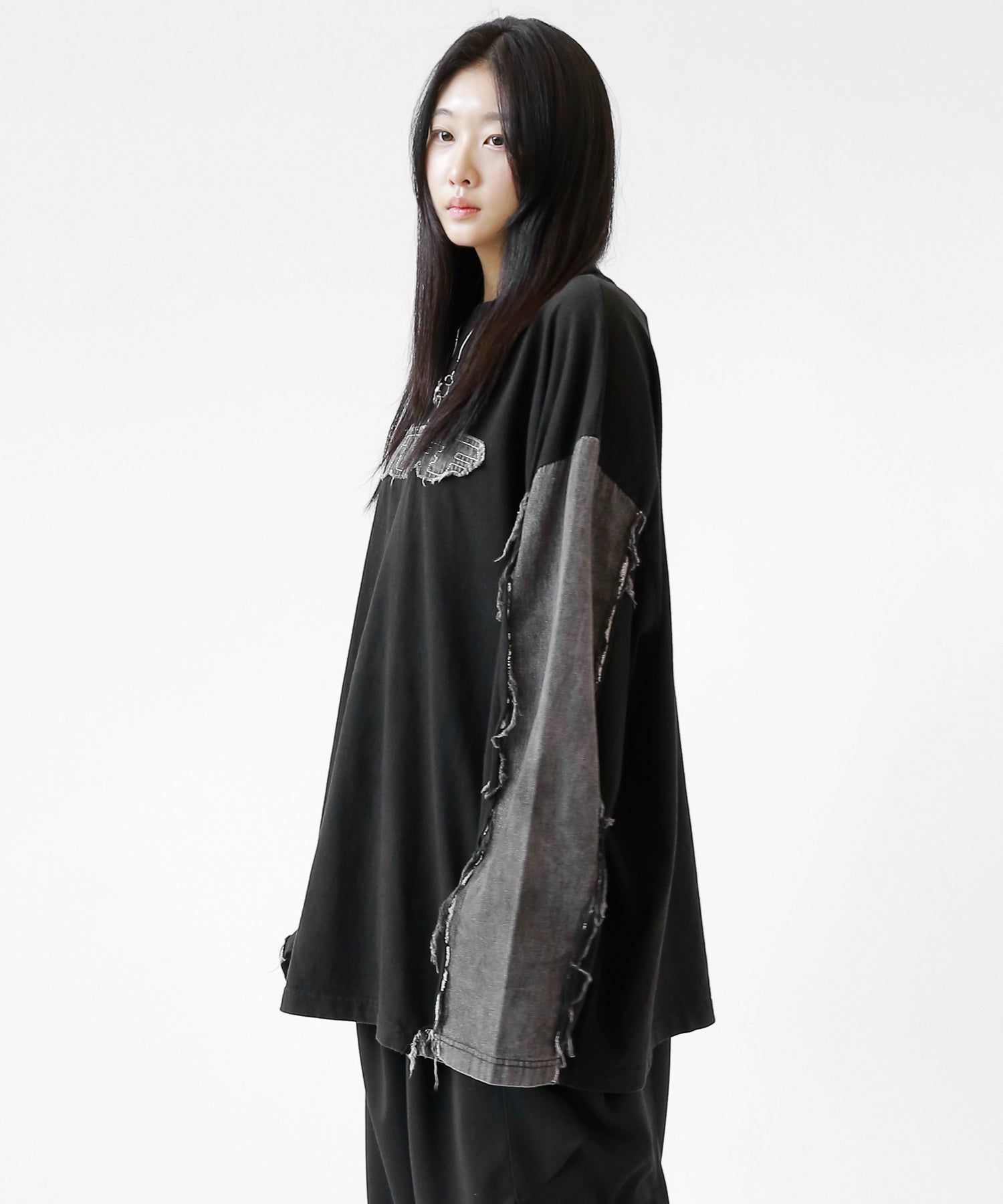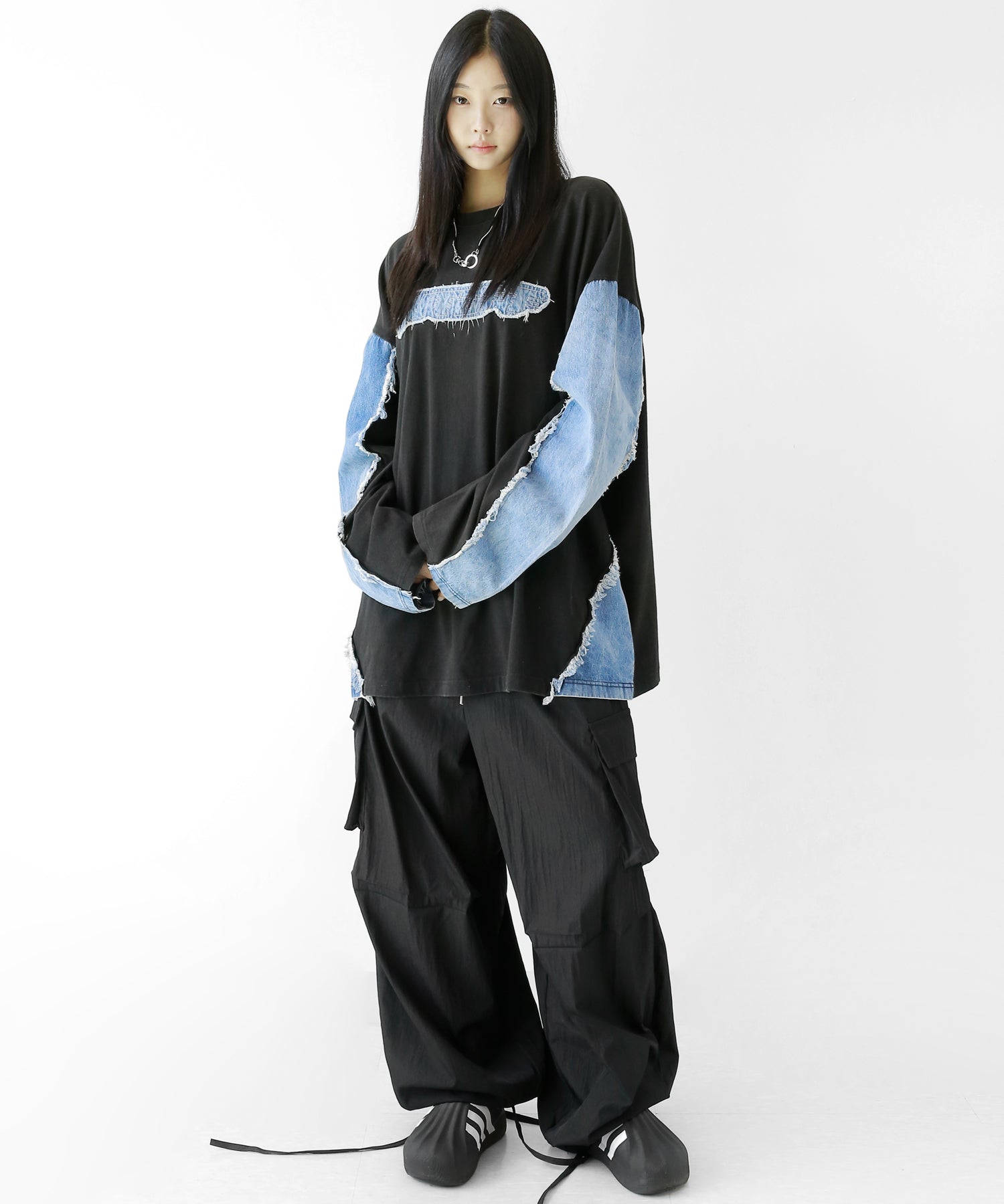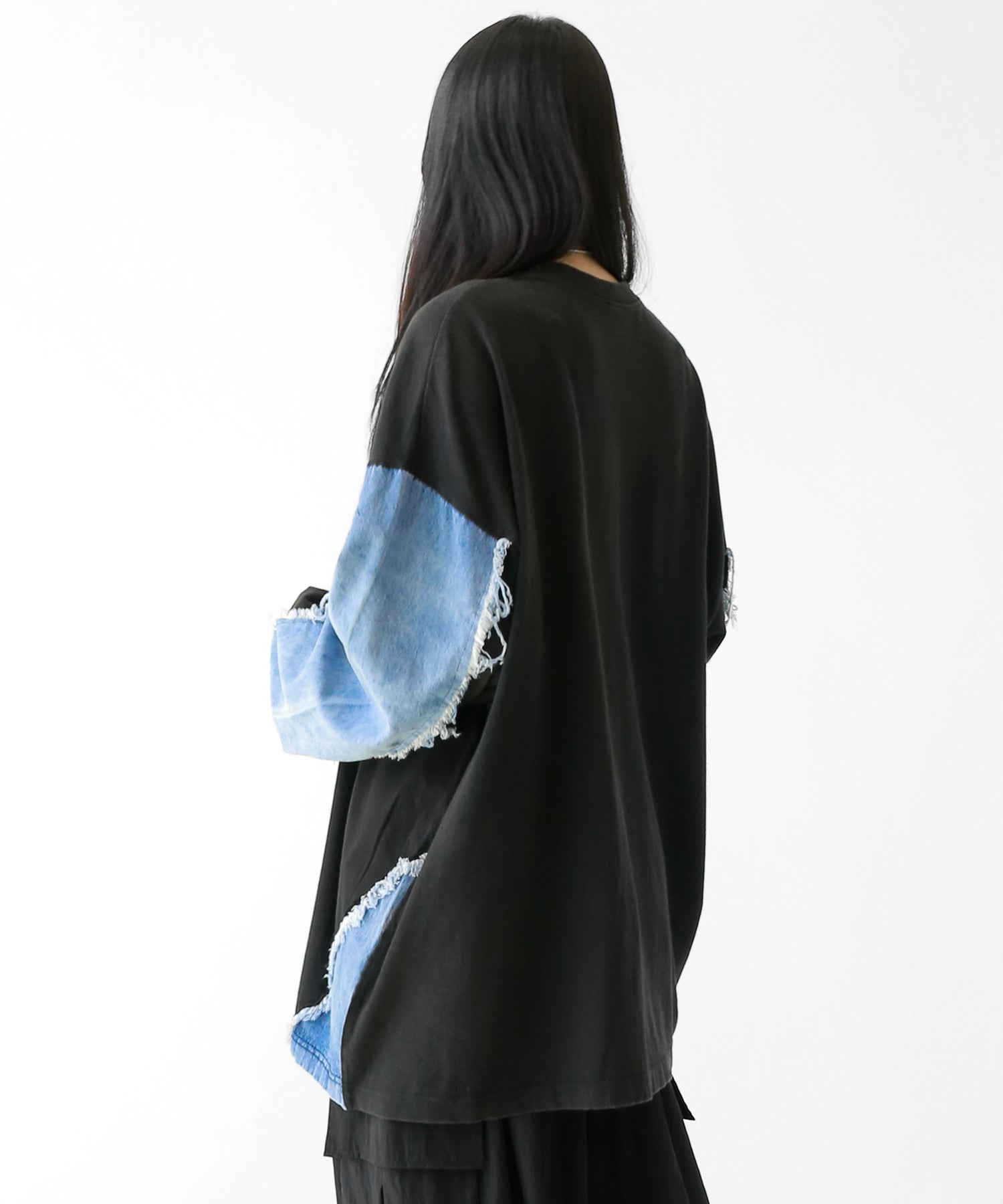 A bold long sleeve tee featuring denim sleeve and side panels with raw-cut details. The denim chest logo adds a subtle touch, blending street and casual aesthetics into one standout piece.