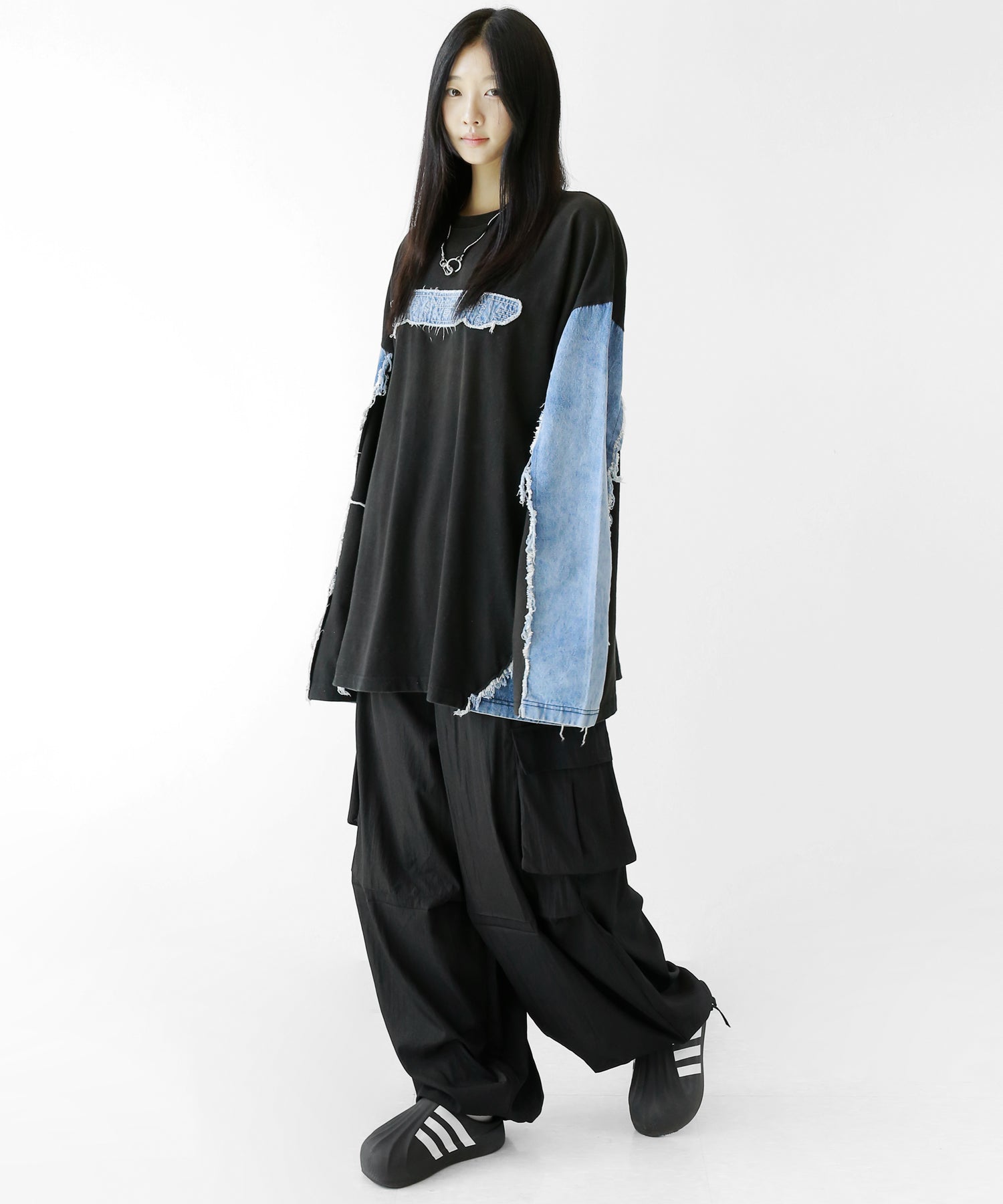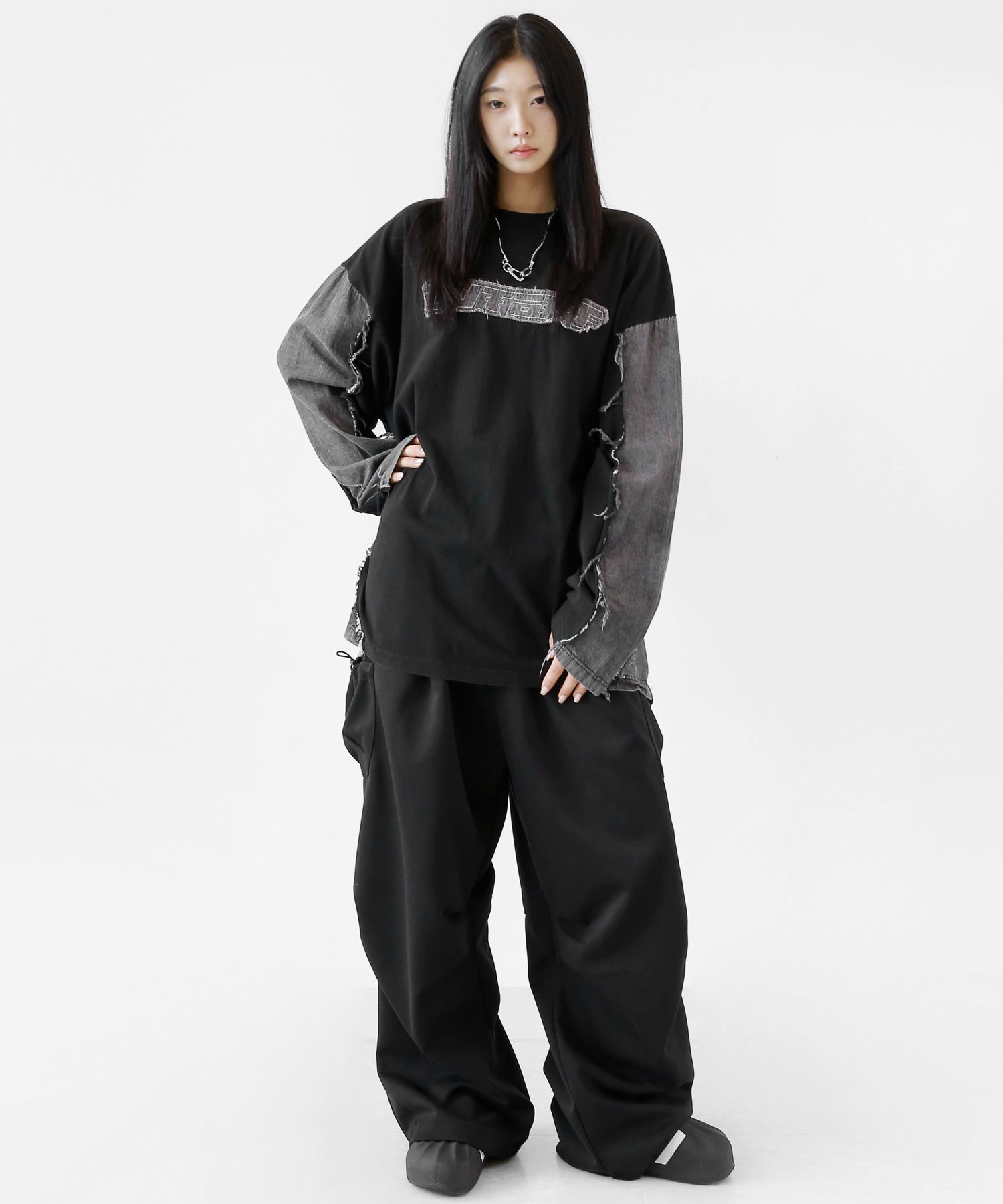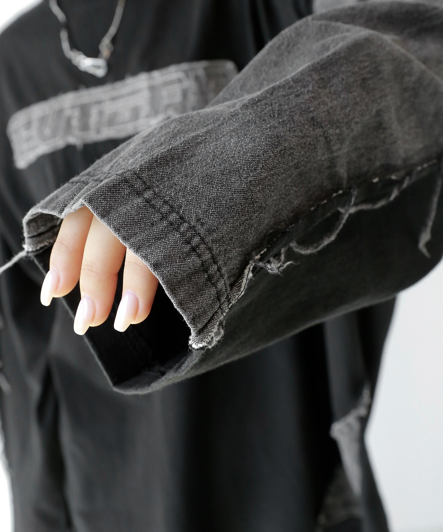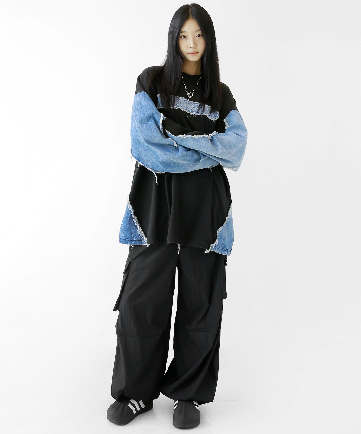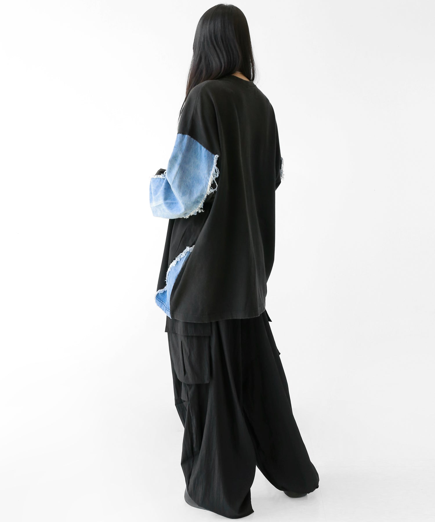 A bold long sleeve tee featuring denim sleeve and side panels with raw-cut details. The denim chest logo adds a subtle touch, blending street and casual aesthetics into one standout piece.