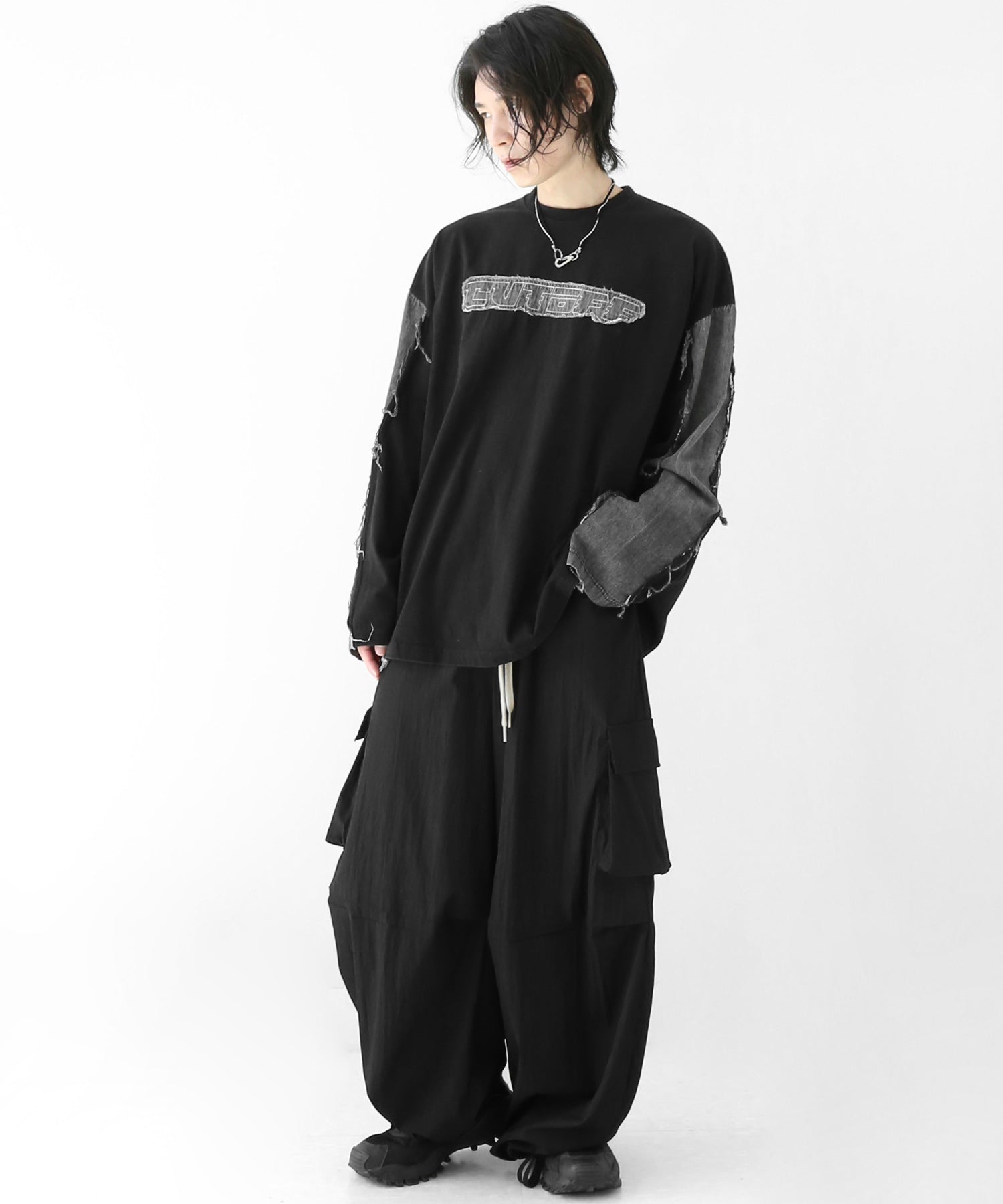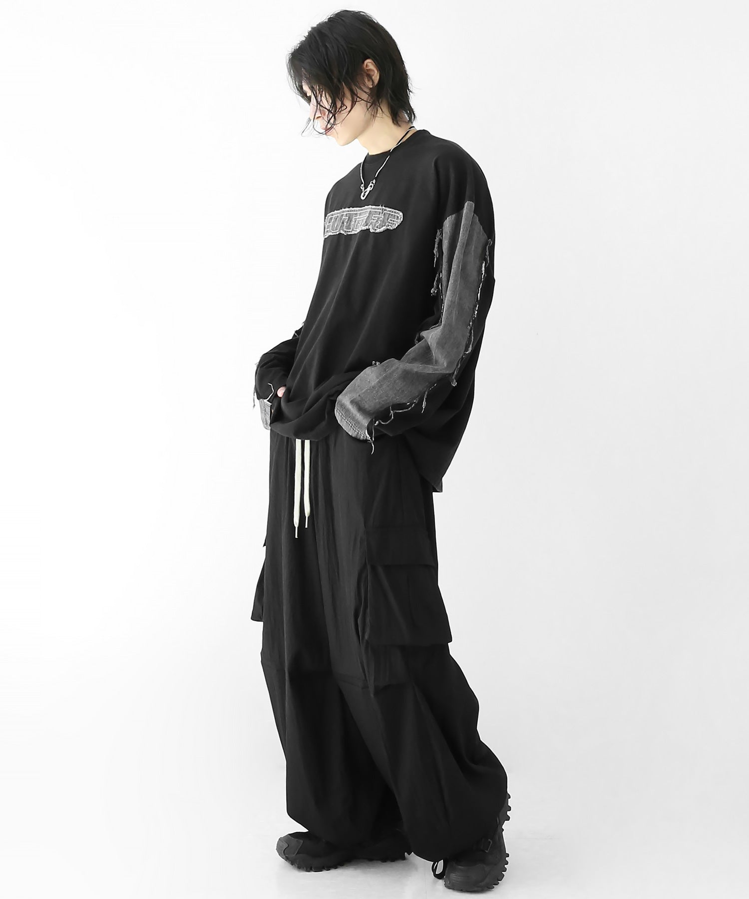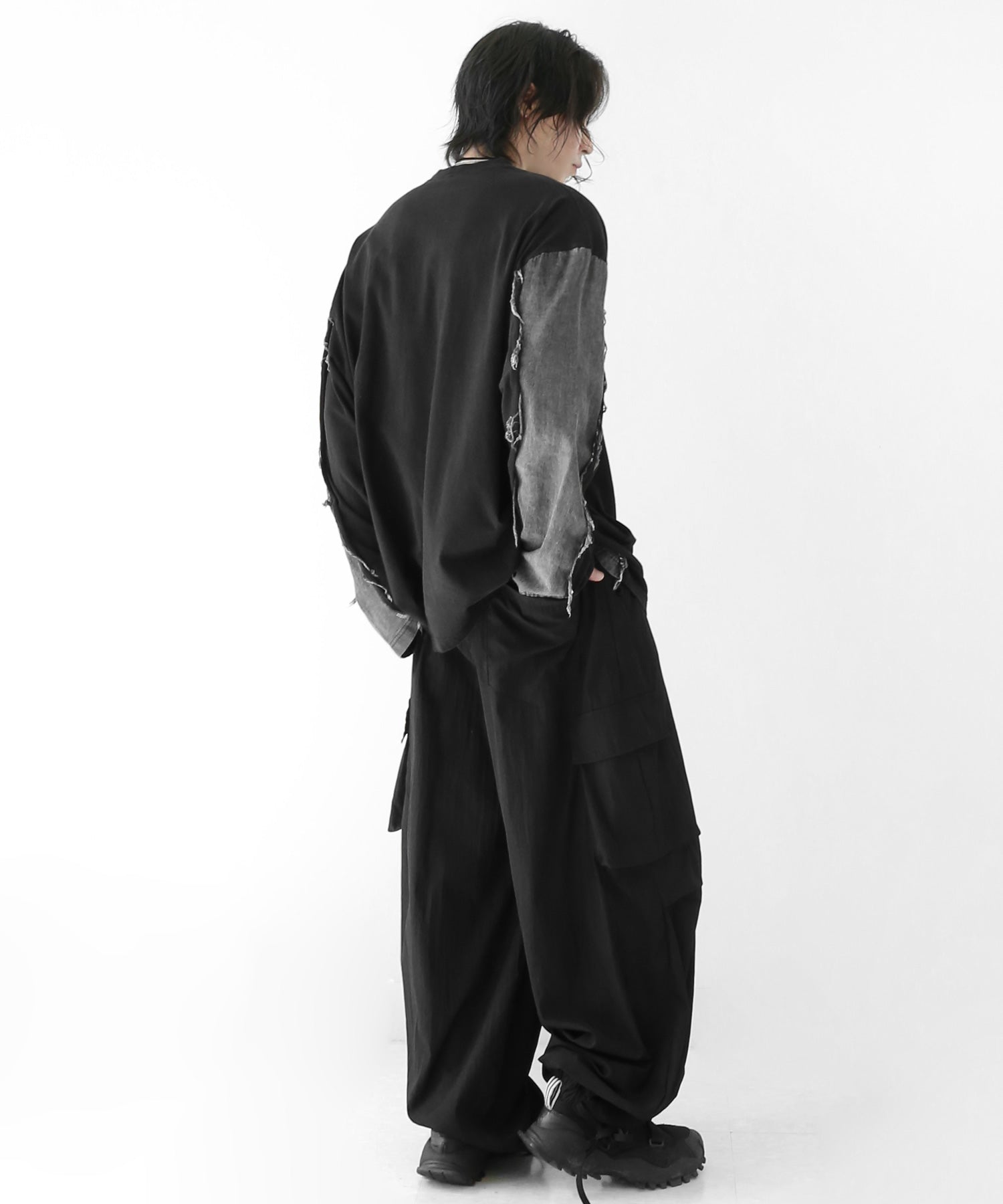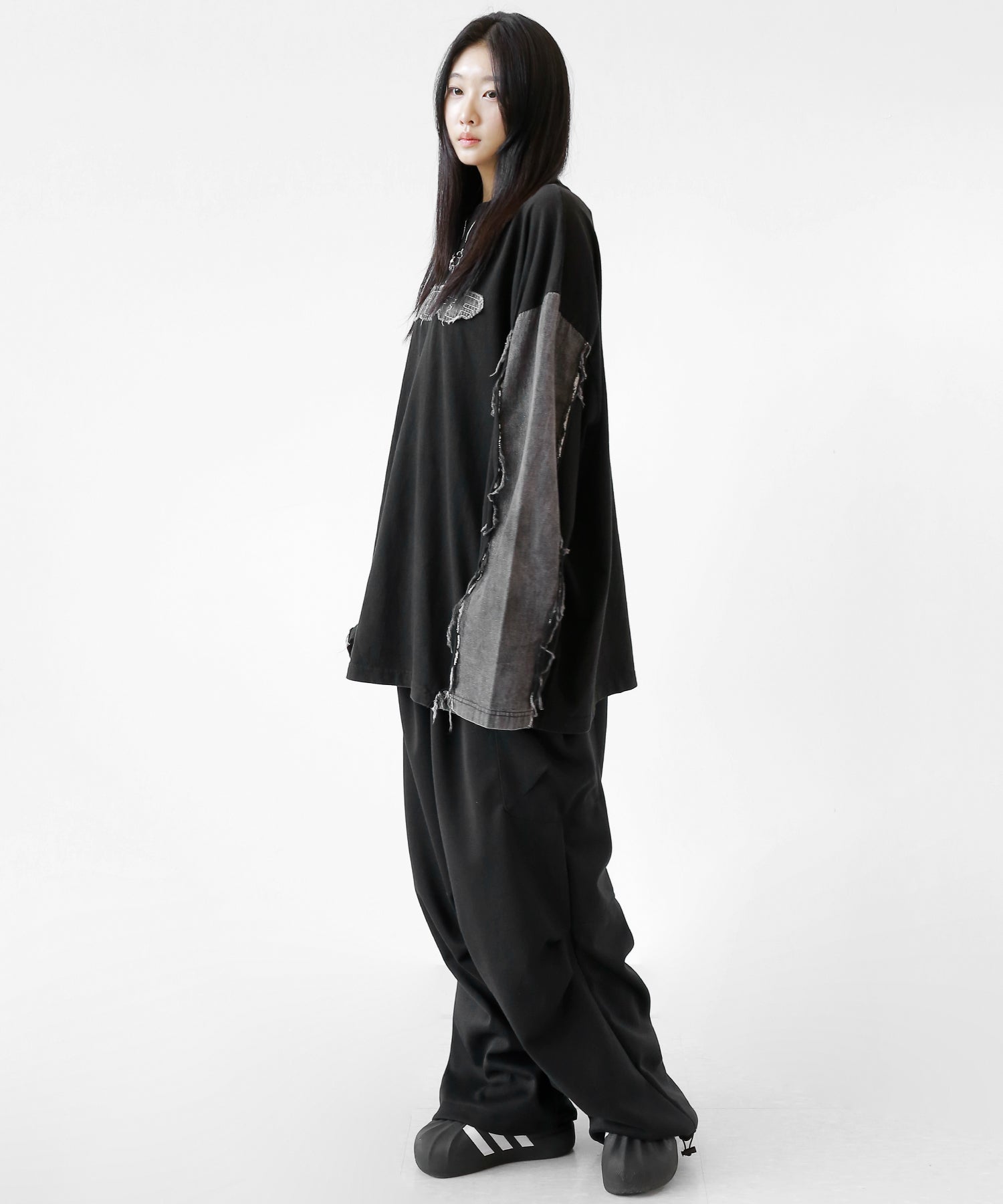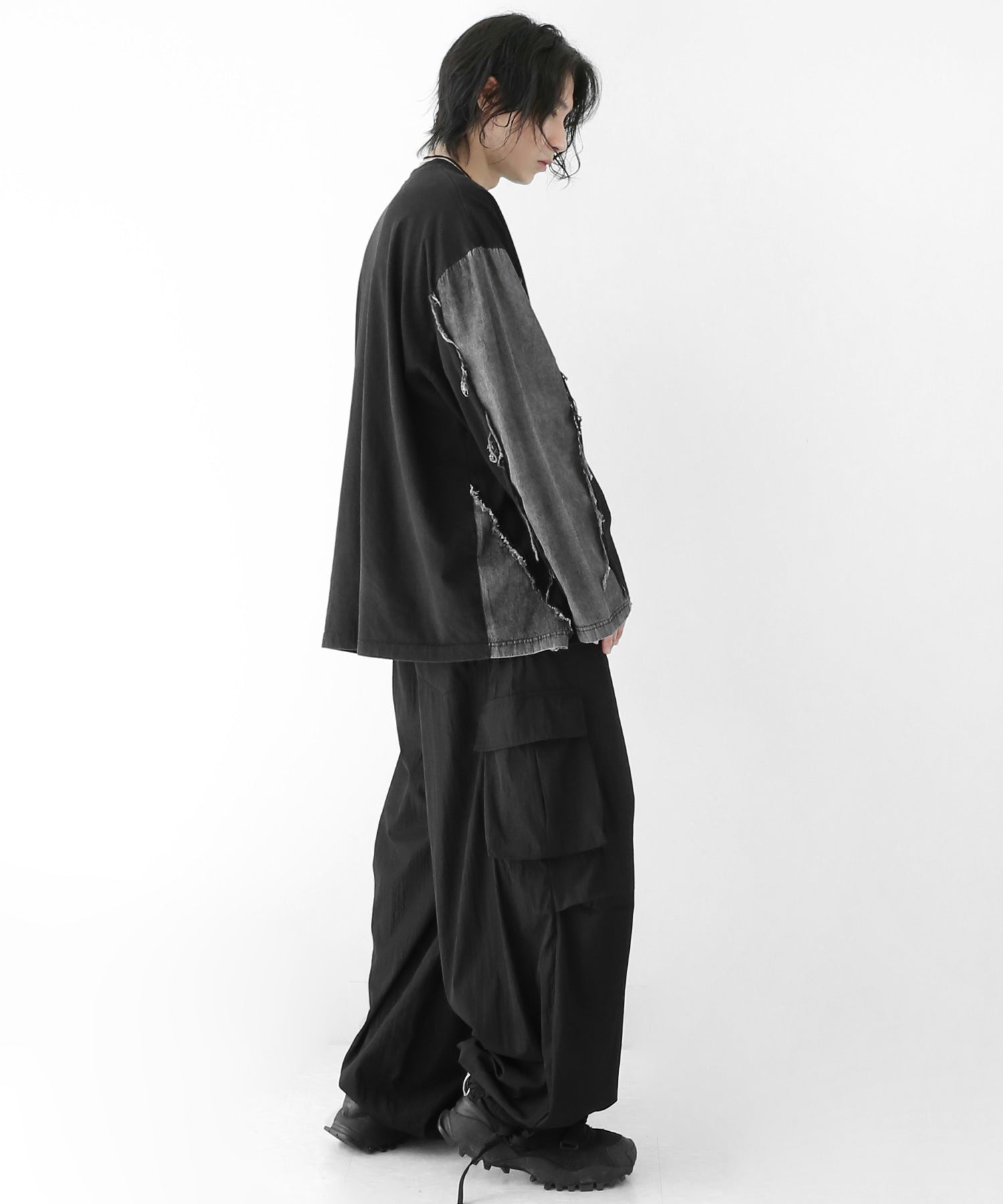 A bold long sleeve tee featuring denim sleeve and side panels with raw-cut details. The denim chest logo adds a subtle touch, blending street and casual aesthetics into one standout piece.
