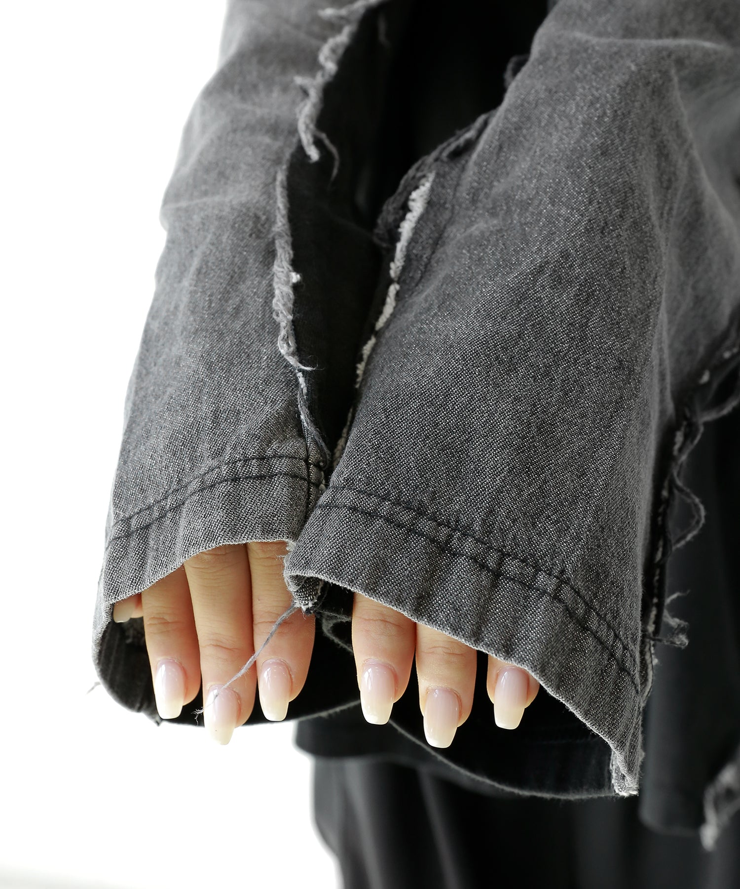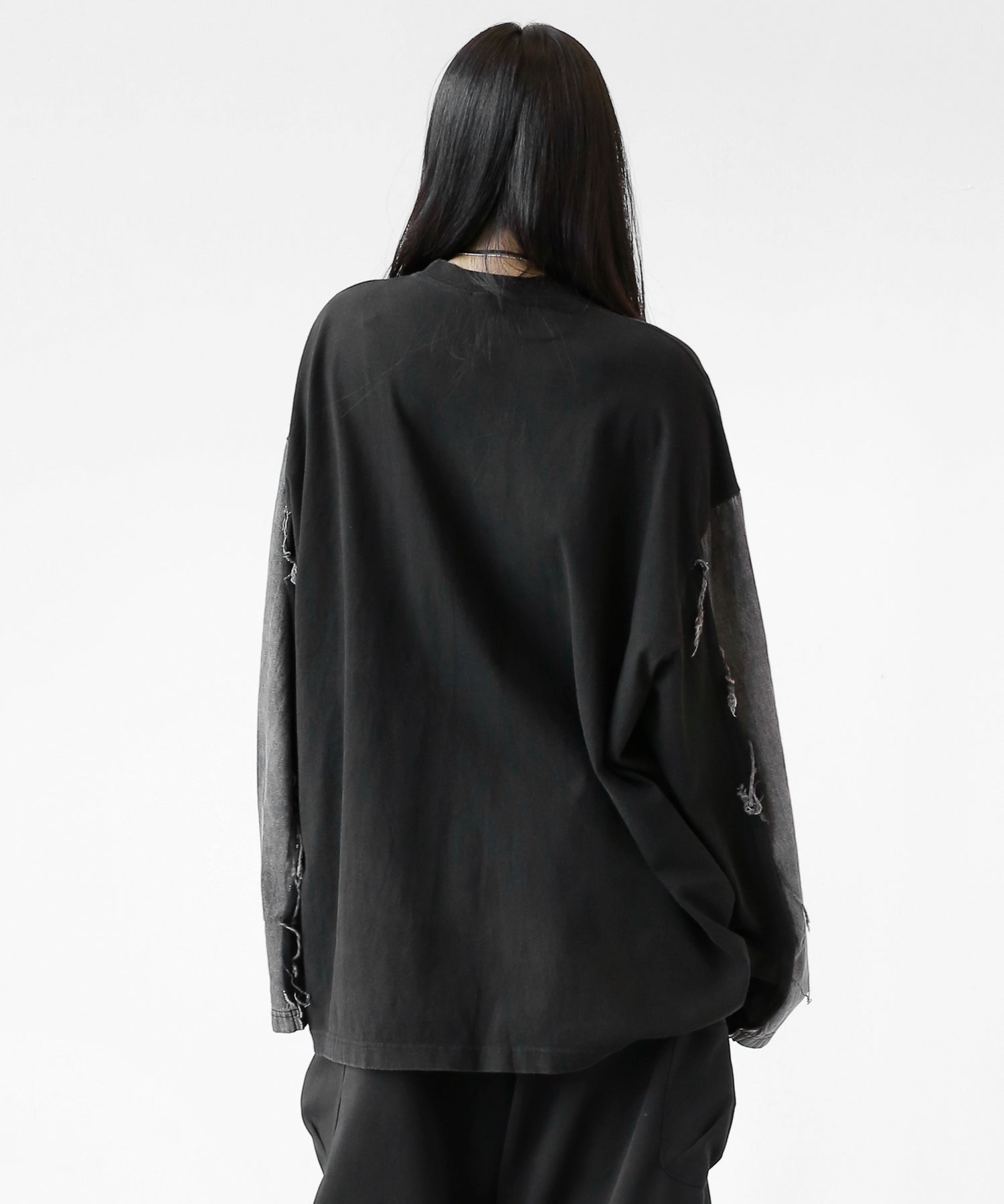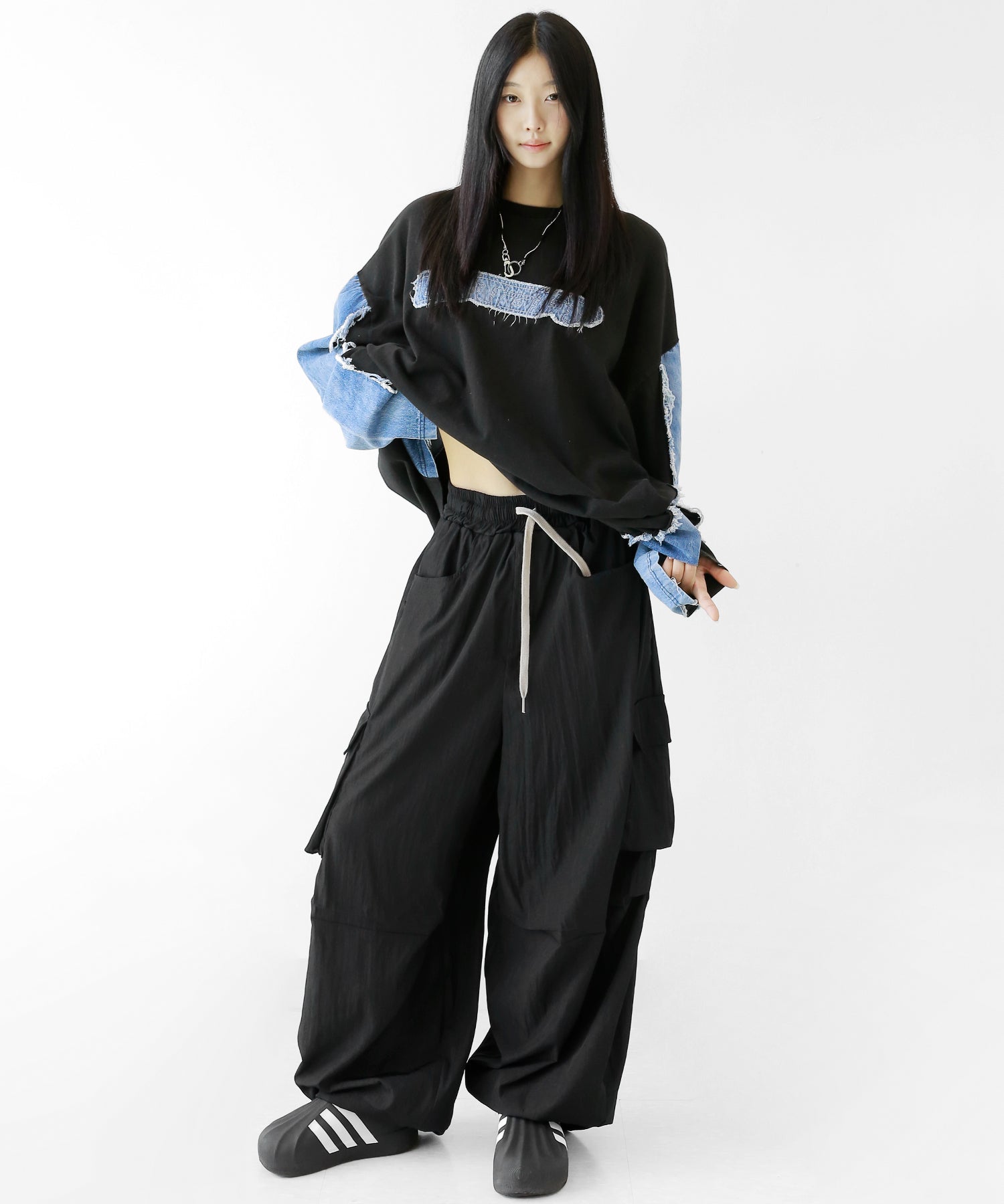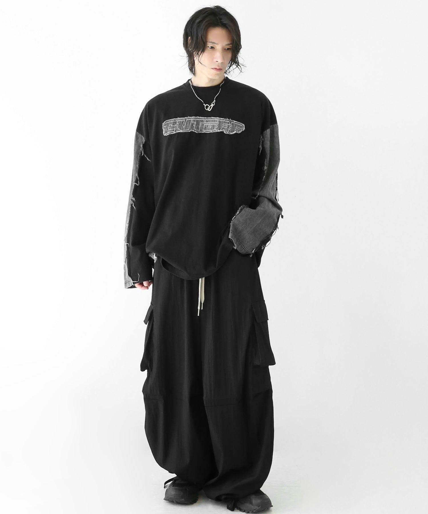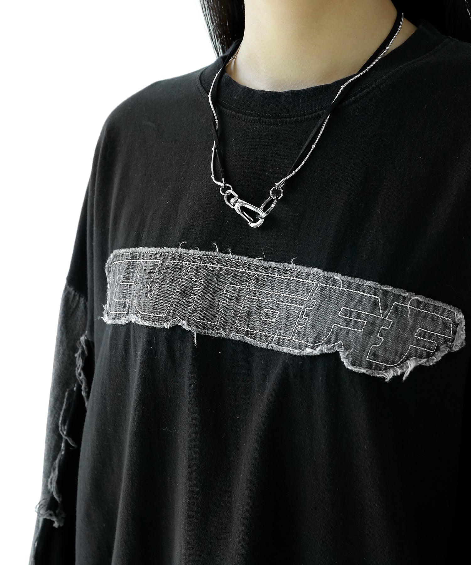 A bold long sleeve tee featuring denim sleeve and side panels with raw-cut details. The denim chest logo adds a subtle touch, blending street and casual aesthetics into one standout piece.