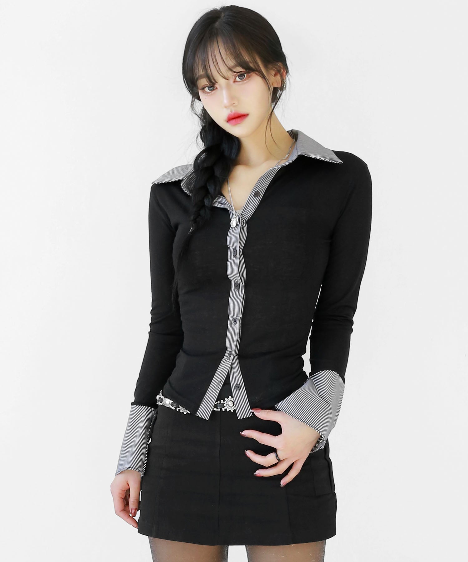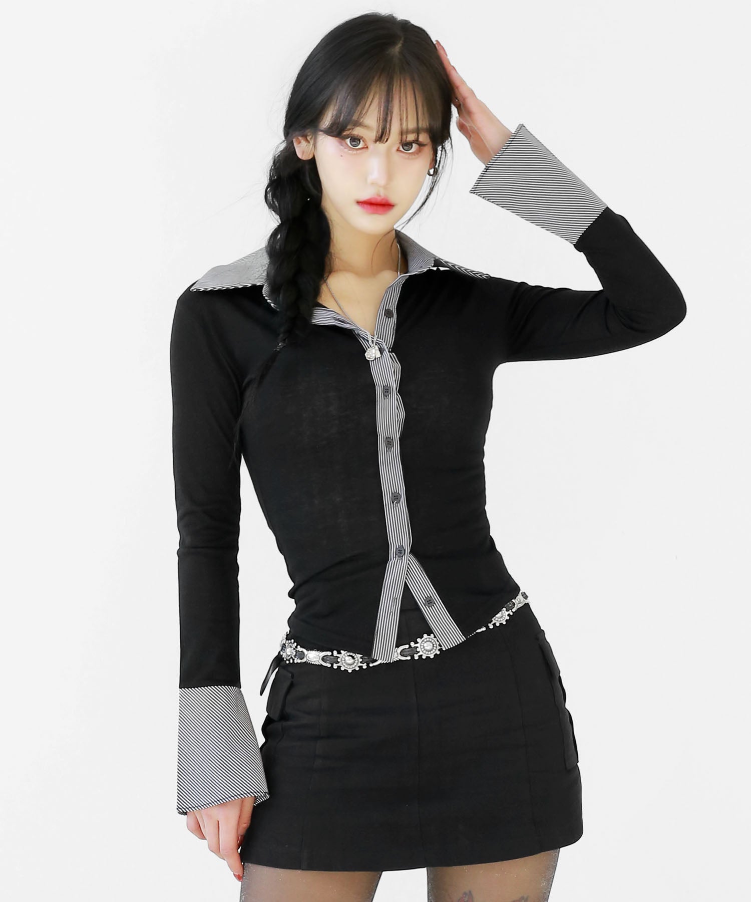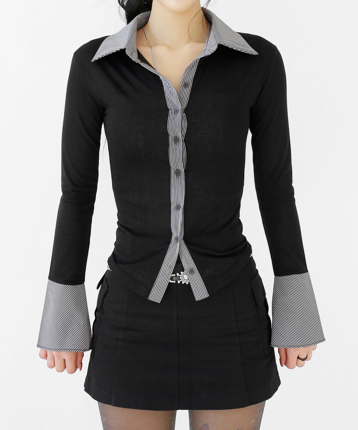 A sheer blouse with bold contrast accents and a sleek slim fit, loved by 20s–30s fashion lovers in Korea and Japan.