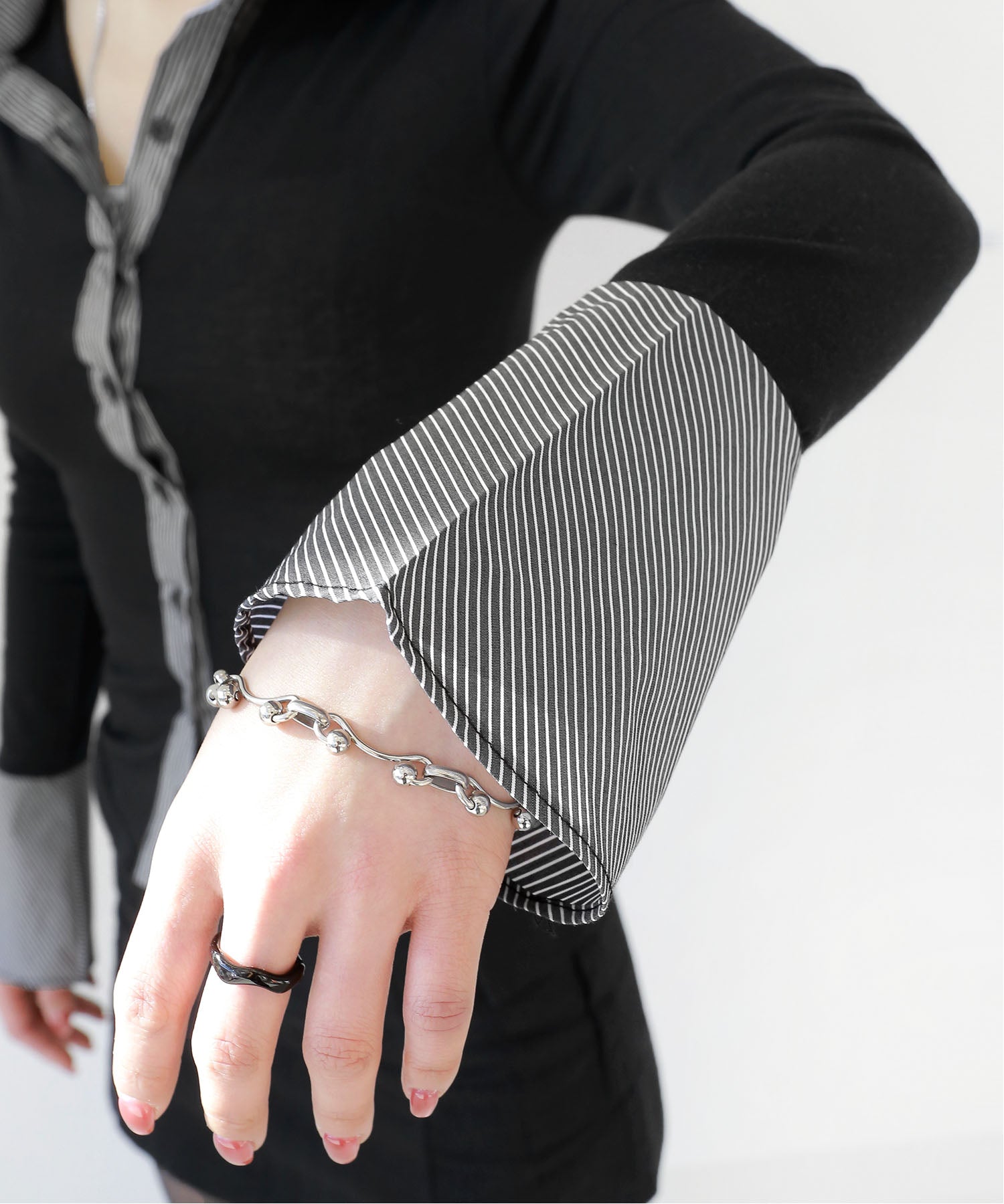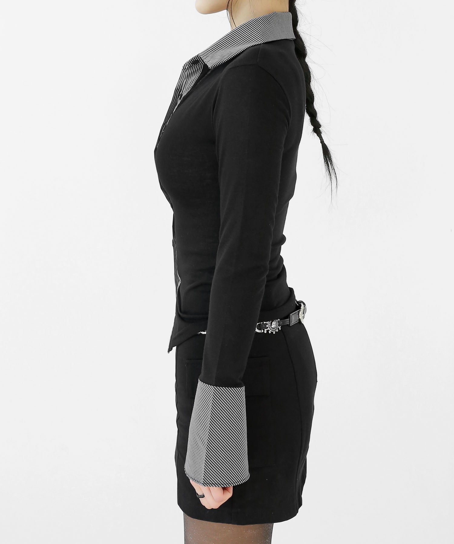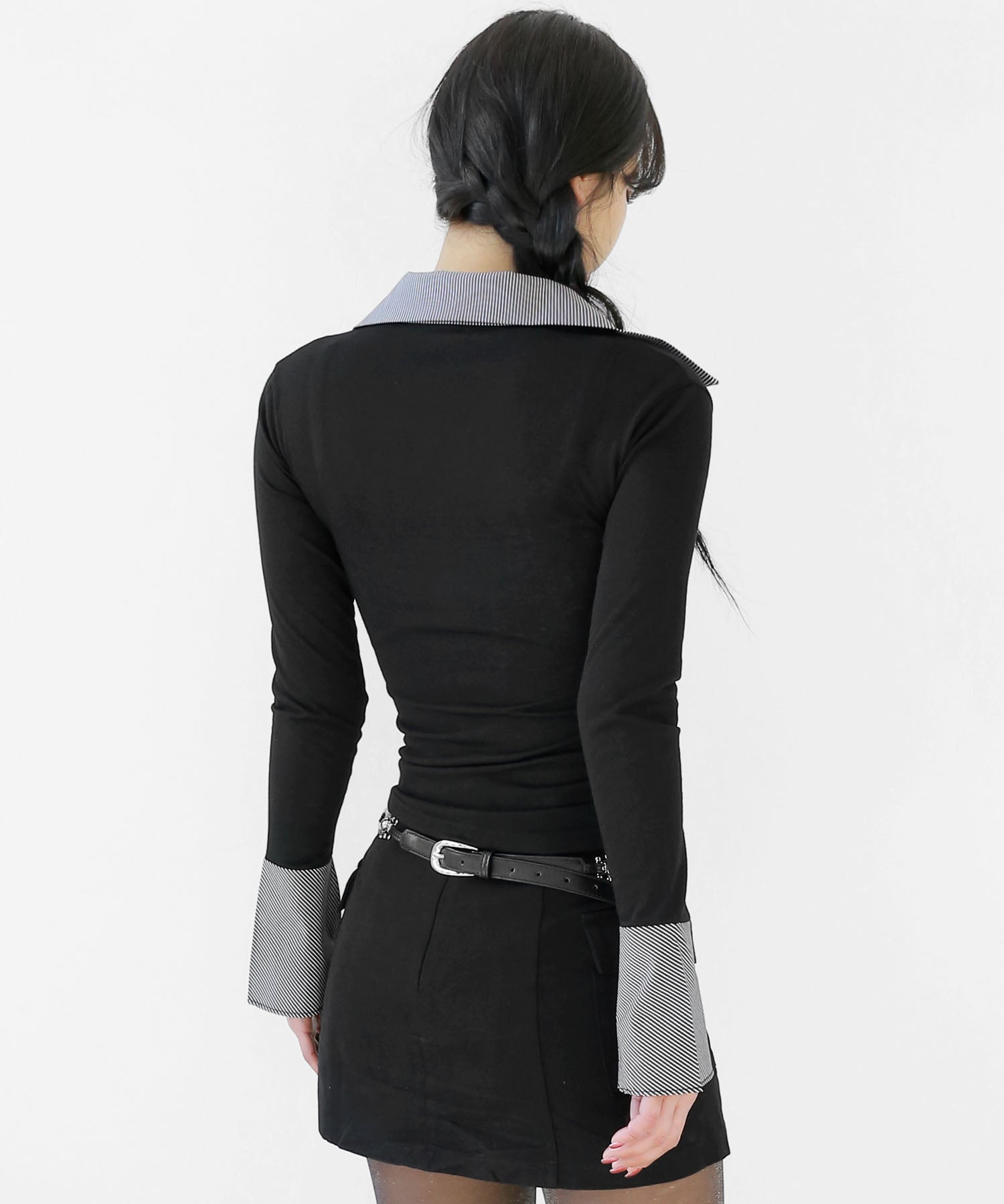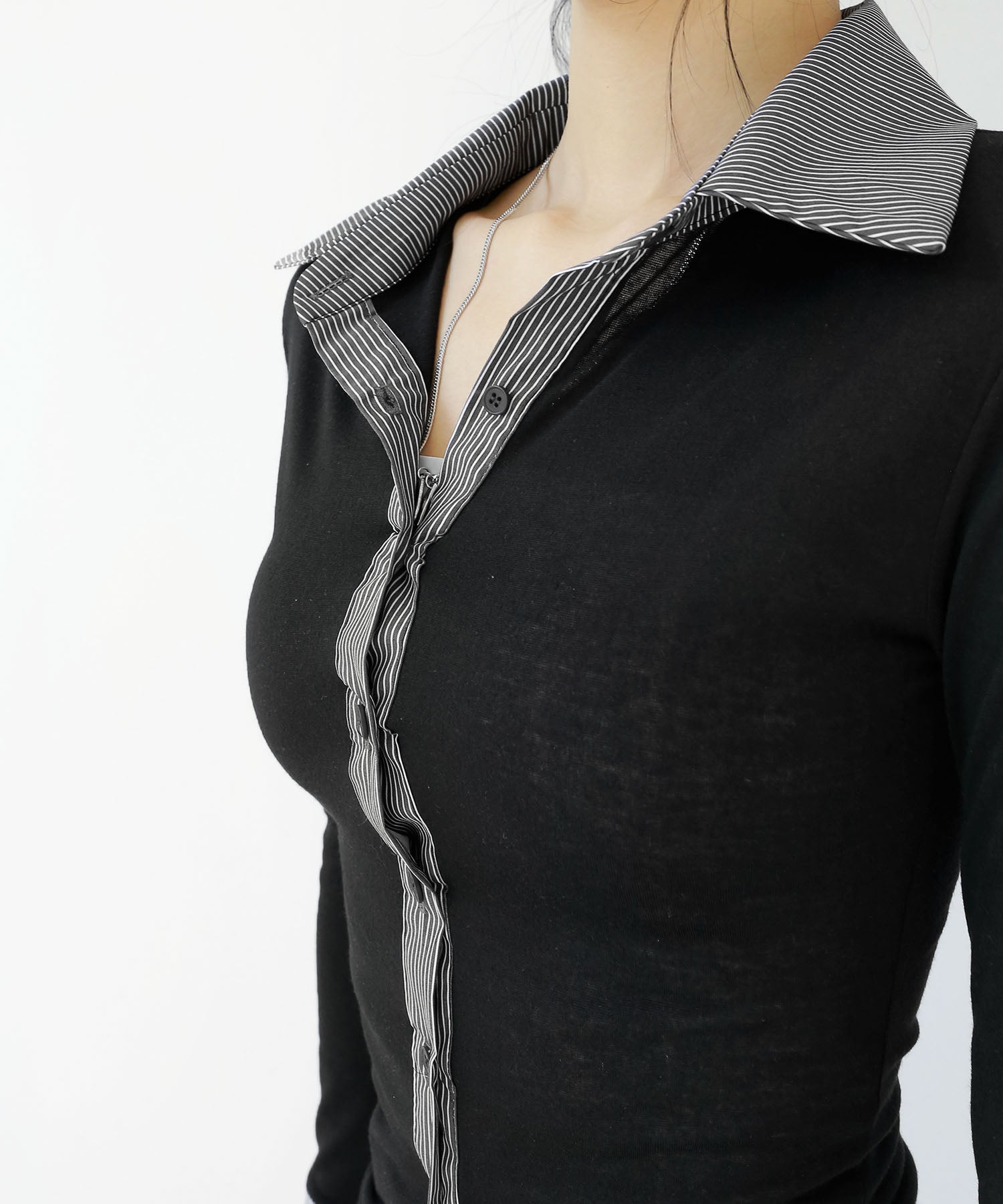 A sheer blouse with bold contrast accents and a sleek slim fit, loved by 20s–30s fashion lovers in Korea and Japan.