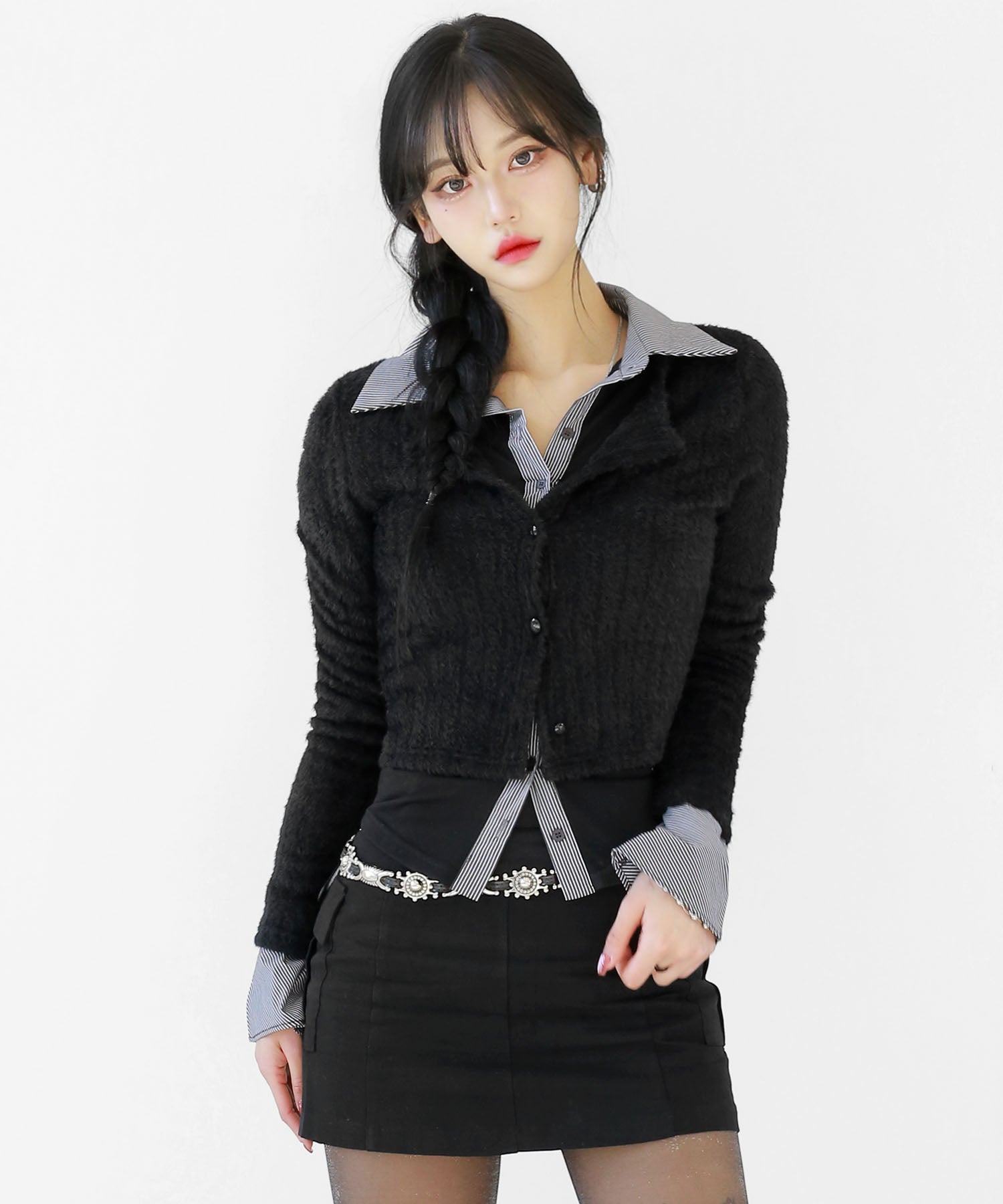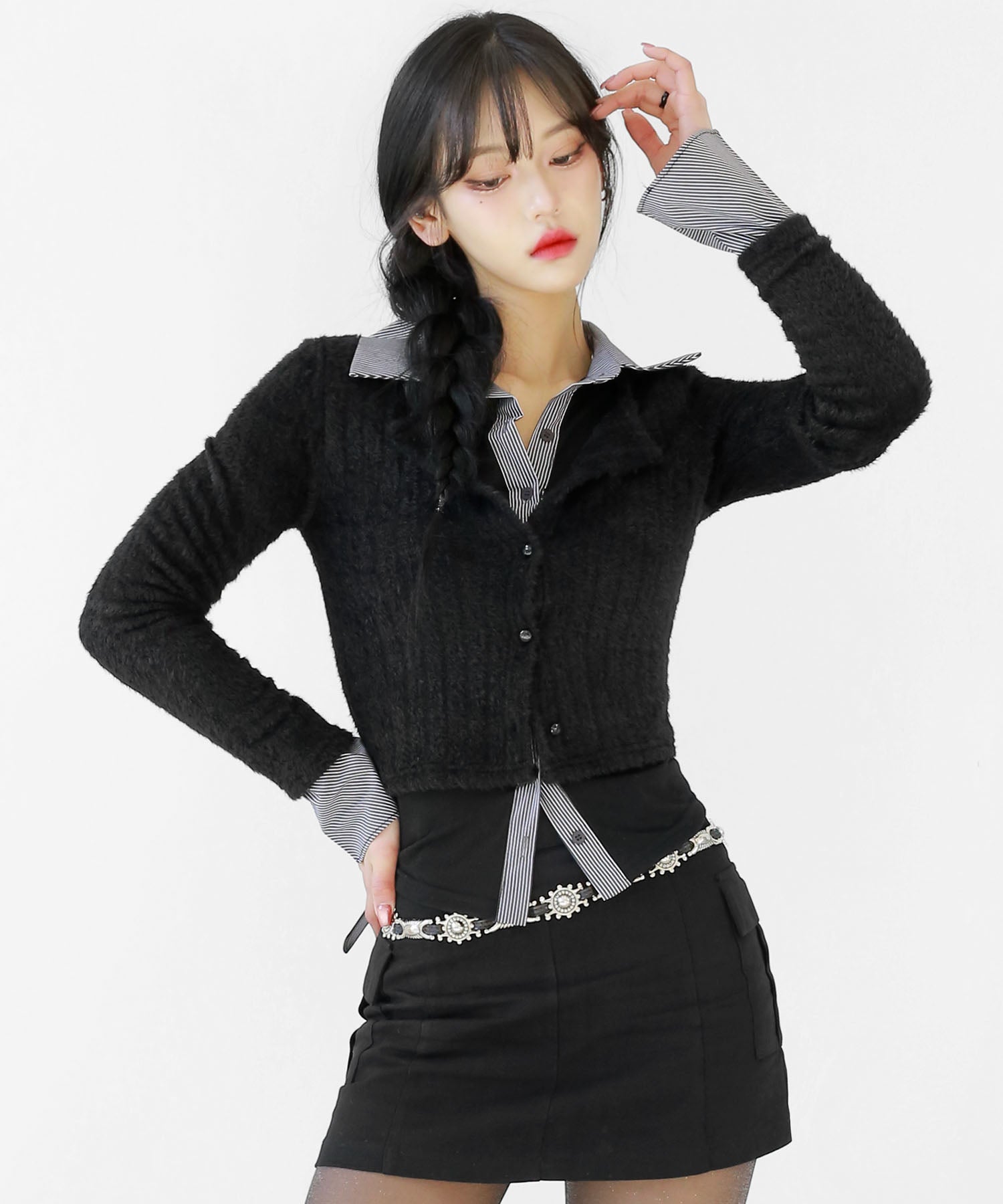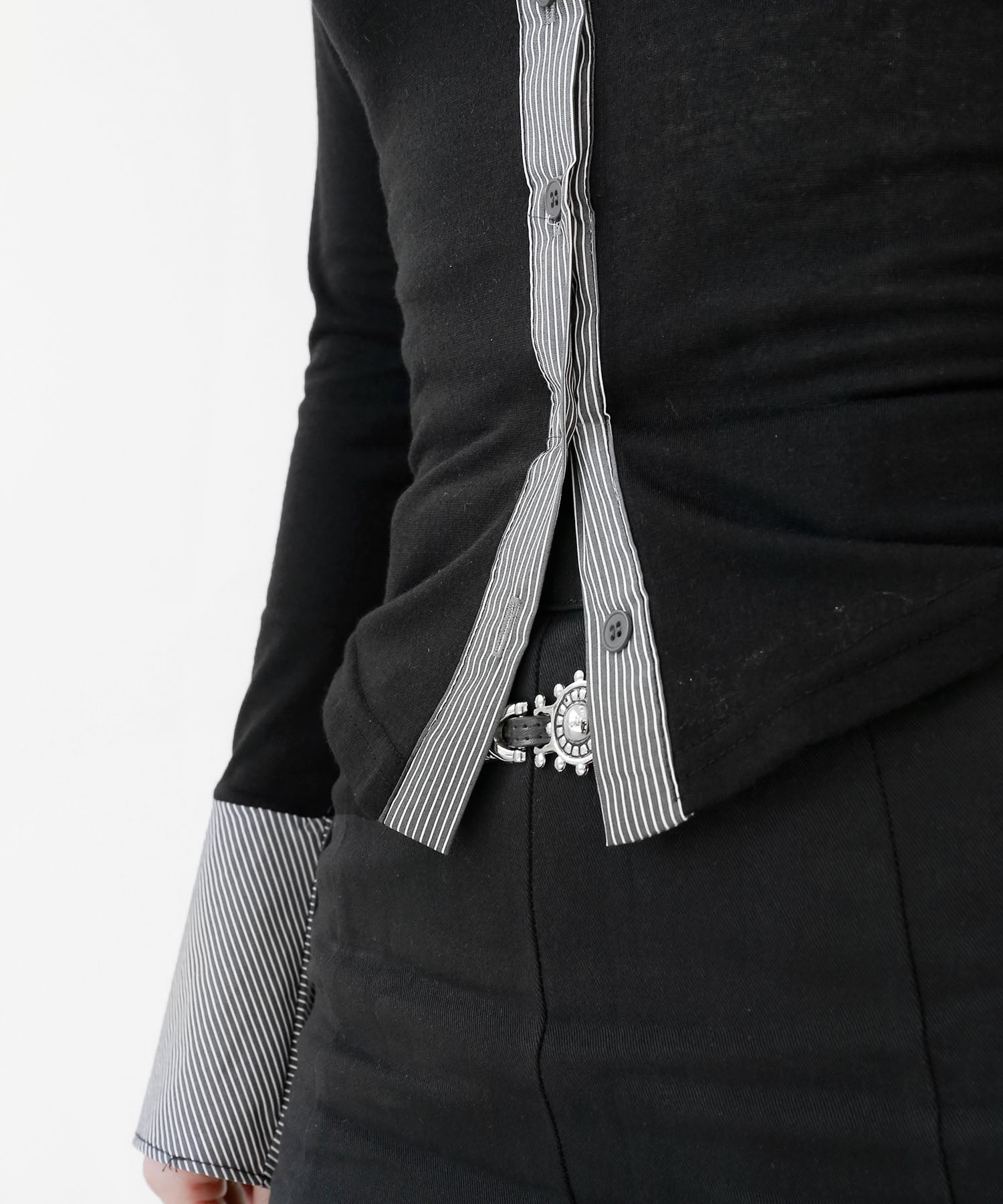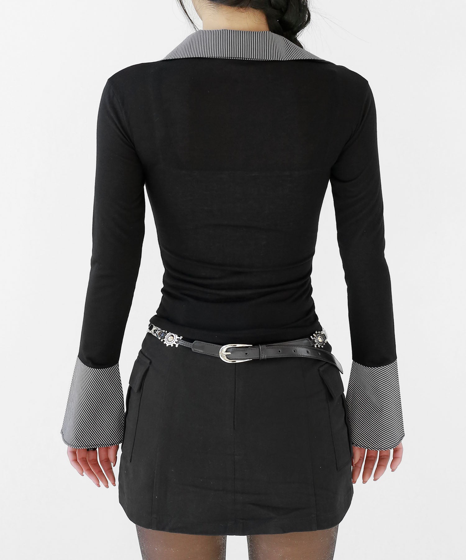 The stripe panel and flared cuffs bring a soft, refined edge—perfect for both skirts and trousers.