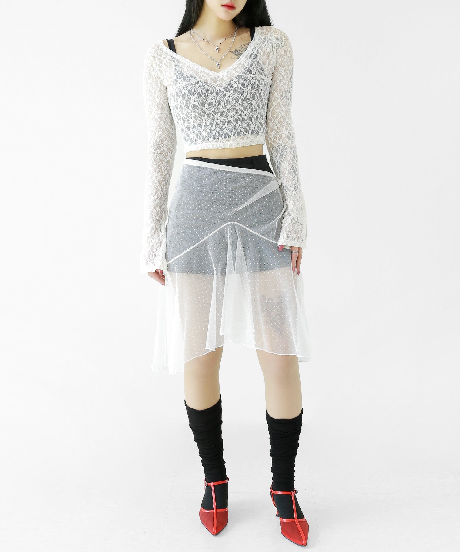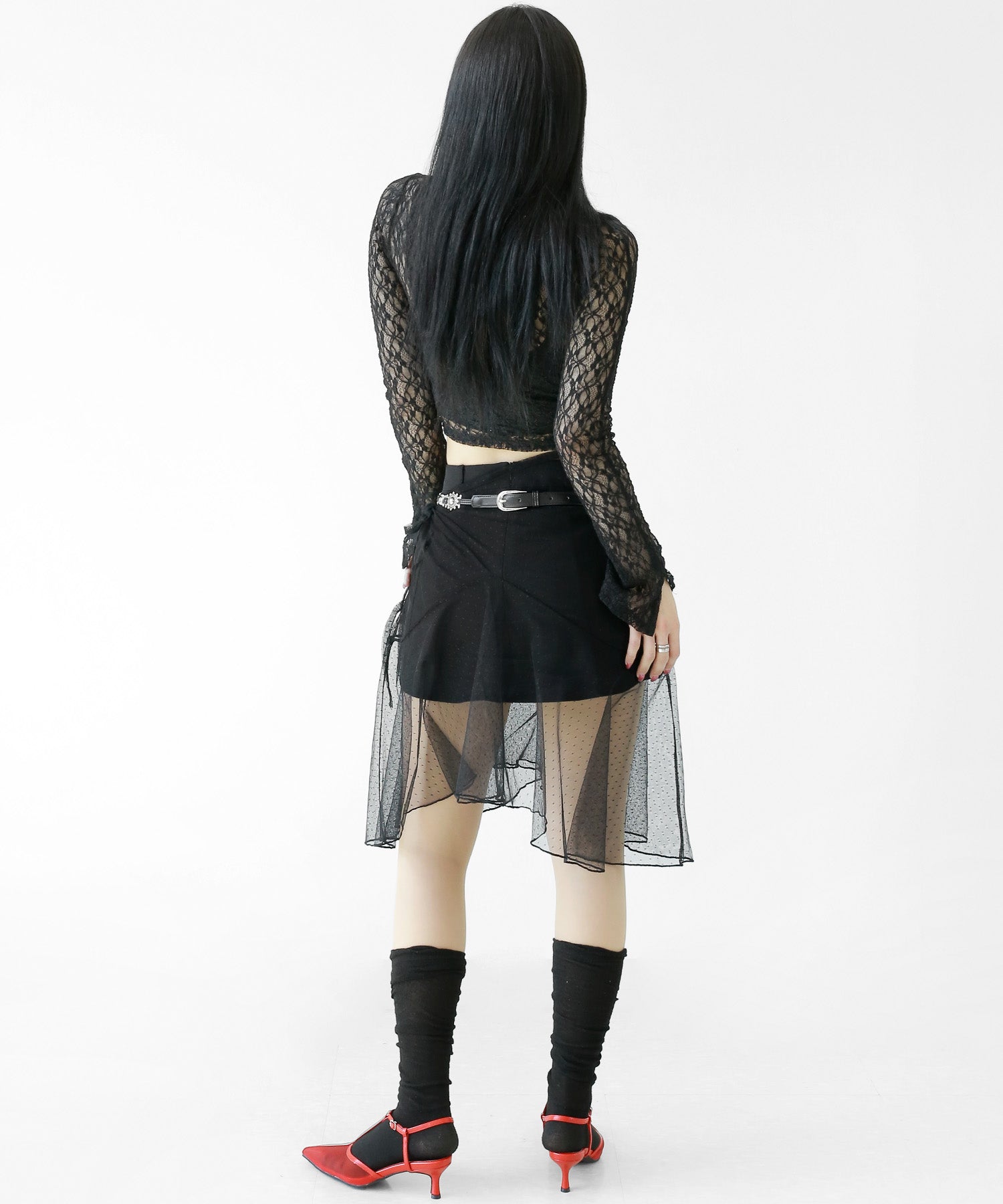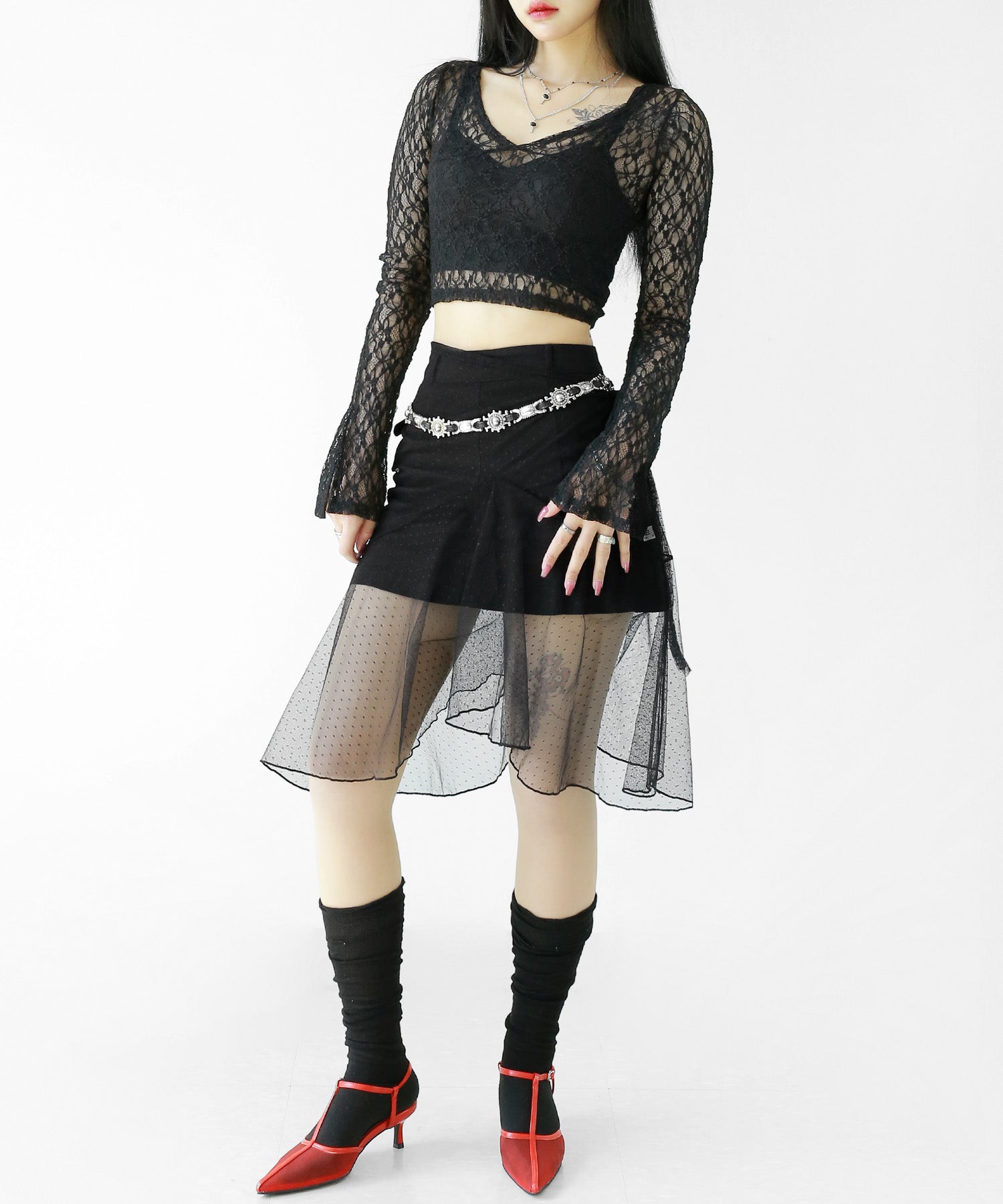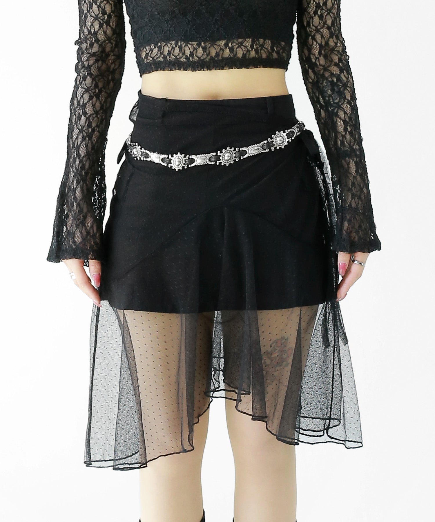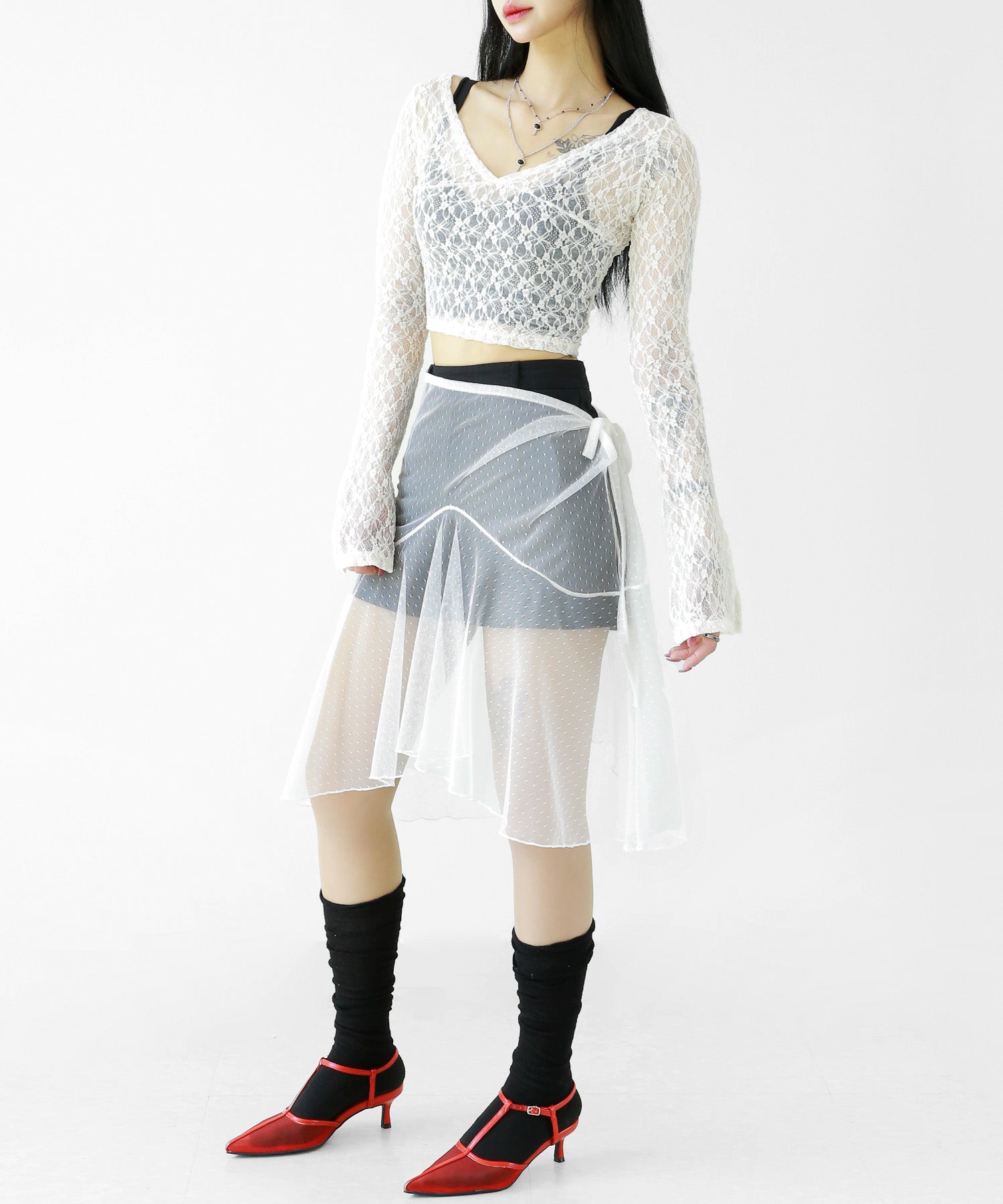 Add a modern twist to your outfit with this sheer dot lace wrap skirt. Designed to layer over jeans, pants, or slim-fit bottoms, it brings a stylish edge to minimal looks. Loved by fashion-forward women in Korea and Japan, this statement piece blends femininity with versatility—perfect for bold street styling or elegant layering.