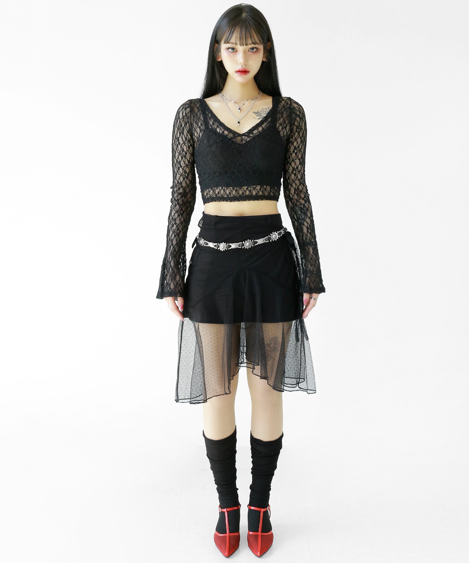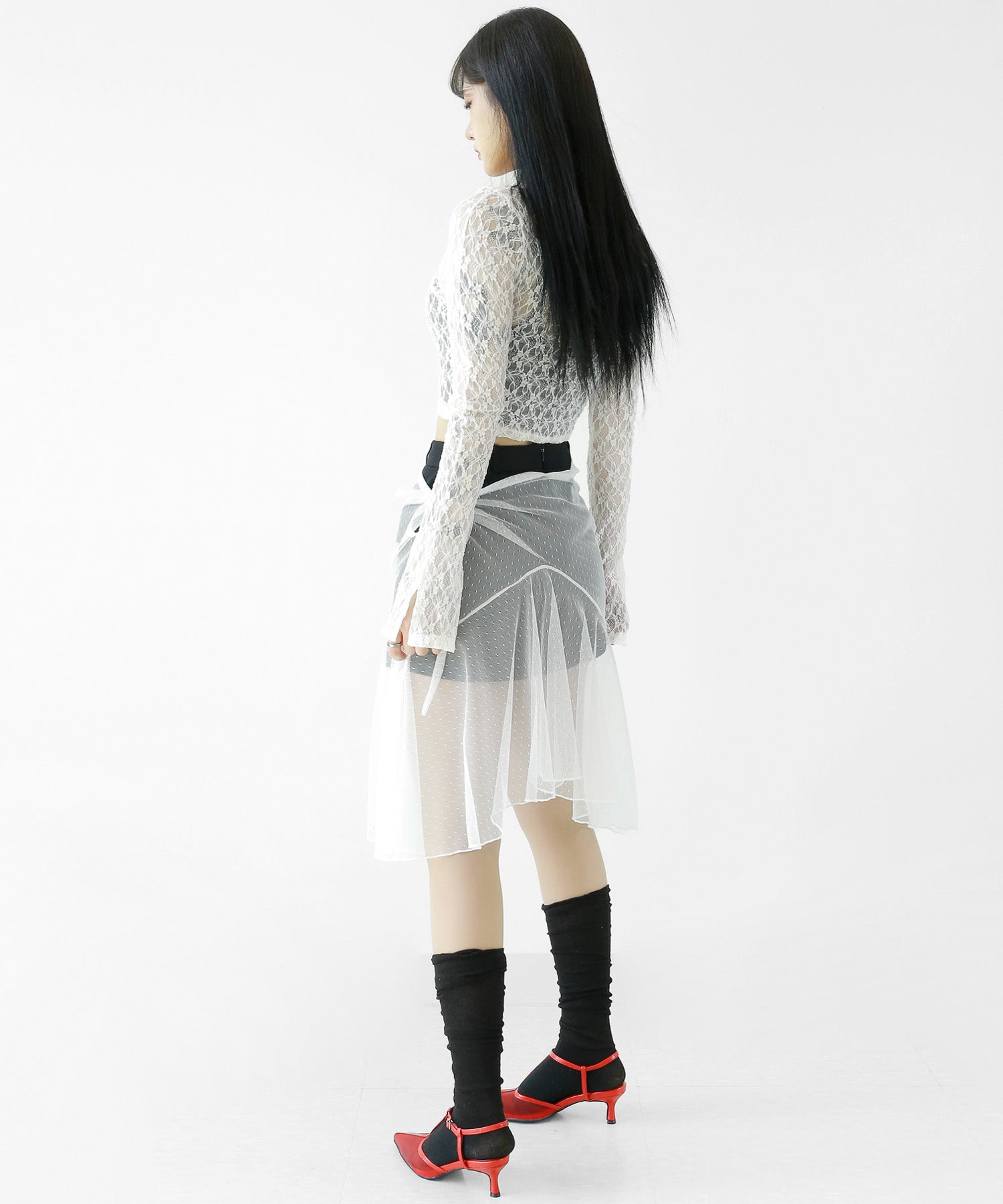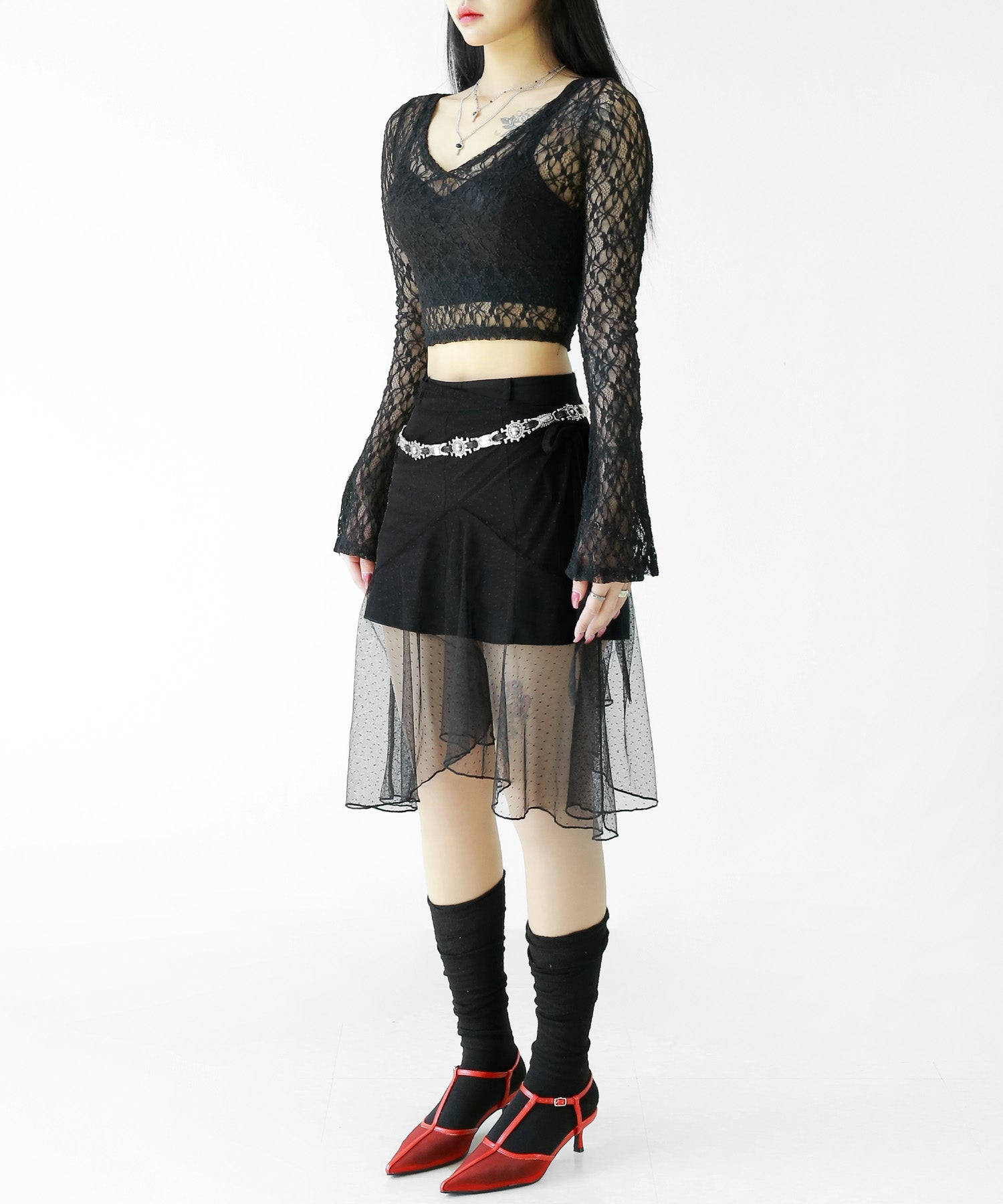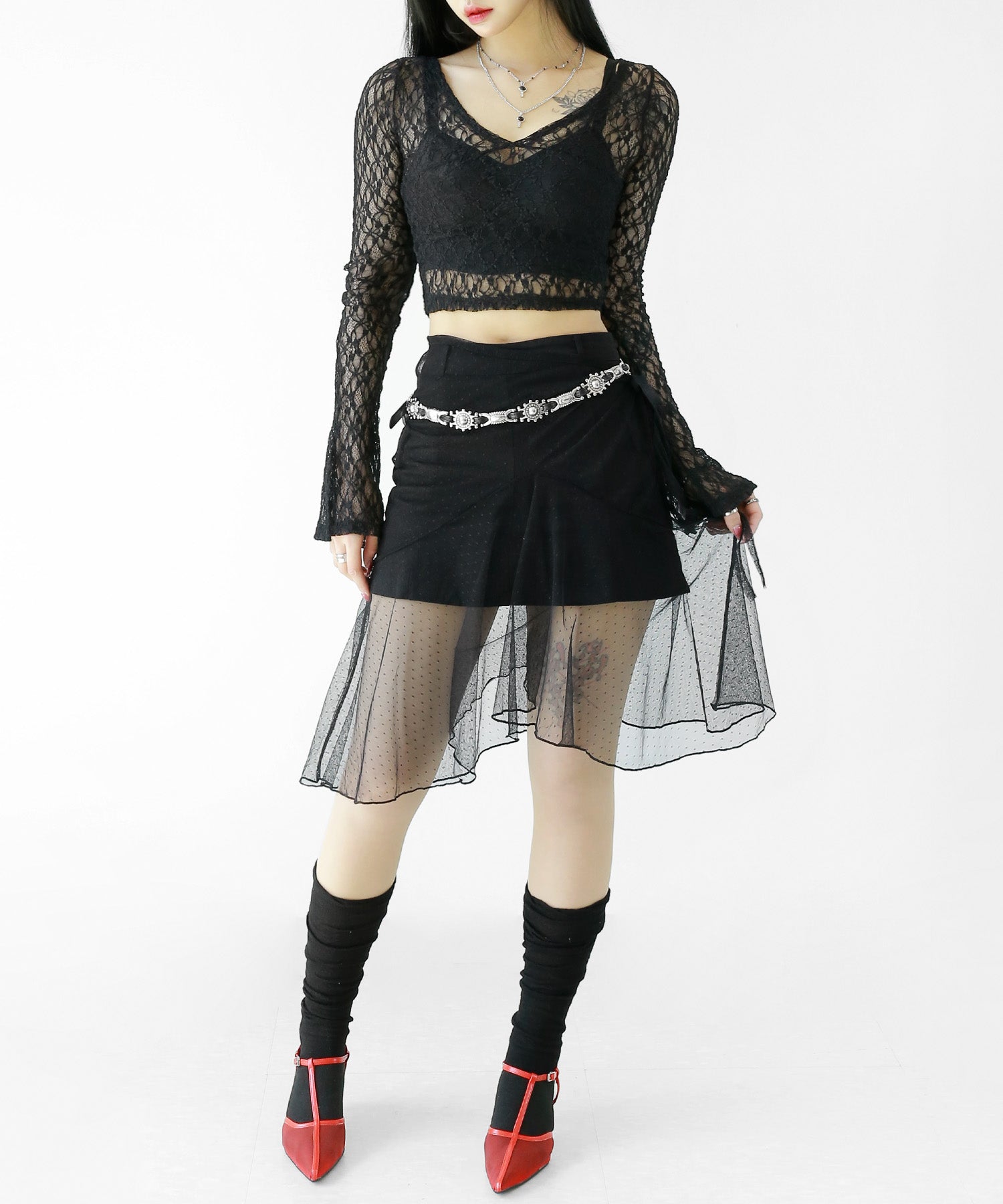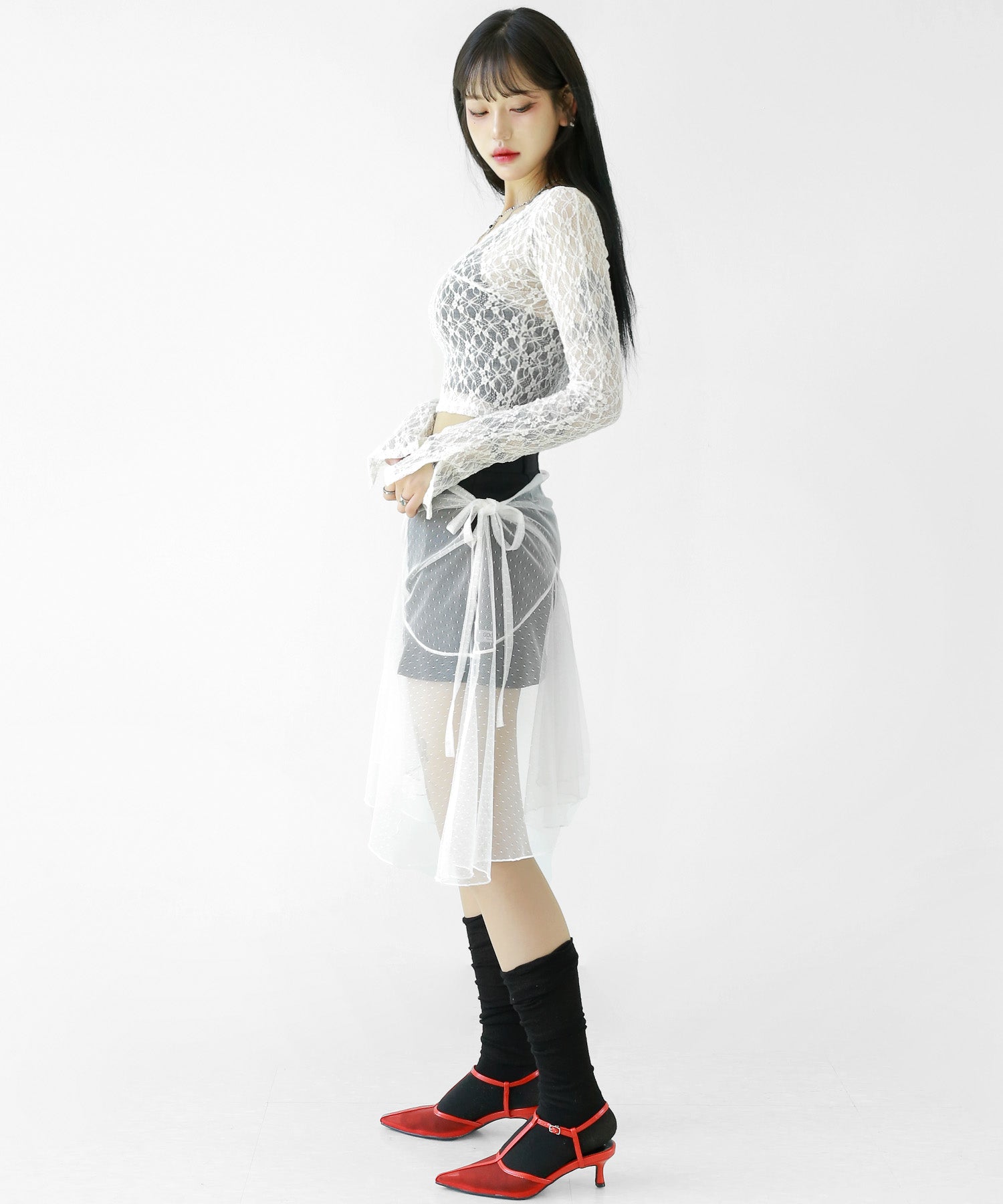 Add a modern twist to your outfit with this sheer dot lace wrap skirt. Designed to layer over jeans, pants, or slim-fit bottoms, it brings a stylish edge to minimal looks. Loved by fashion-forward women in Korea and Japan, this statement piece blends femininity with versatility—perfect for bold street styling or elegant layering.
