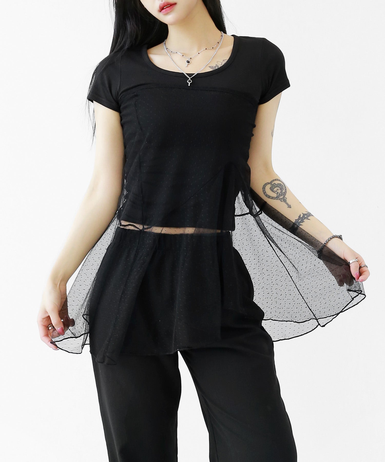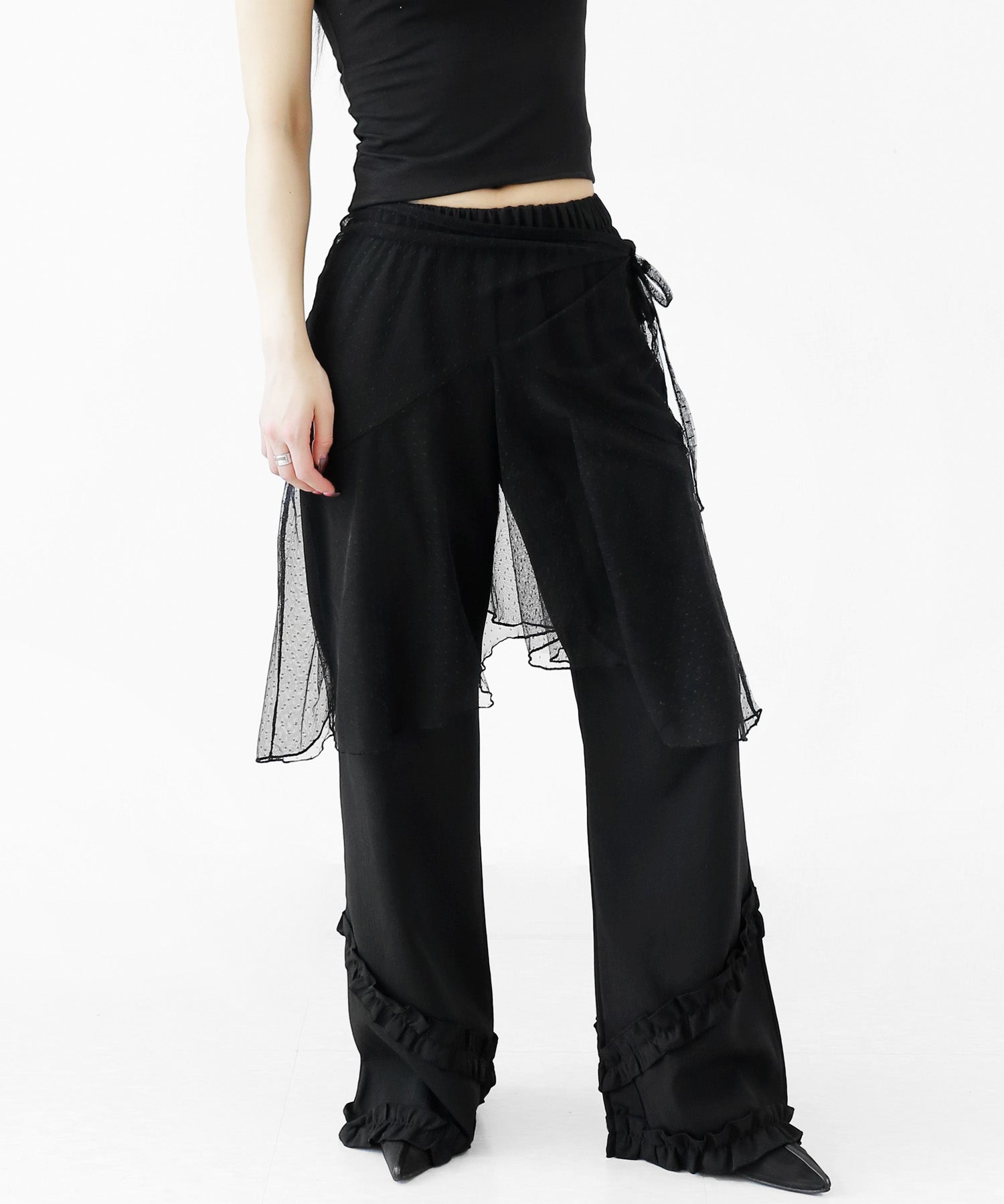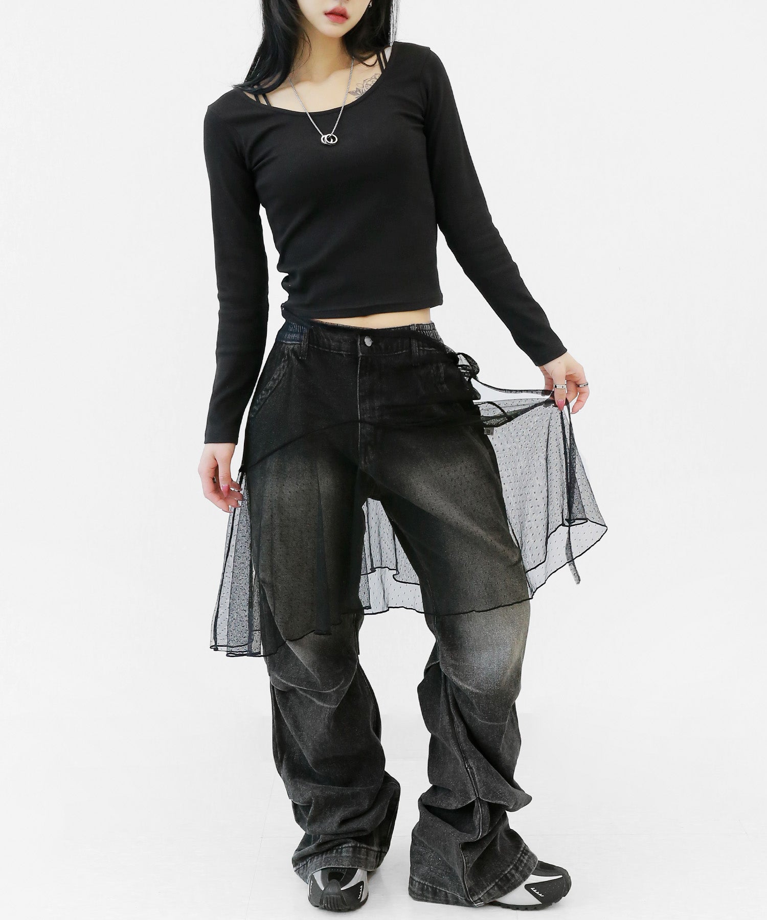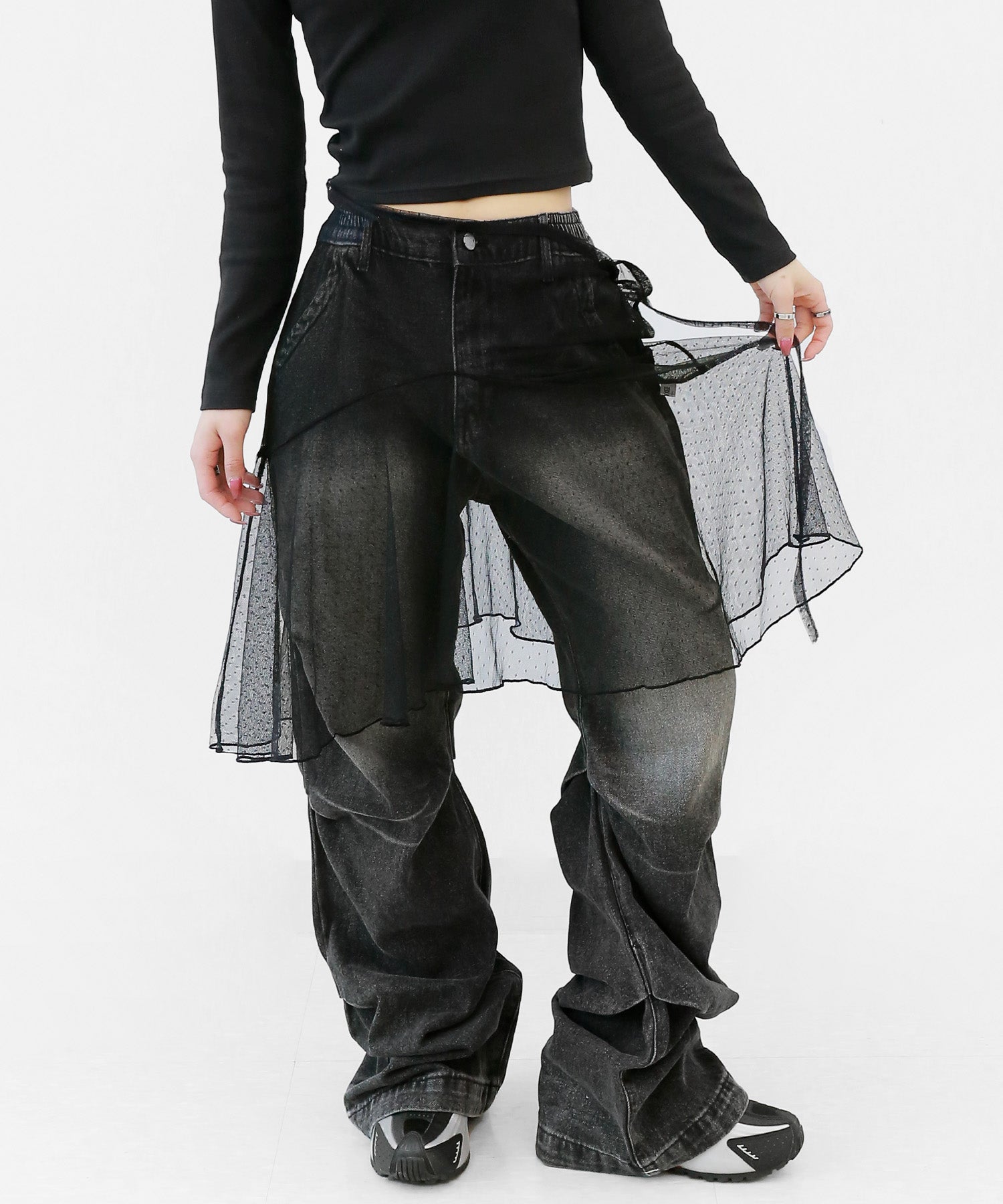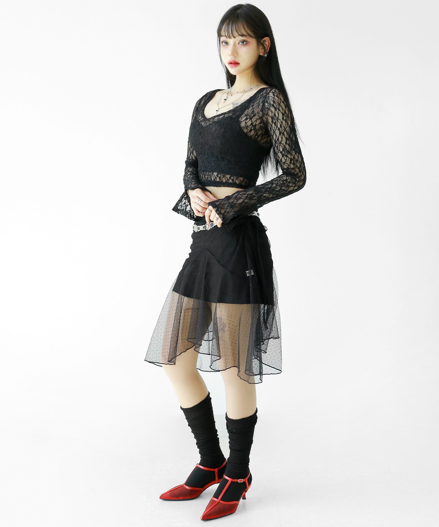 Add a modern twist to your outfit with this sheer dot lace wrap skirt. Designed to layer over jeans, pants, or slim-fit bottoms, it brings a stylish edge to minimal looks. Loved by fashion-forward women in Korea and Japan, this statement piece blends femininity with versatility—perfect for bold street styling or elegant layering.