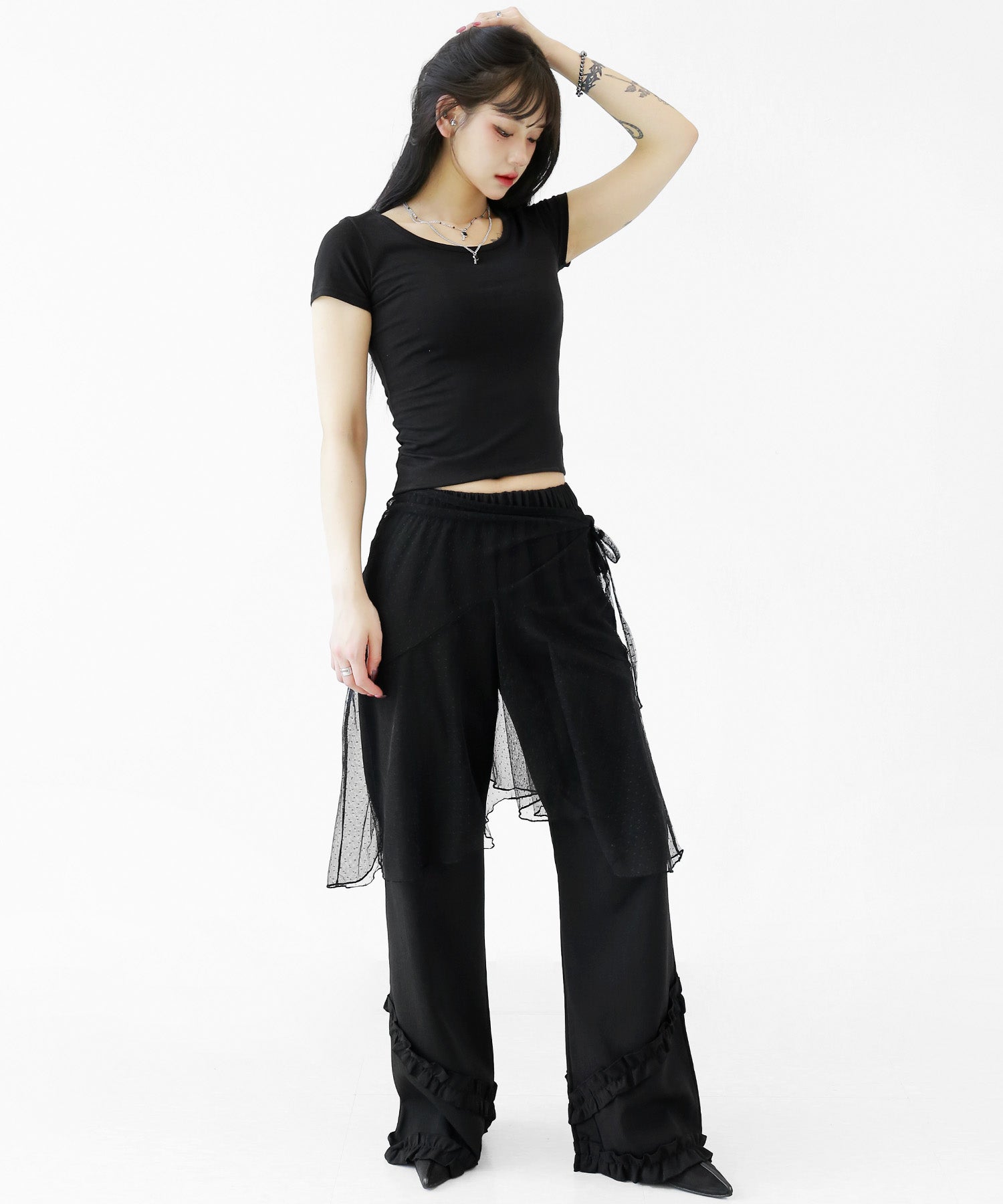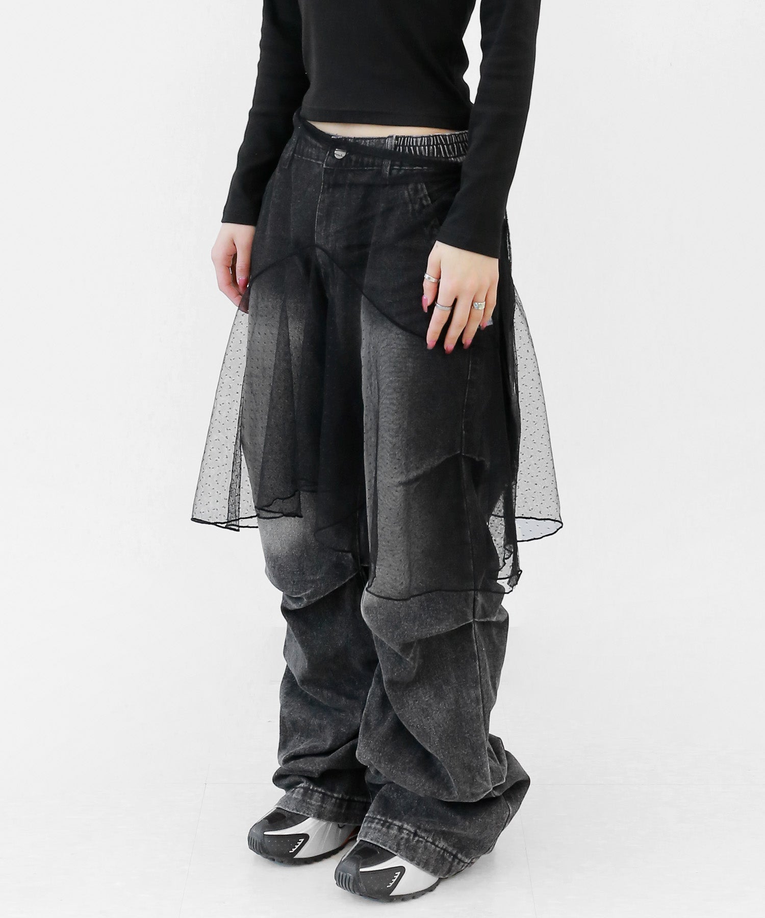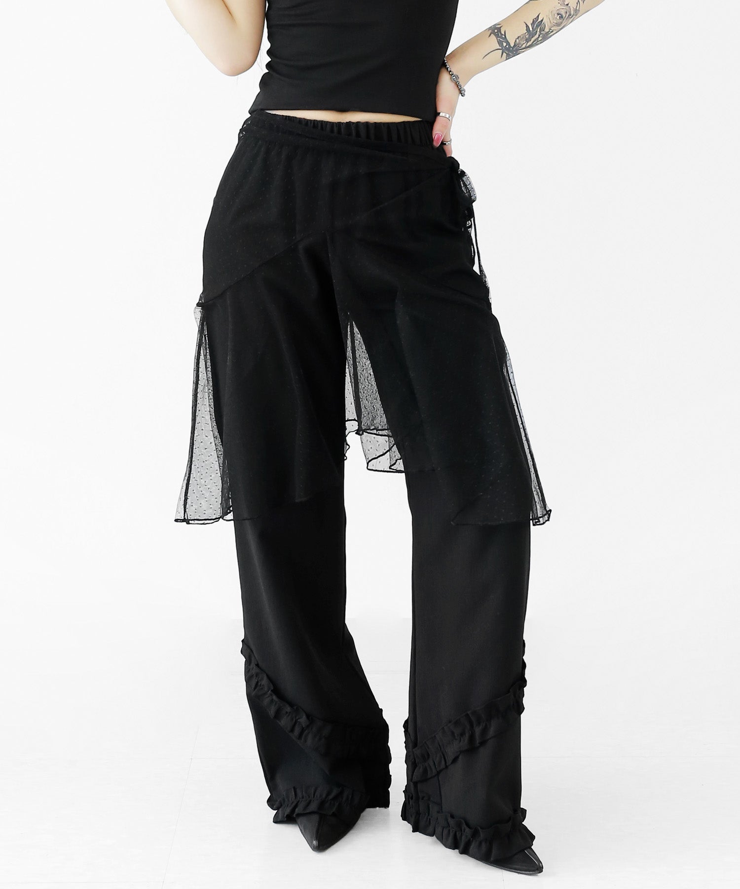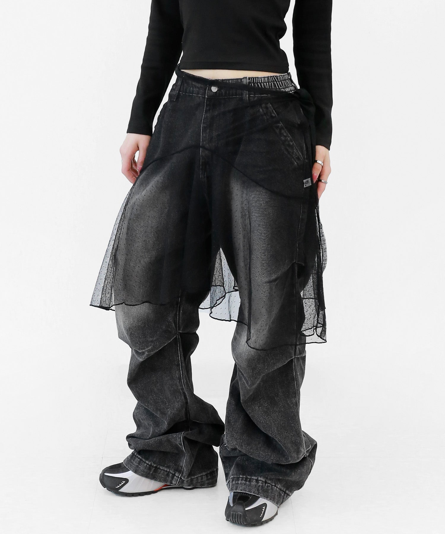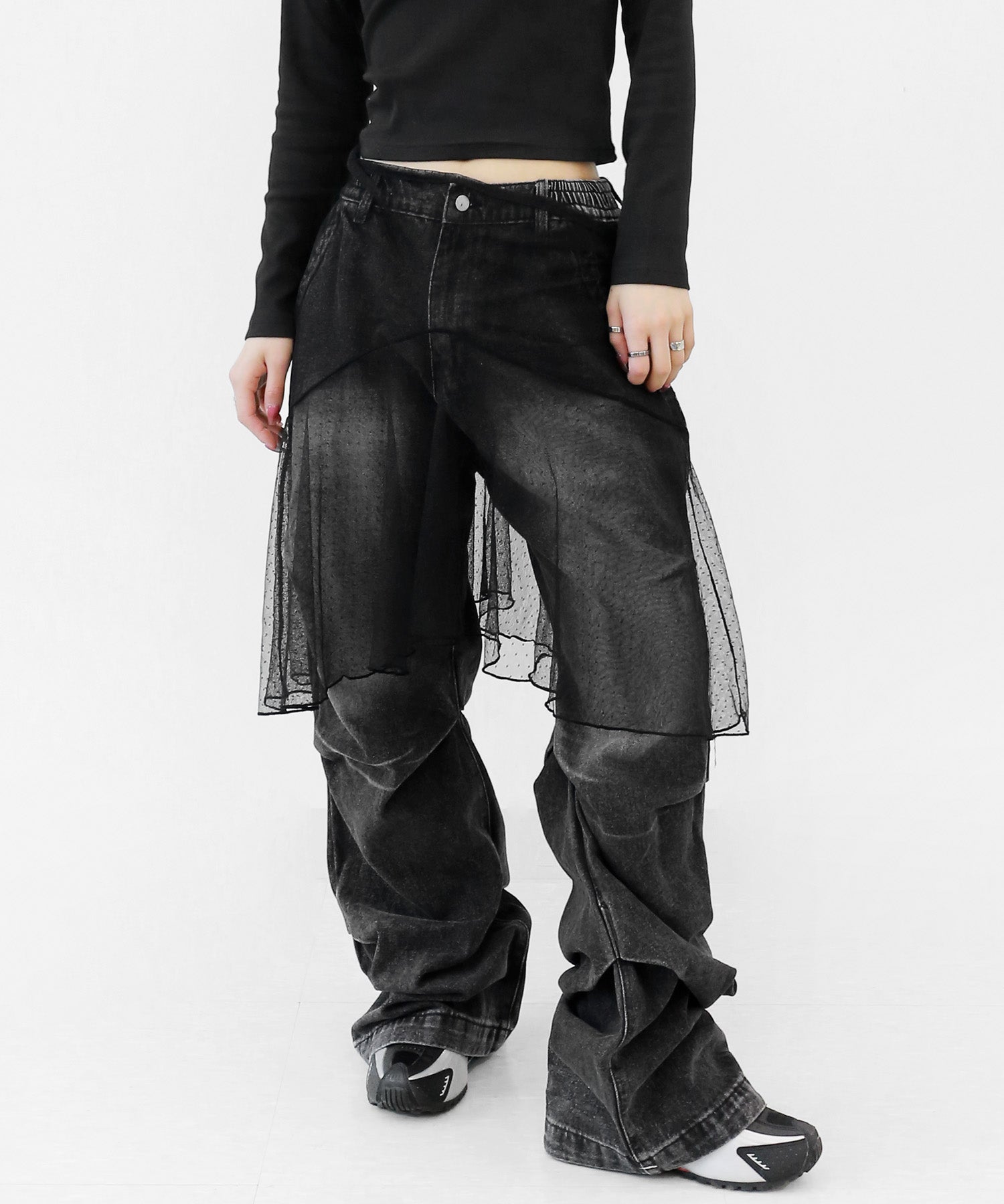 Add a modern twist to your outfit with this sheer dot lace wrap skirt. Designed to layer over jeans, pants, or slim-fit bottoms, it brings a stylish edge to minimal looks. Loved by fashion-forward women in Korea and Japan, this statement piece blends femininity with versatility—perfect for bold street styling or elegant layering.
