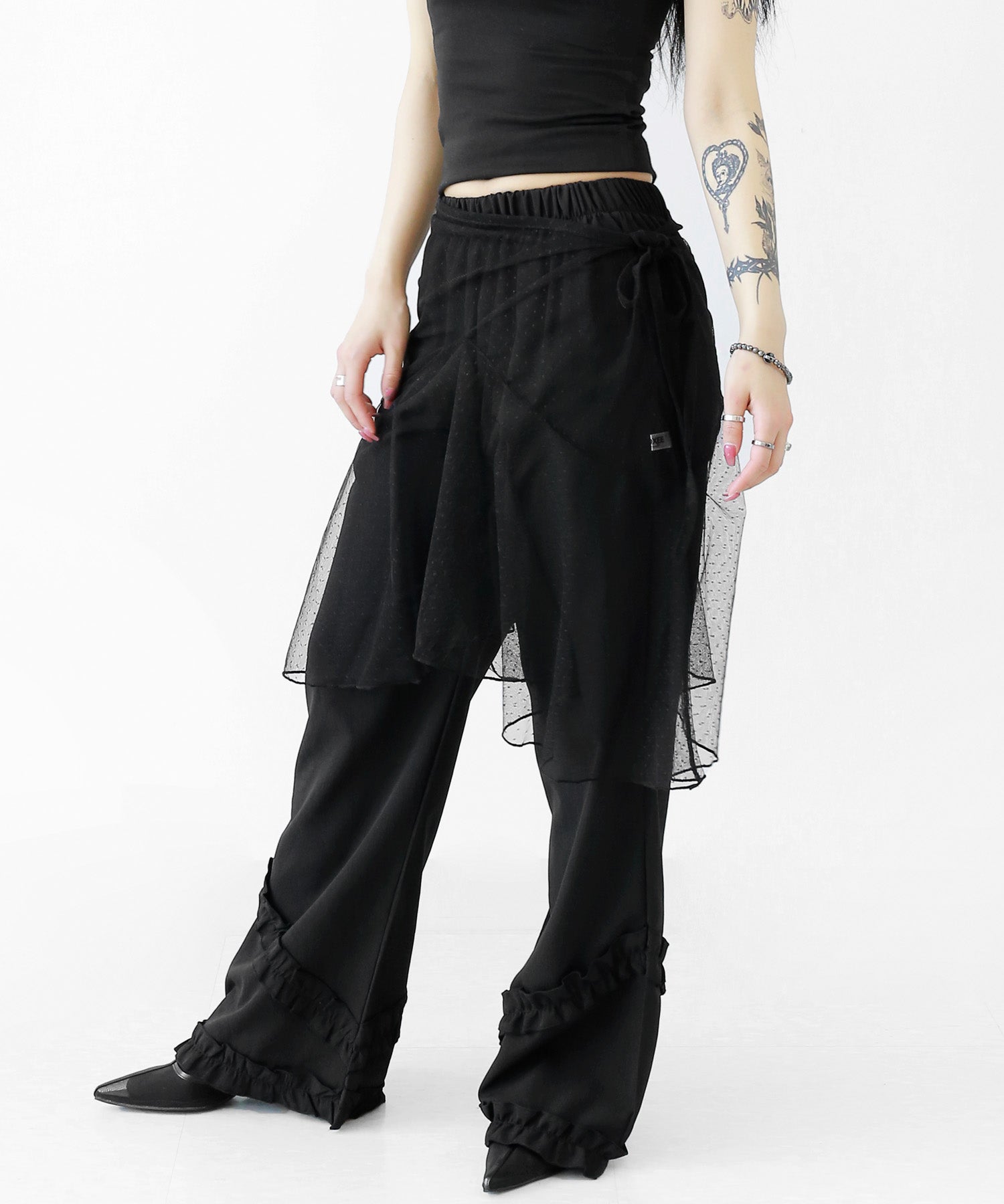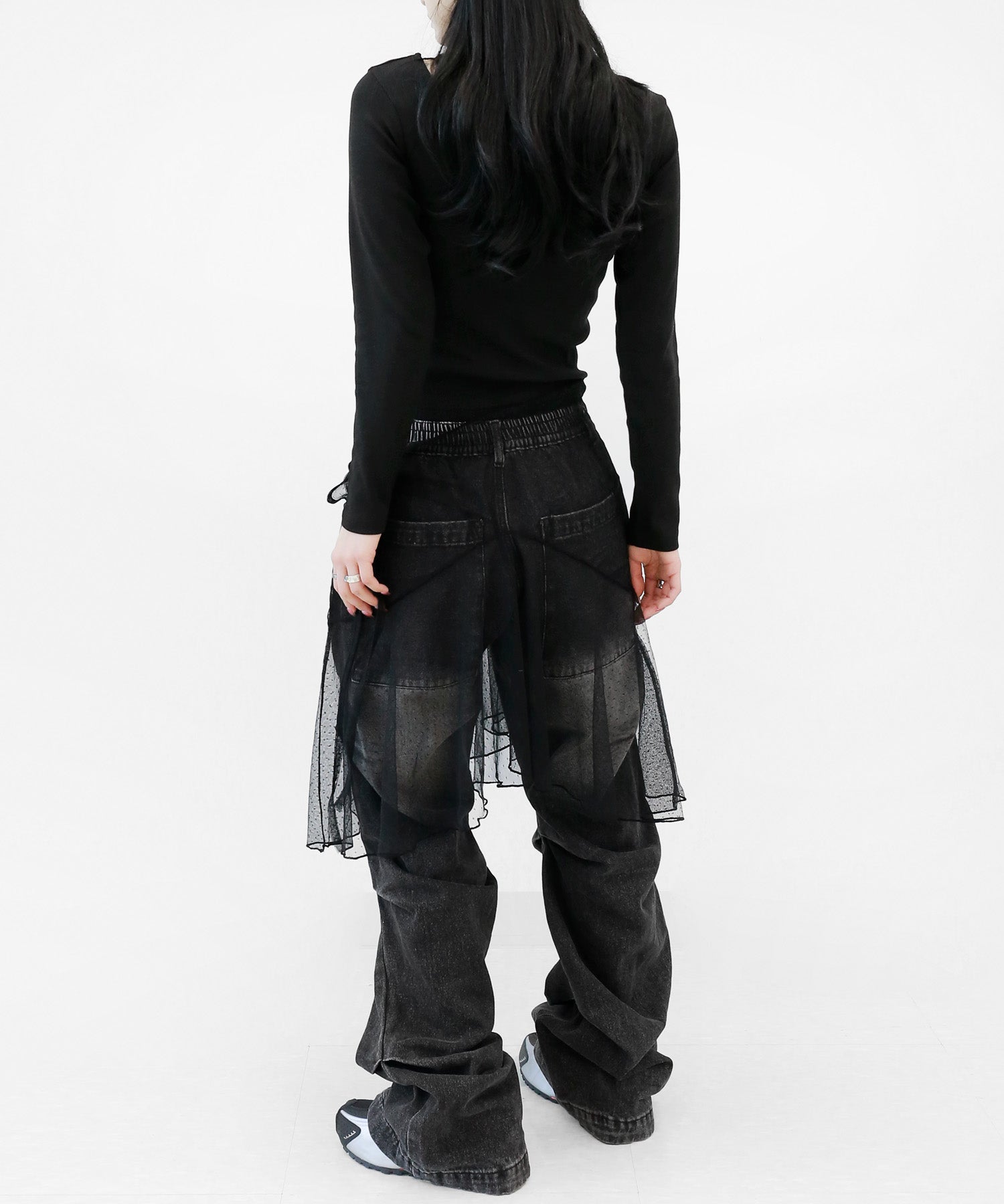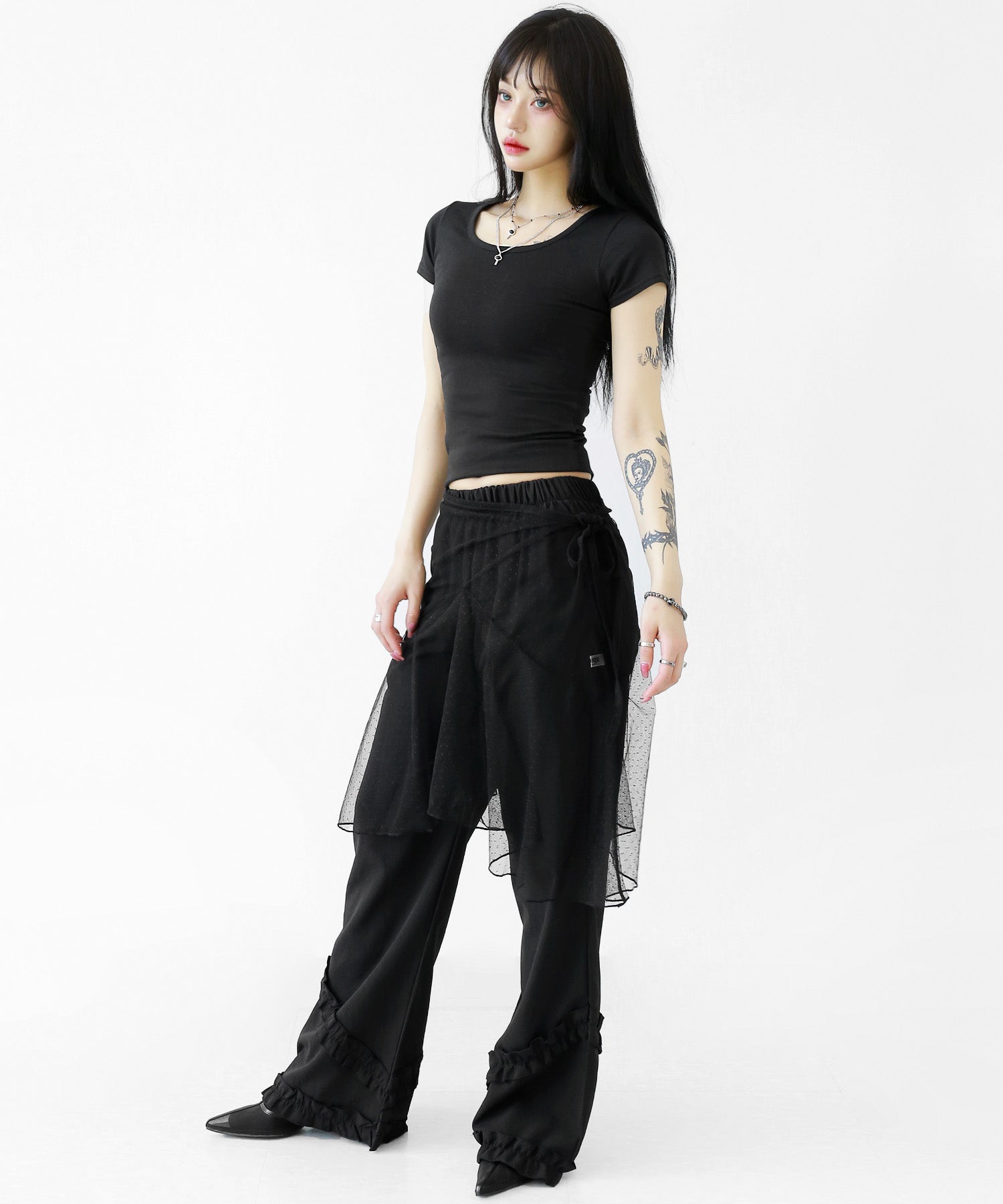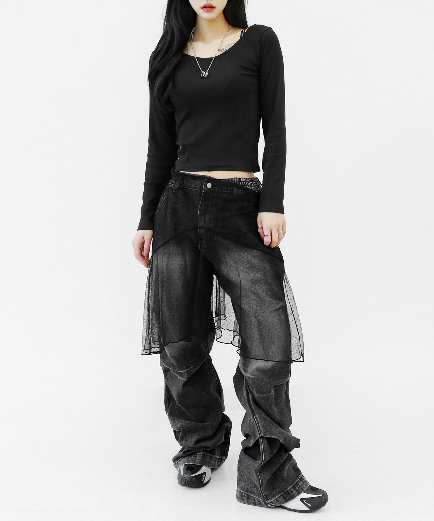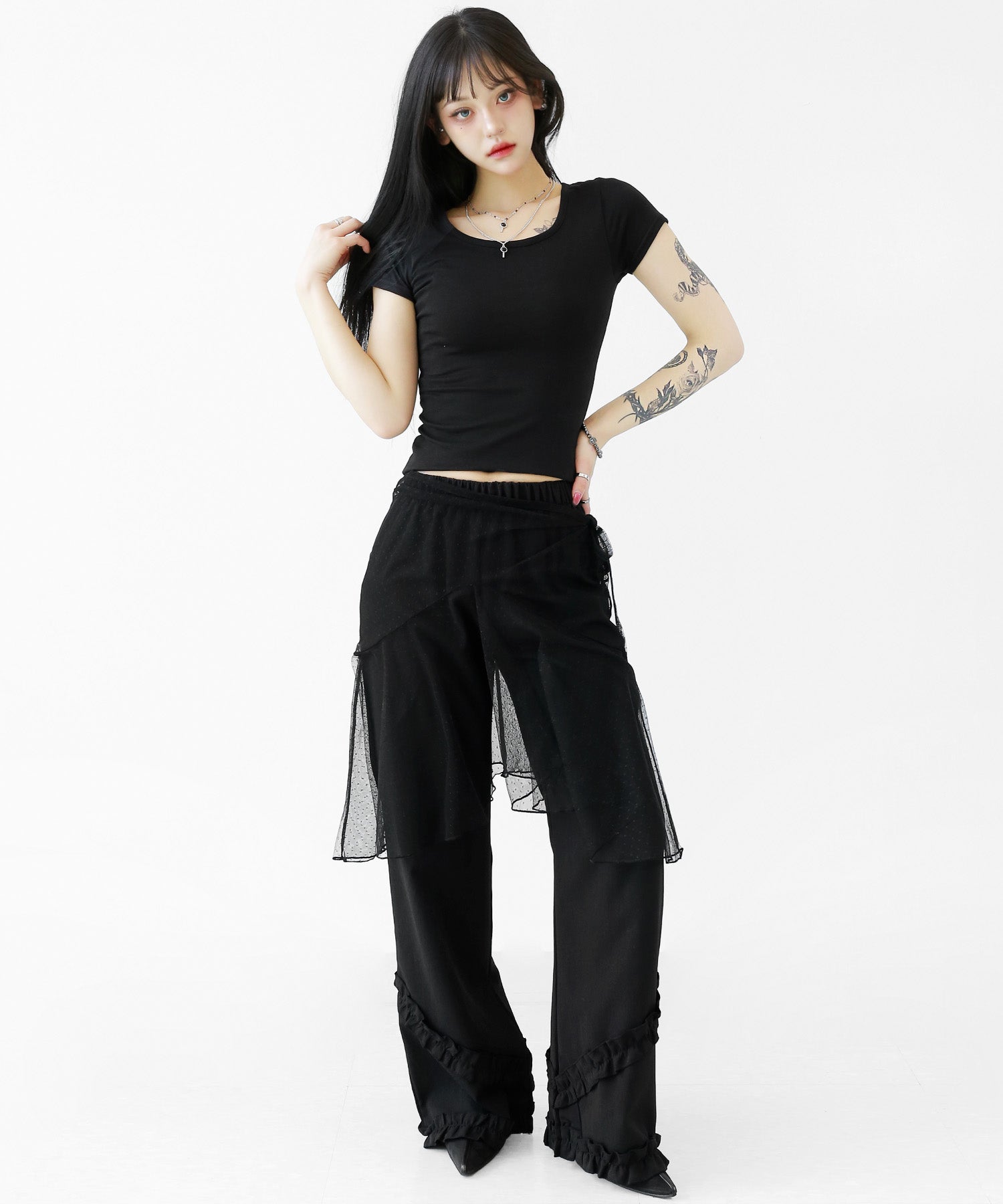 Add a modern twist to your outfit with this sheer dot lace wrap skirt. Designed to layer over jeans, pants, or slim-fit bottoms, it brings a stylish edge to minimal looks. Loved by fashion-forward women in Korea and Japan, this statement piece blends femininity with versatility—perfect for bold street styling or elegant layering.