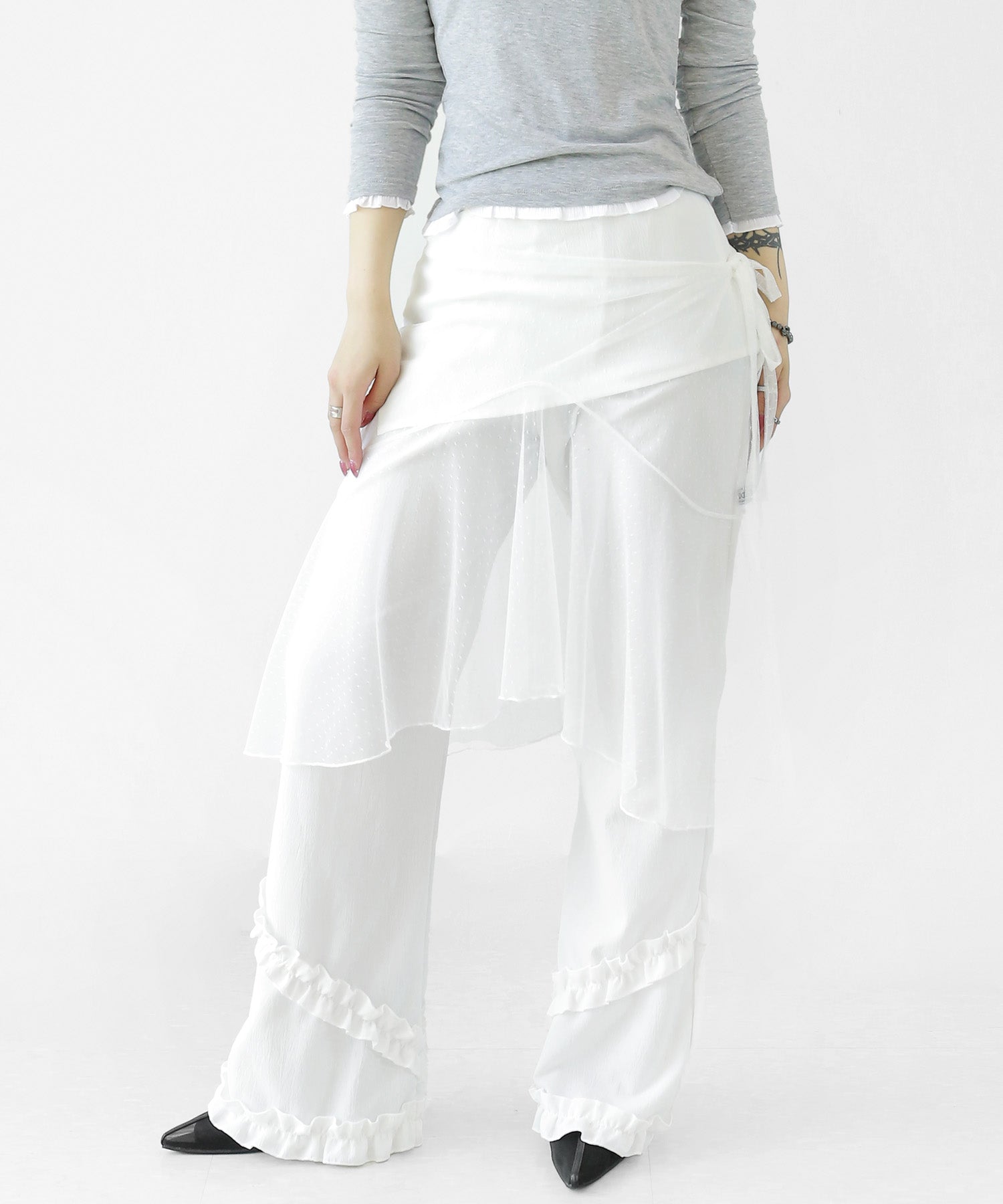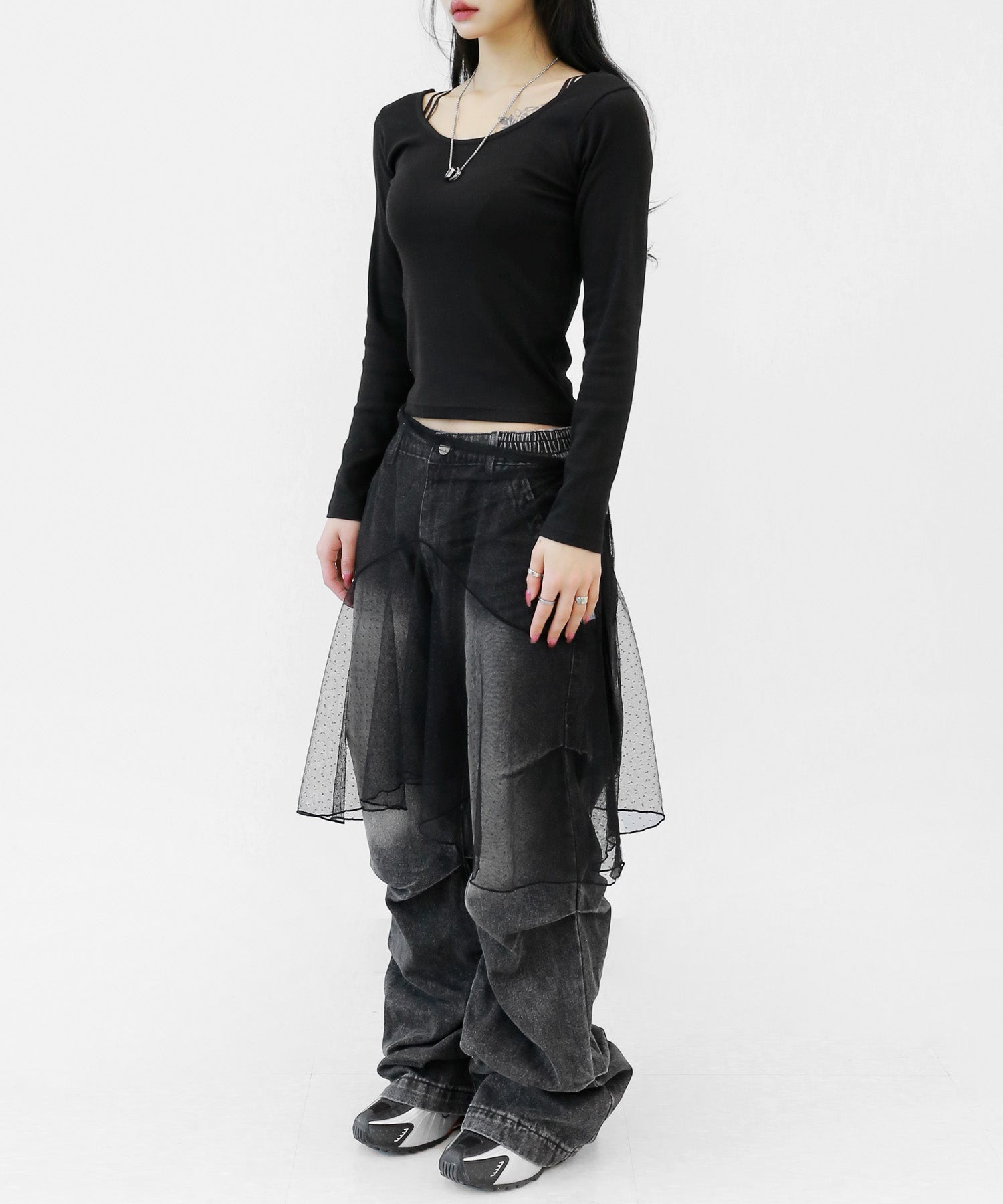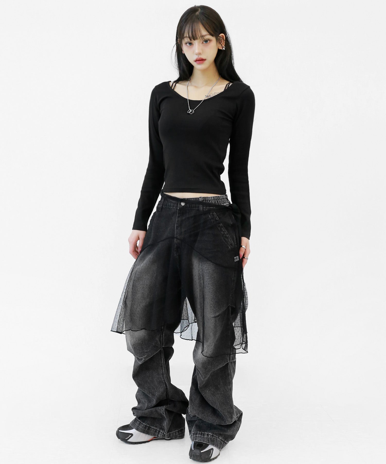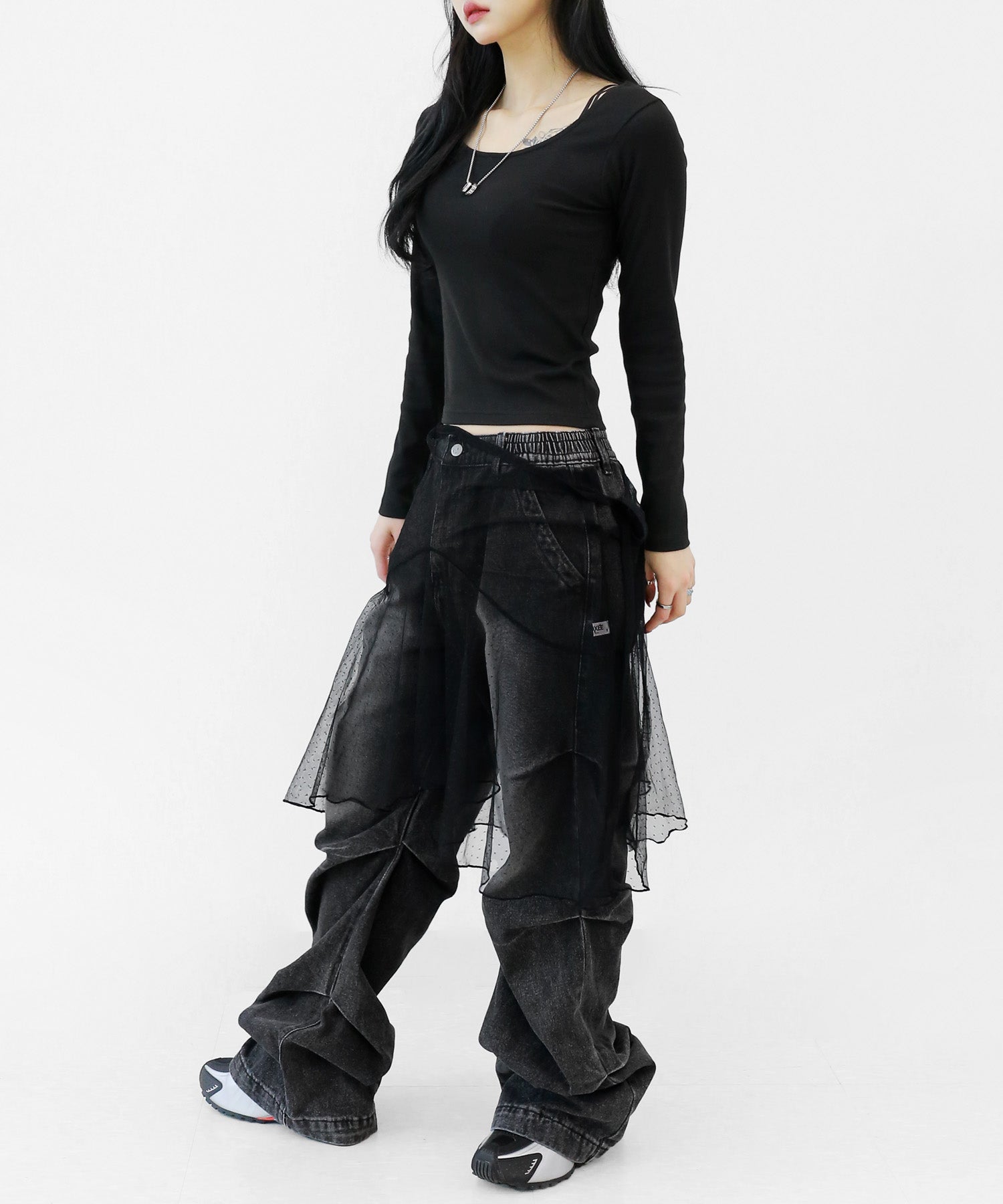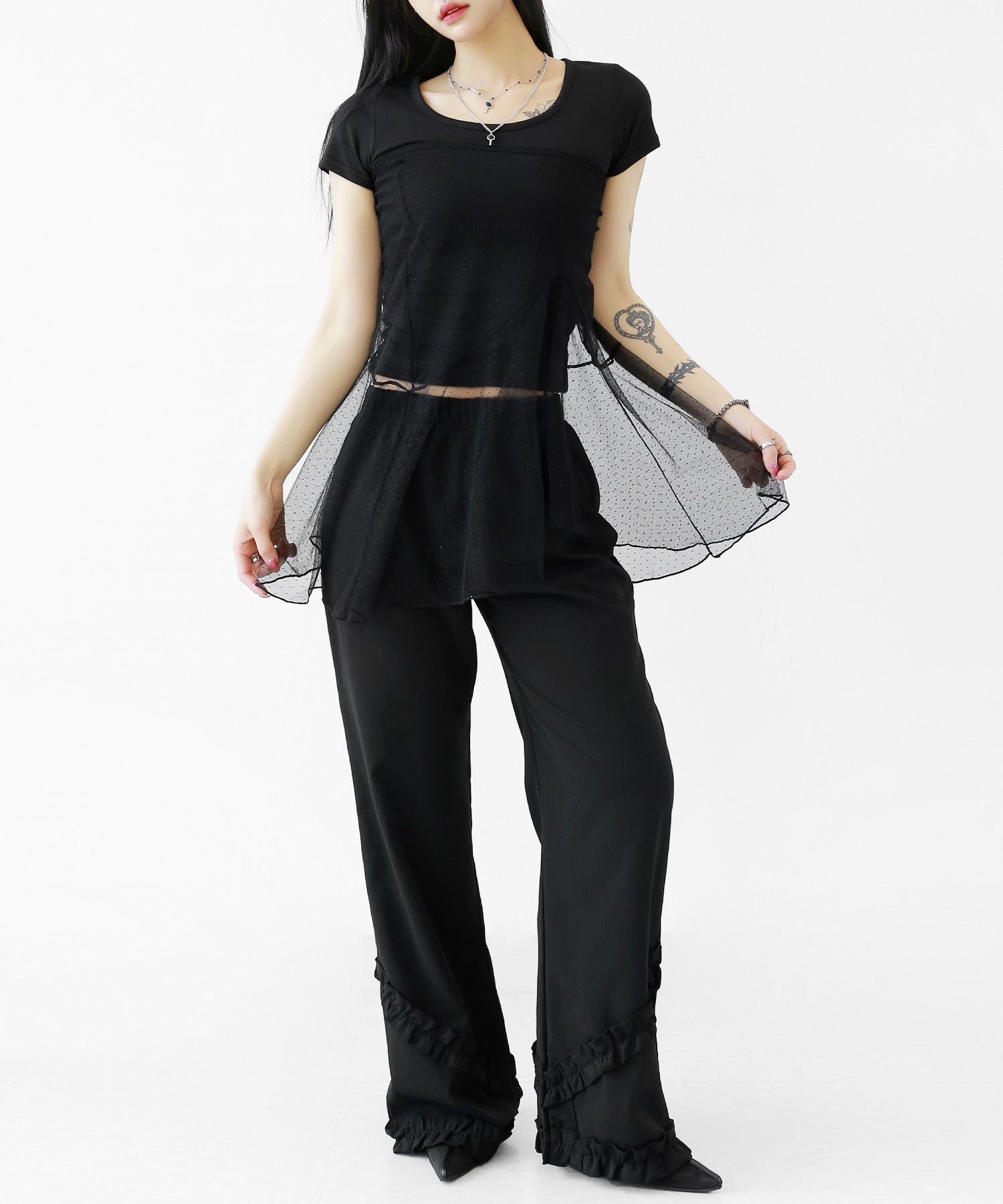 Add a modern twist to your outfit with this sheer dot lace wrap skirt. Designed to layer over jeans, pants, or slim-fit bottoms, it brings a stylish edge to minimal looks. Loved by fashion-forward women in Korea and Japan, this statement piece blends femininity with versatility—perfect for bold street styling or elegant layering.