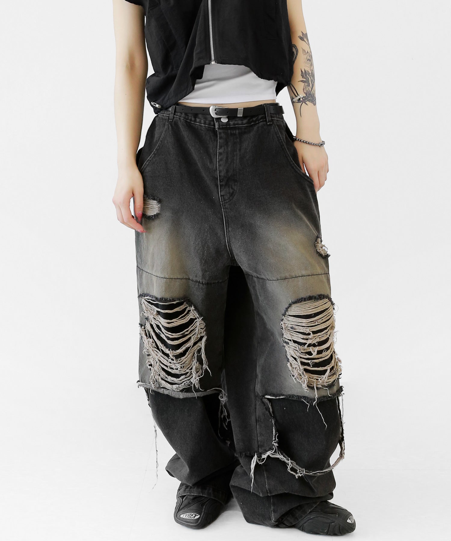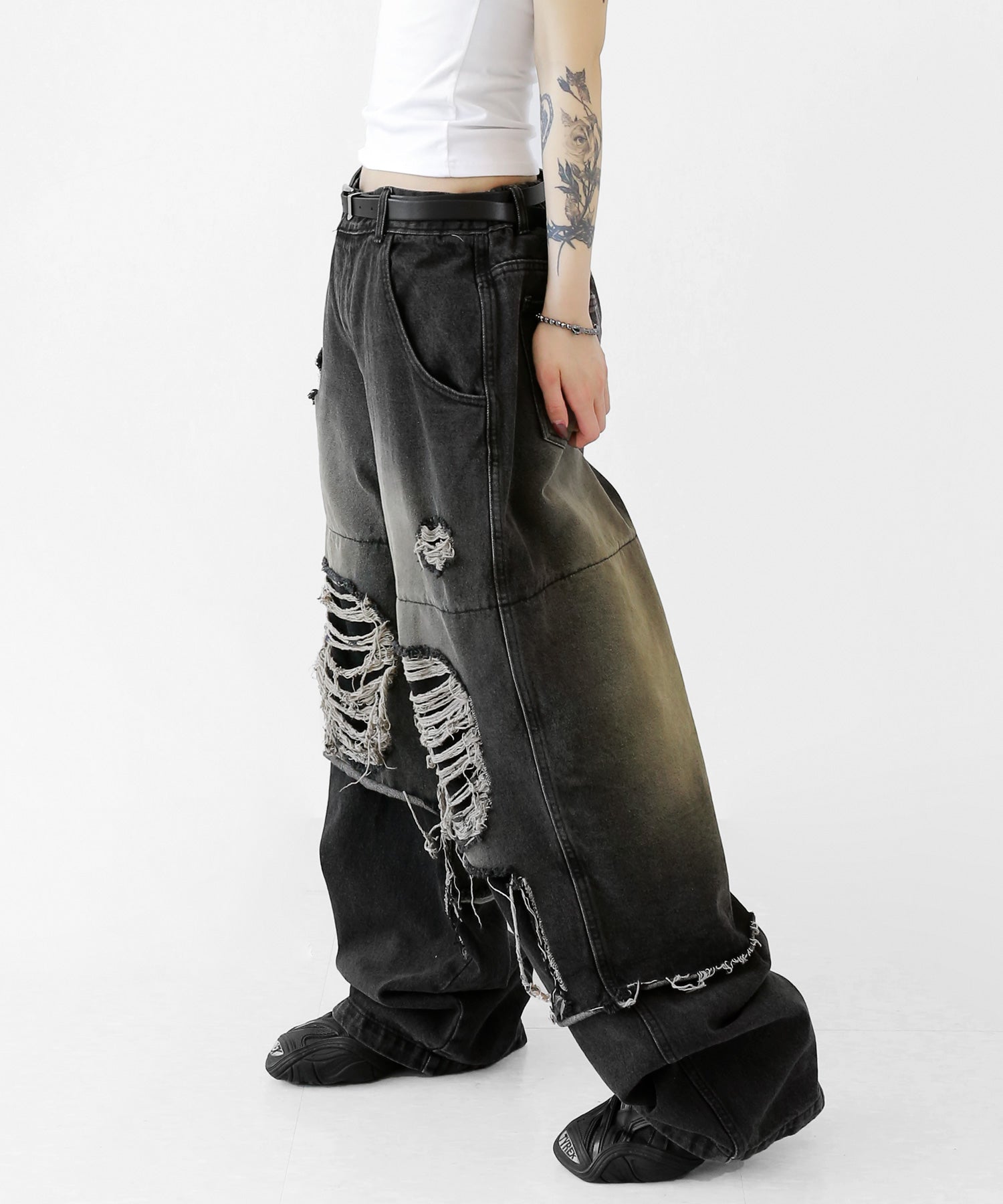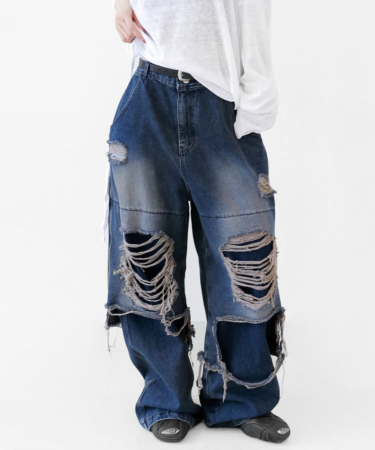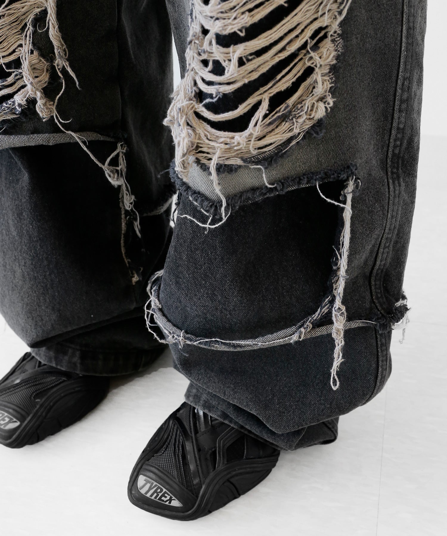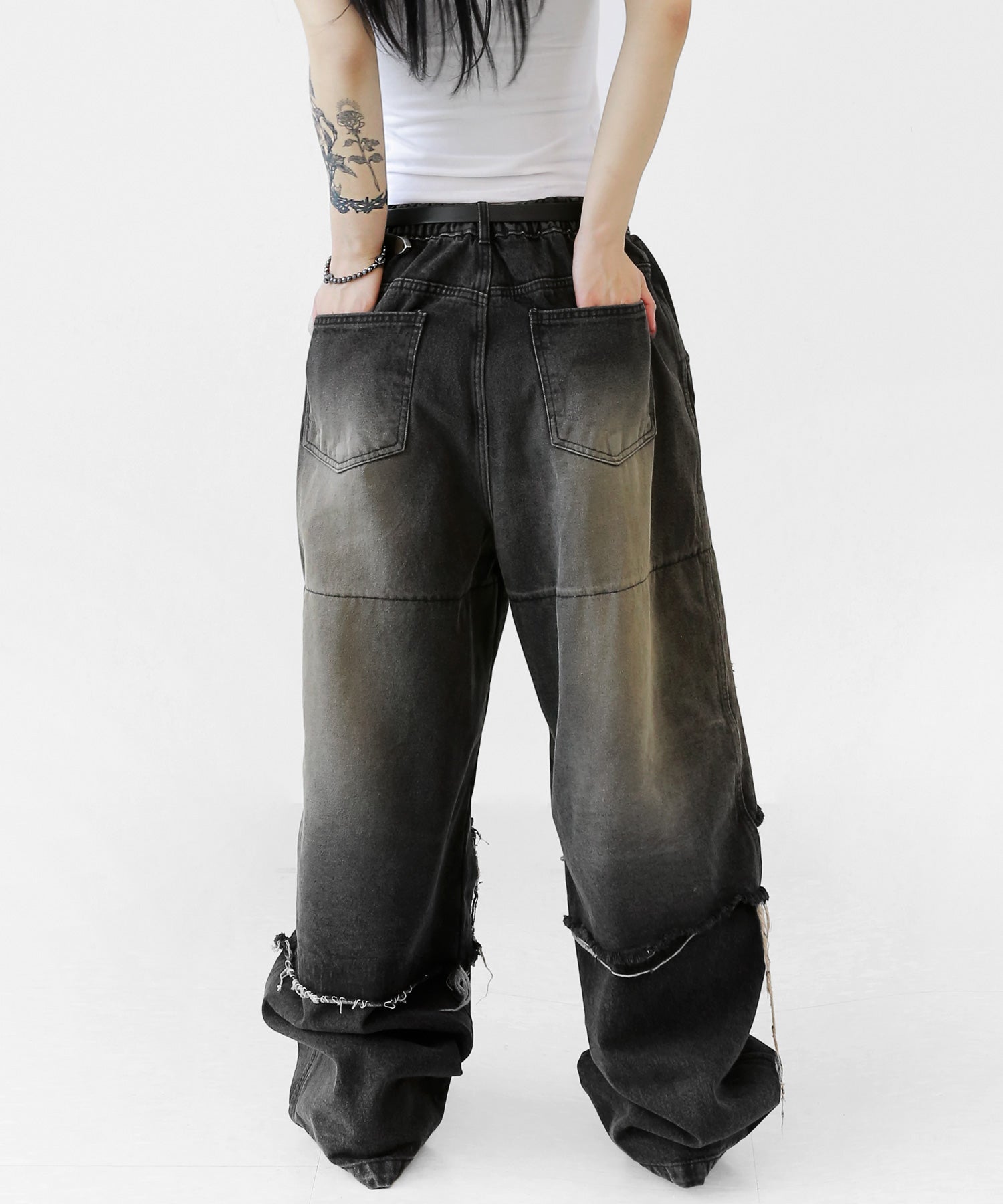These wide-leg denim pants feature bold distressing and a layered-look design that gives the illusion of stacked denim. The washed finish and oversized fit bring serious vintage vibes, while the unique structure sets you apart.This is the pair you reach for when you want your outfit to speak first.