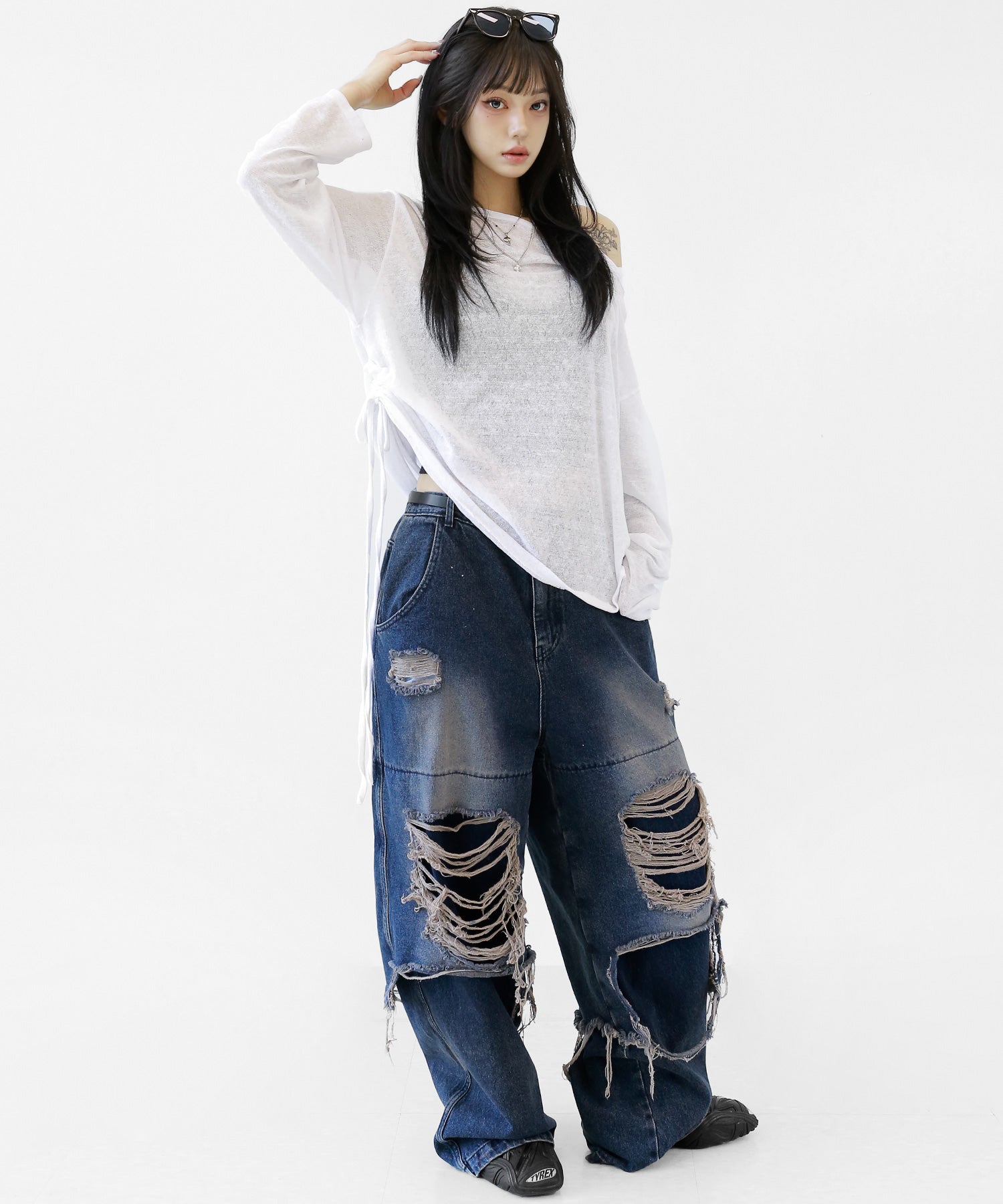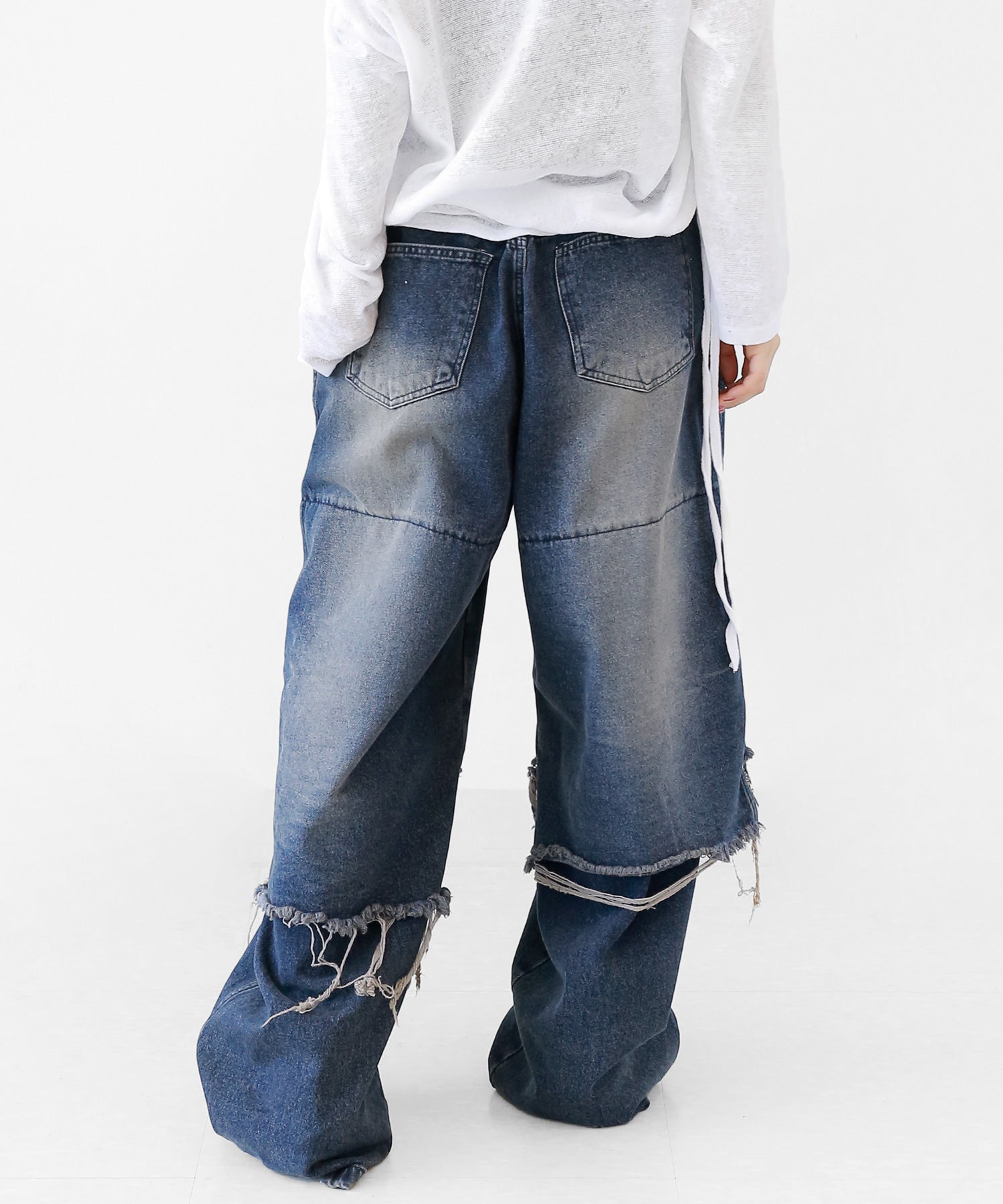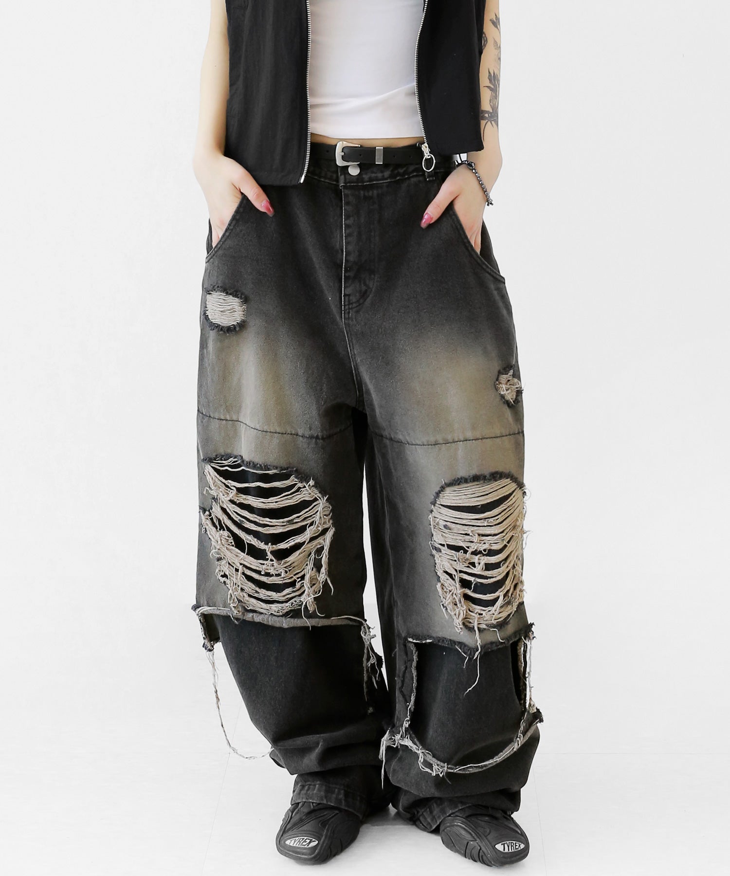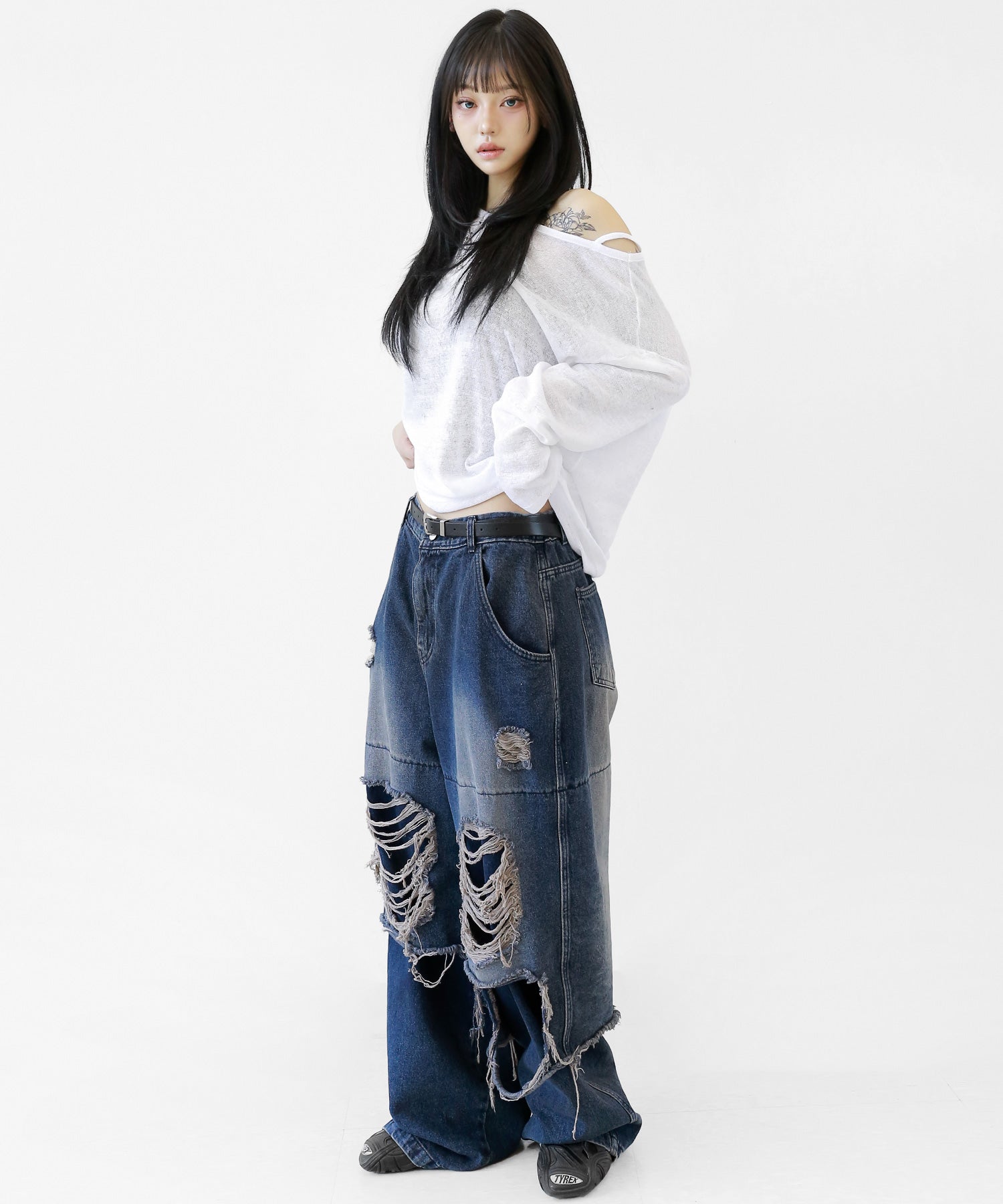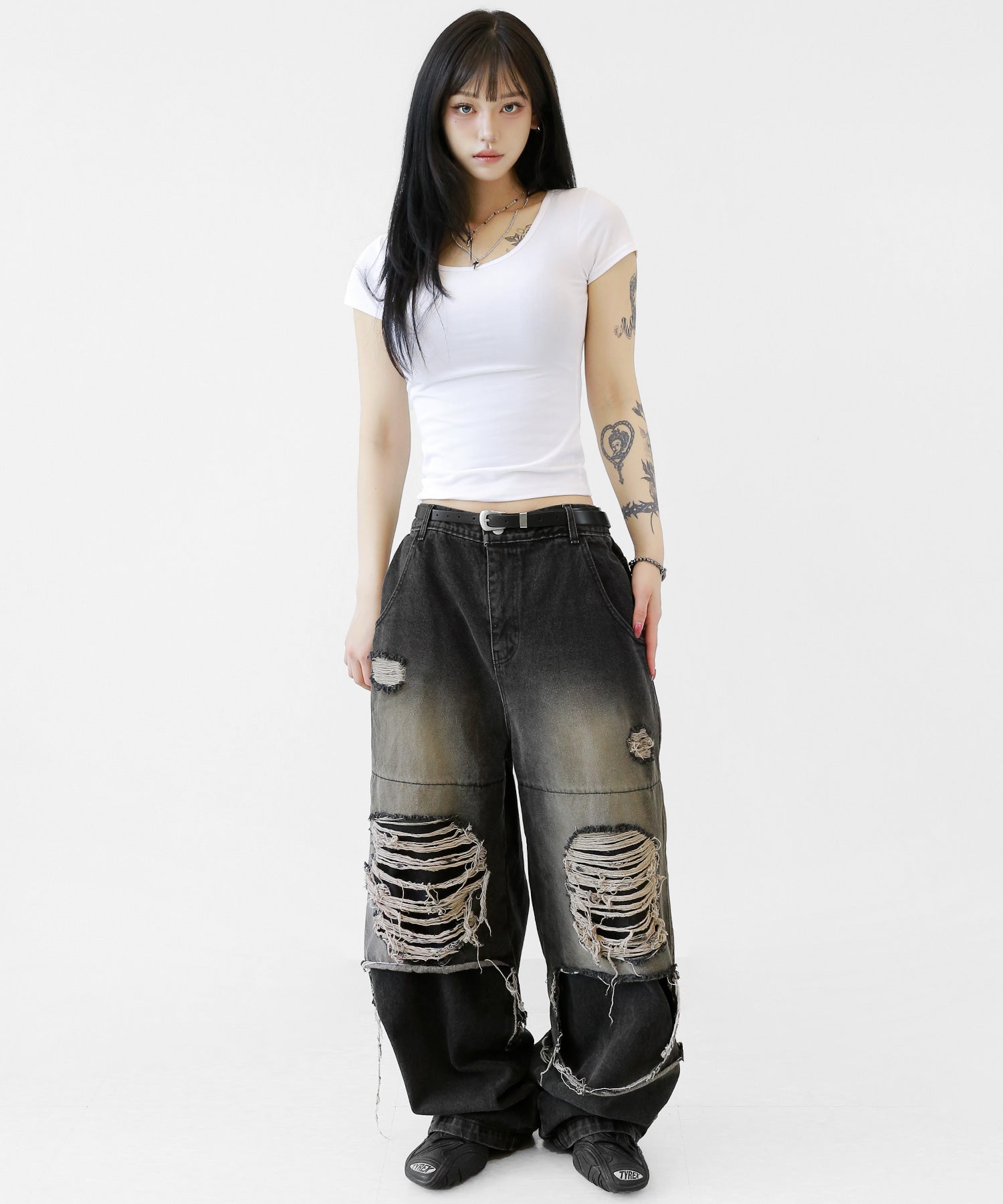 These wide-leg denim pants feature bold distressing and a layered-look design that gives the illusion of stacked denim. The washed finish and oversized fit bring serious vintage vibes, while the unique structure sets you apart.This is the pair you reach for when you want your outfit to speak first.