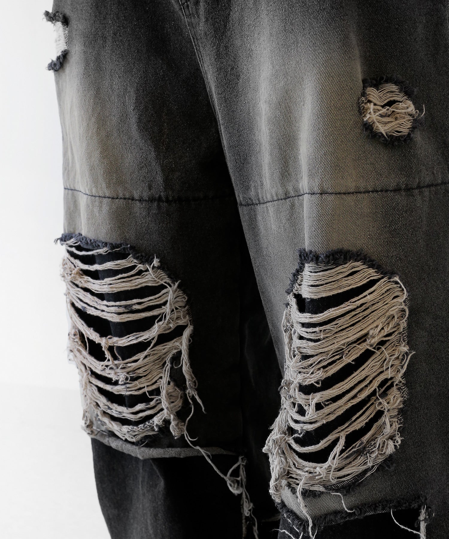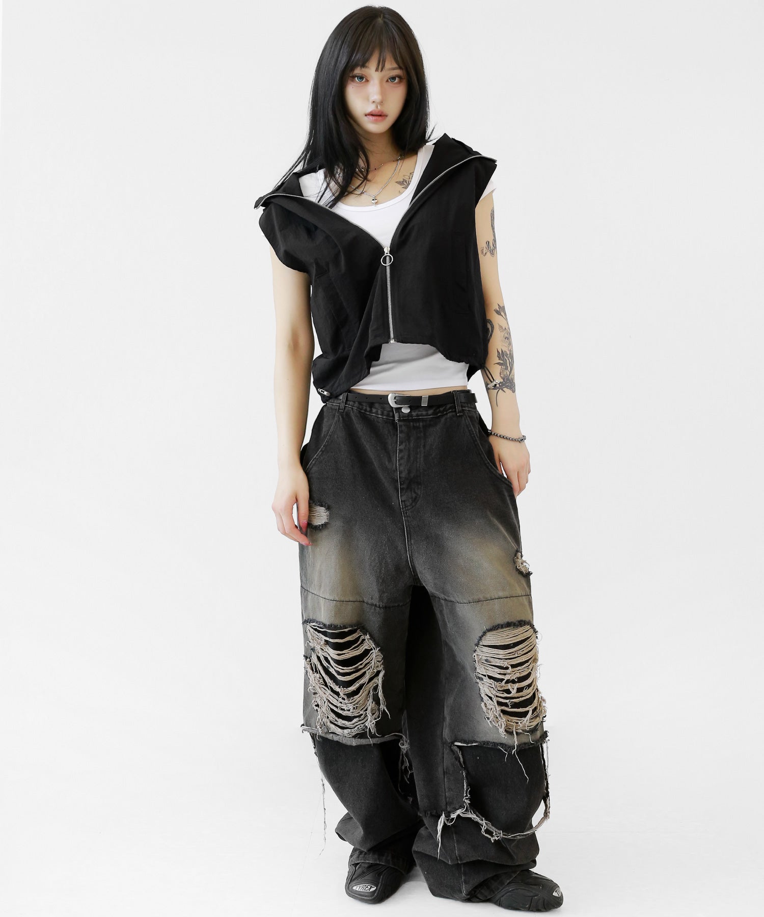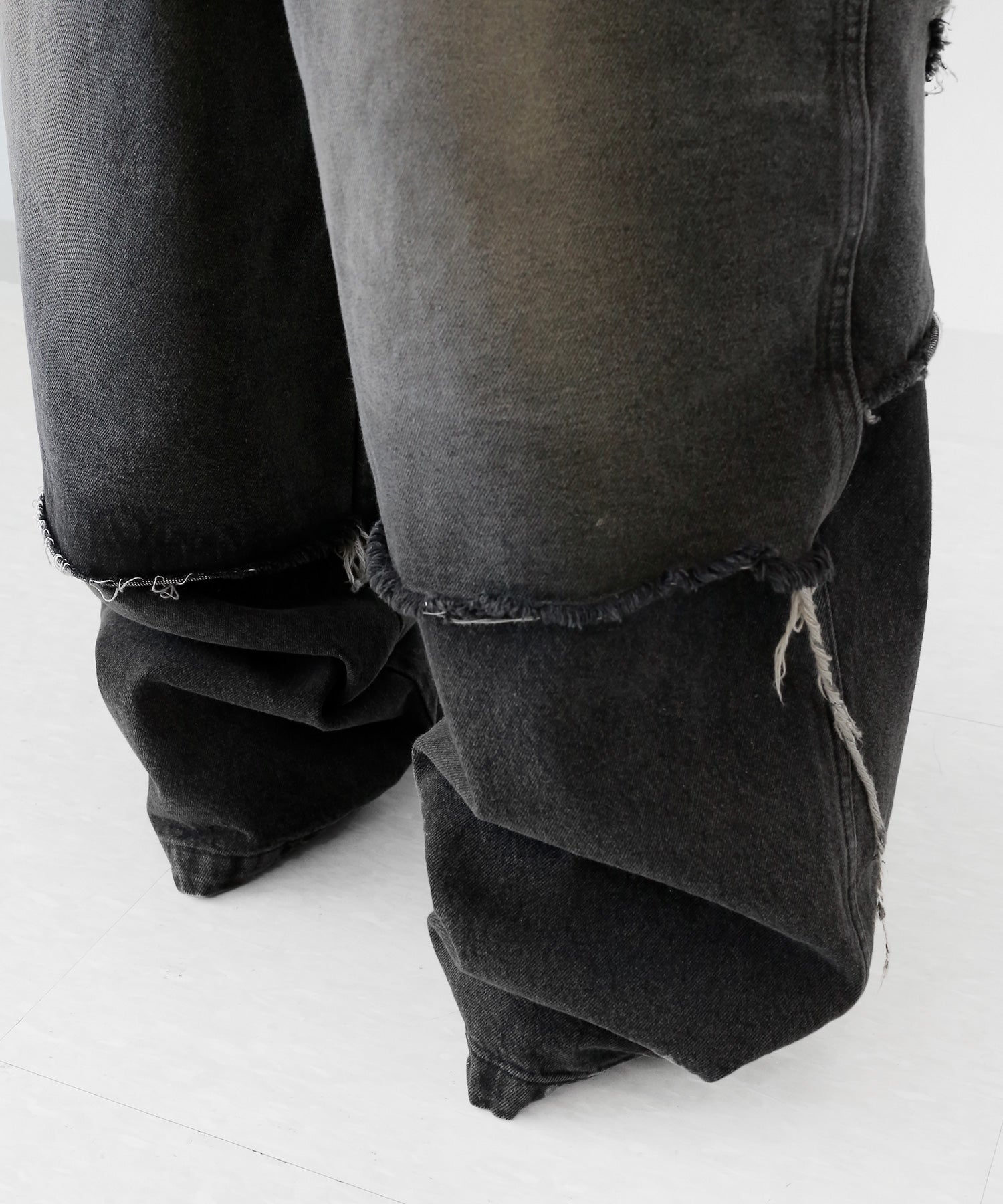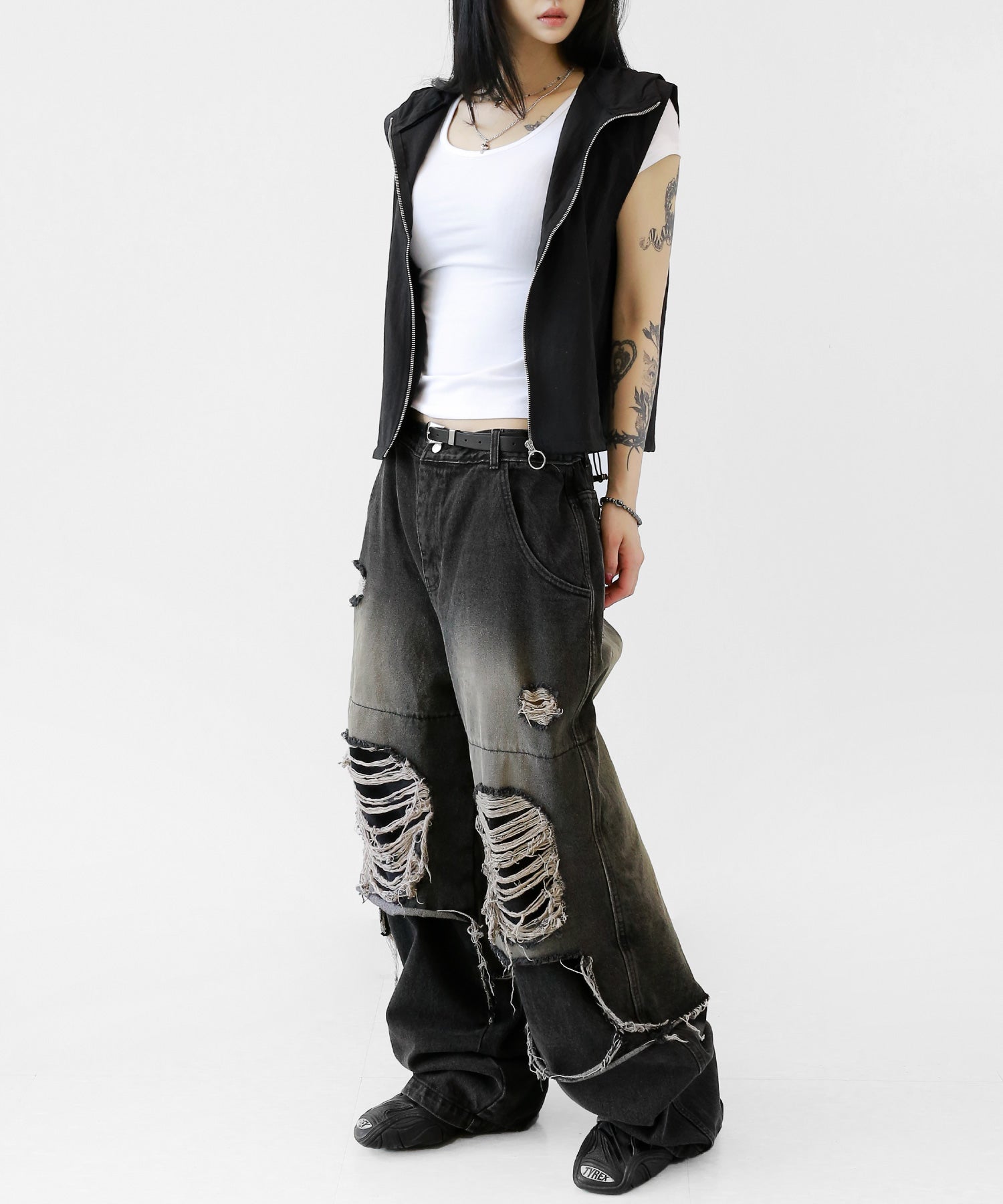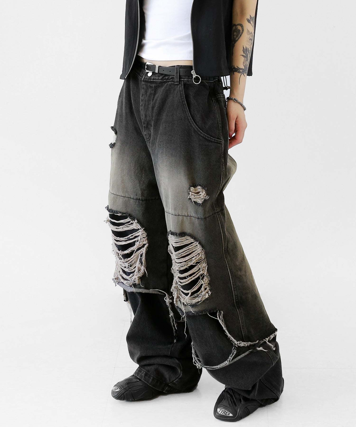 These wide-leg denim pants feature bold distressing and a layered-look design that gives the illusion of stacked denim. The washed finish and oversized fit bring serious vintage vibes, while the unique structure sets you apart.This is the pair you reach for when you want your outfit to speak first.