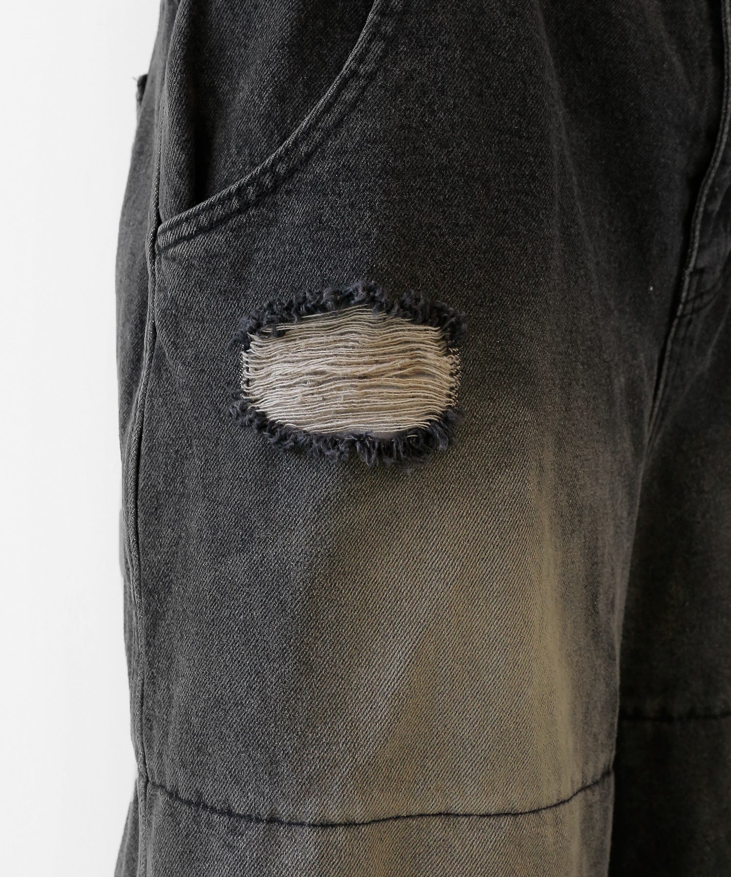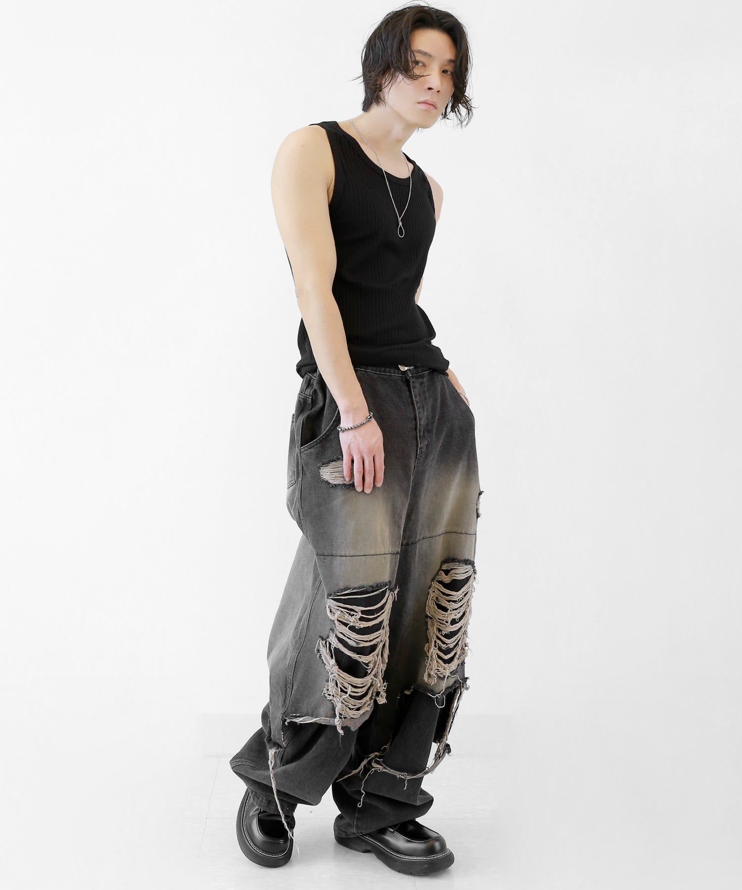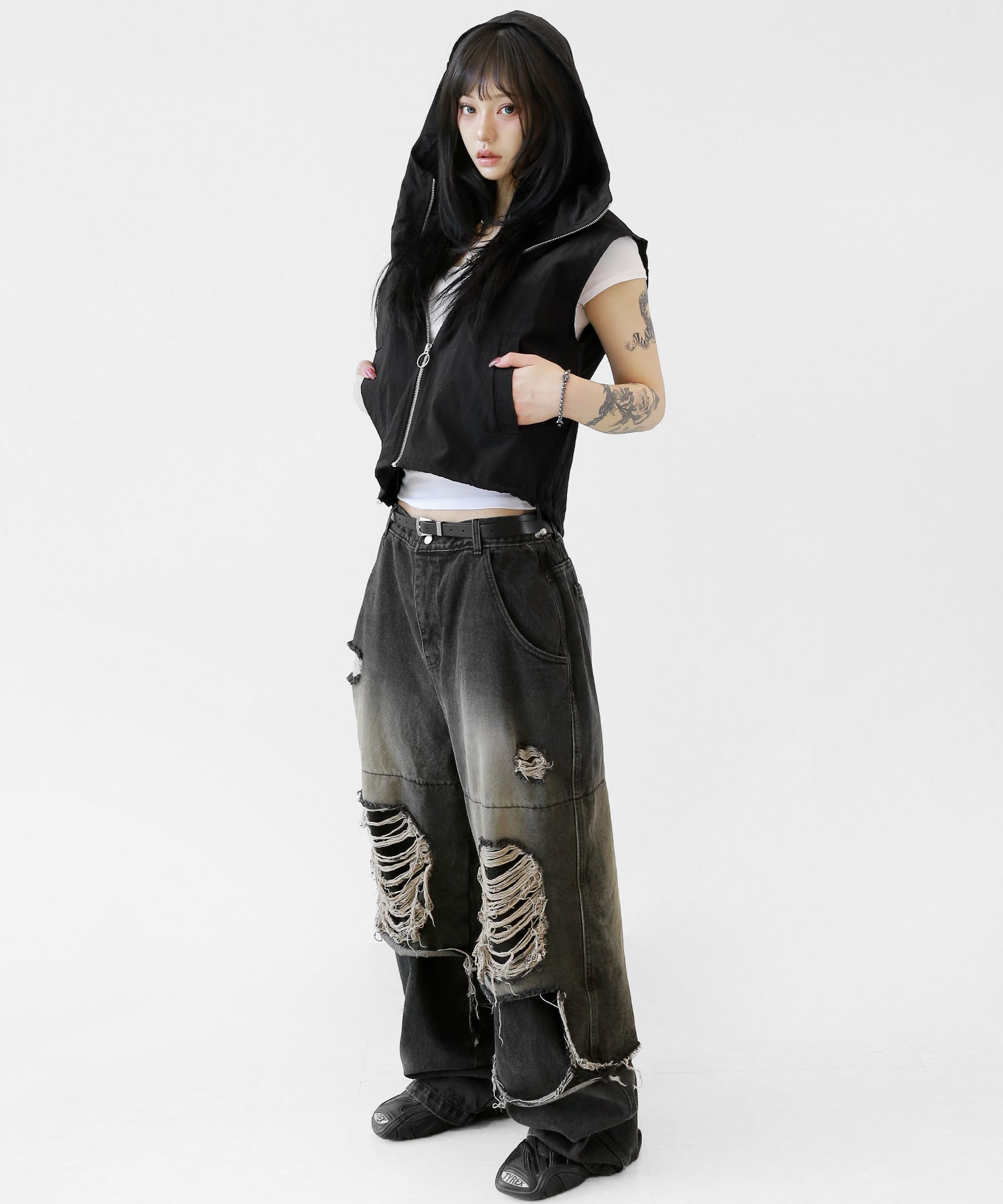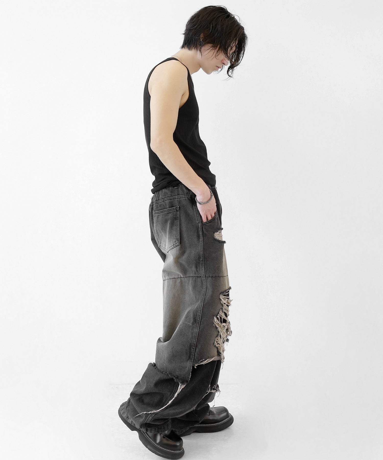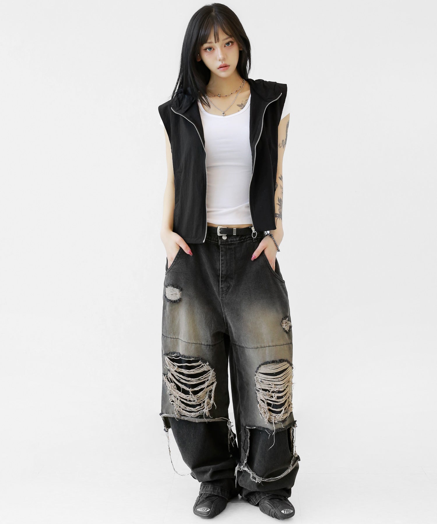 These wide-leg denim pants feature bold distressing and a layered-look design that gives the illusion of stacked denim. The washed finish and oversized fit bring serious vintage vibes, while the unique structure sets you apart.This is the pair you reach for when you want your outfit to speak first.