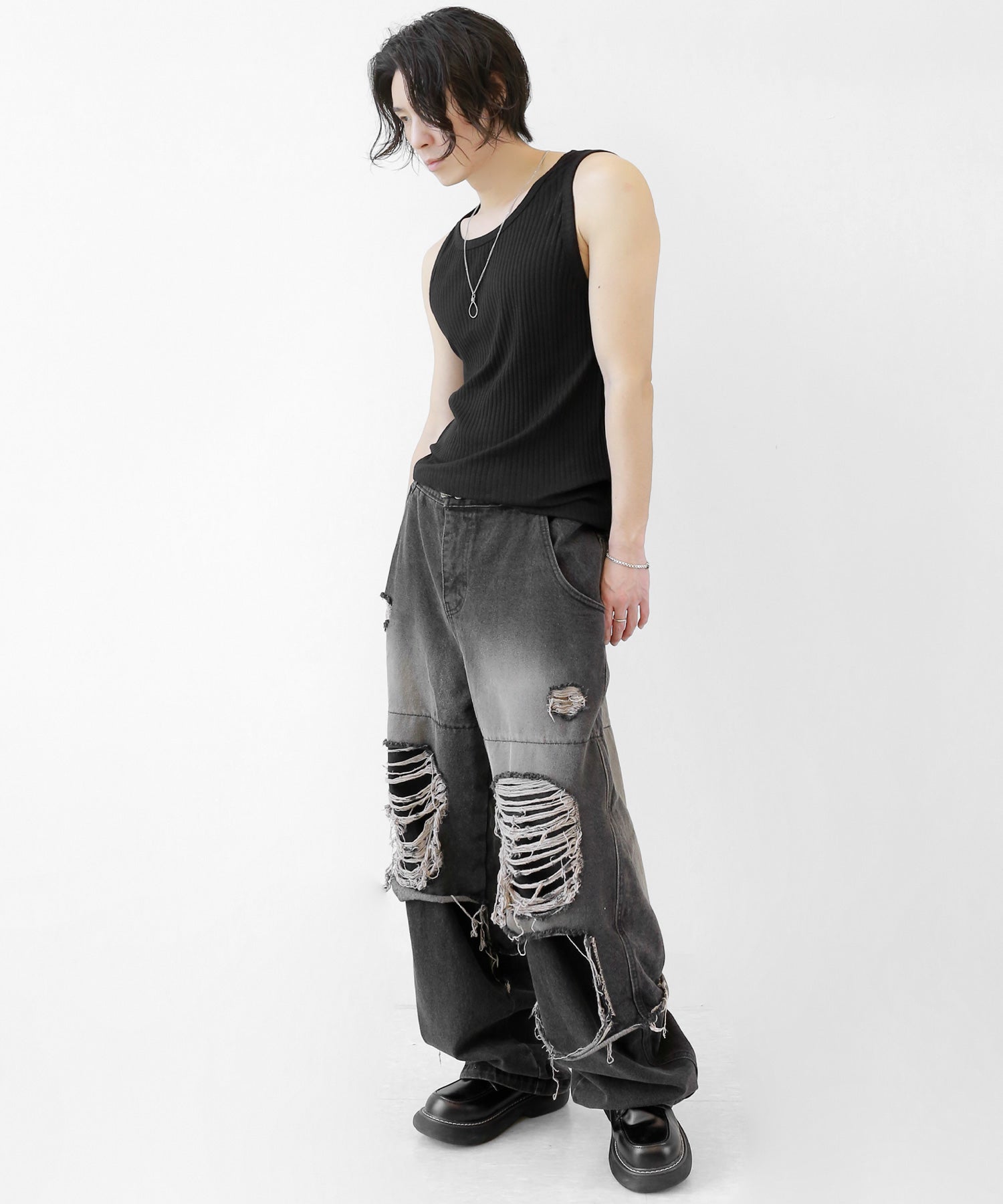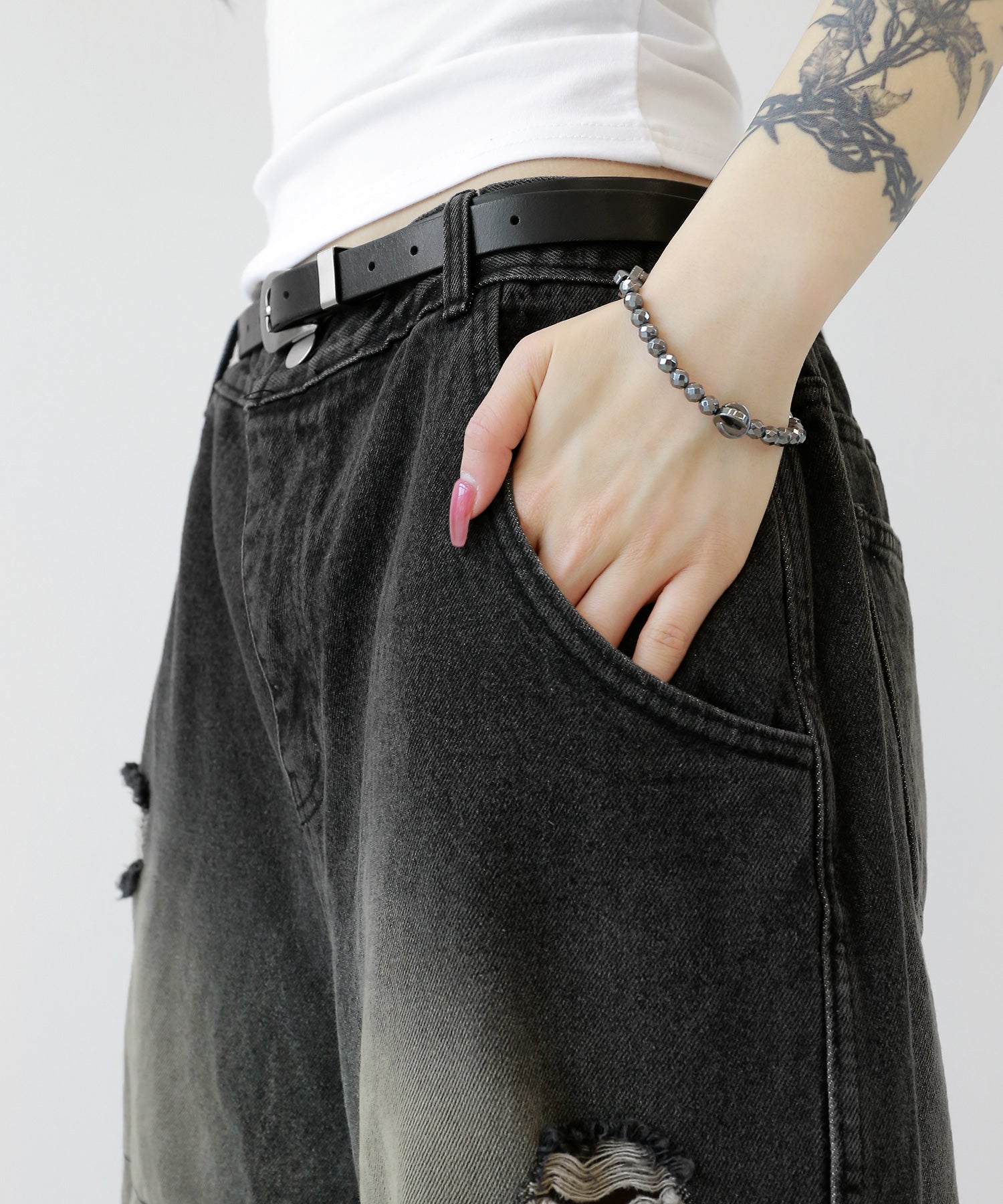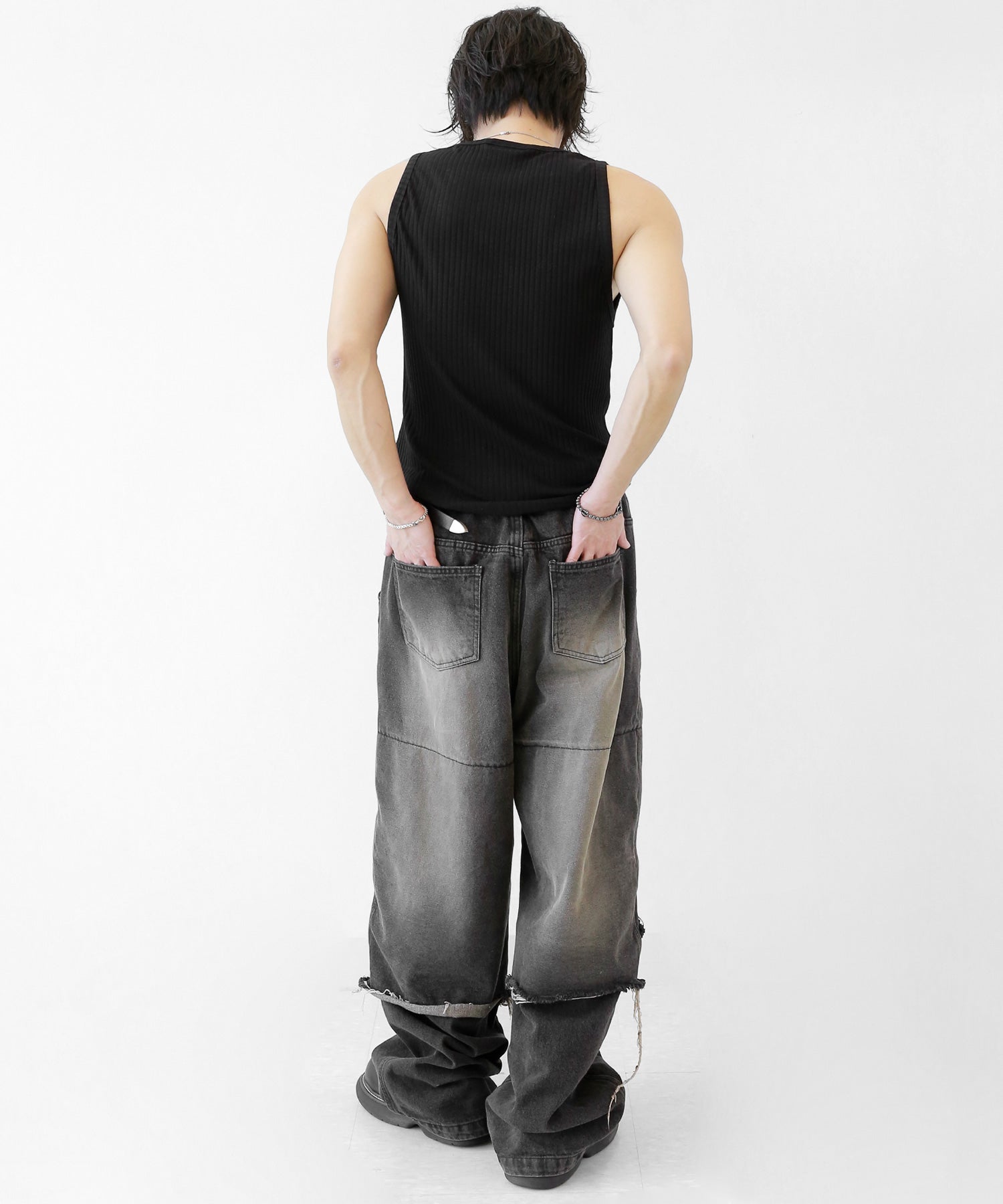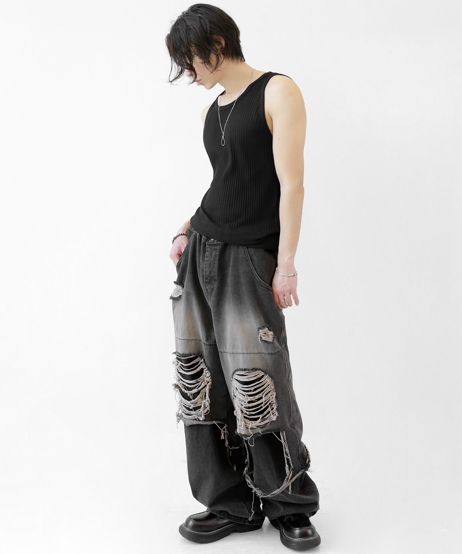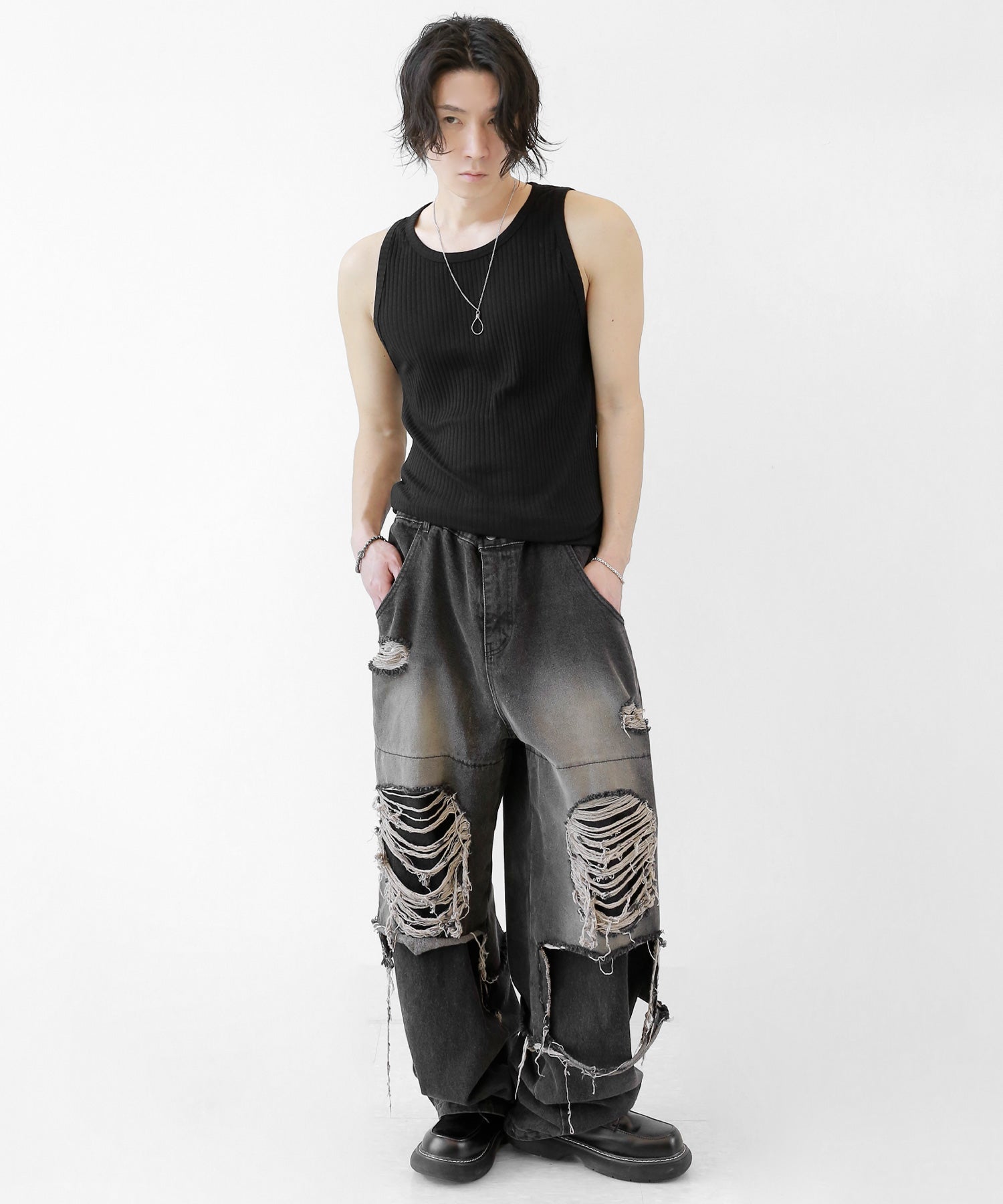These wide-leg denim pants feature bold distressing and a layered-look design that gives the illusion of stacked denim. The washed finish and oversized fit bring serious vintage vibes, while the unique structure sets you apart.This is the pair you reach for when you want your outfit to speak first.