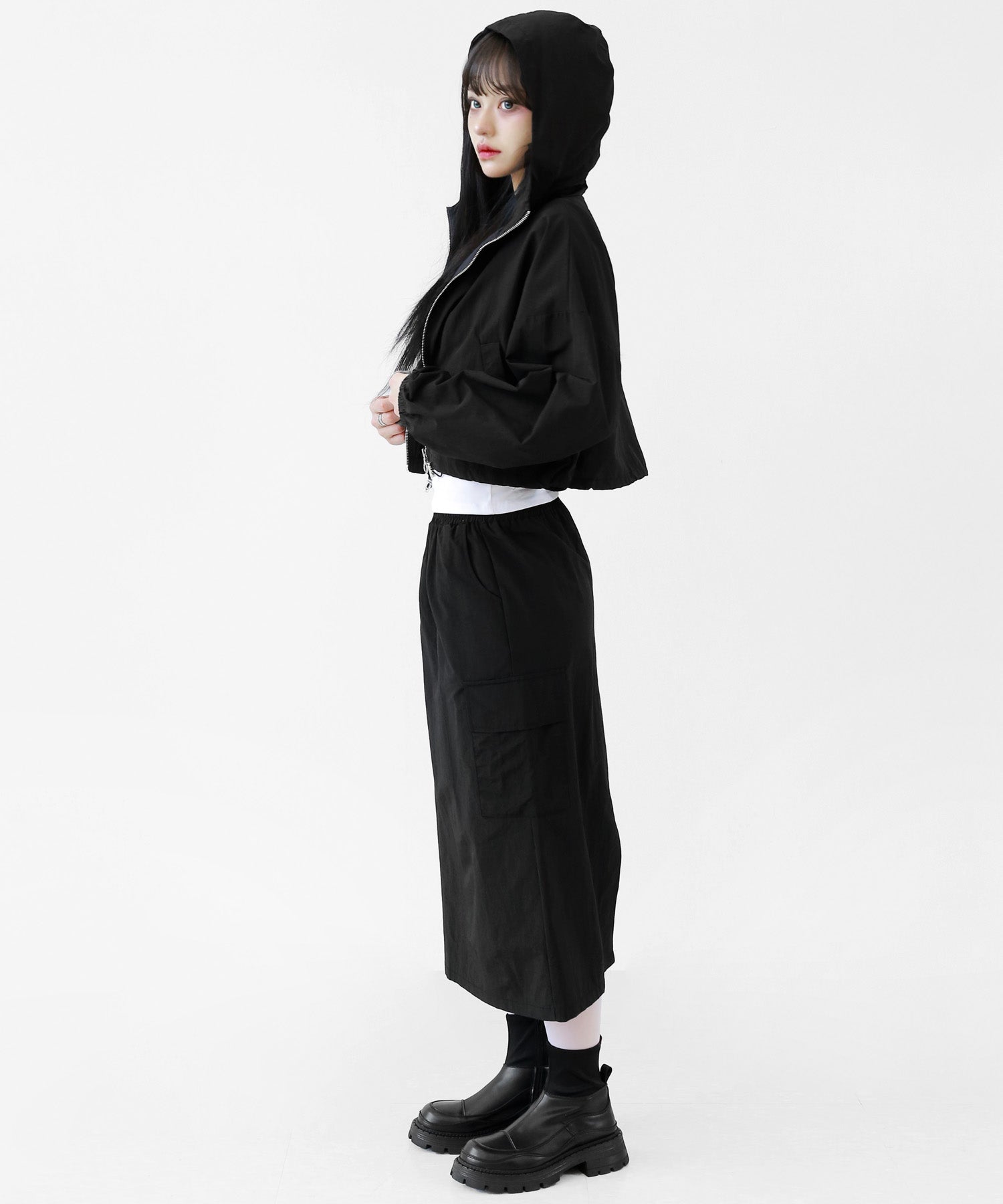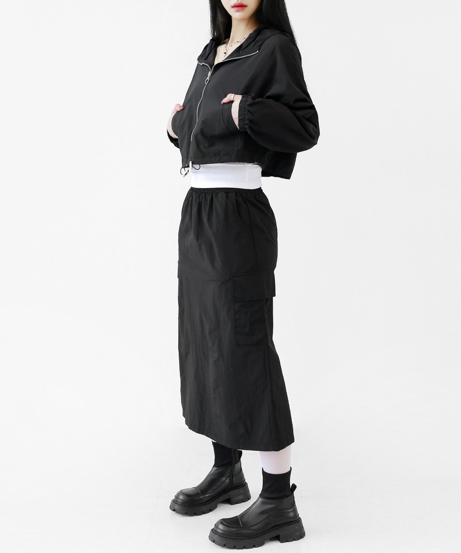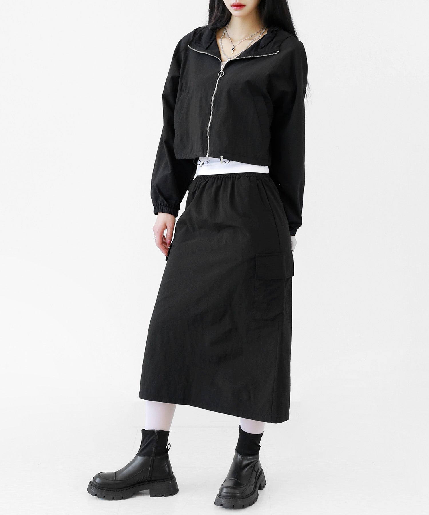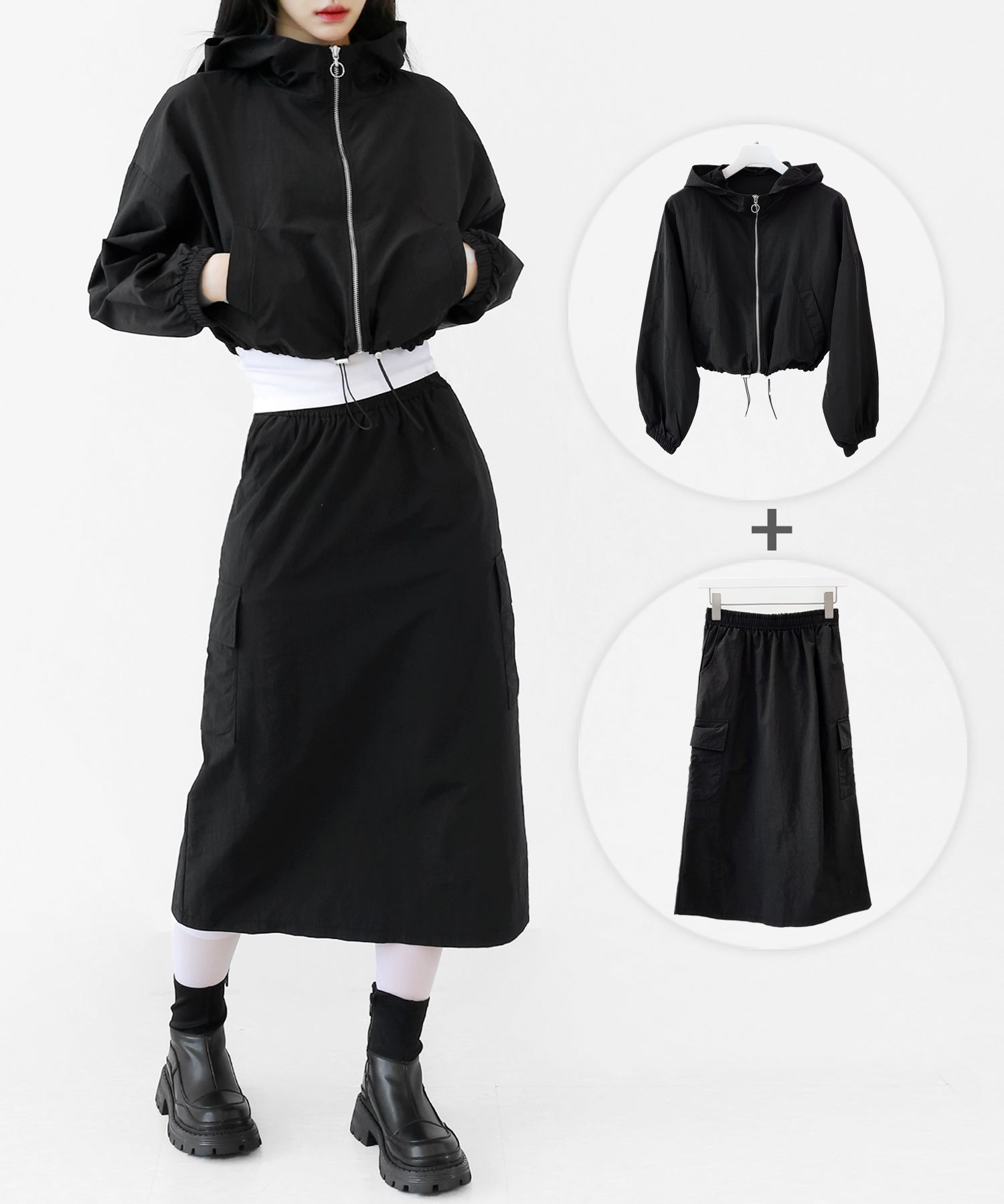 [2-PIECE SET]O-Ring Zip Cargo Pocket Skirt Set – Cropped Hoodie & Slit Skirt