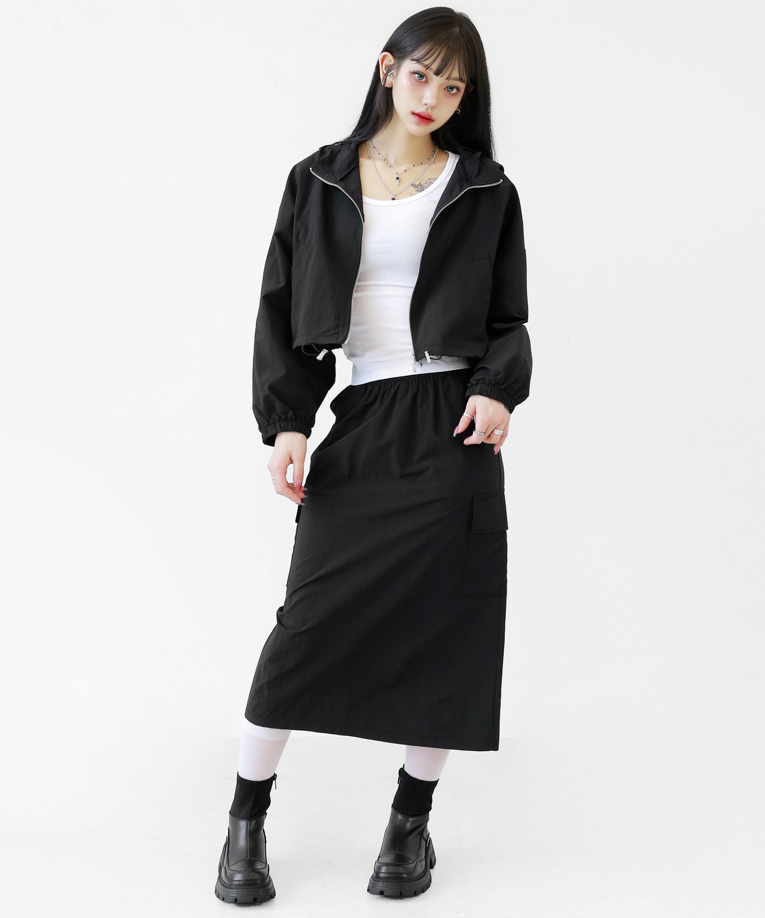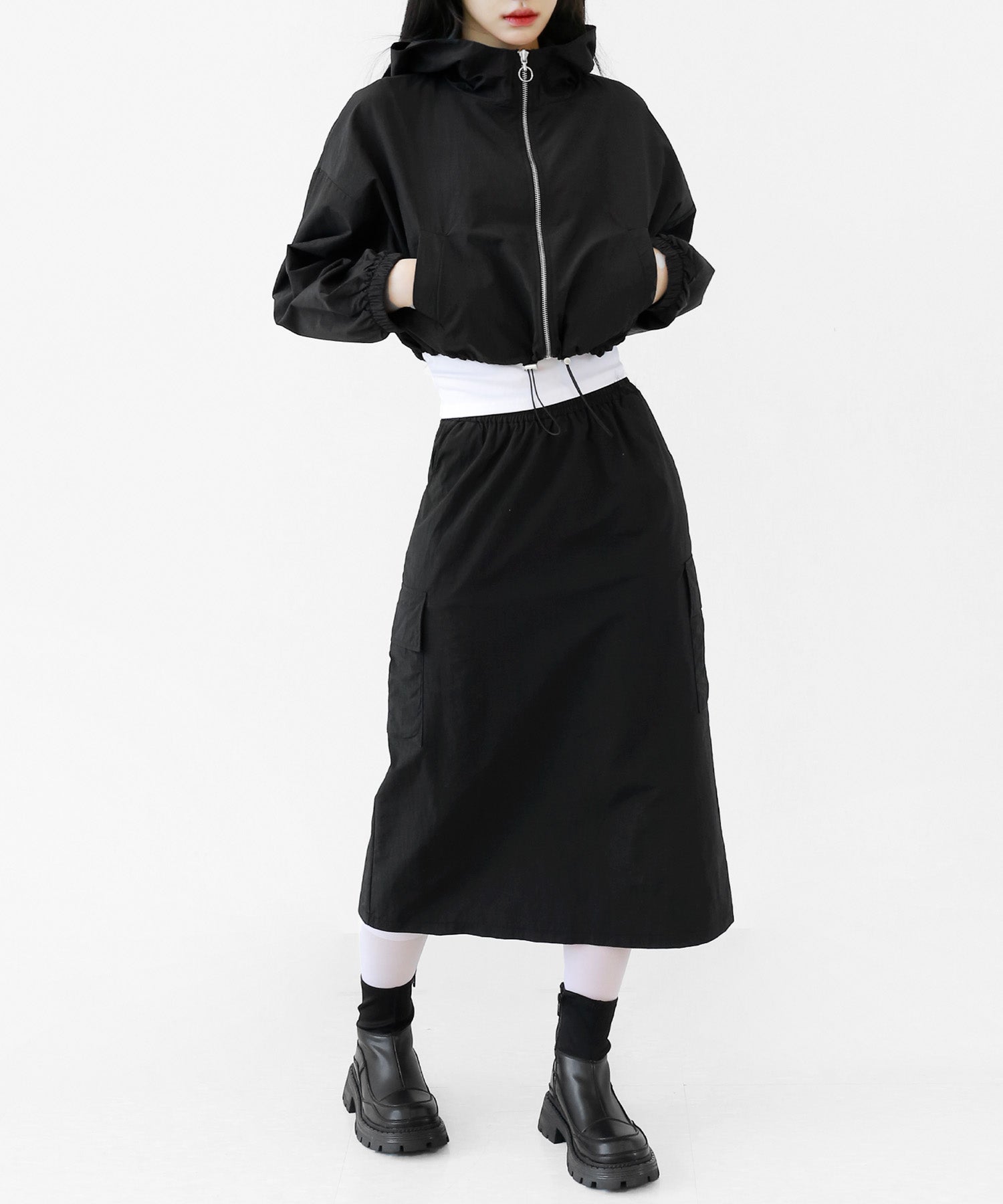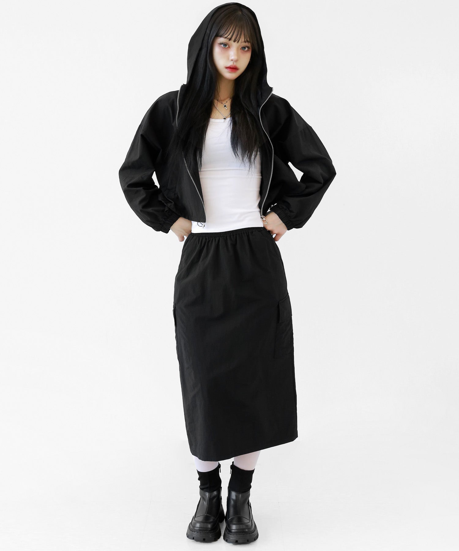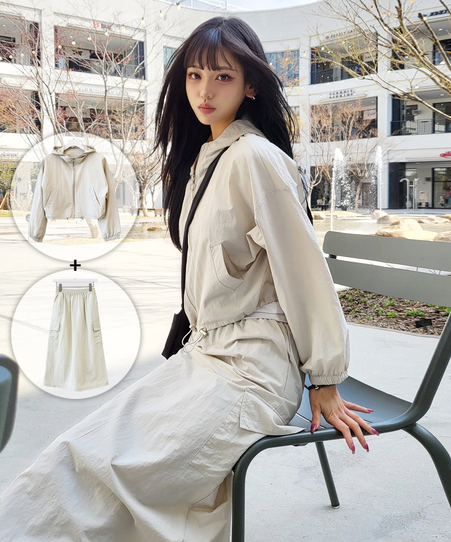 [2-PIECE SET]O-Ring Zip Cargo Pocket Skirt Set – Cropped Hoodie & Slit Skirt