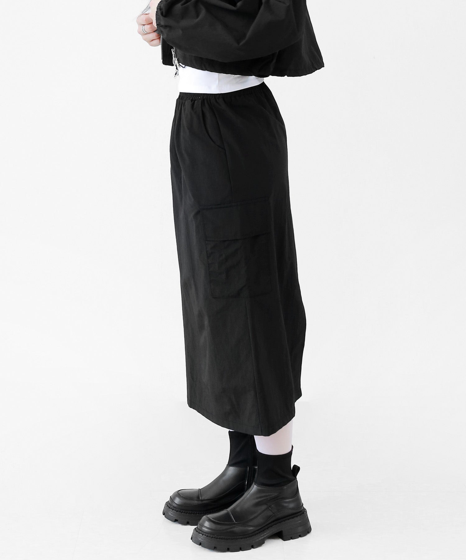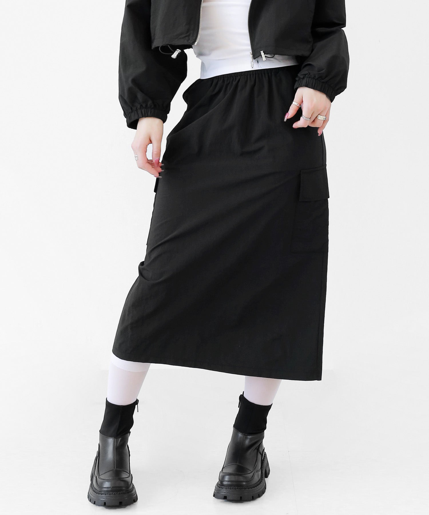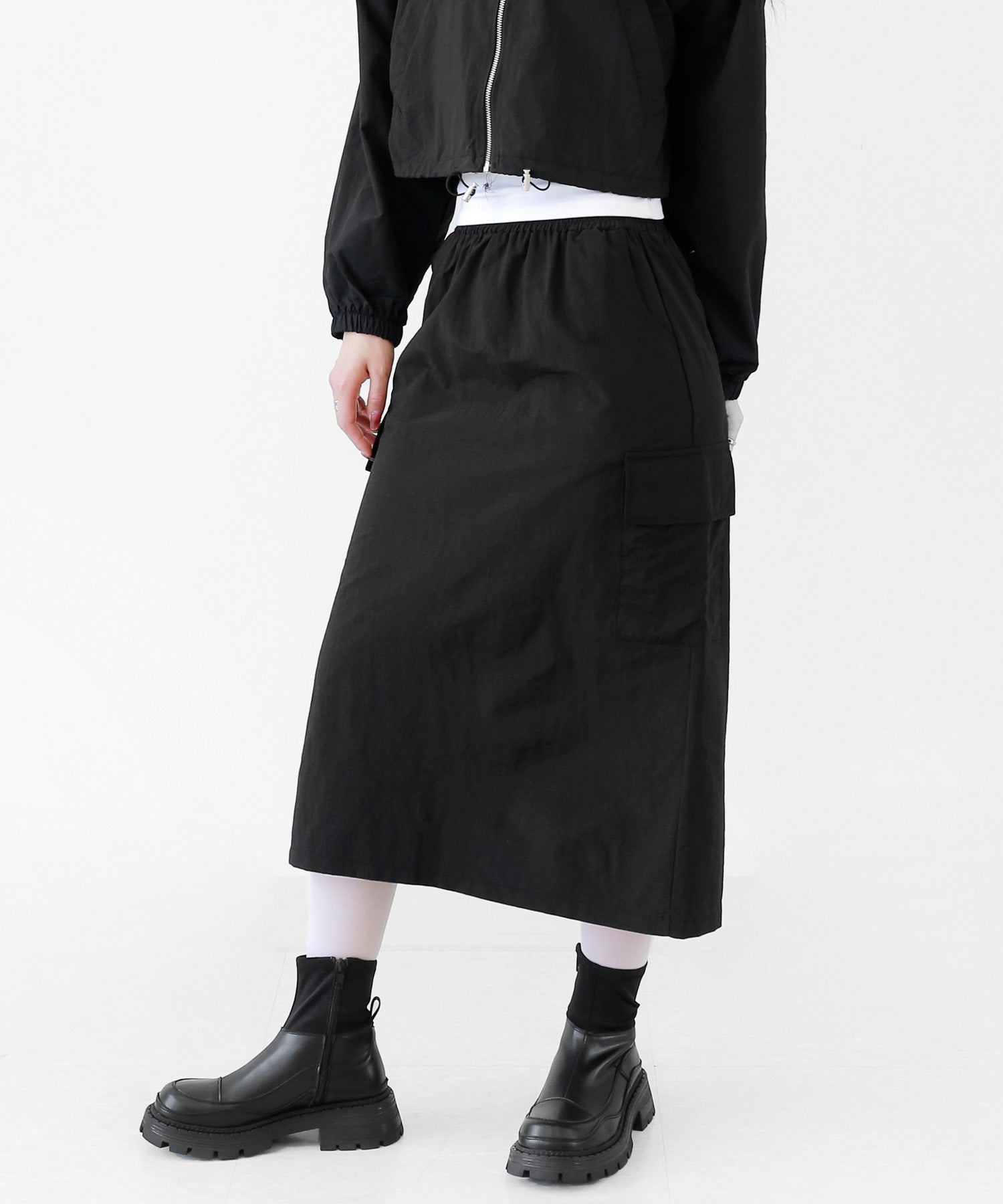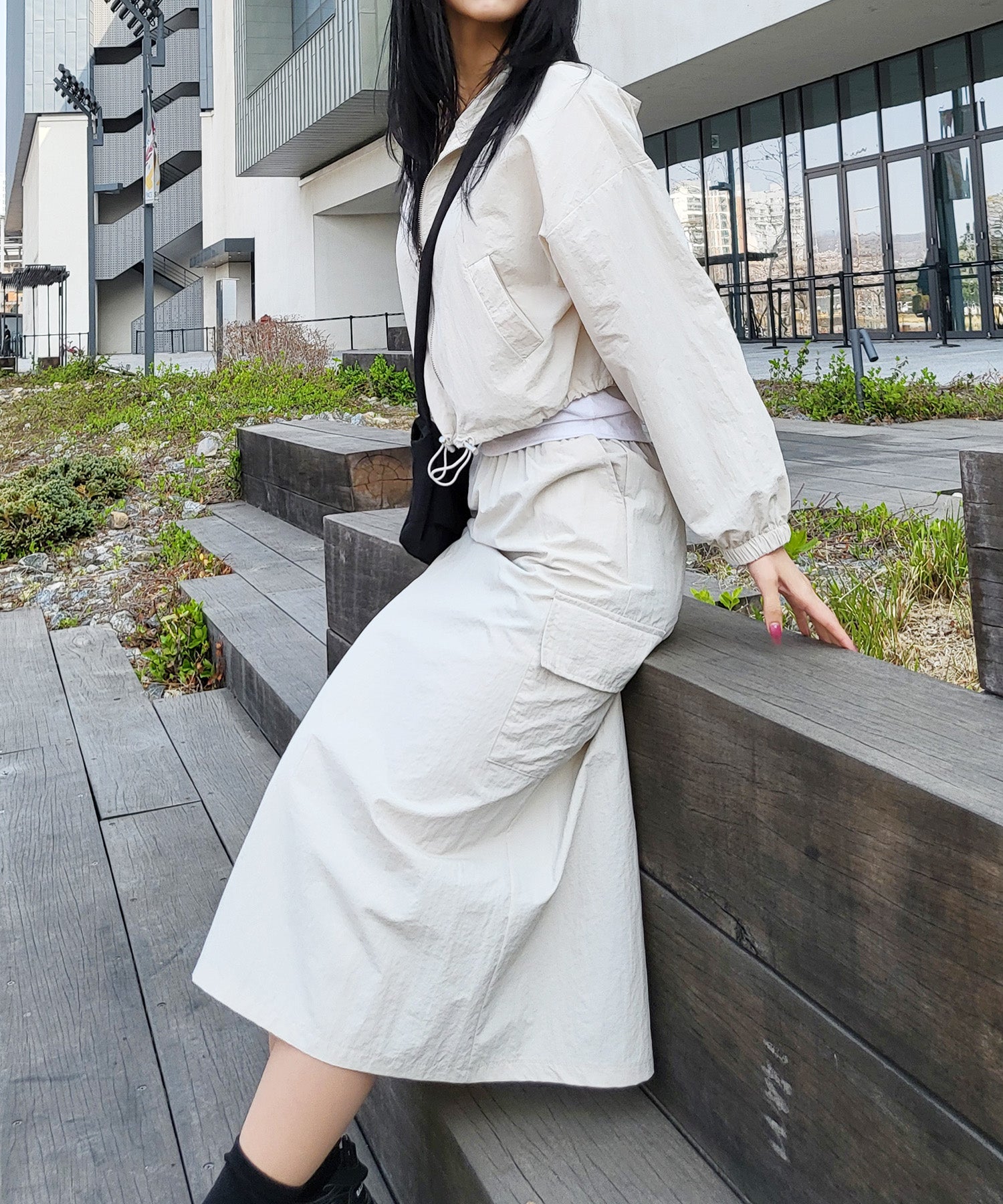 [2-PIECE SET]O-Ring Zip Cargo Pocket Skirt Set – Cropped Hoodie & Slit Skirt