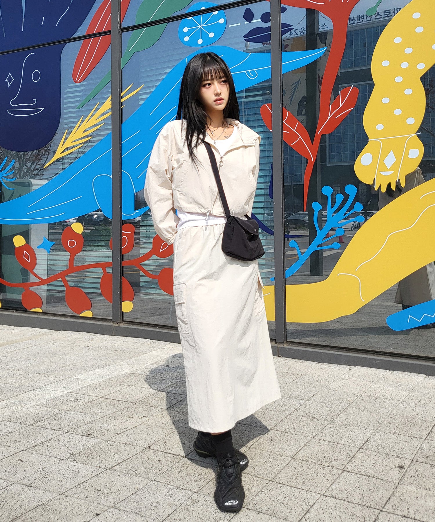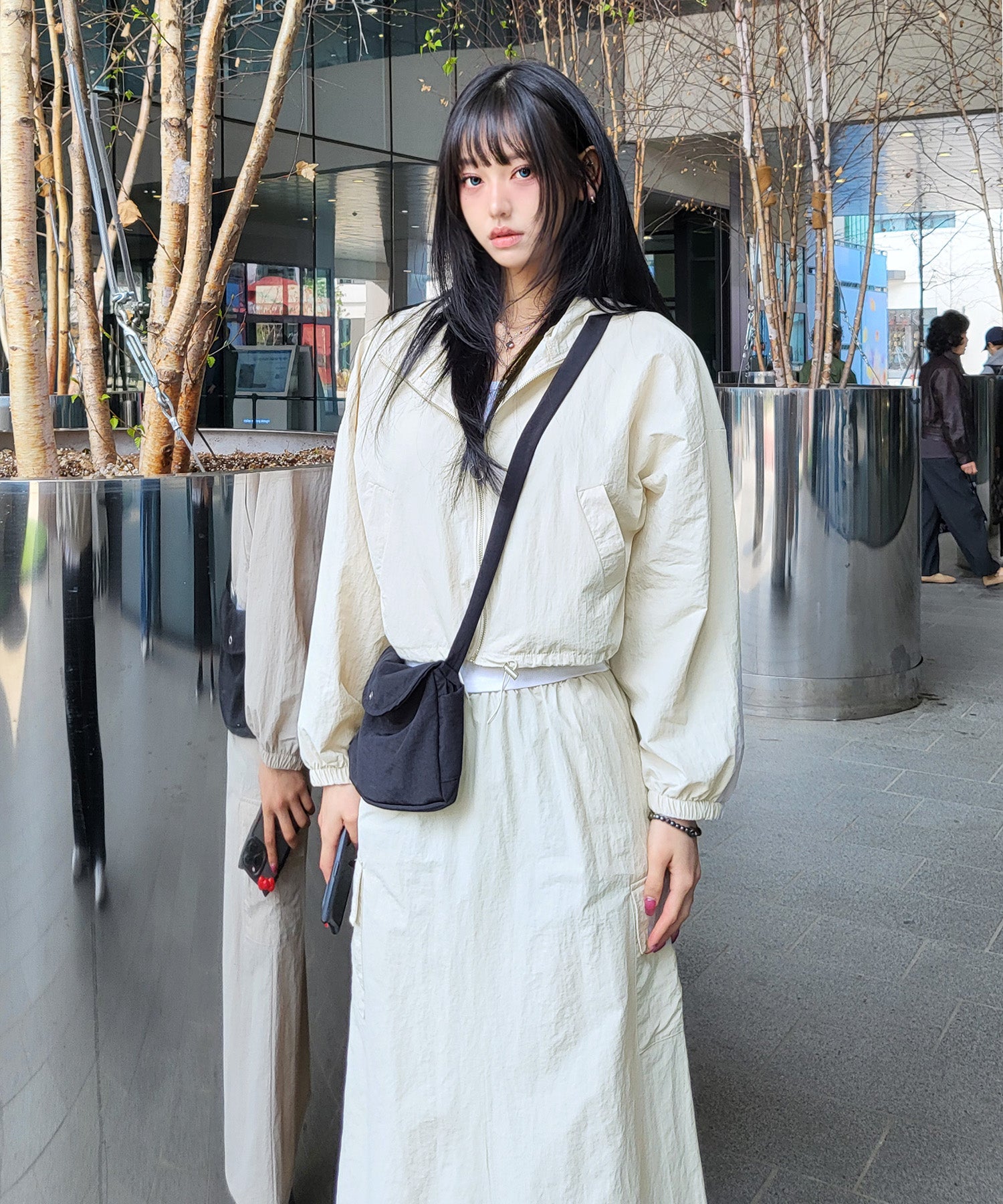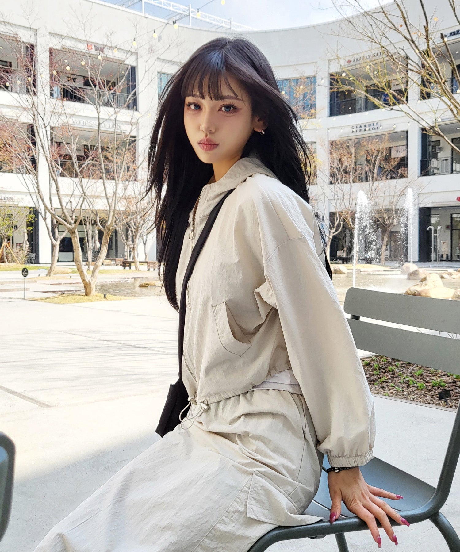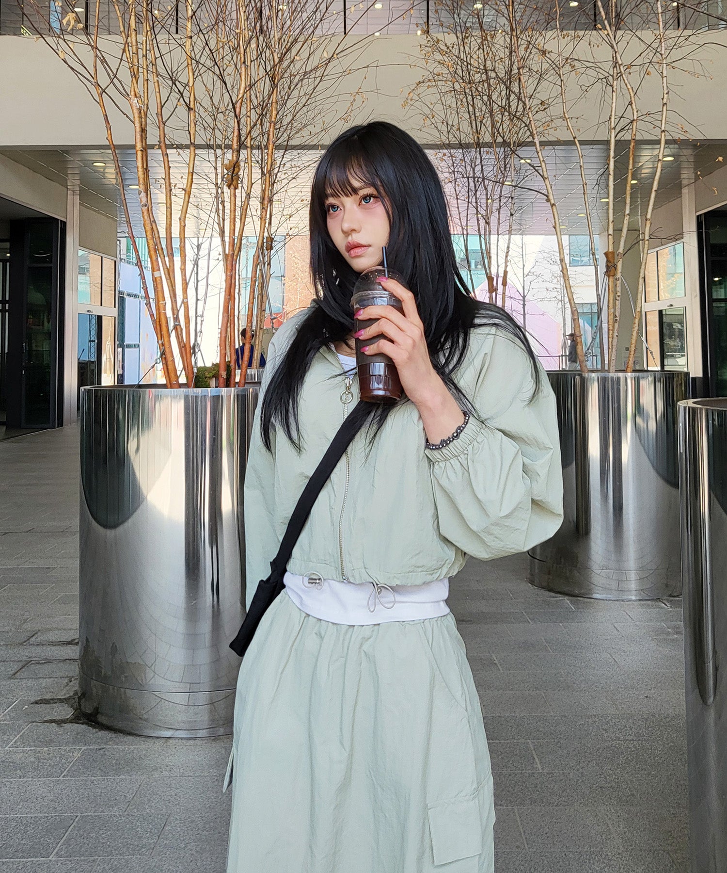 A street-meets-modern two-piece set featuring a cropped hoodie and high-slit H-line skirt. The O-ring zipper and cargo pockets add edgy detail, while the stretchy waistband ensures all-day comfort. Loved by trendsetters in Korea and Japan, this versatile outfit is perfect for layering or styling solo—your go-to for effortless, fashion-forward looks.
