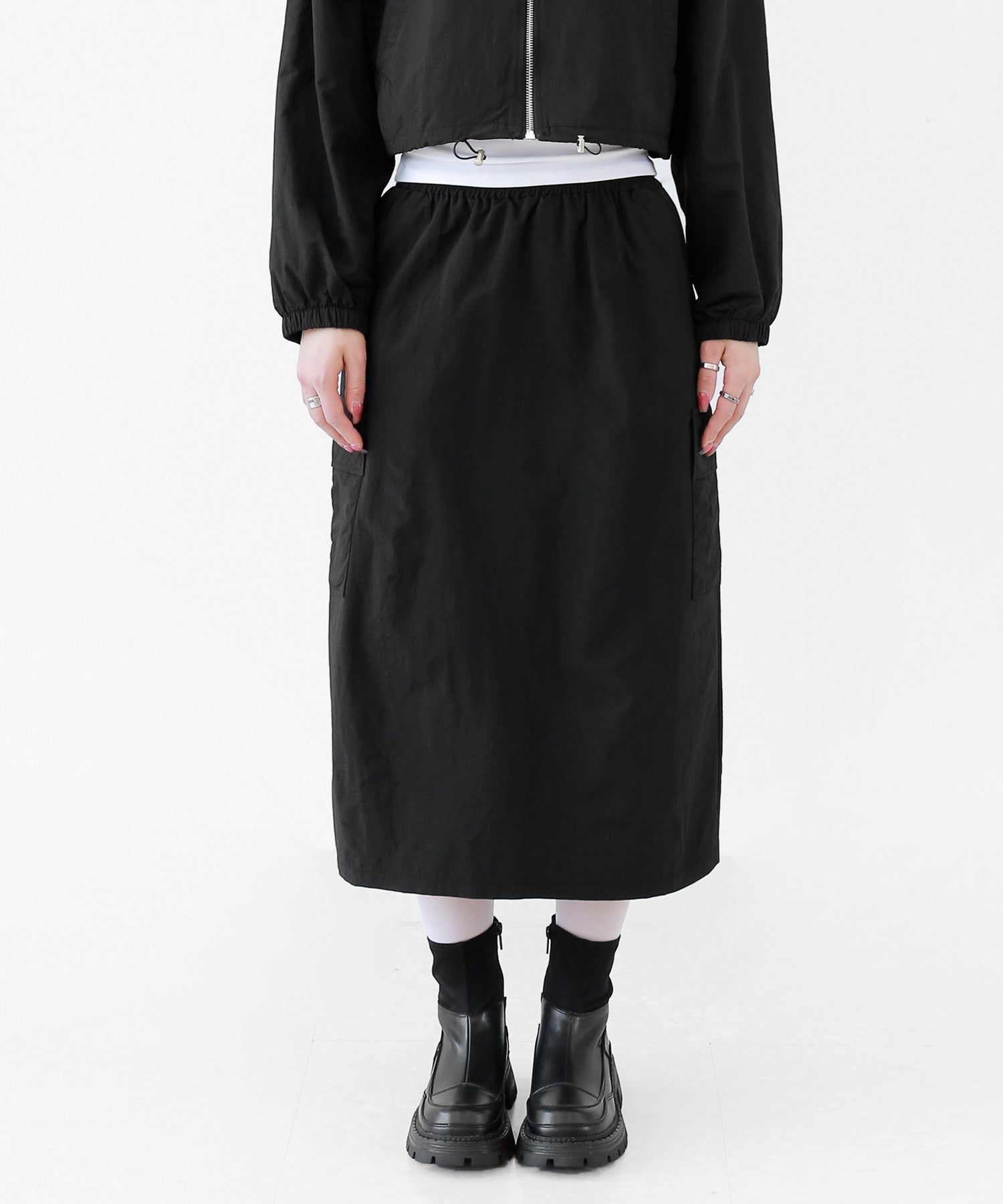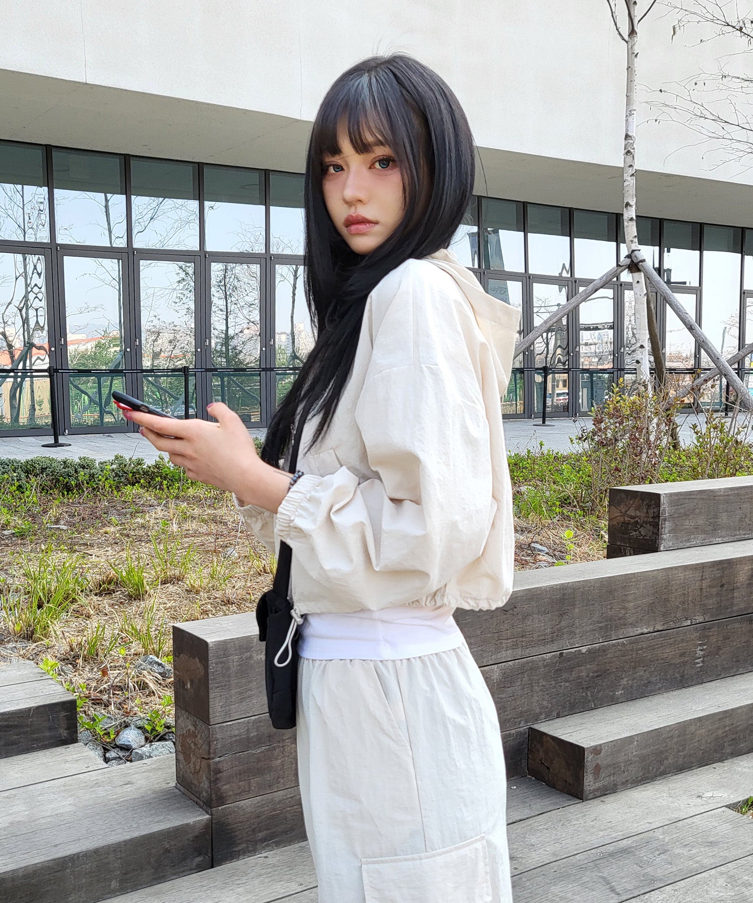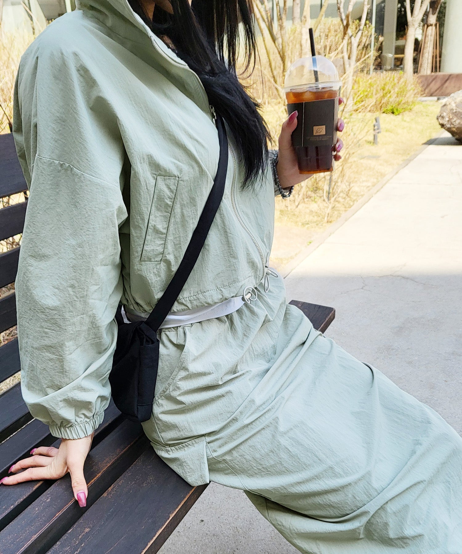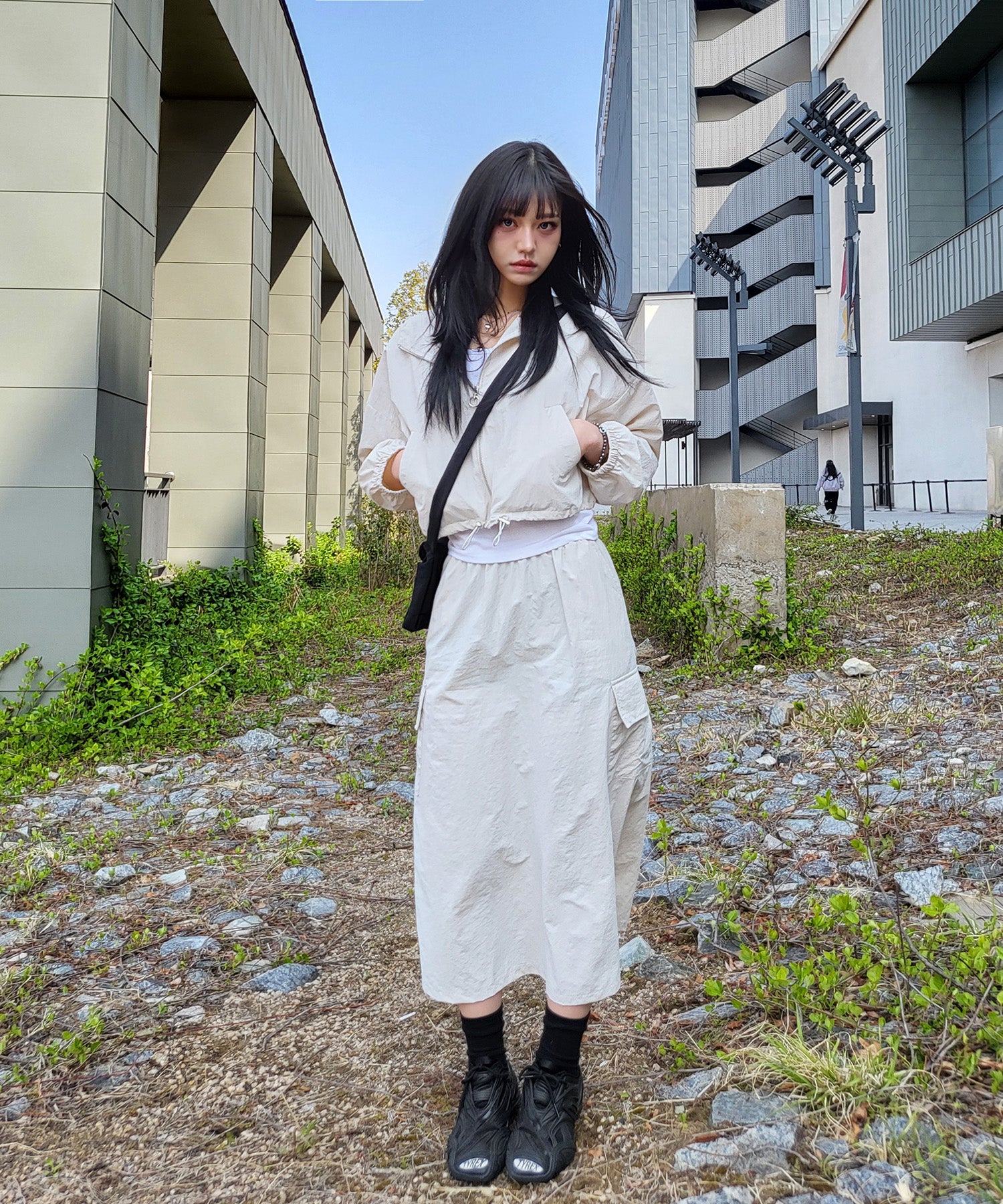 A street-meets-modern two-piece set featuring a cropped hoodie and high-slit H-line skirt. The O-ring zipper and cargo pockets add edgy detail, while the stretchy waistband ensures all-day comfort. Loved by trendsetters in Korea and Japan, this versatile outfit is perfect for layering or styling solo—your go-to for effortless, fashion-forward looks.