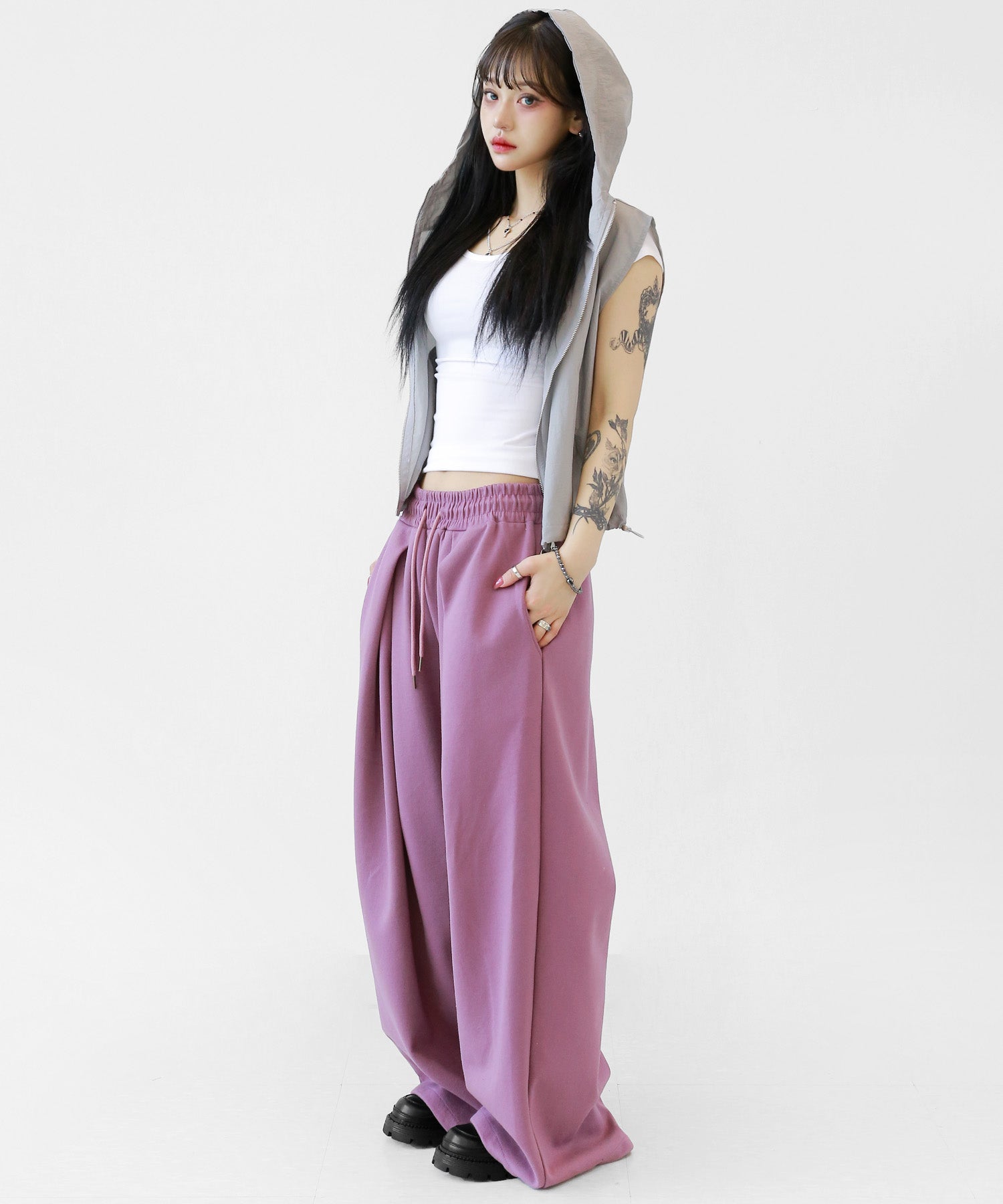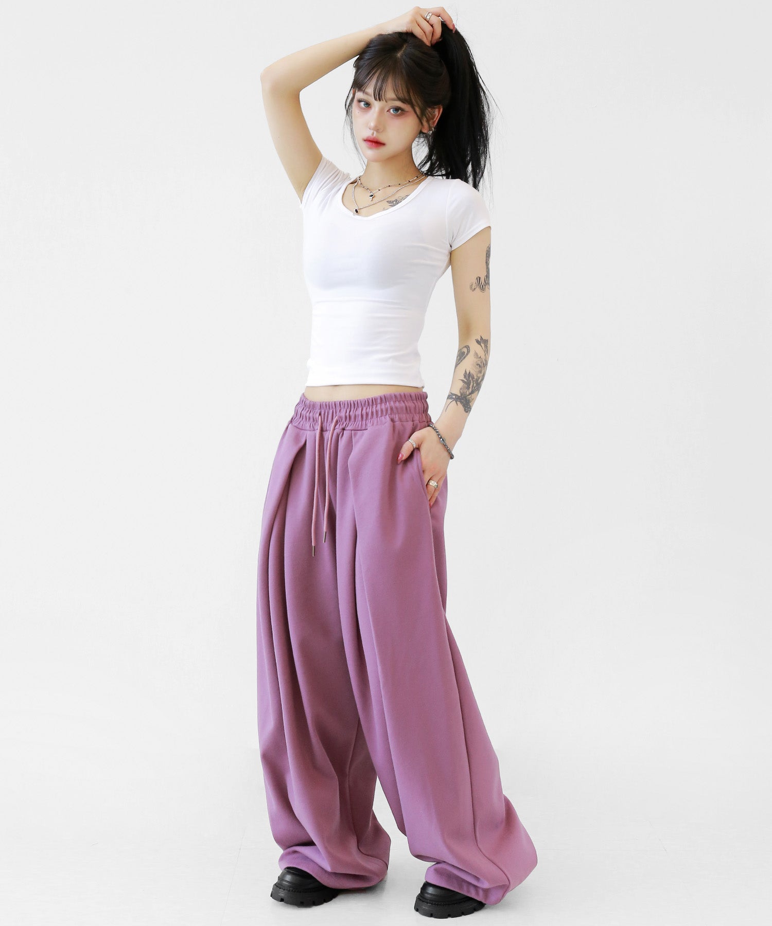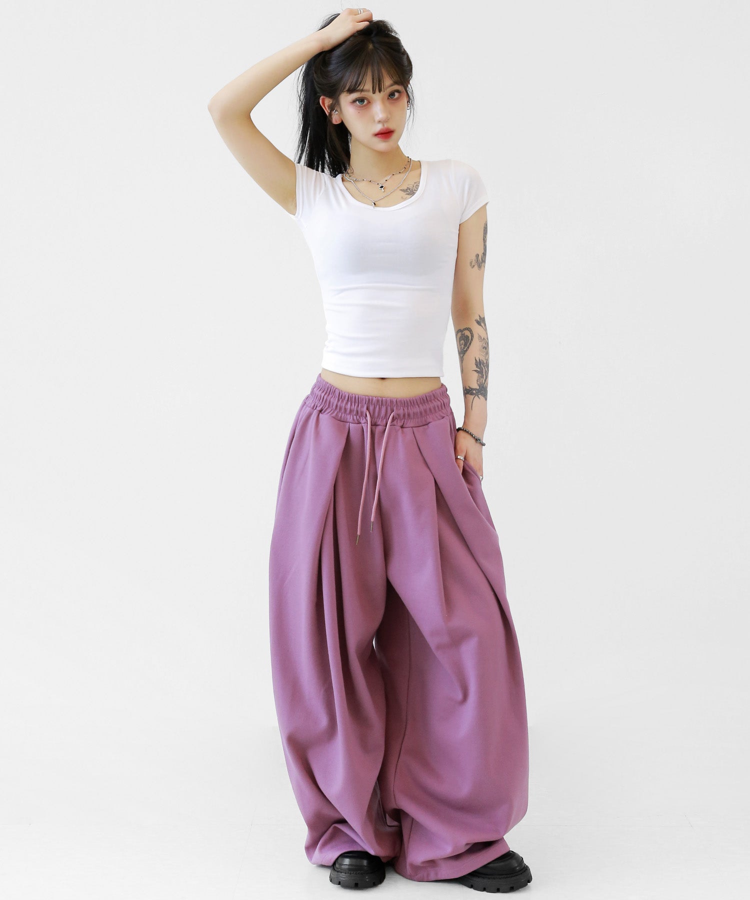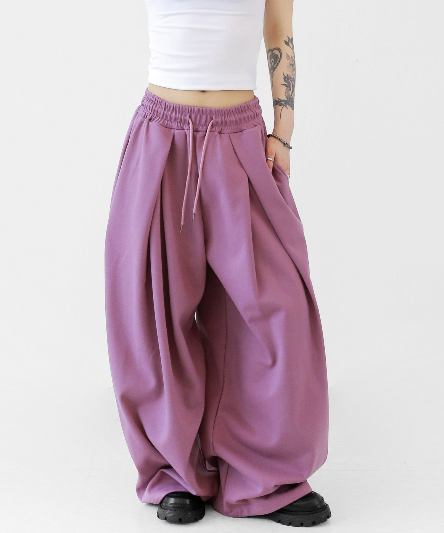 Featuring a voluminous tuck detail and a sleek, elongated silhouette, these pants are made for both modern streetwear and minimalist wardrobes.These sweatpants are designed to give your outfit a relaxed yet elevated edge. Pair them with cropped tops or oversized outerwear for an effortlessly cool look.