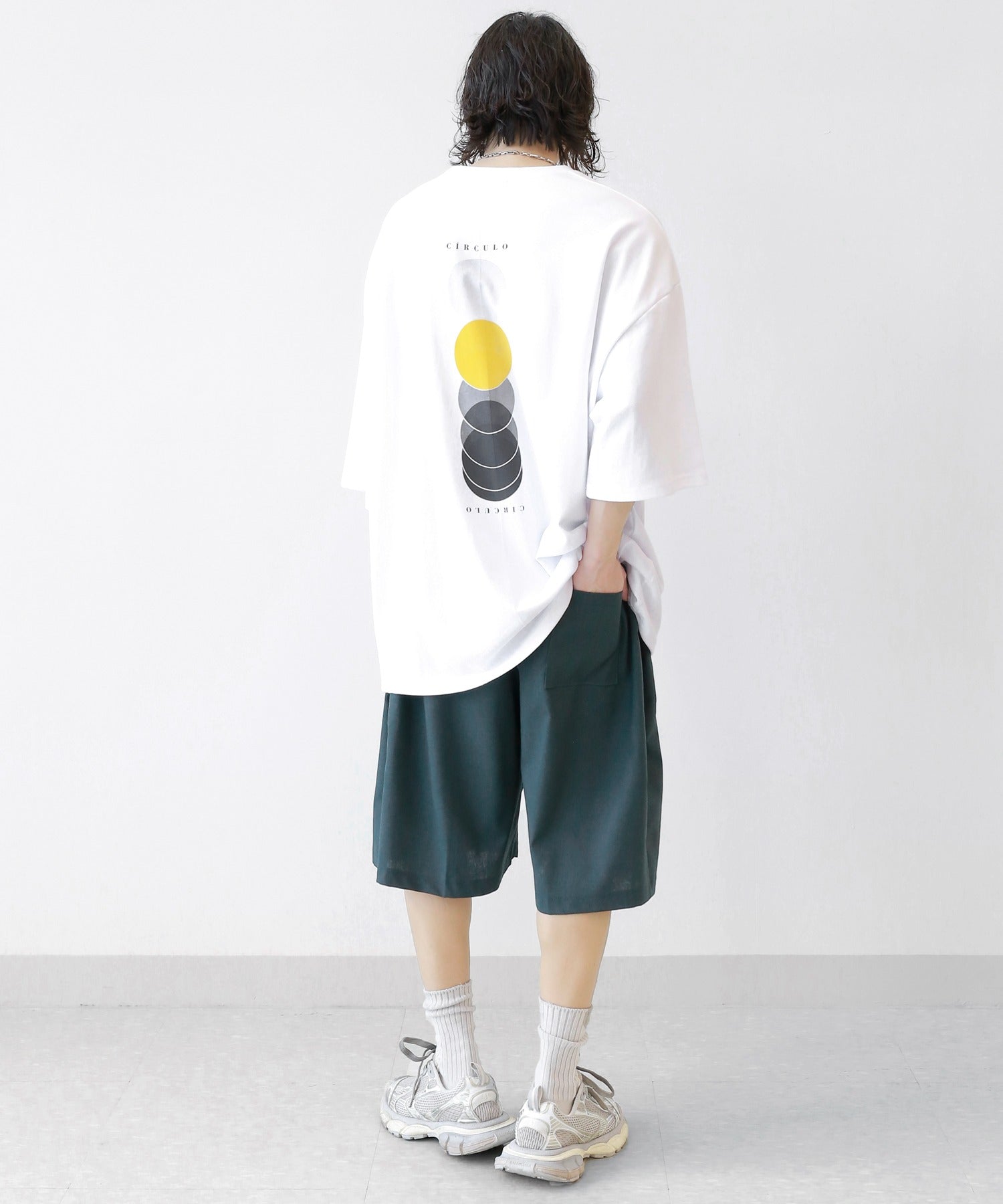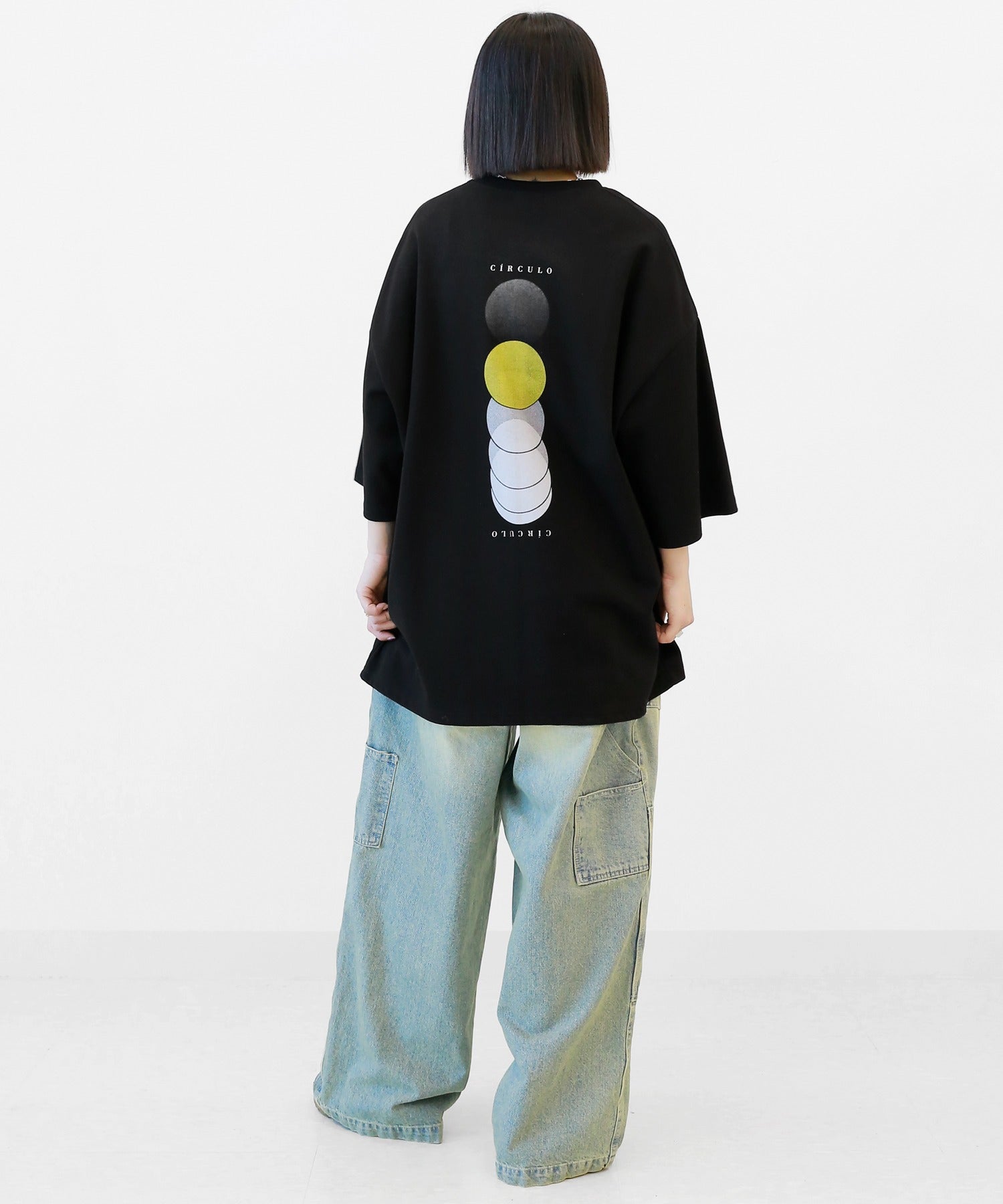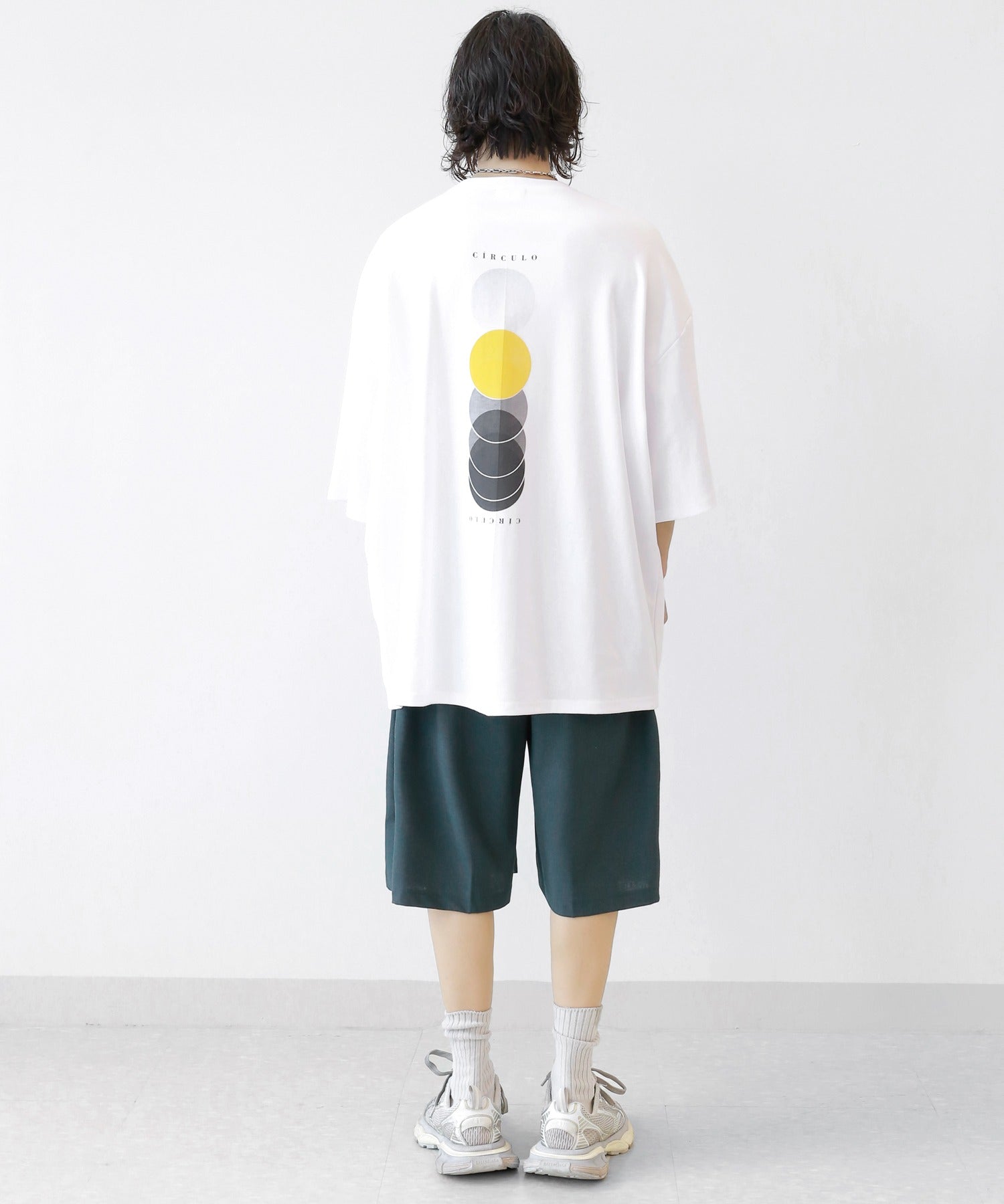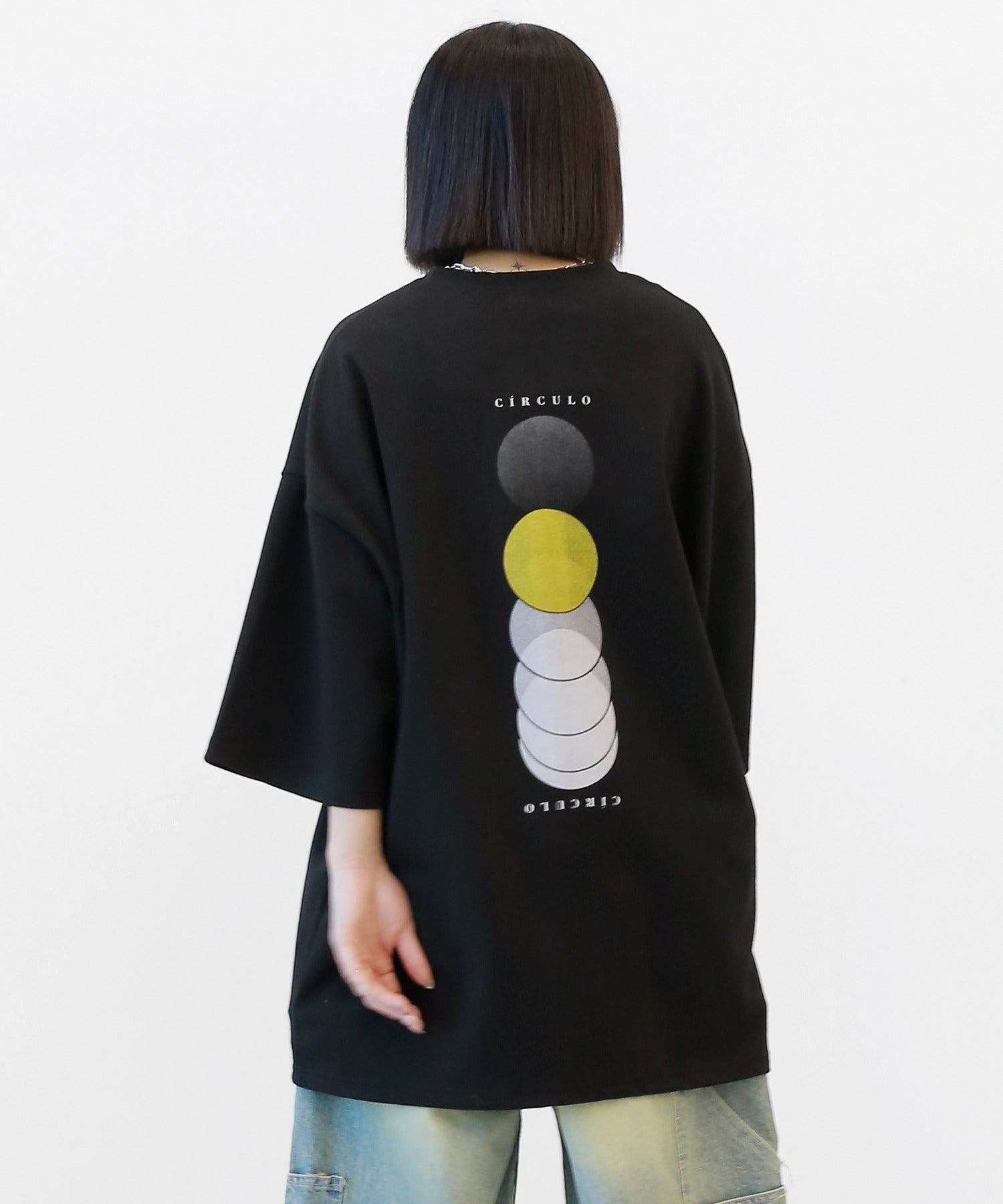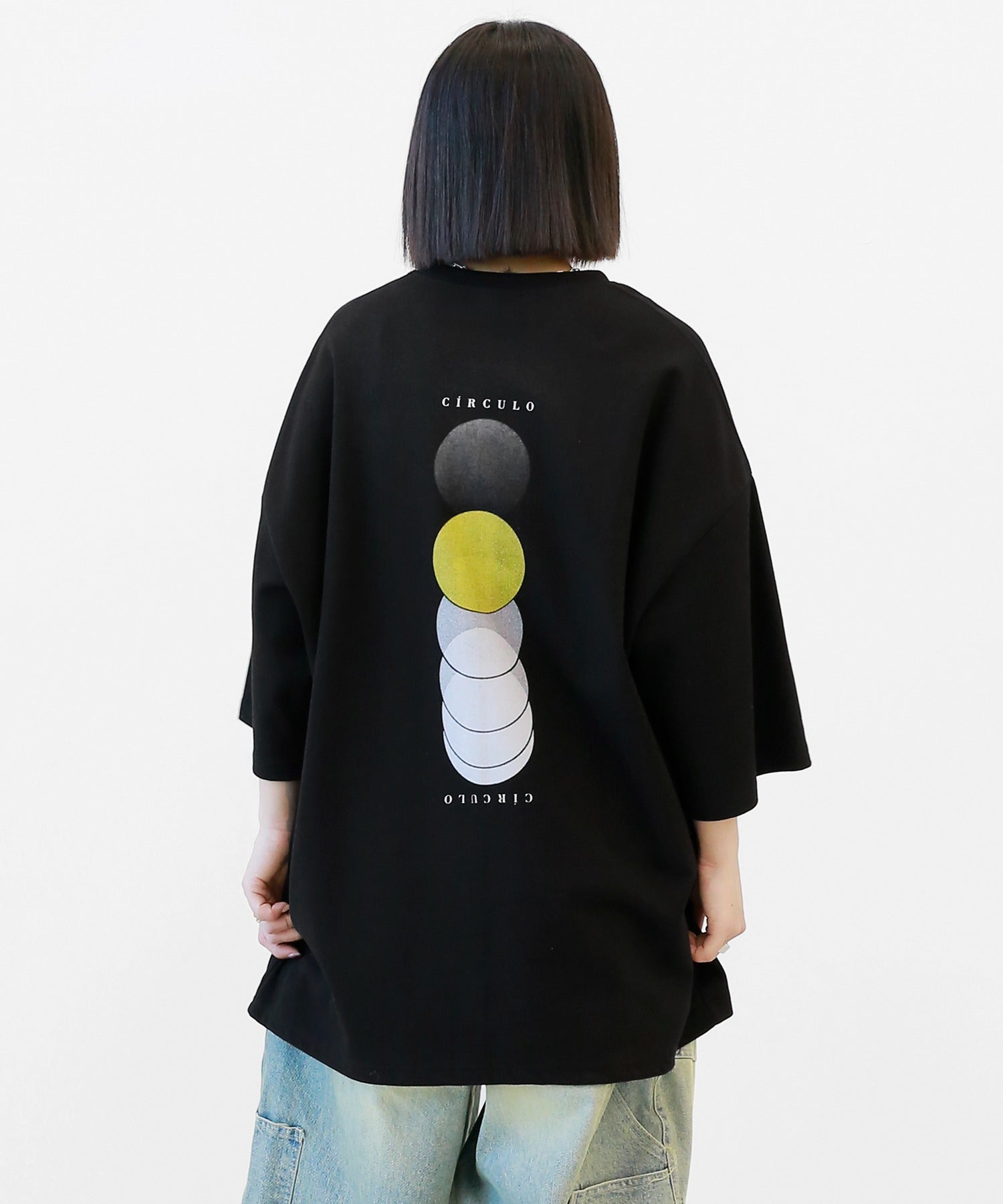 This oversized tee keeps it clean with a small chest logo and contrast seam detail — then surprises with a bold two-tone circle graphic in yellow on the back.