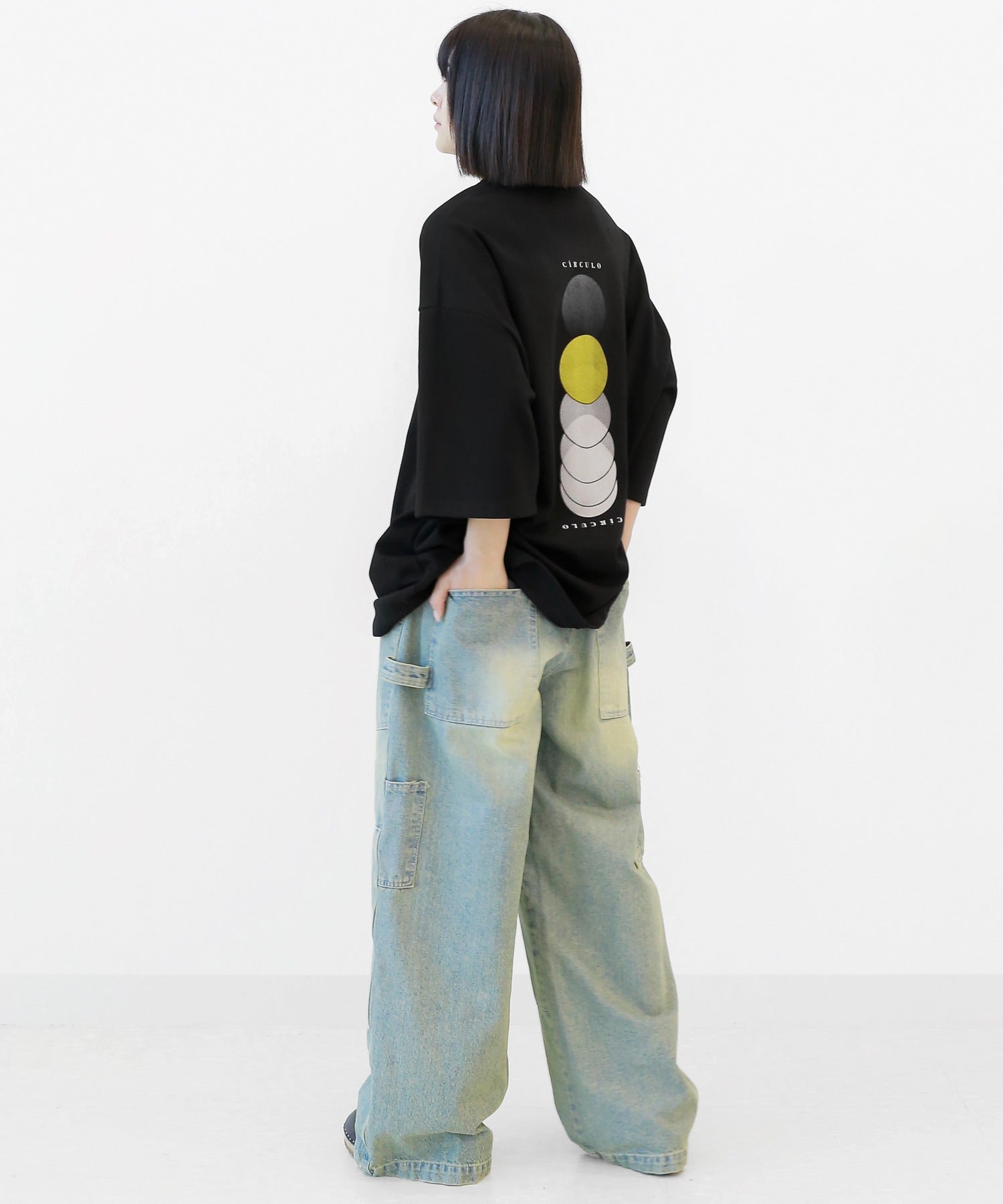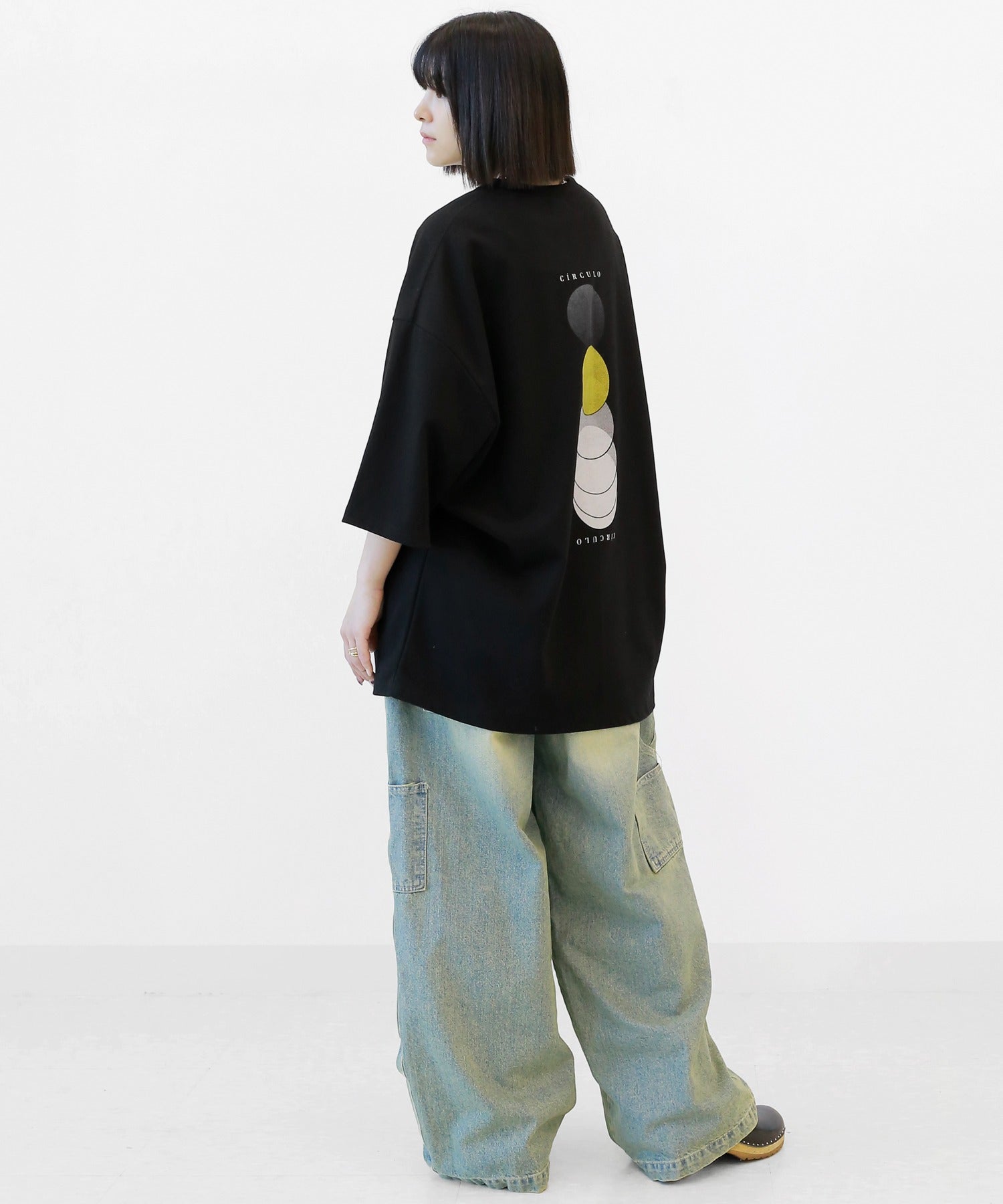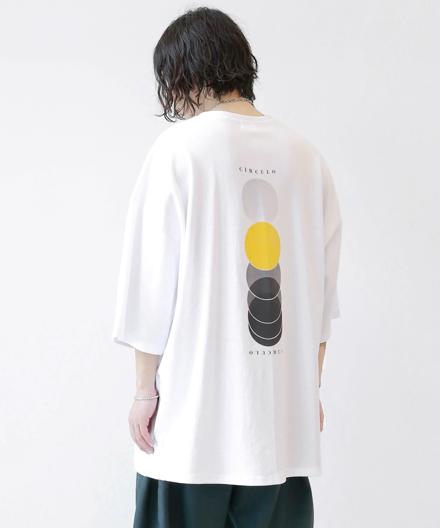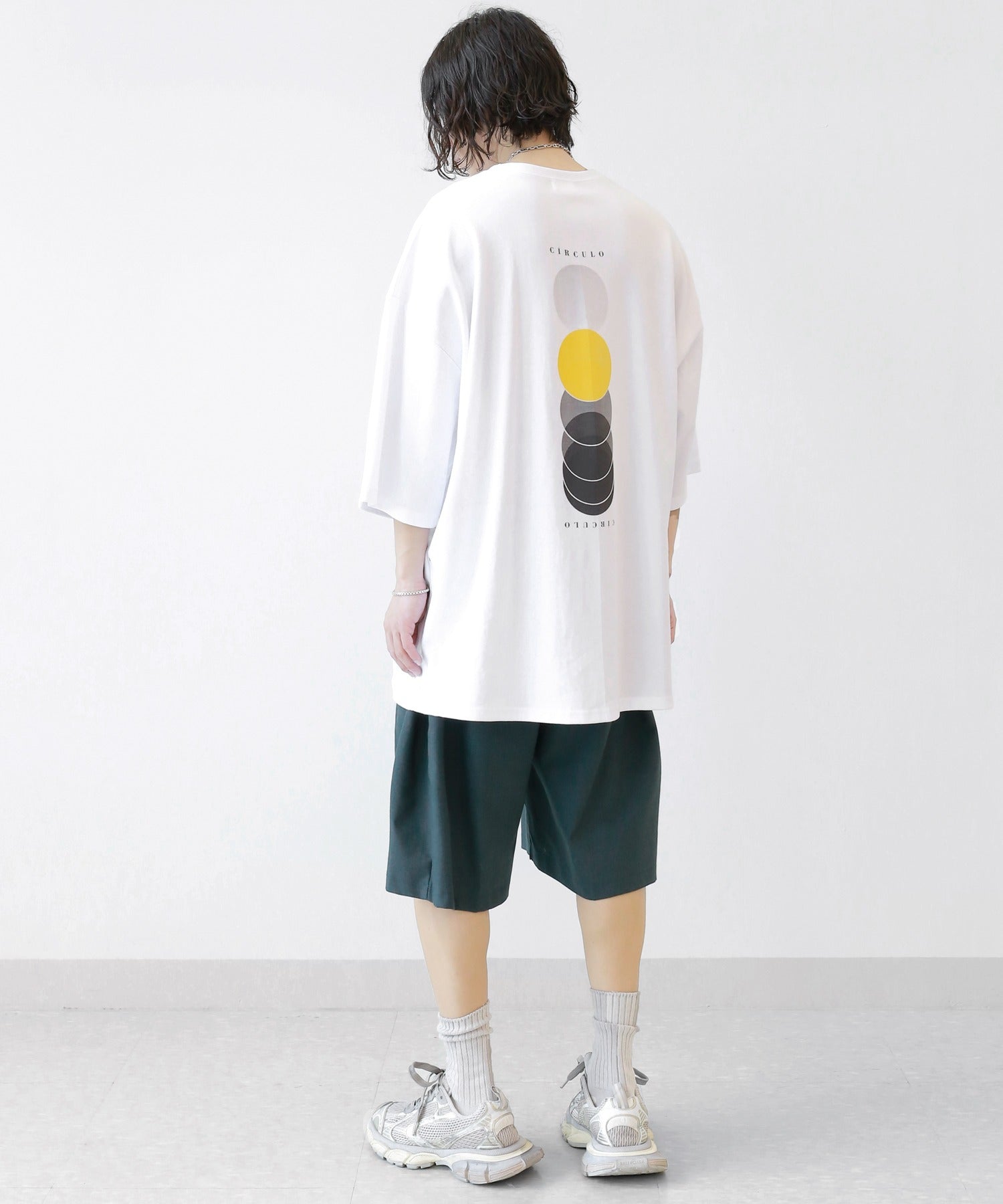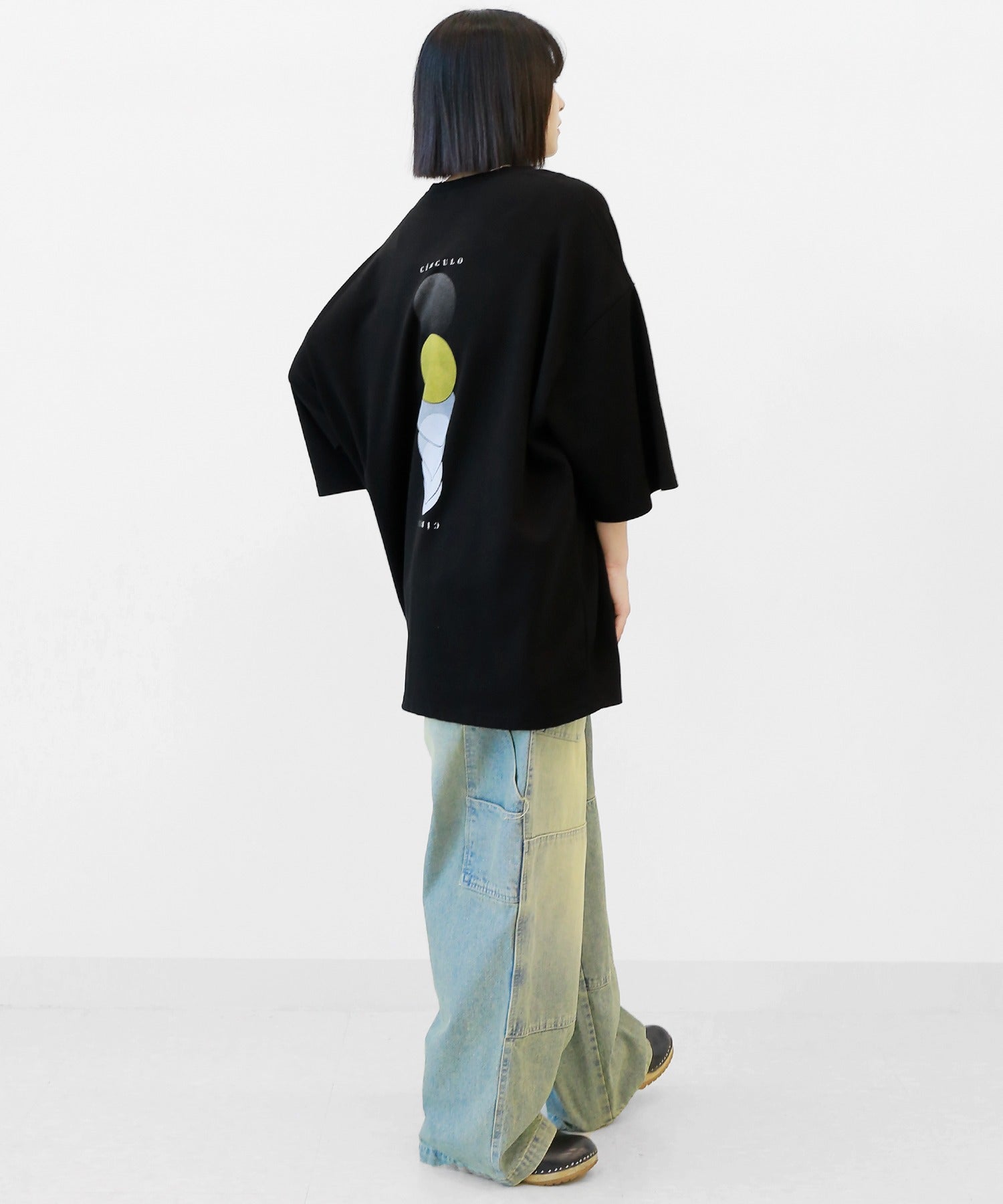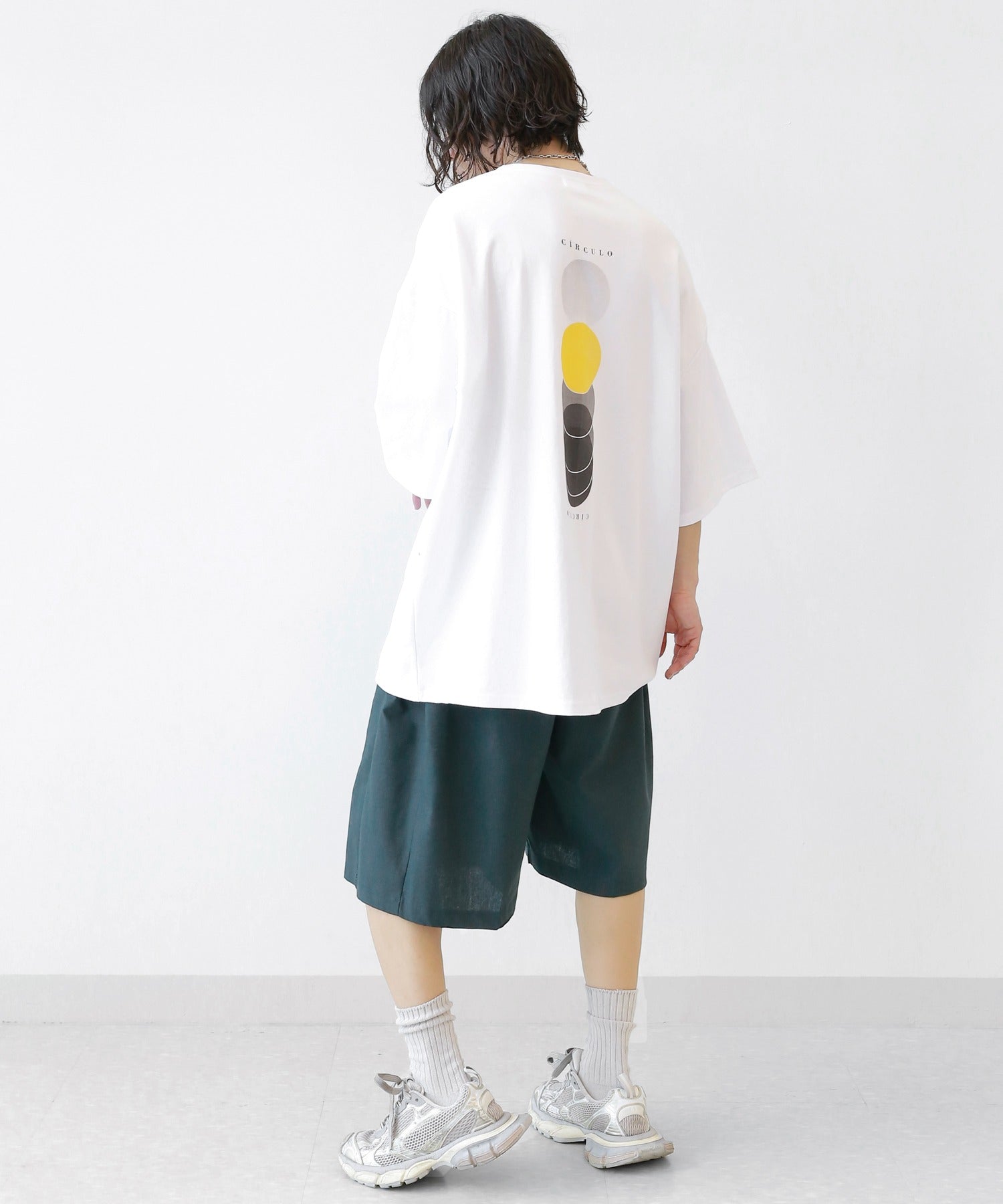 This oversized tee keeps it clean with a small chest logo and contrast seam detail — then surprises with a bold two-tone circle graphic in yellow on the back.