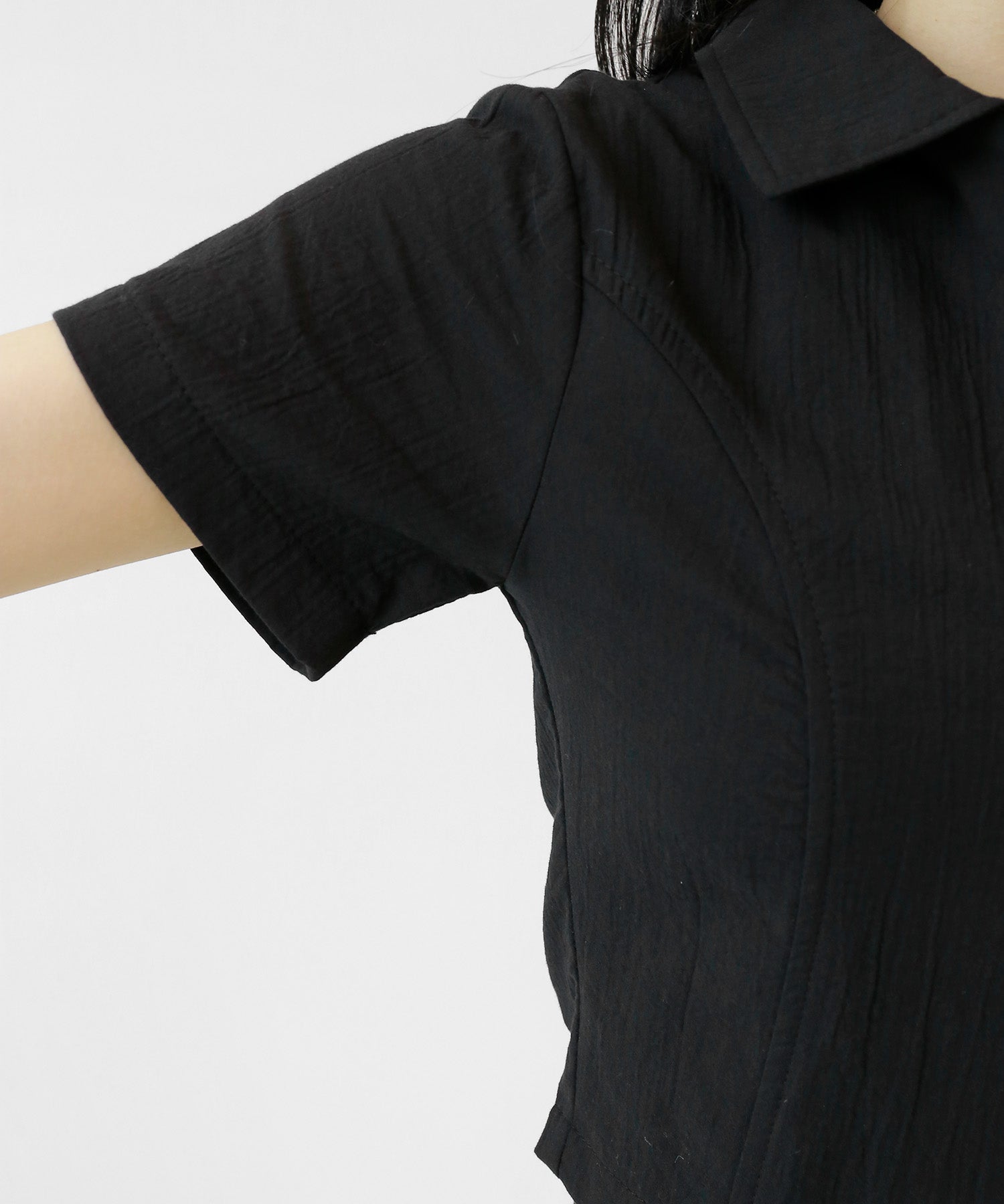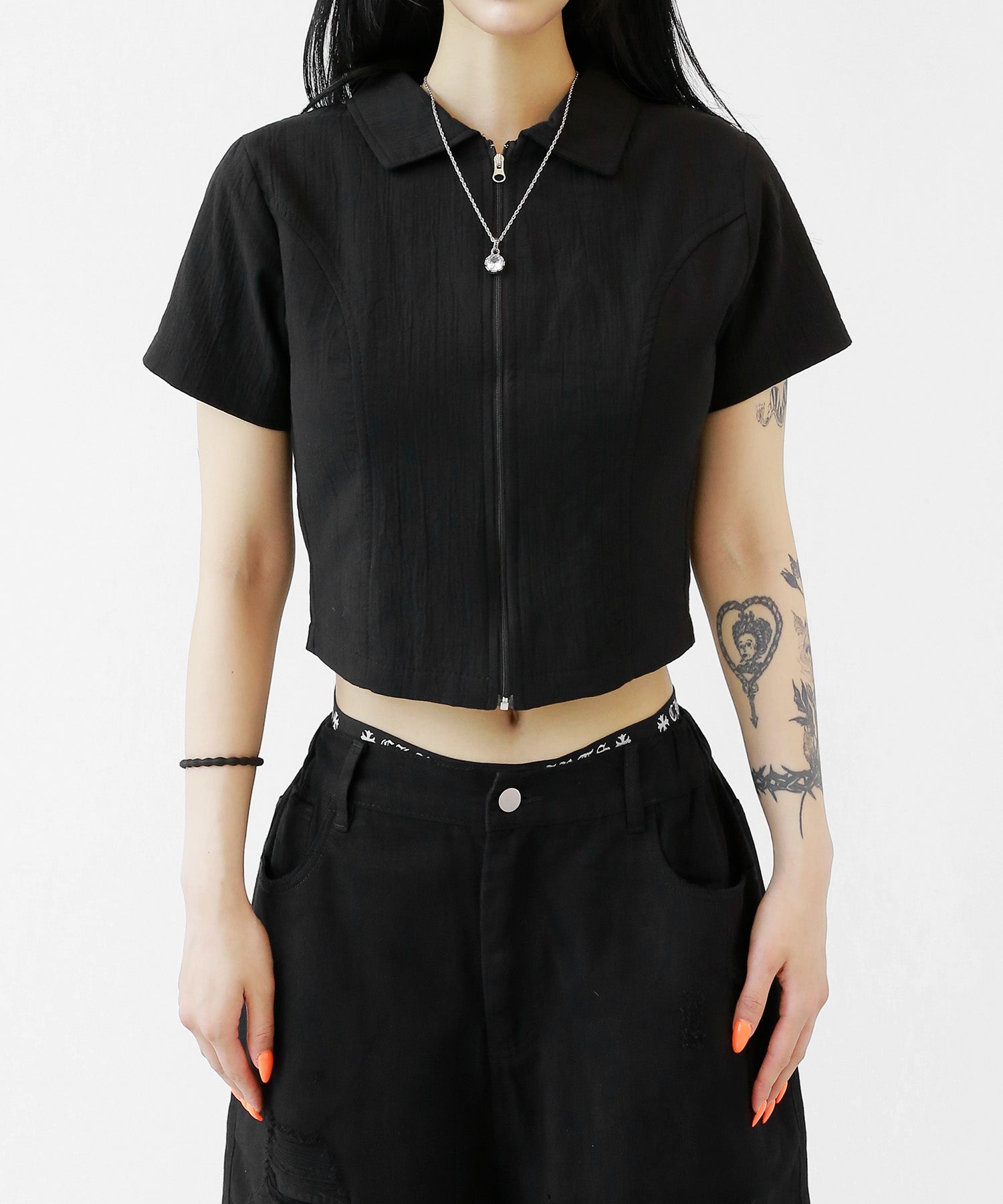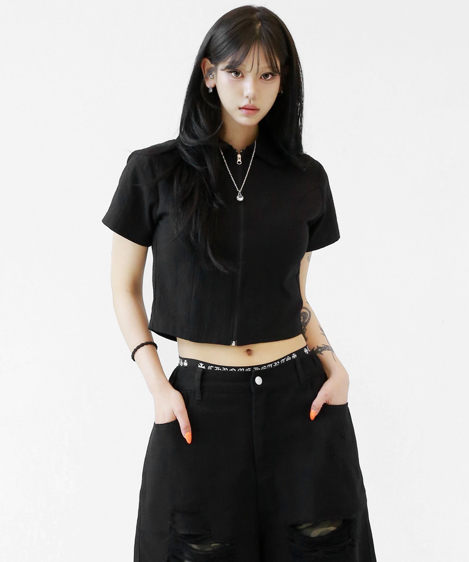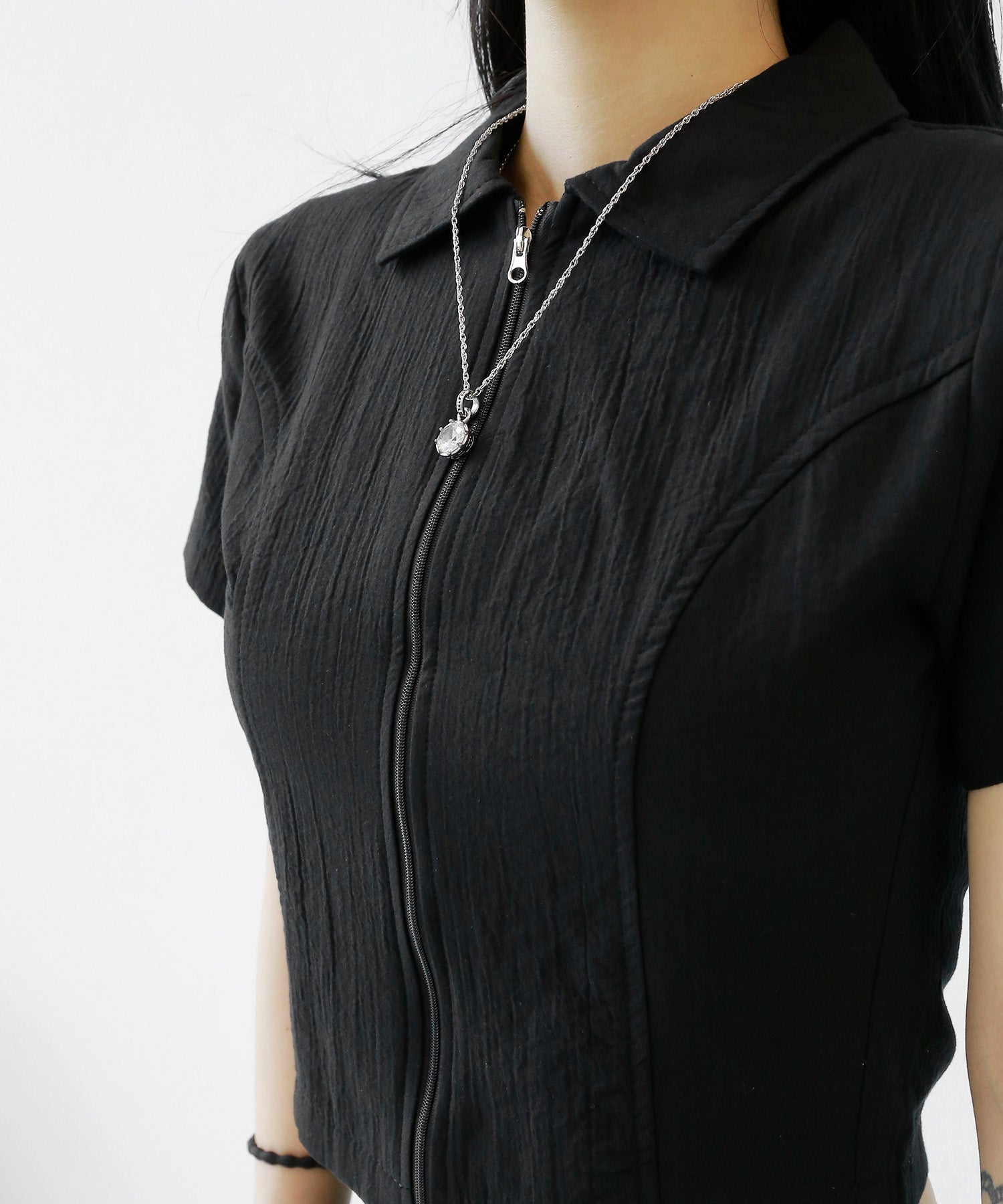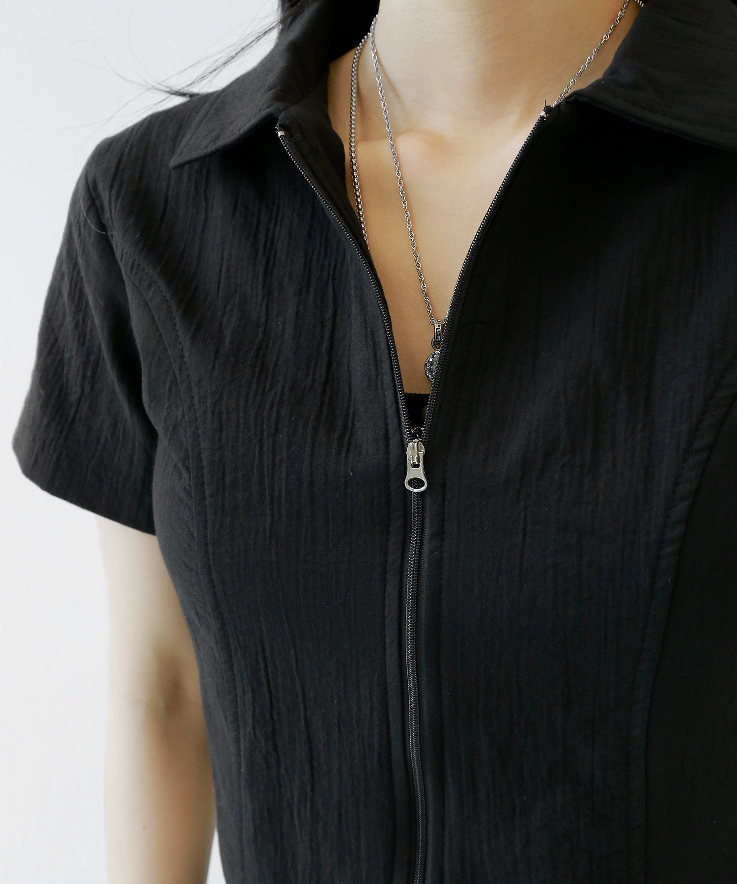 A sleek zip-up cropped tee with a clean, minimal silhouette. The front zipper offers styling versatility—wear it open for a casual vibe or zipped up for a chic look. Perfectly pairs with high-waisted bottoms to enhance your silhouette.