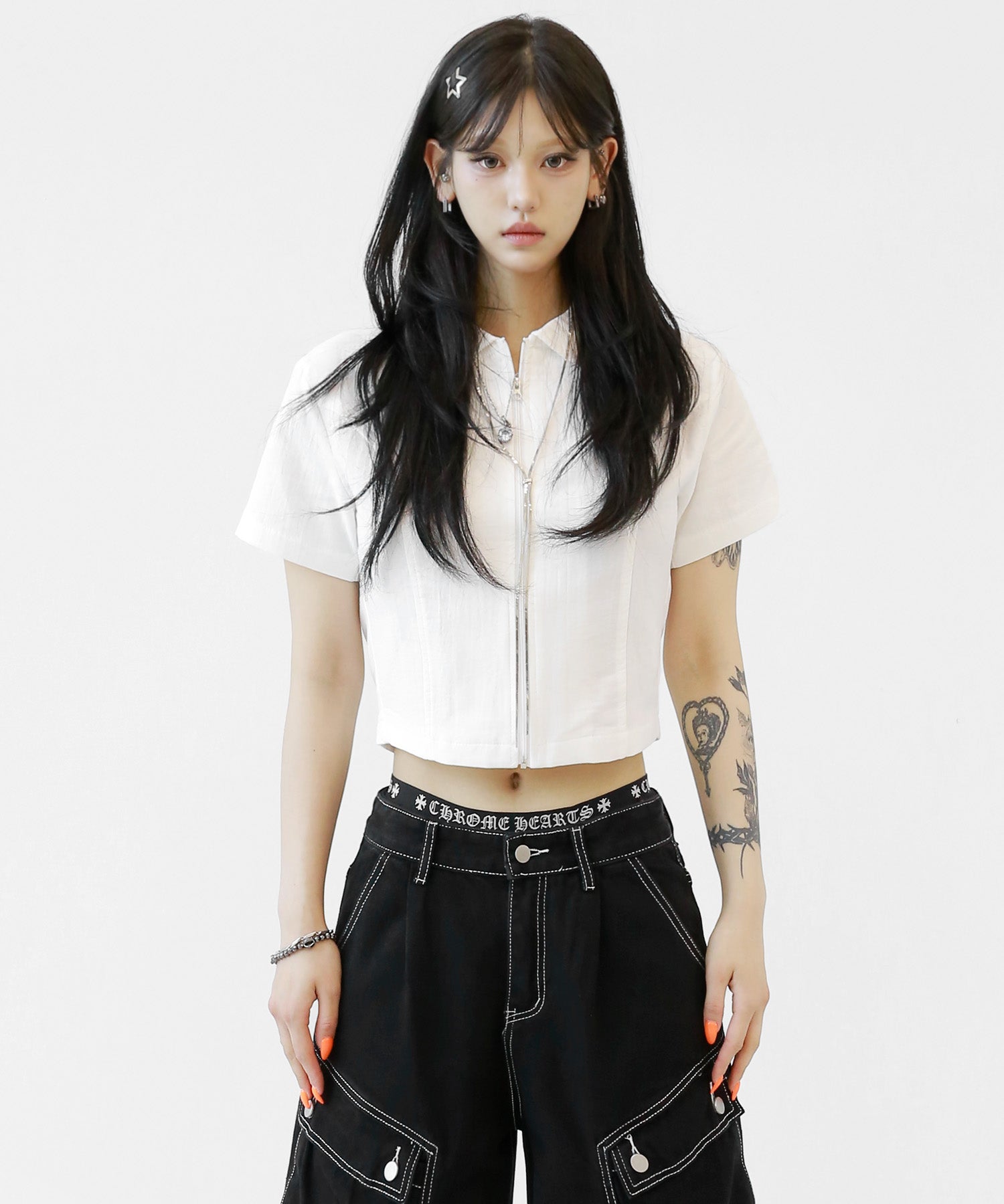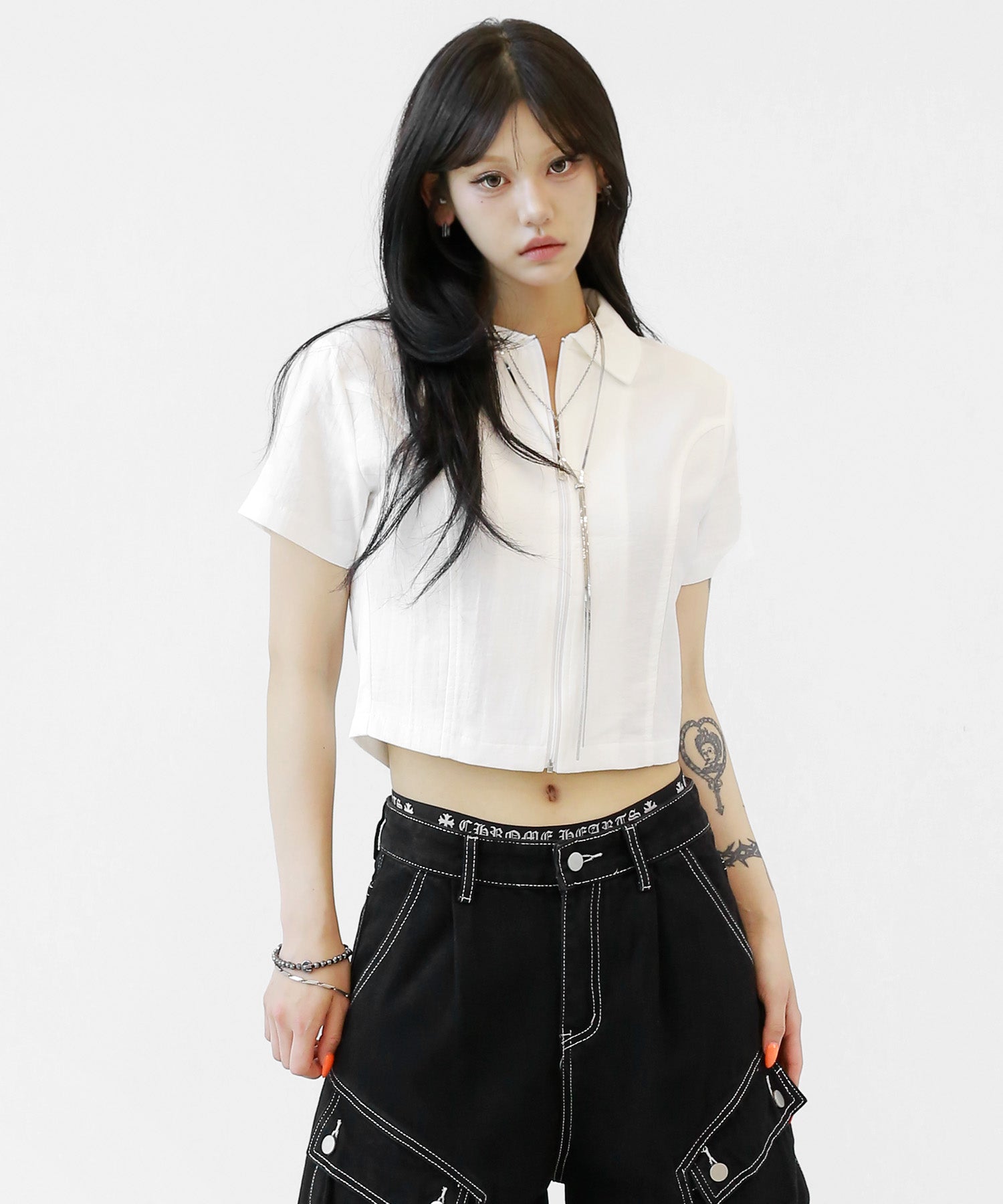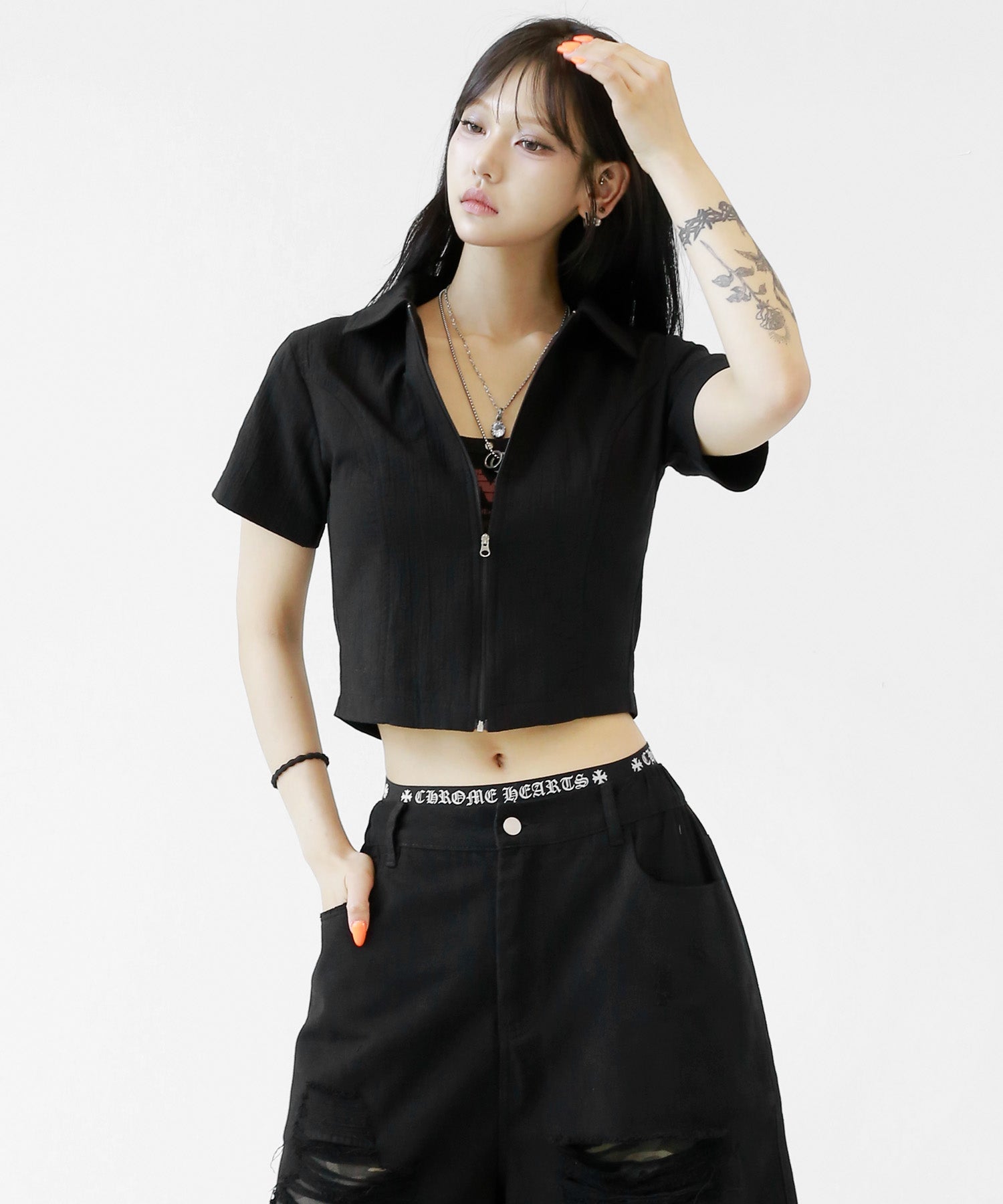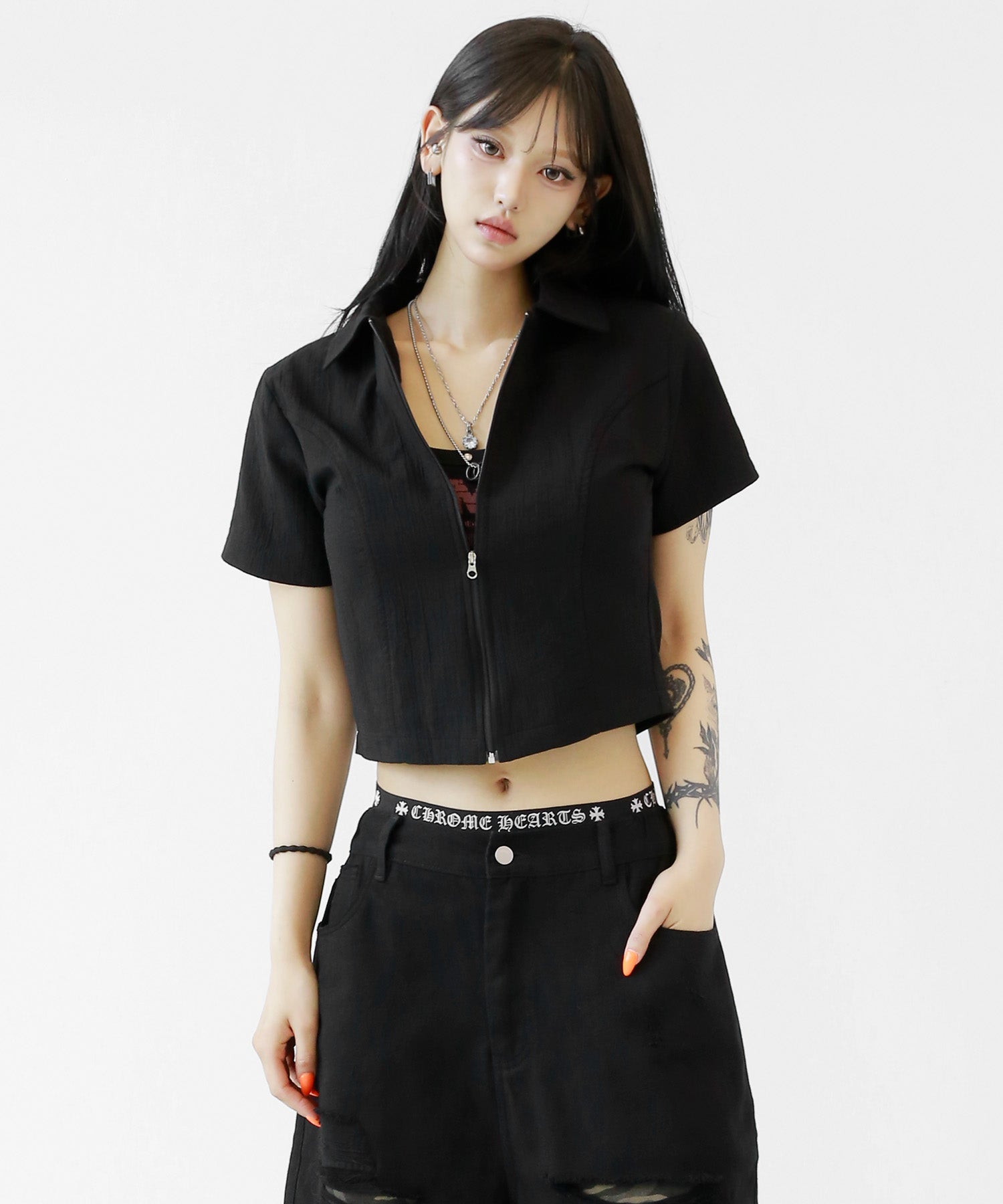 A sleek zip-up cropped tee with a clean, minimal silhouette. The front zipper offers styling versatility—wear it open for a casual vibe or zipped up for a chic look. Perfectly pairs with high-waisted bottoms to enhance your silhouette.