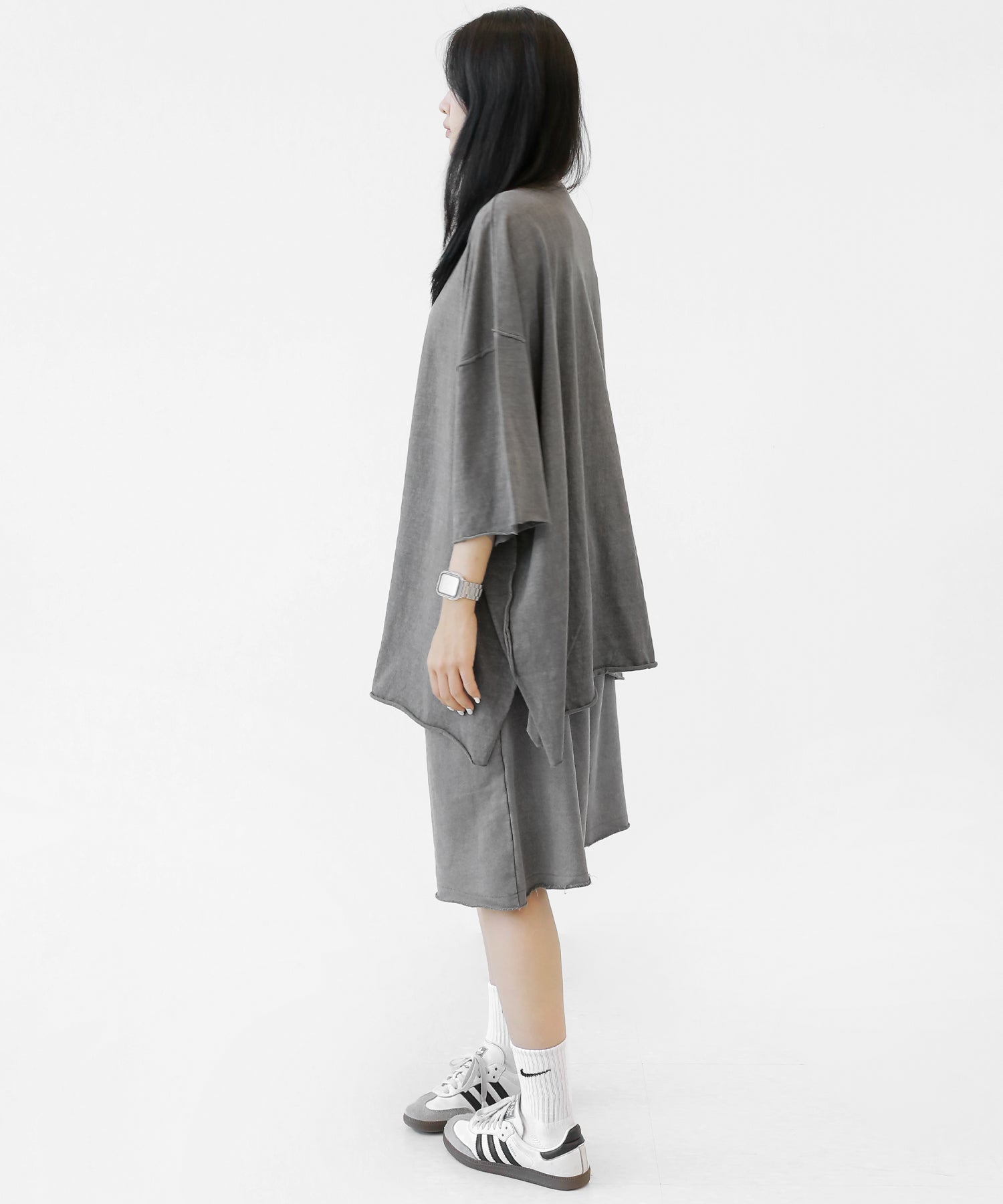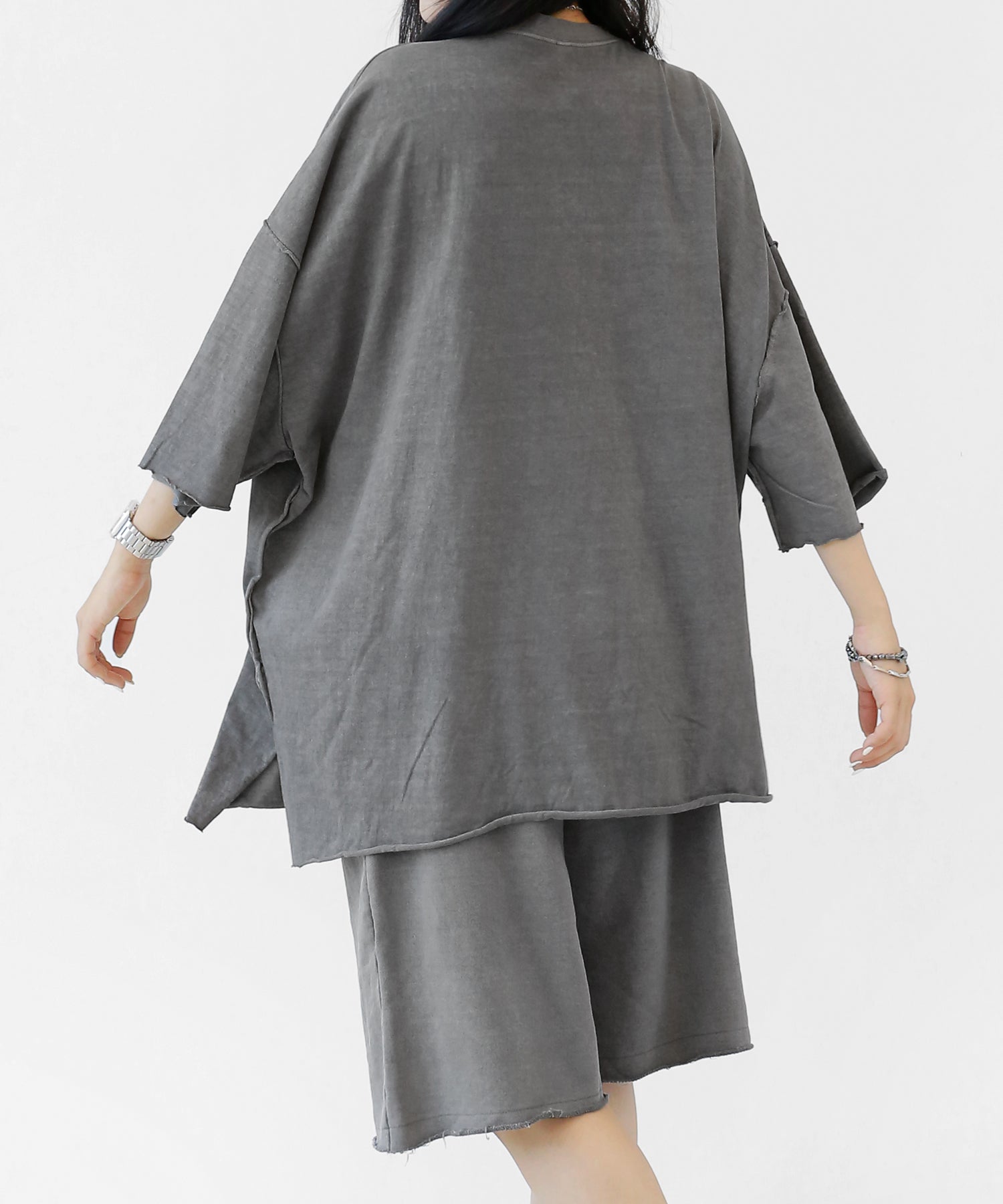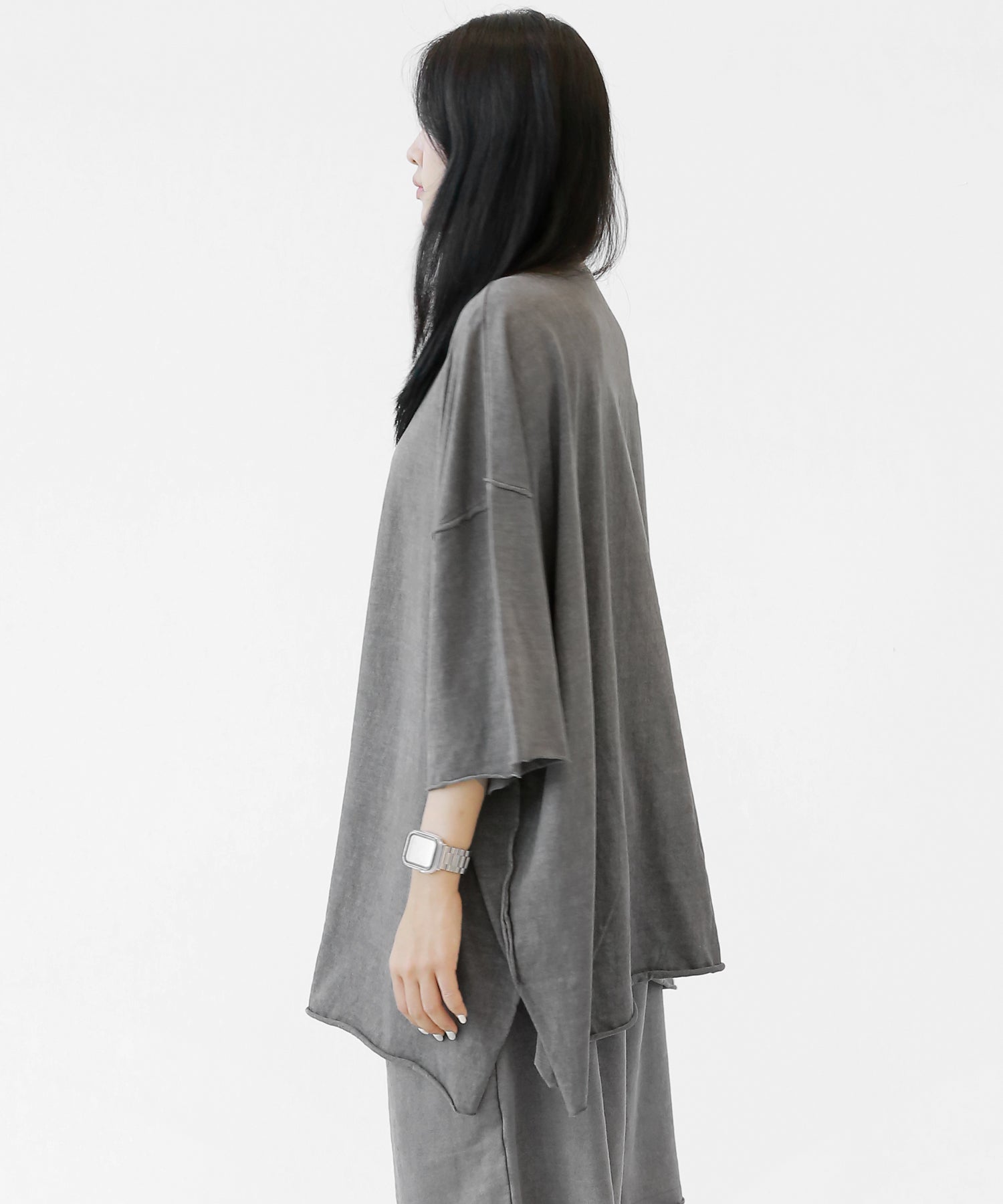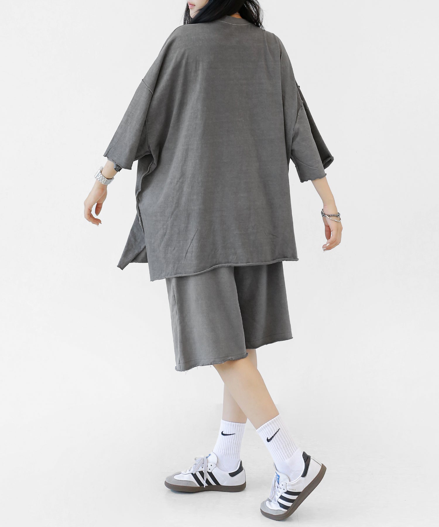 nfused with a soft vintage wash, this cut-off denim-look T-shirt delivers relaxed street vibes with ease. The flared A-line silhouette and oversized fit create a casual, breezy look—perfect for pairing with cargos or jeans.