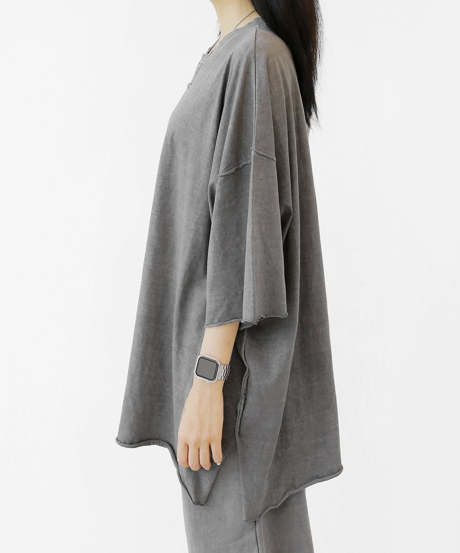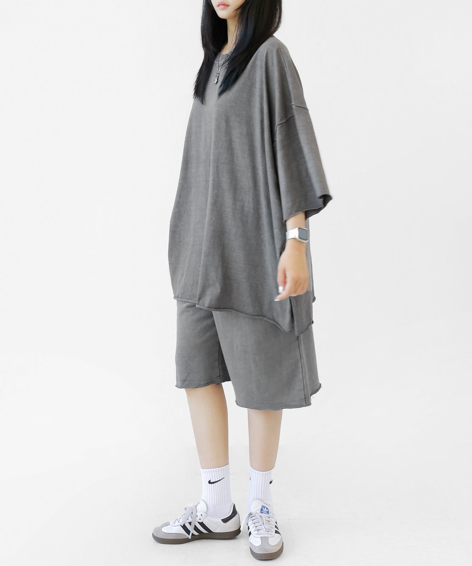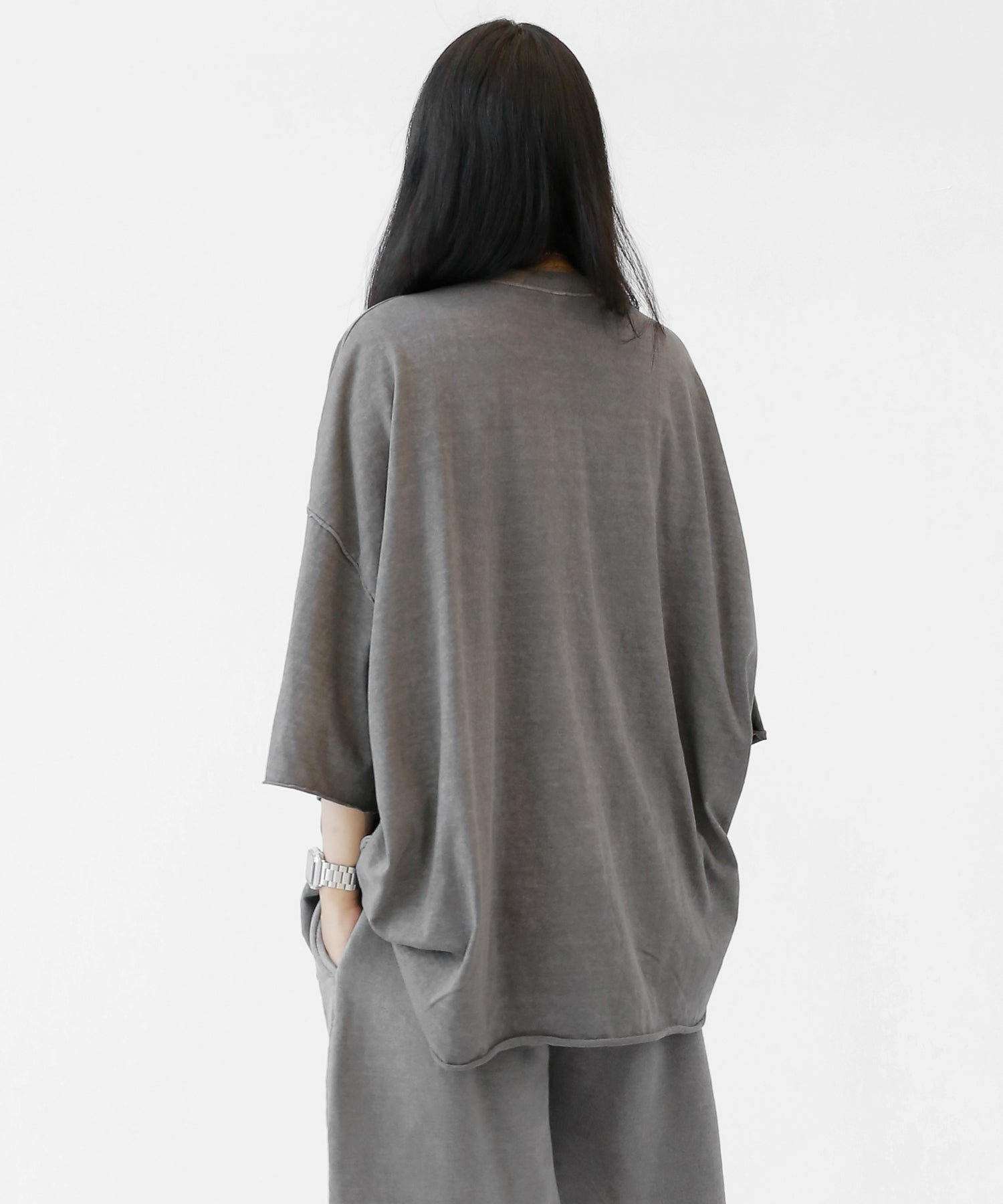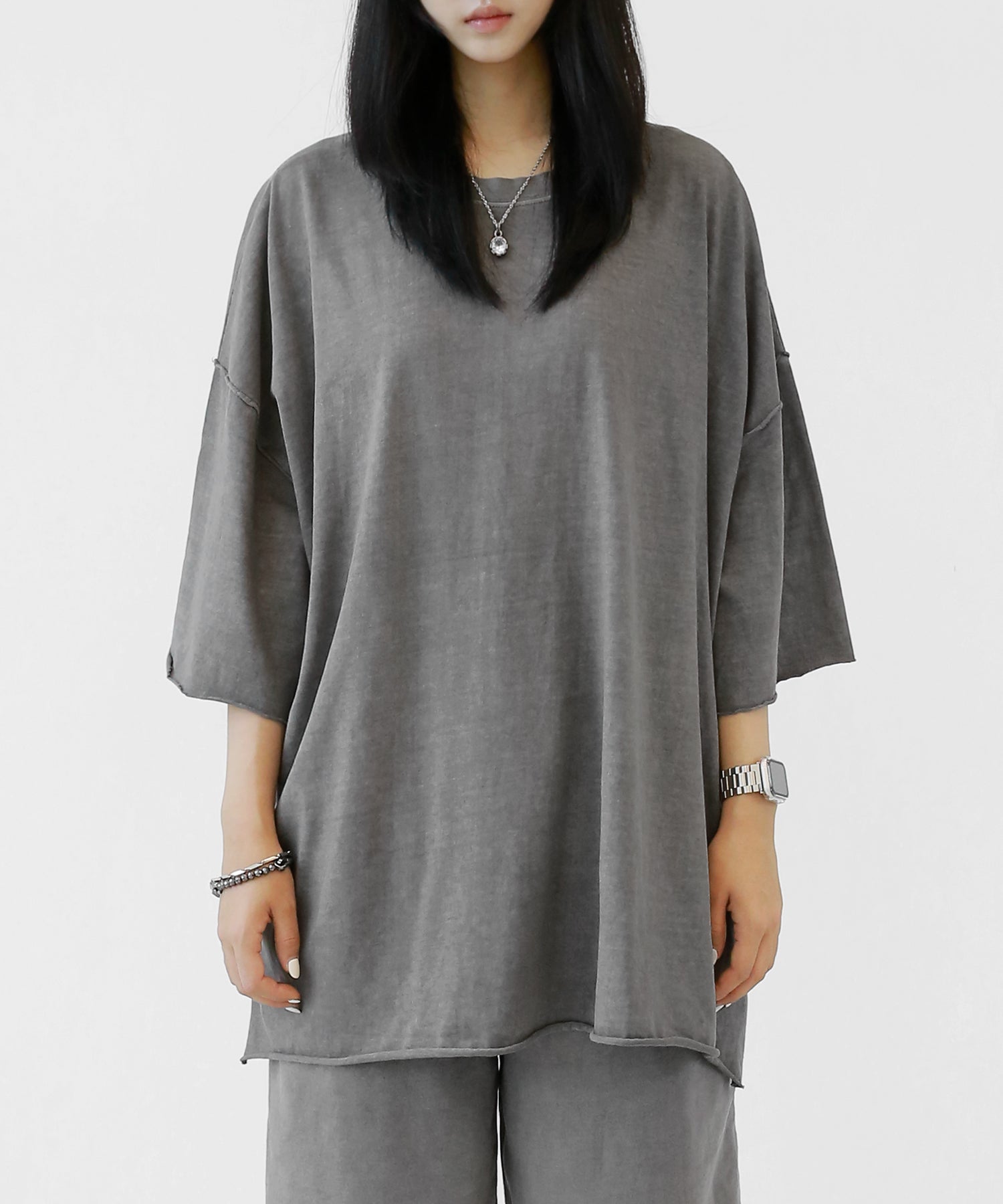 nfused with a soft vintage wash, this cut-off denim-look T-shirt delivers relaxed street vibes with ease. The flared A-line silhouette and oversized fit create a casual, breezy look—perfect for pairing with cargos or jeans.