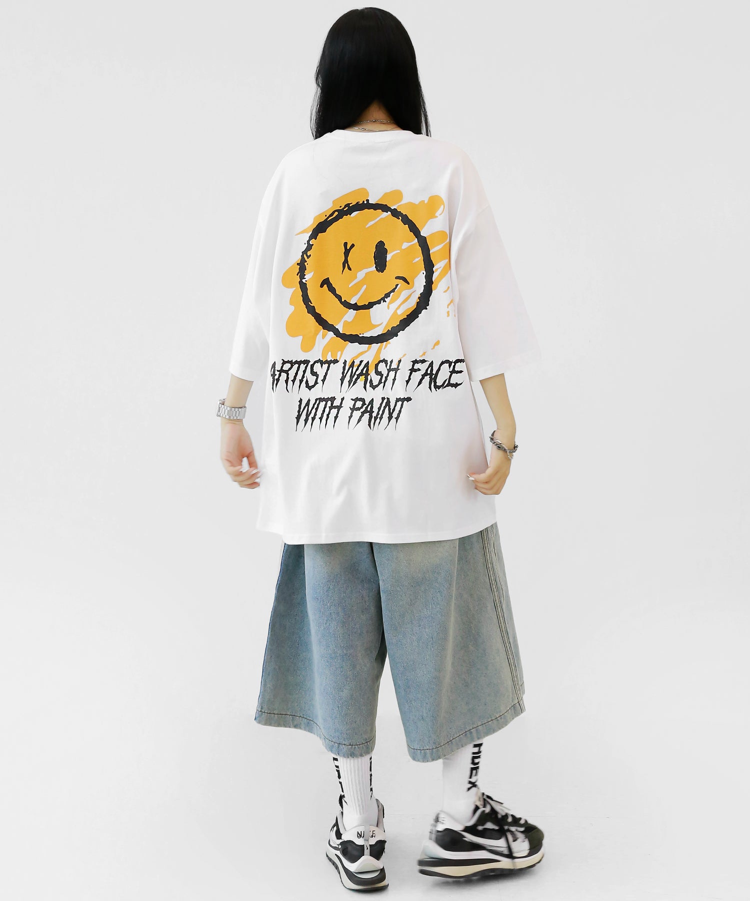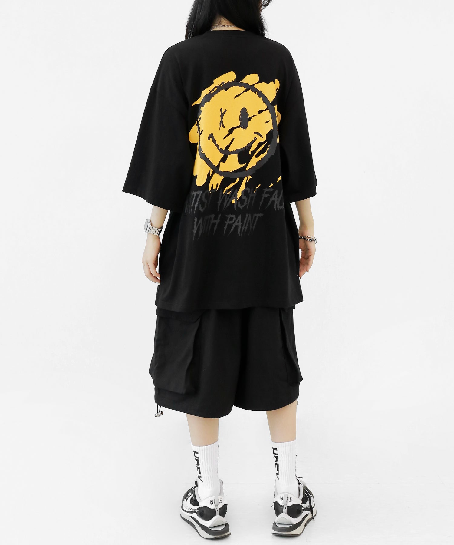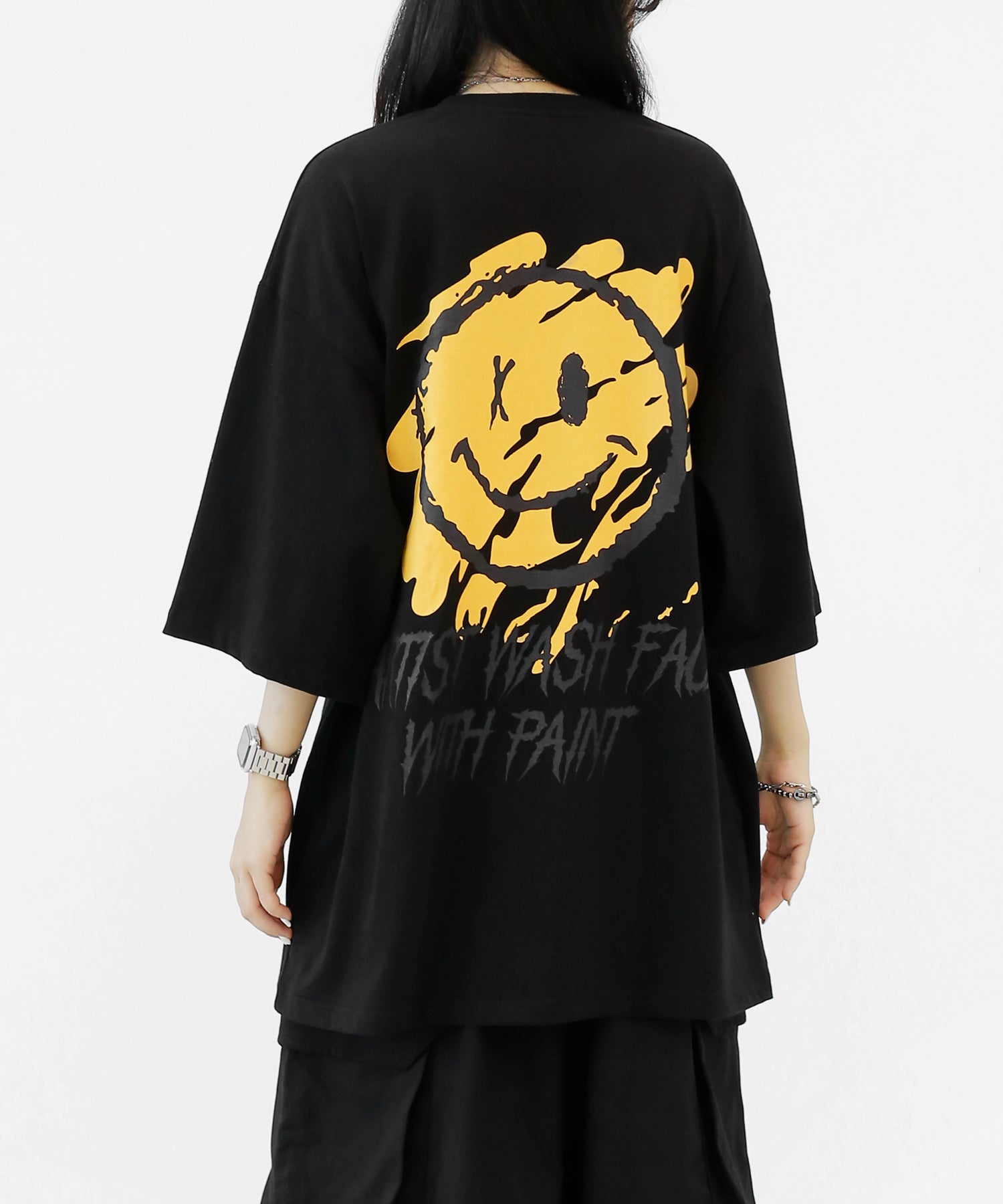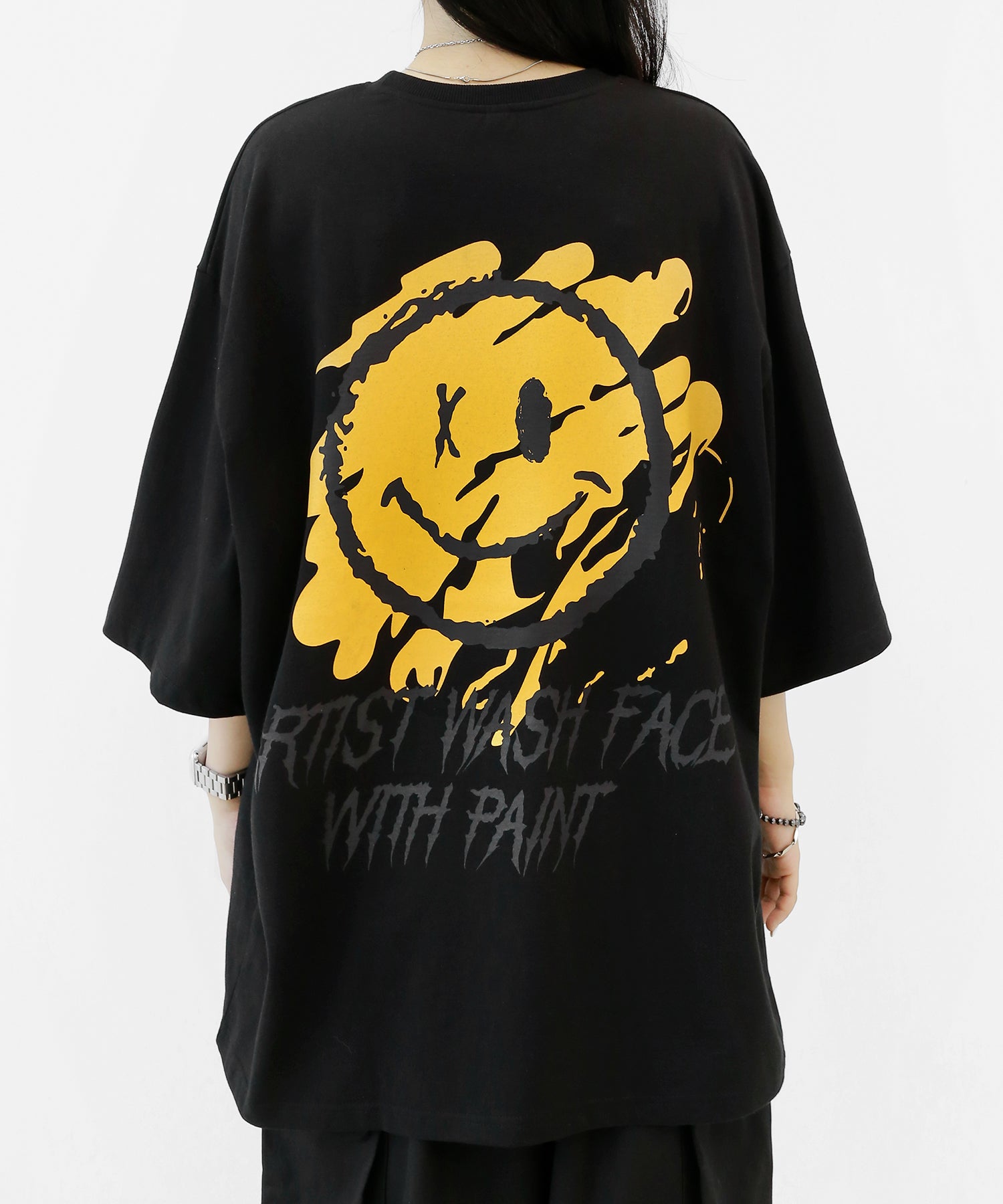 A bold graphic tee featuring a large smiley face print on the back for a playful rock vibe. The subtle front logo adds contrast, making it a standout piece for solo styling.