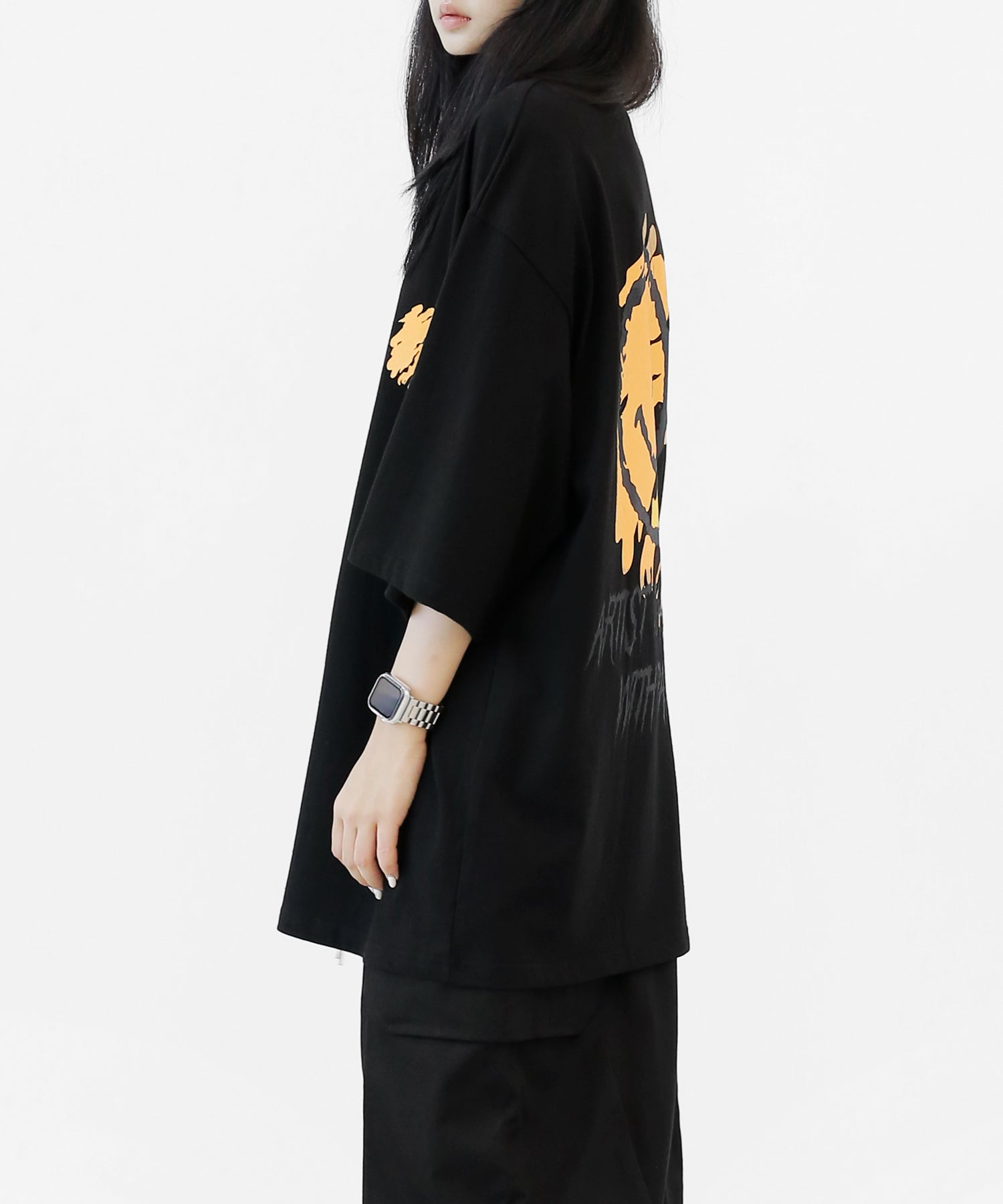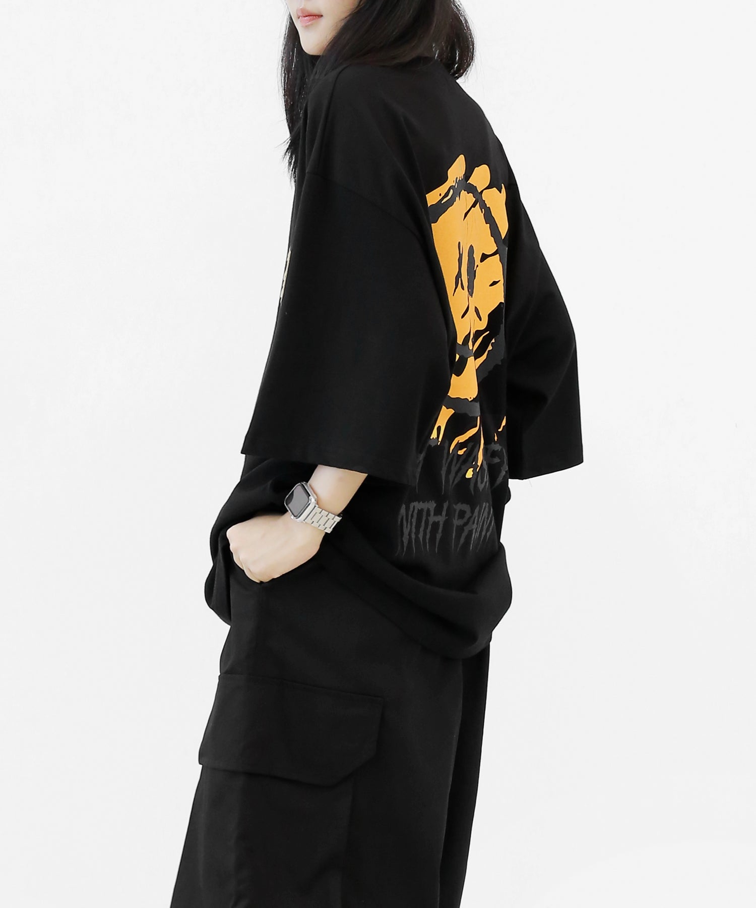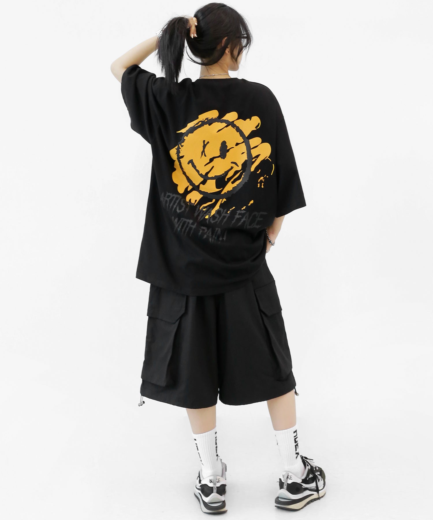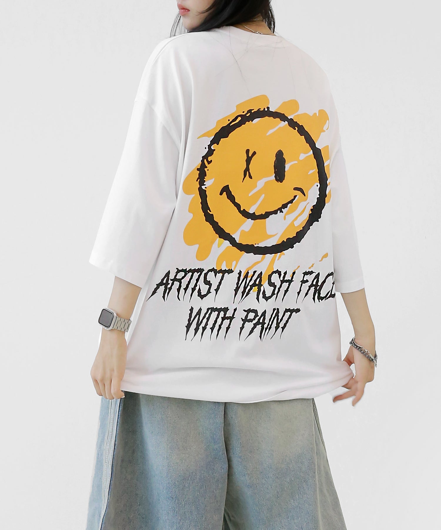 A bold graphic tee featuring a large smiley face print on the back for a playful rock vibe. The subtle front logo adds contrast, making it a standout piece for solo styling.