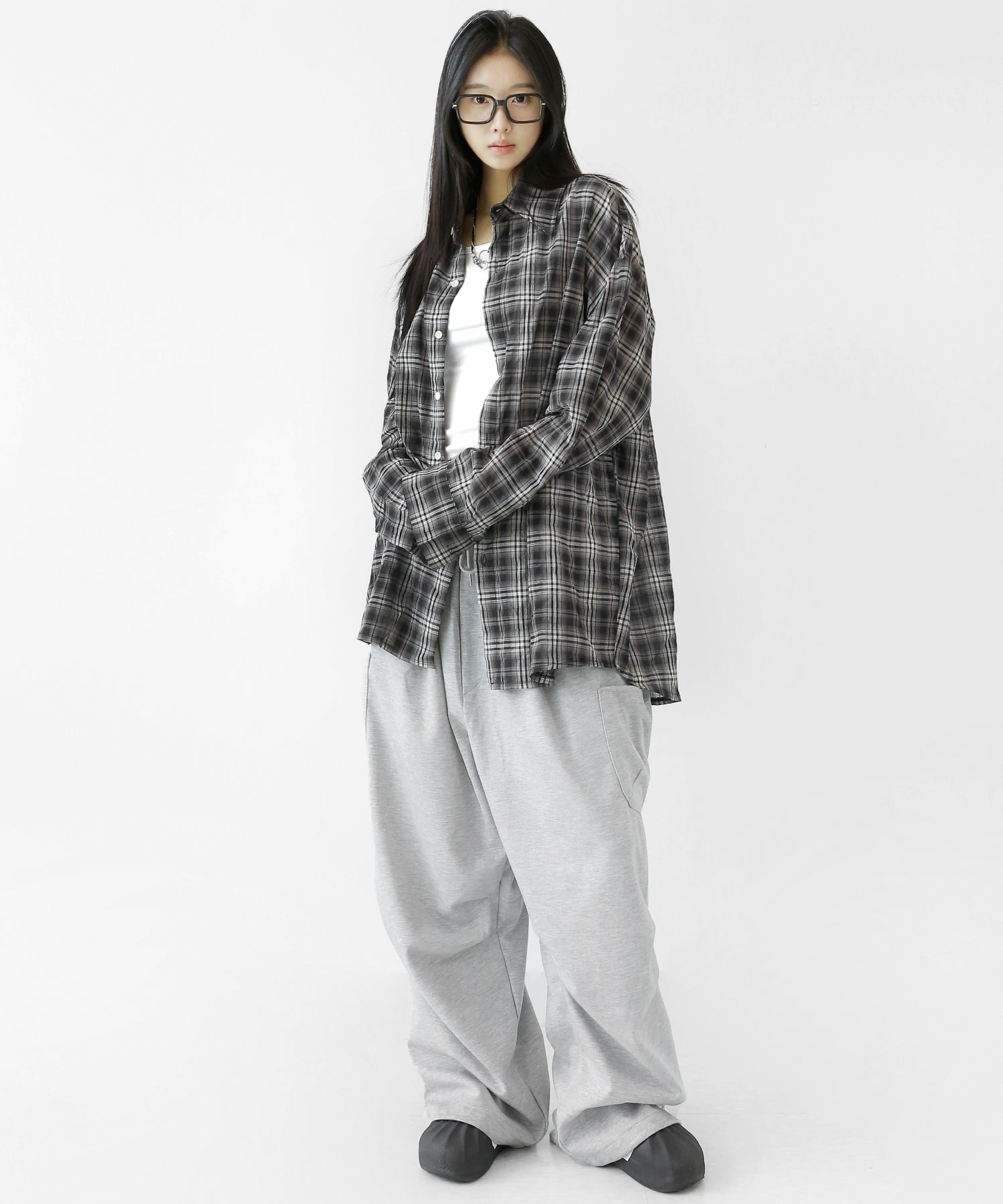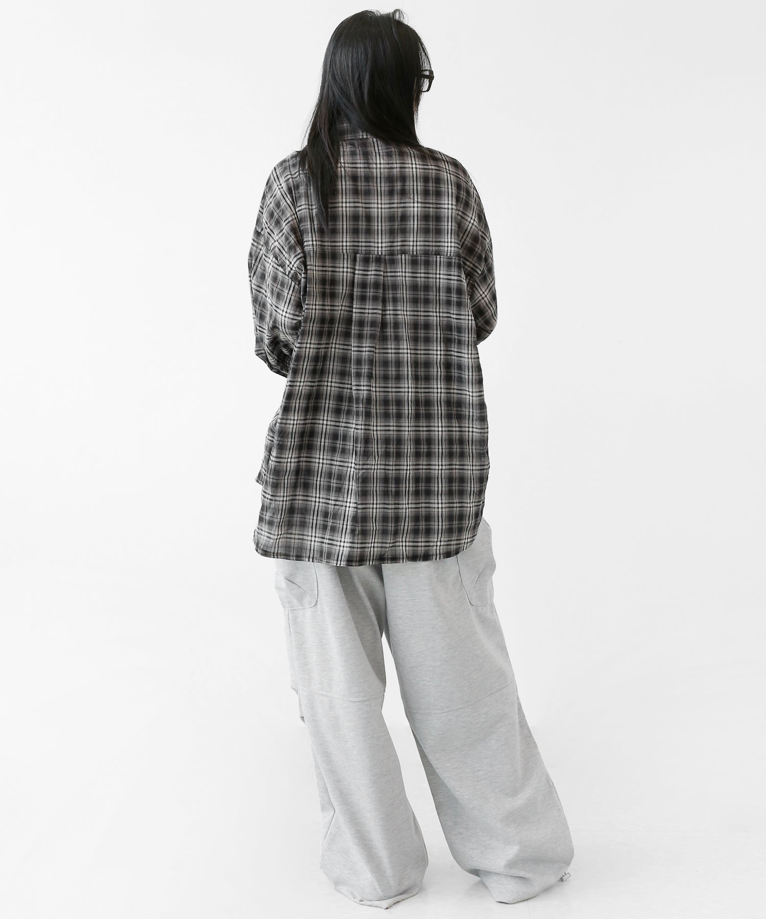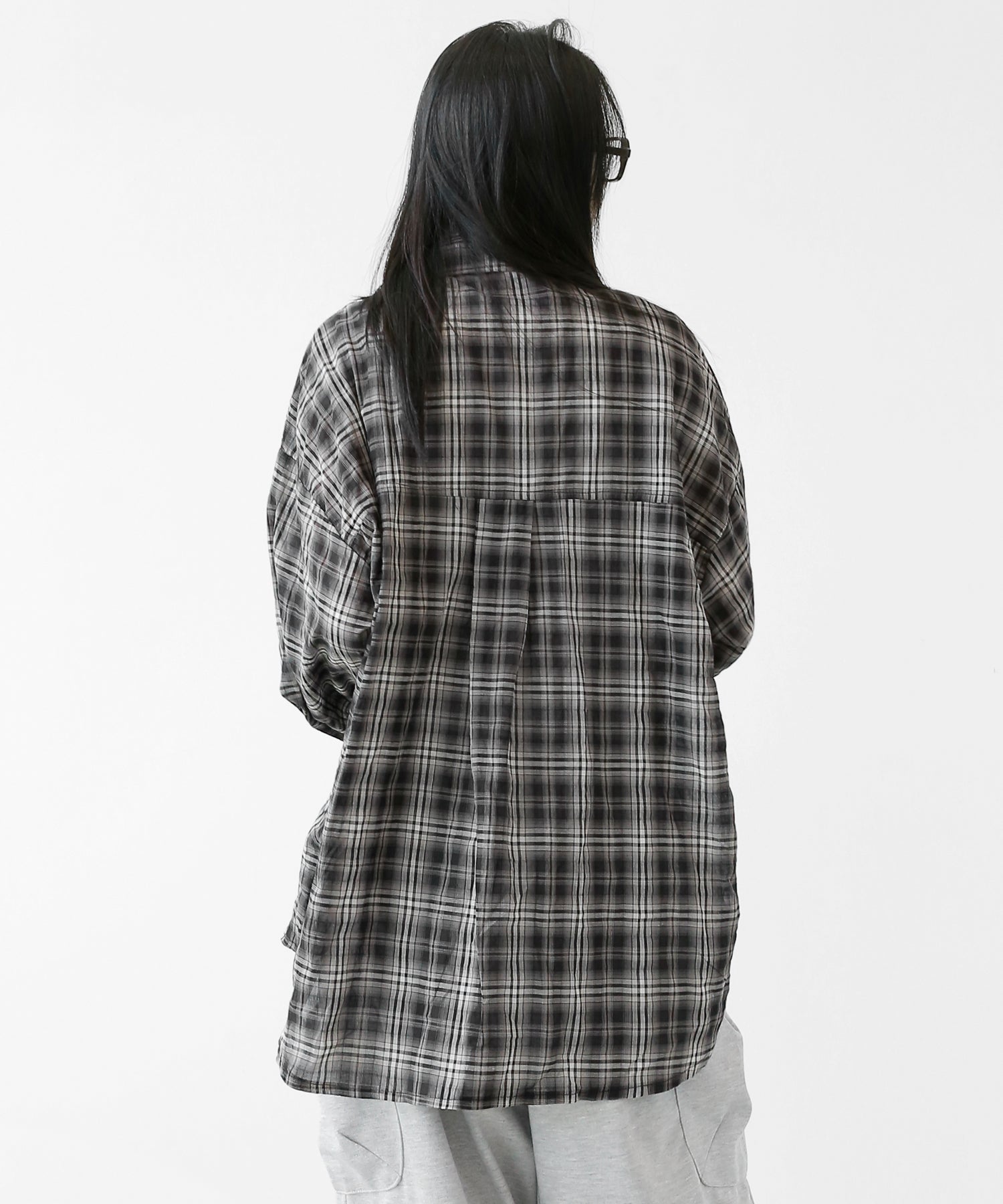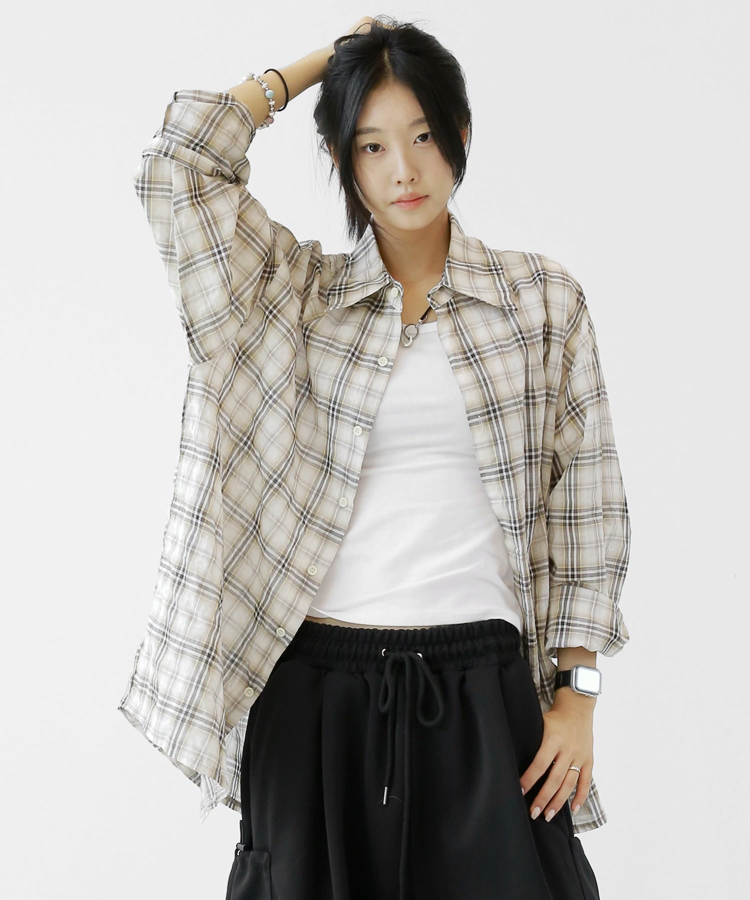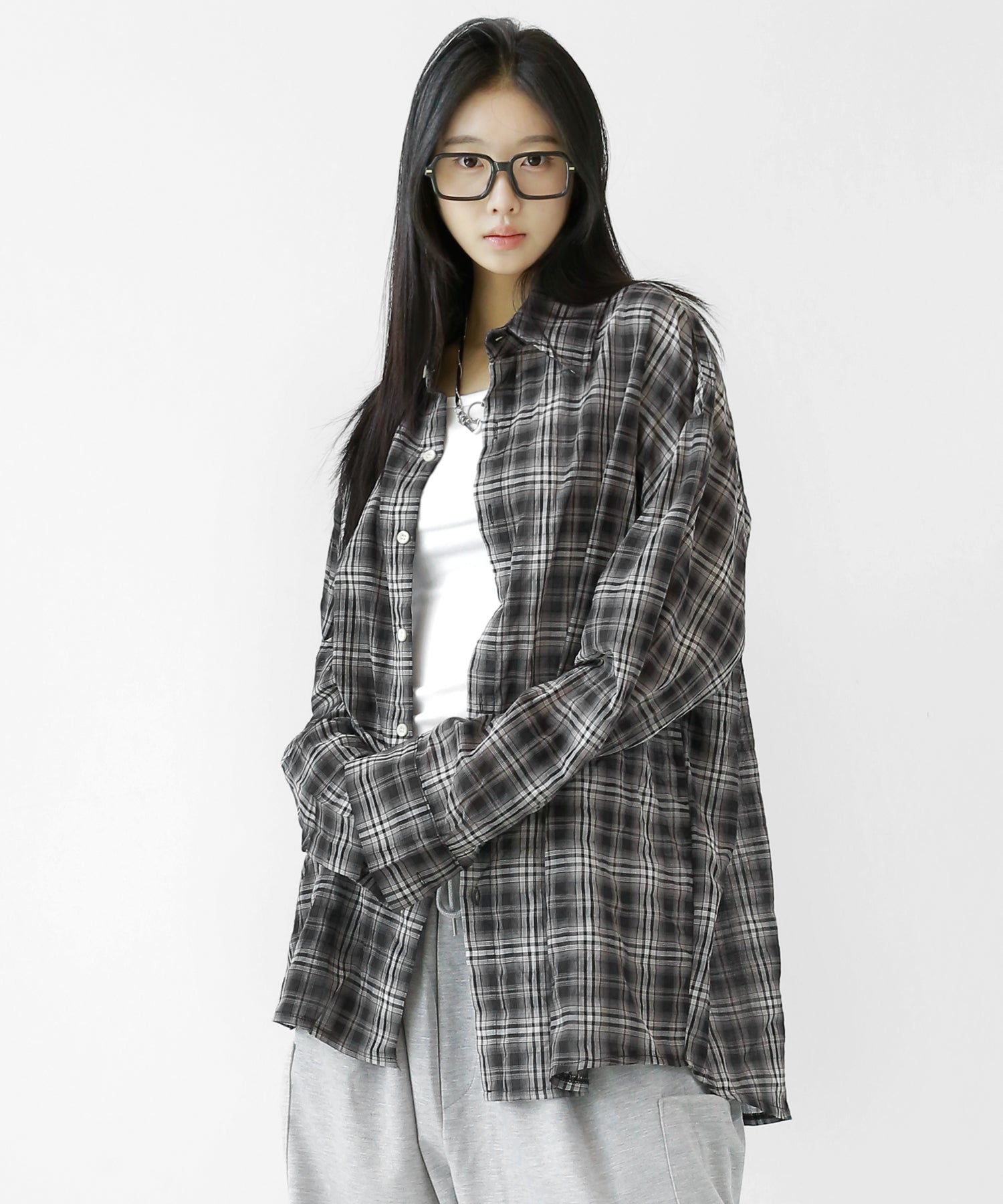 A lightweight see-through check shirt with a relaxed oversized fit. Breathable and versatile, it’s perfect for layering or wearing solo with a streetwear edge.