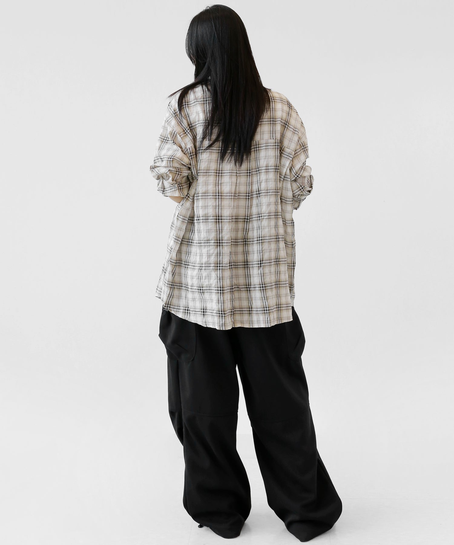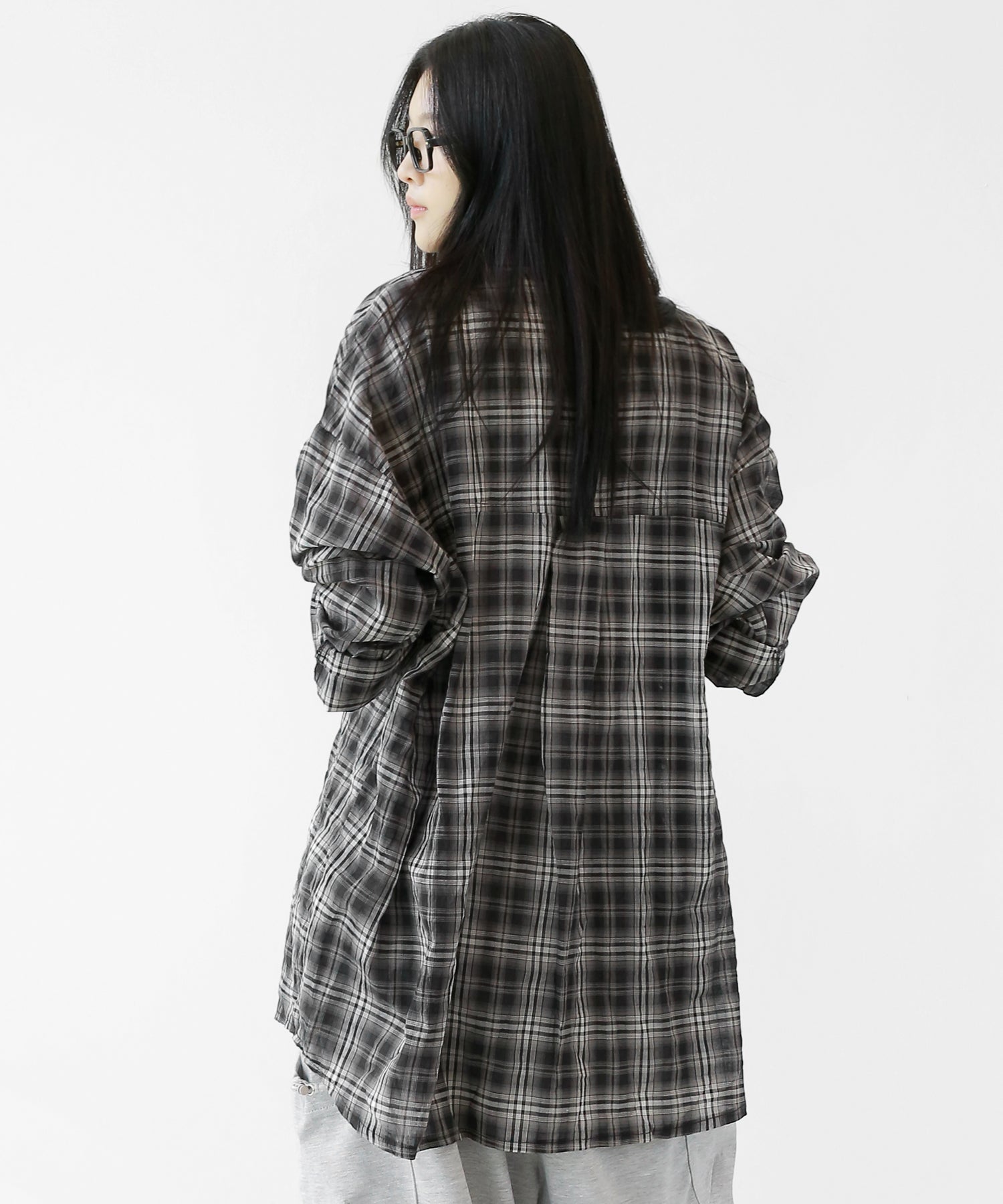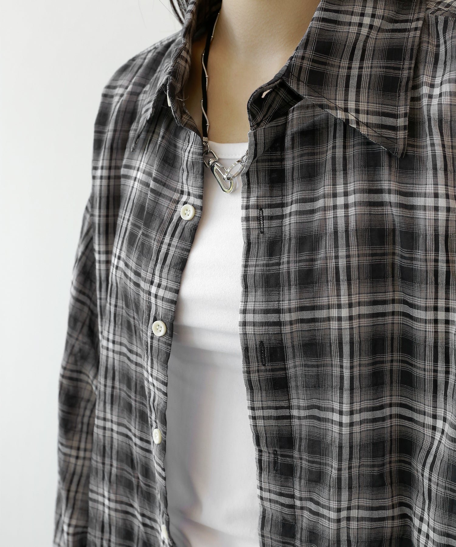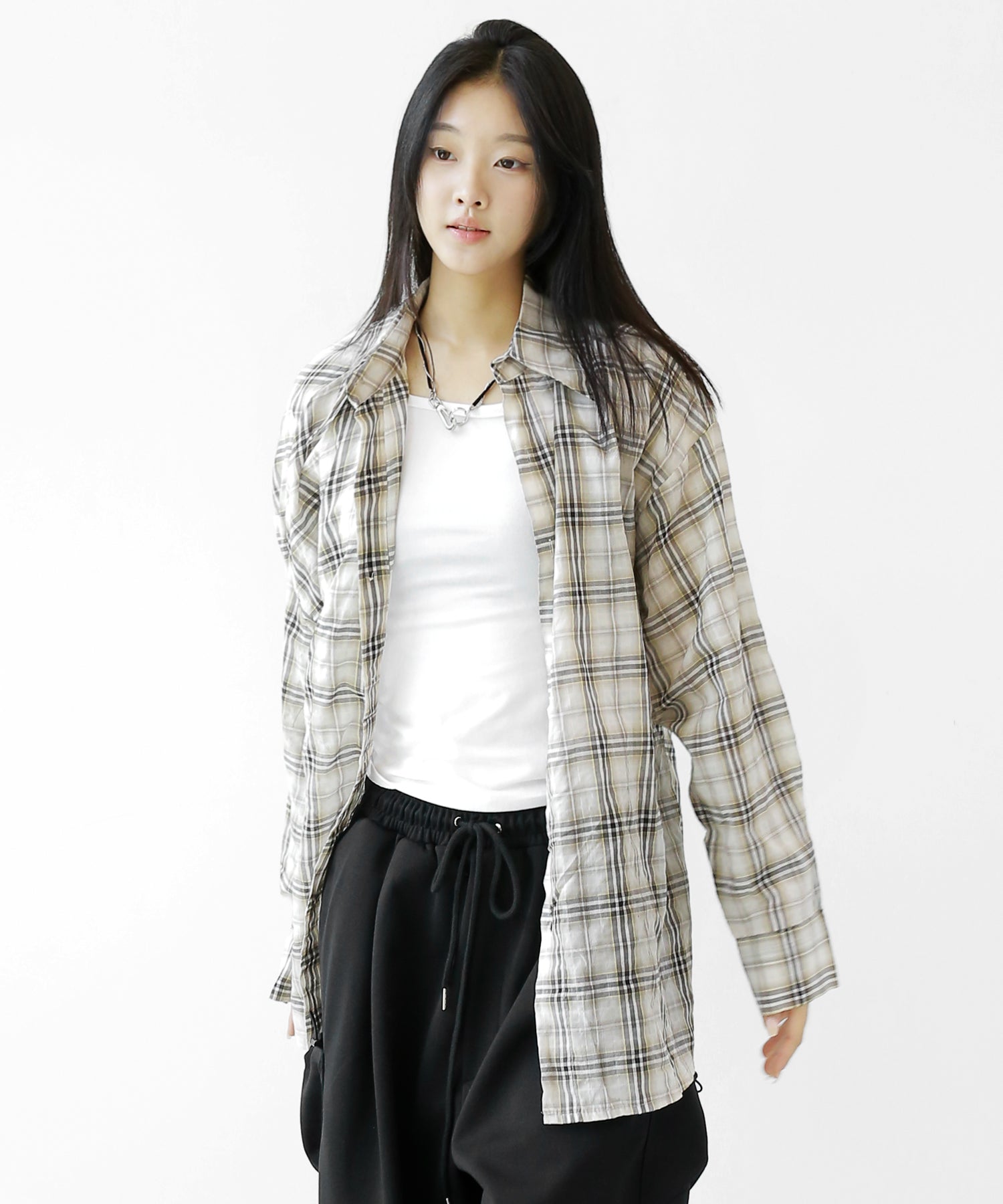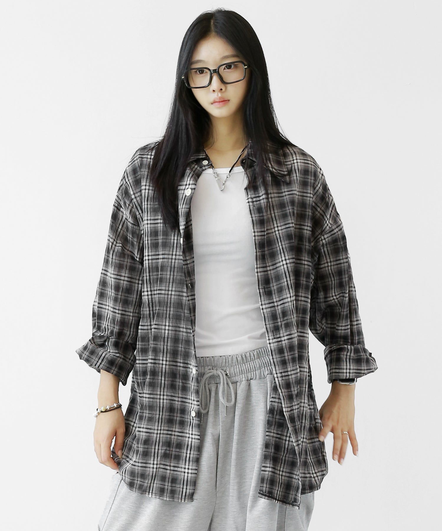 A lightweight see-through check shirt with a relaxed oversized fit. Breathable and versatile, it’s perfect for layering or wearing solo with a streetwear edge.