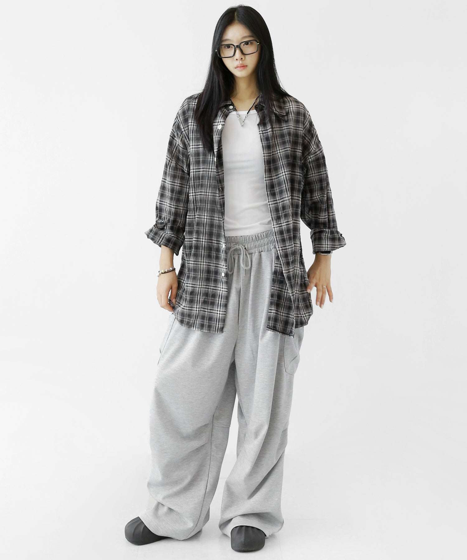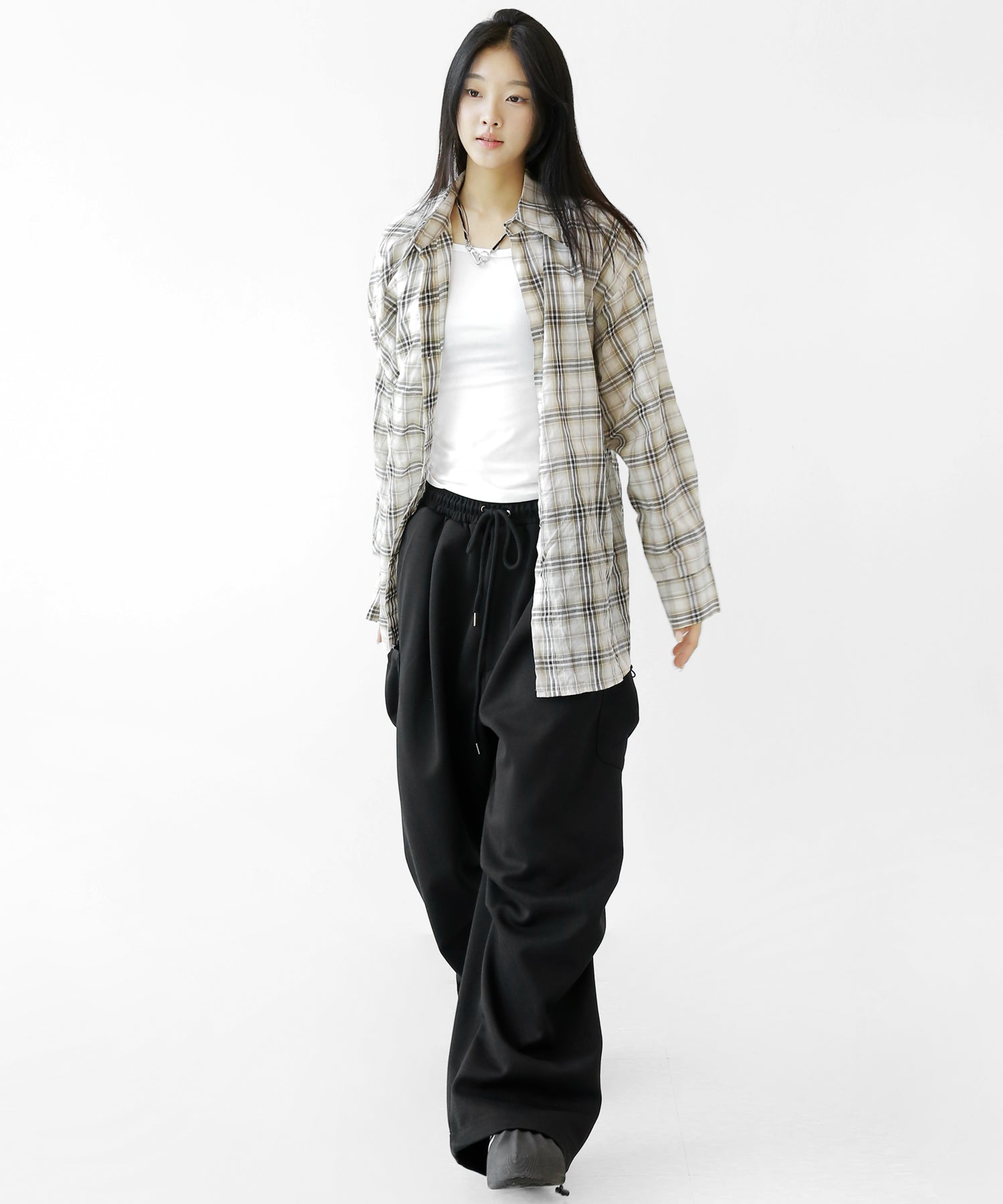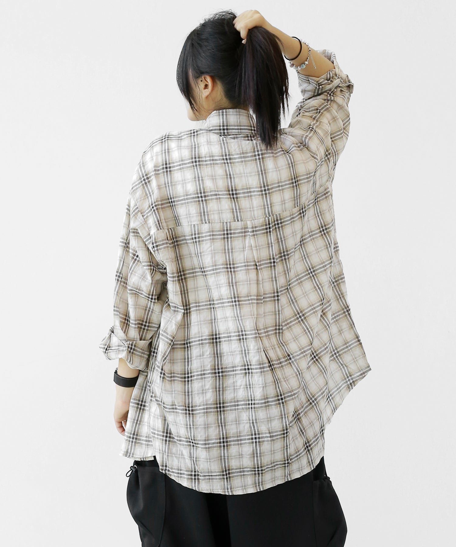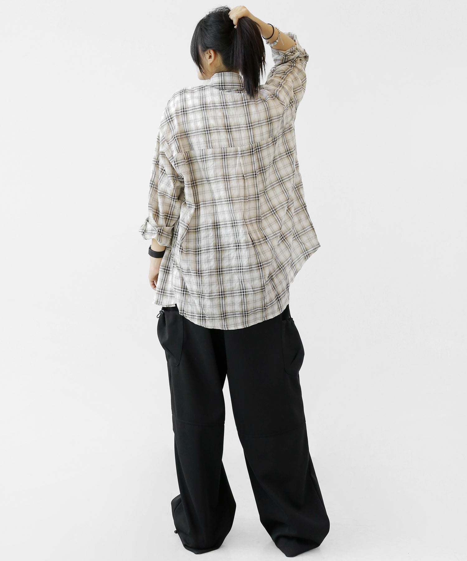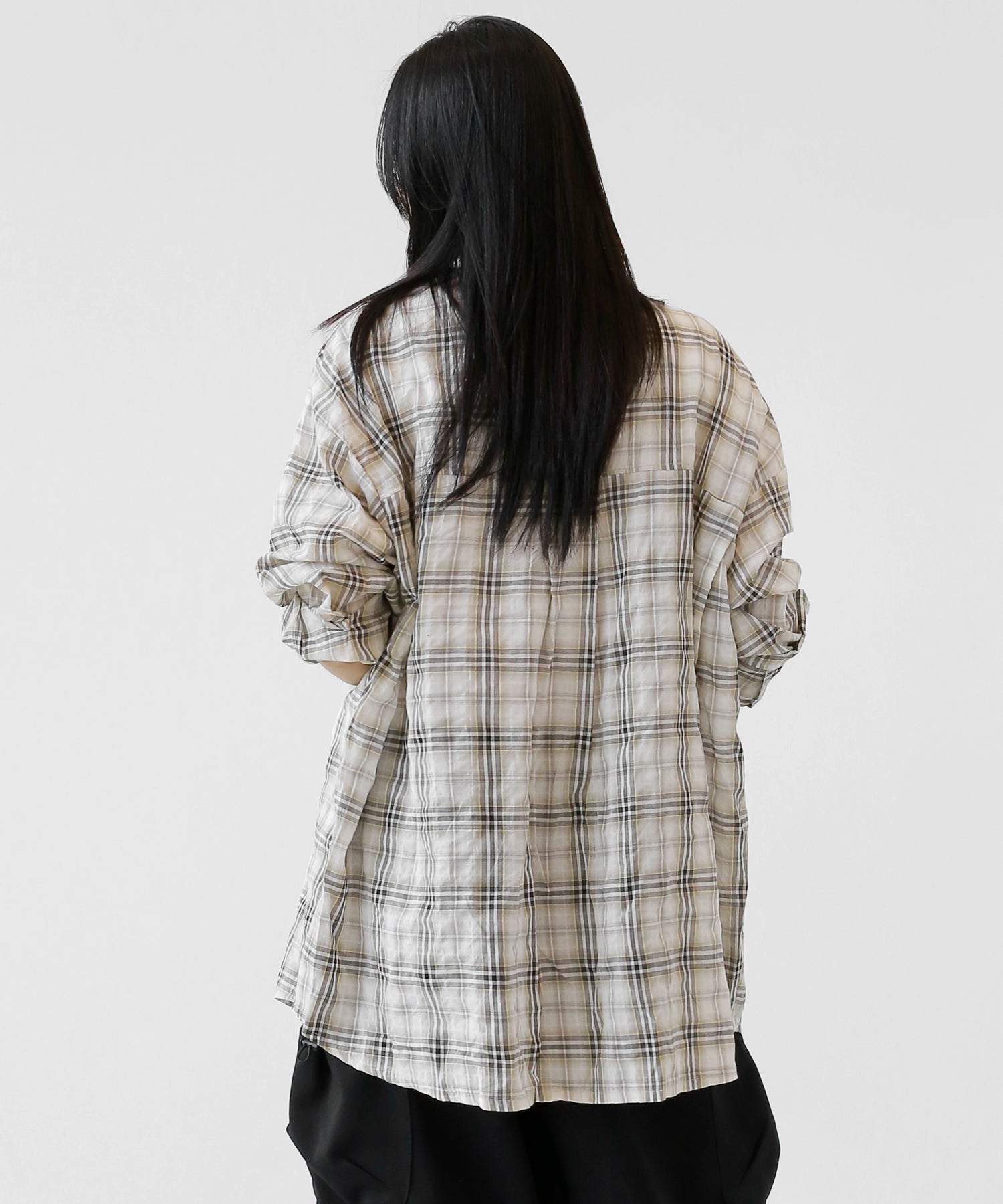 A lightweight see-through check shirt with a relaxed oversized fit. Breathable and versatile, it’s perfect for layering or wearing solo with a streetwear edge.