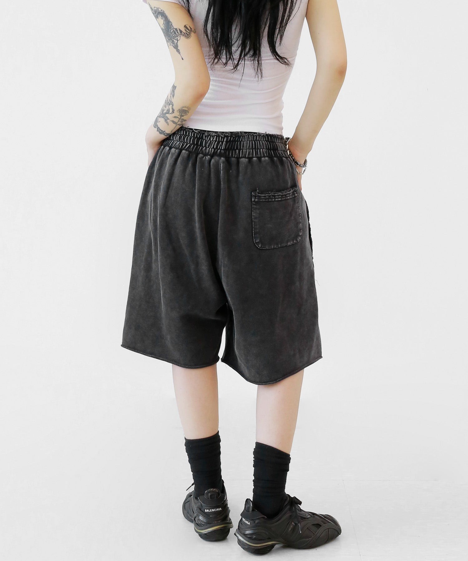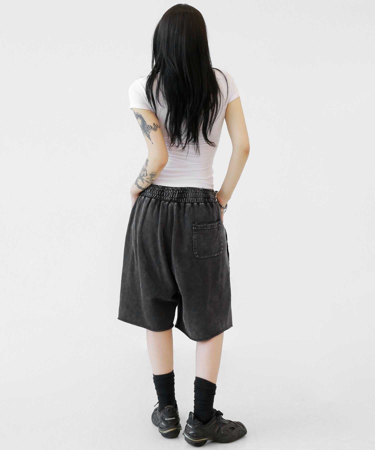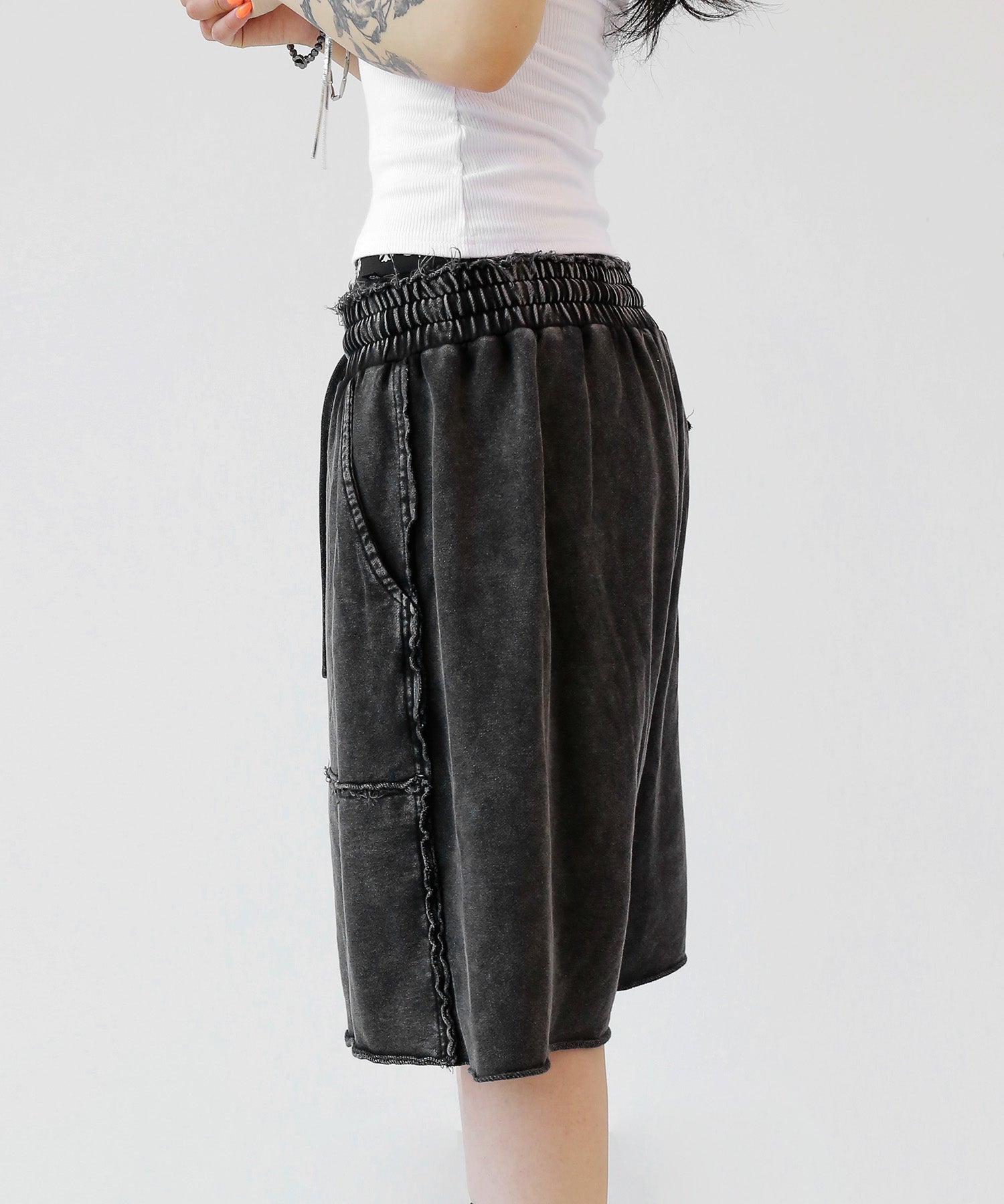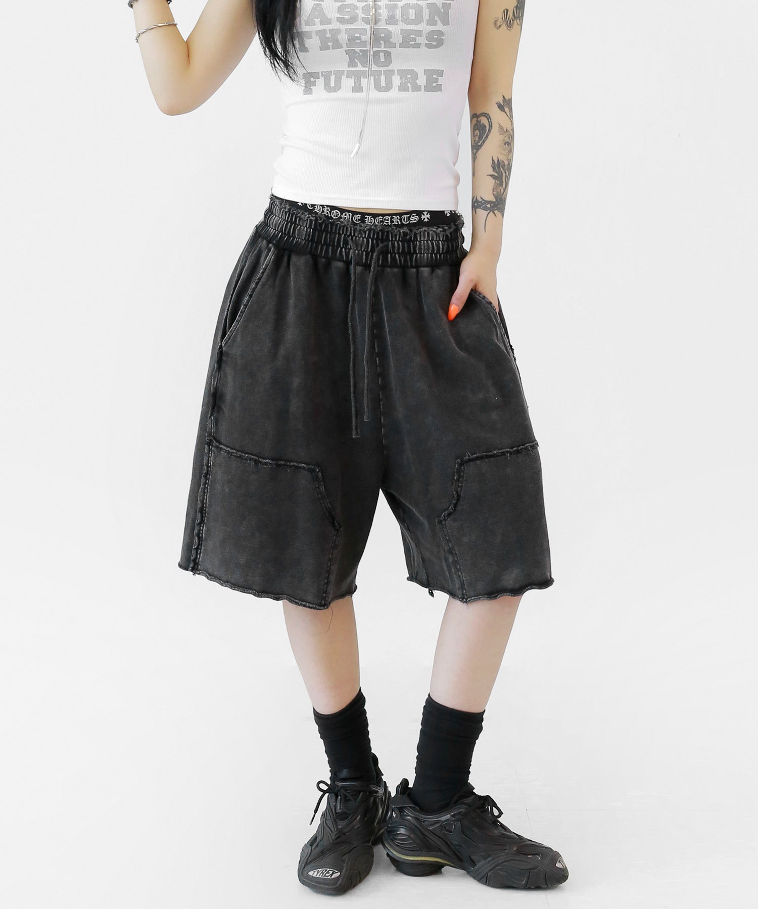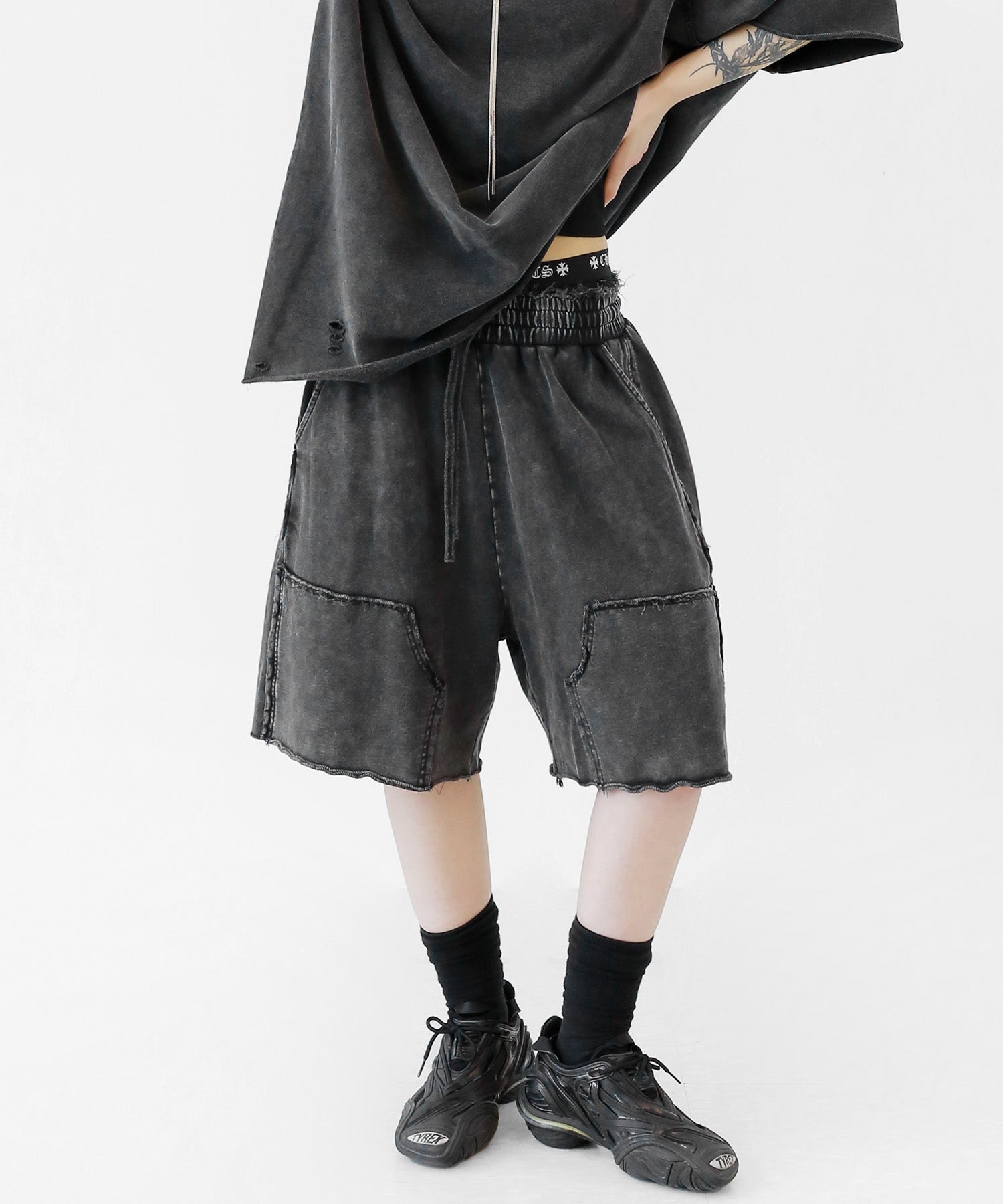 Stay cool and bold in these pigment-washed shorts.Featuring a distressed waistband, vintage fade, and easy elastic waist, they’re perfect for styling solo or as a matching set. Laid-back comfort with street-ready edge.