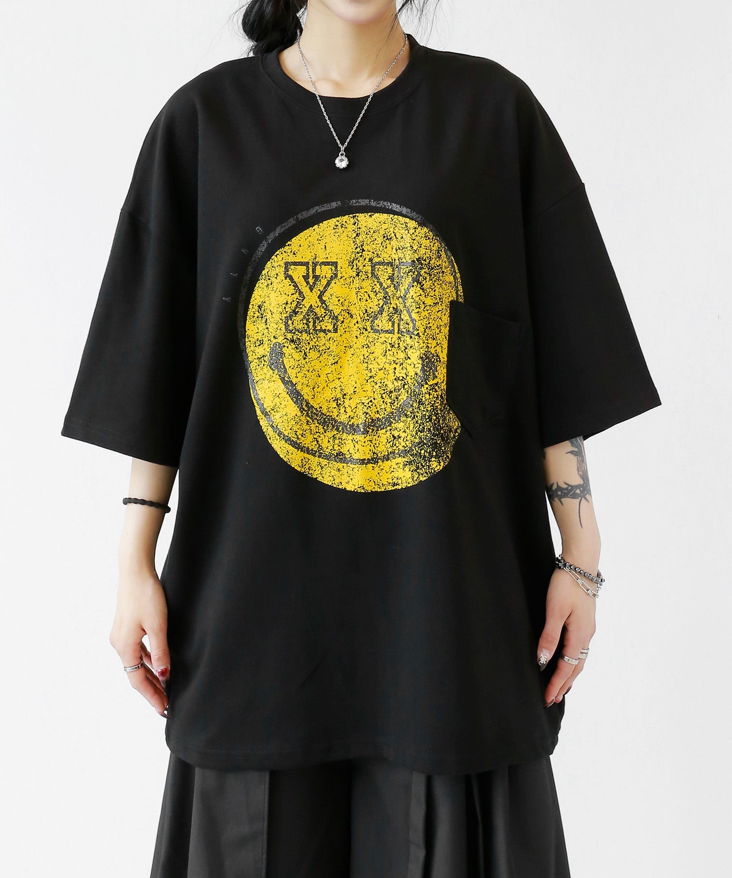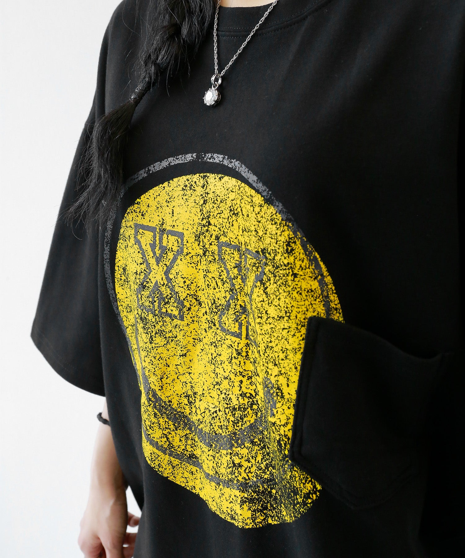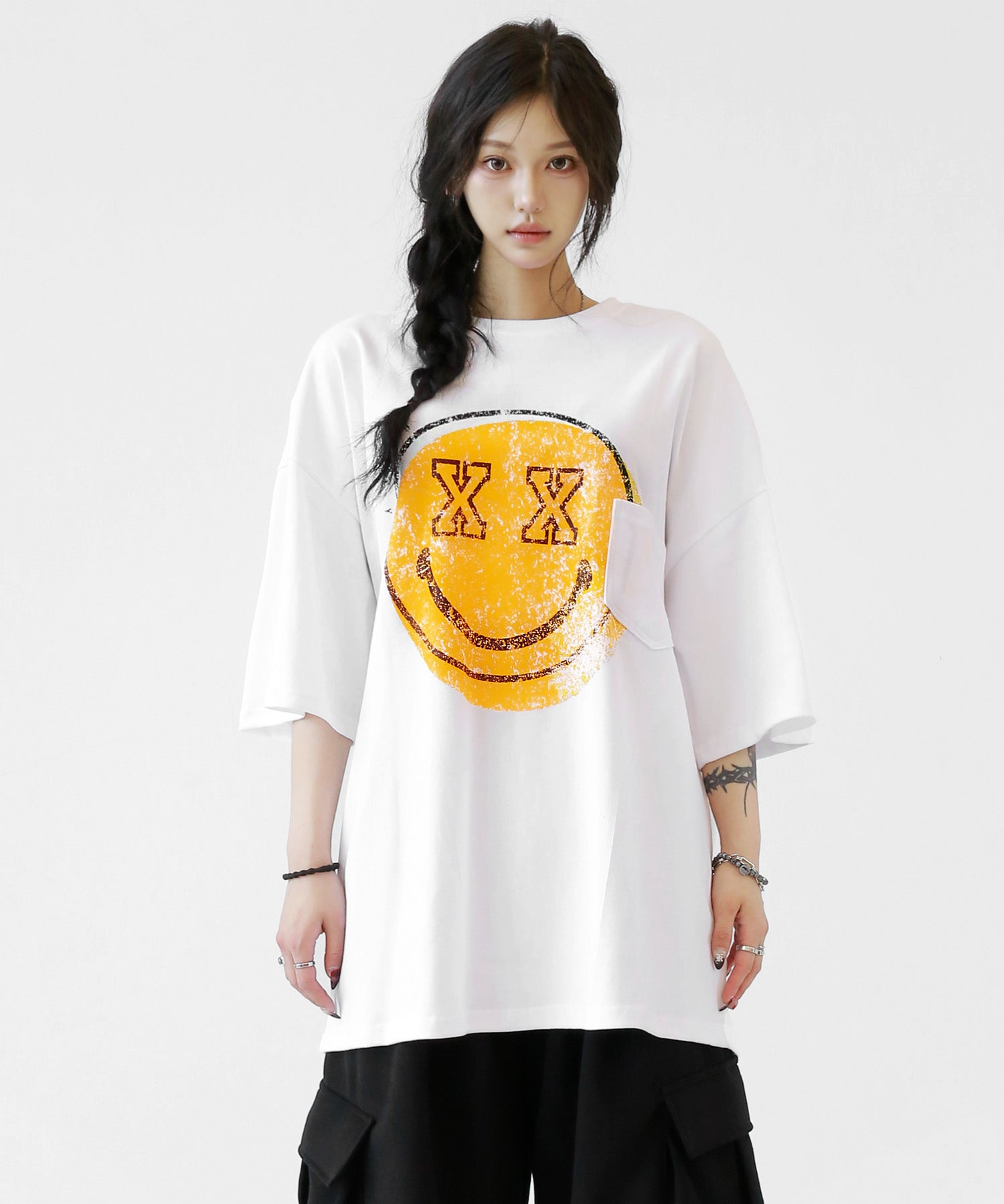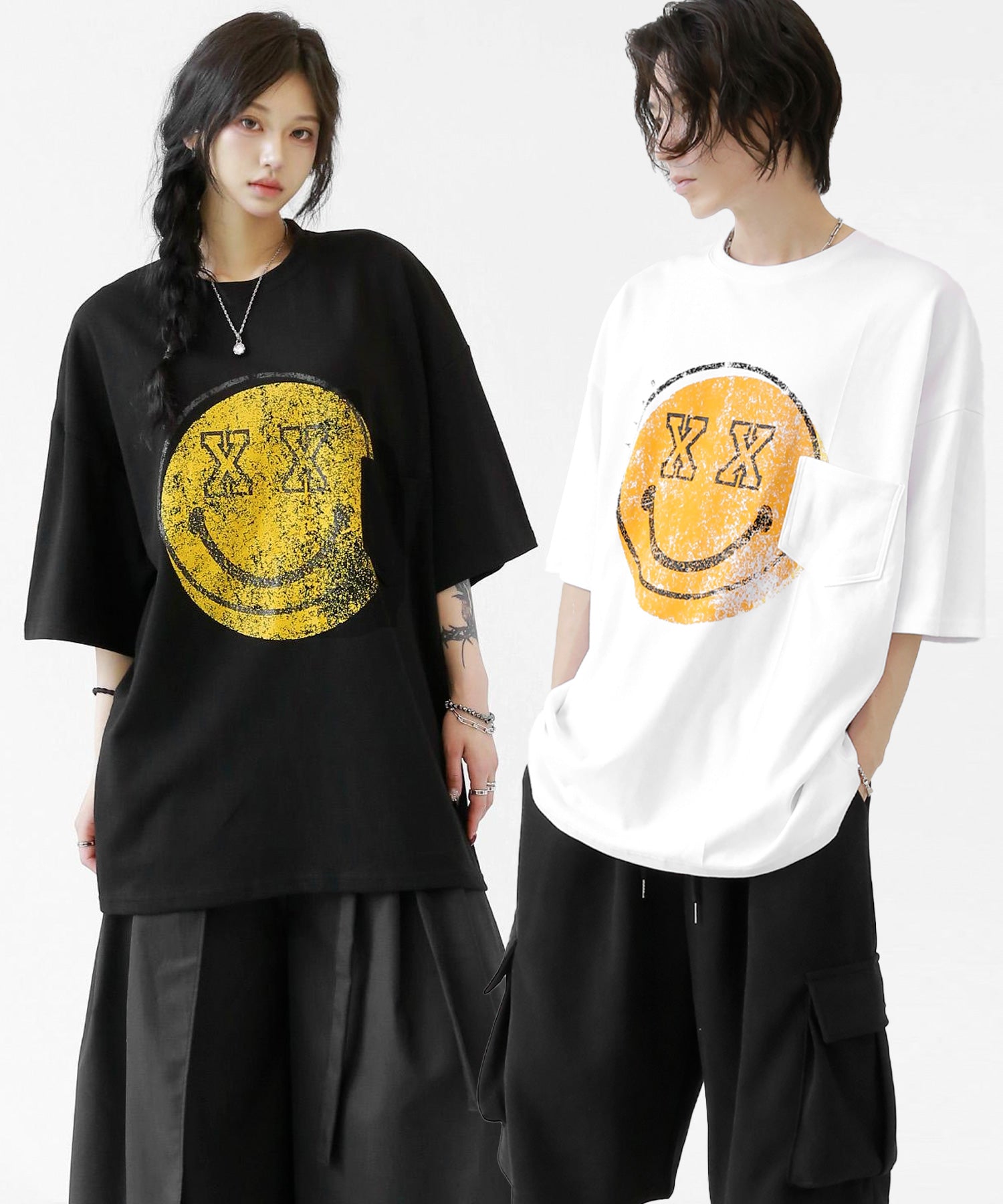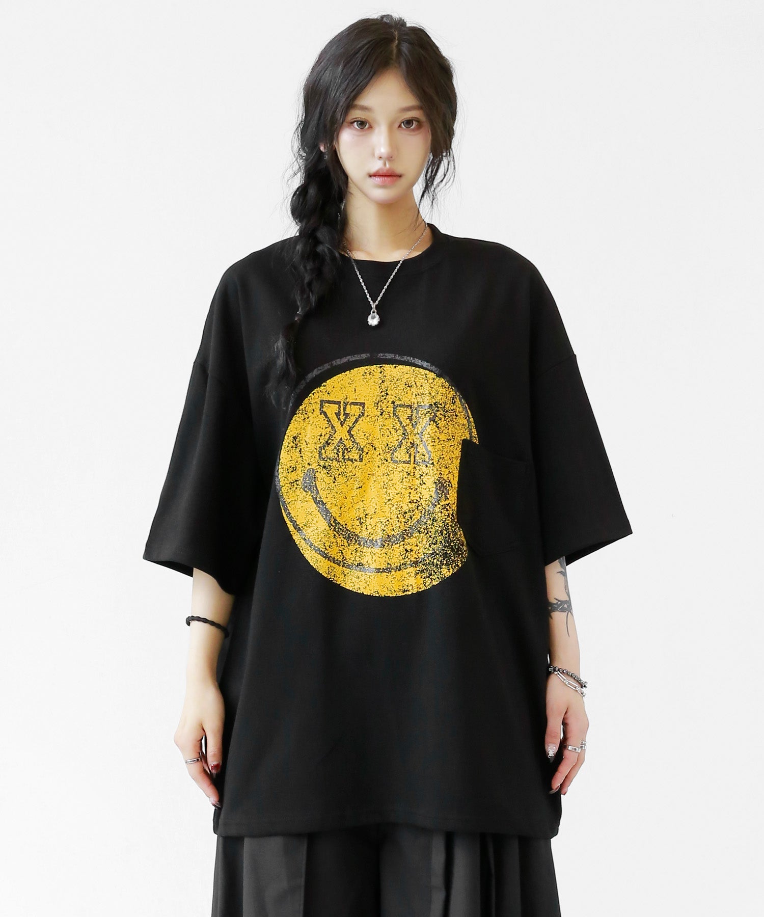 Vintage-style oversized tee with a faded smile graphic and front pocket.