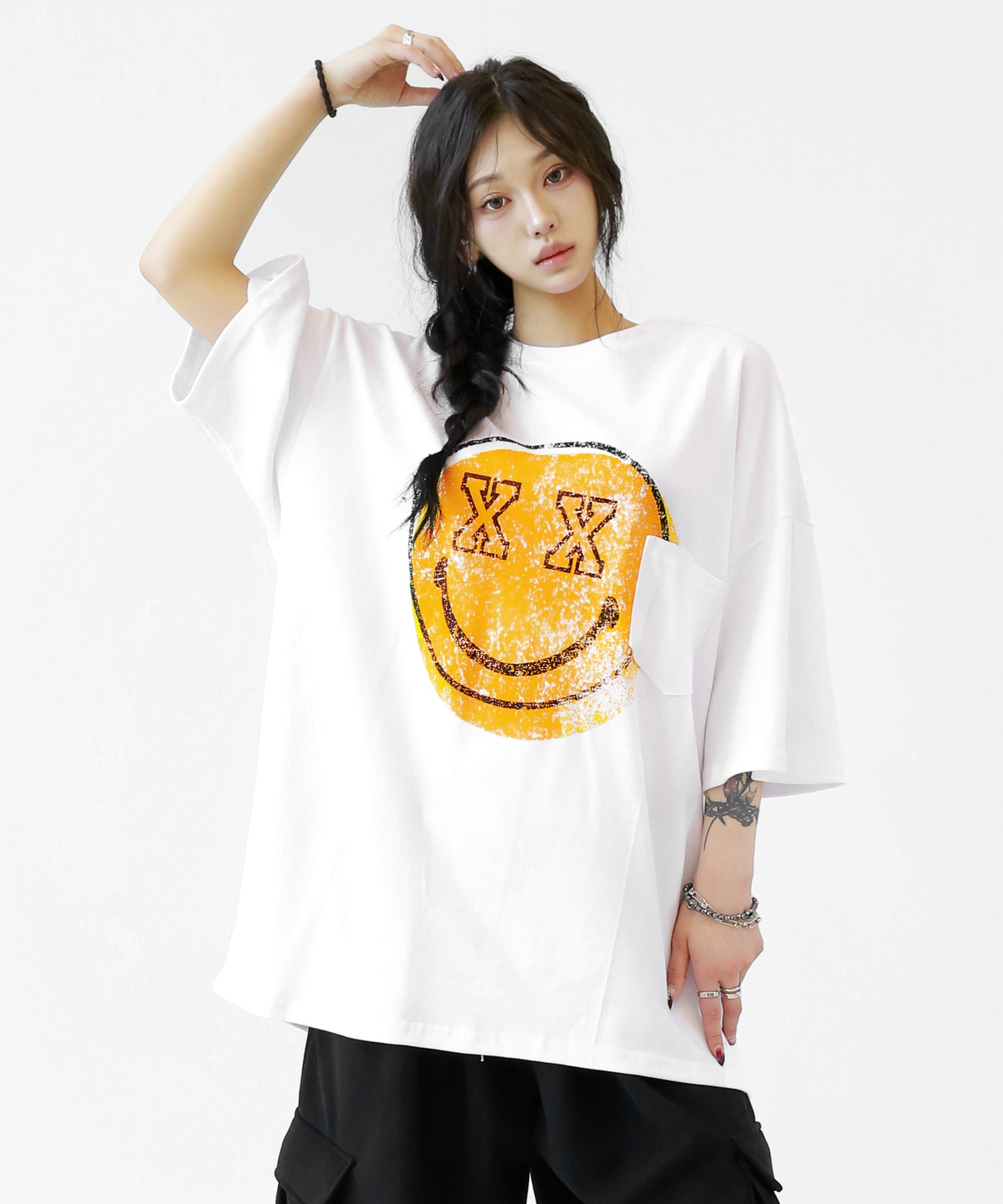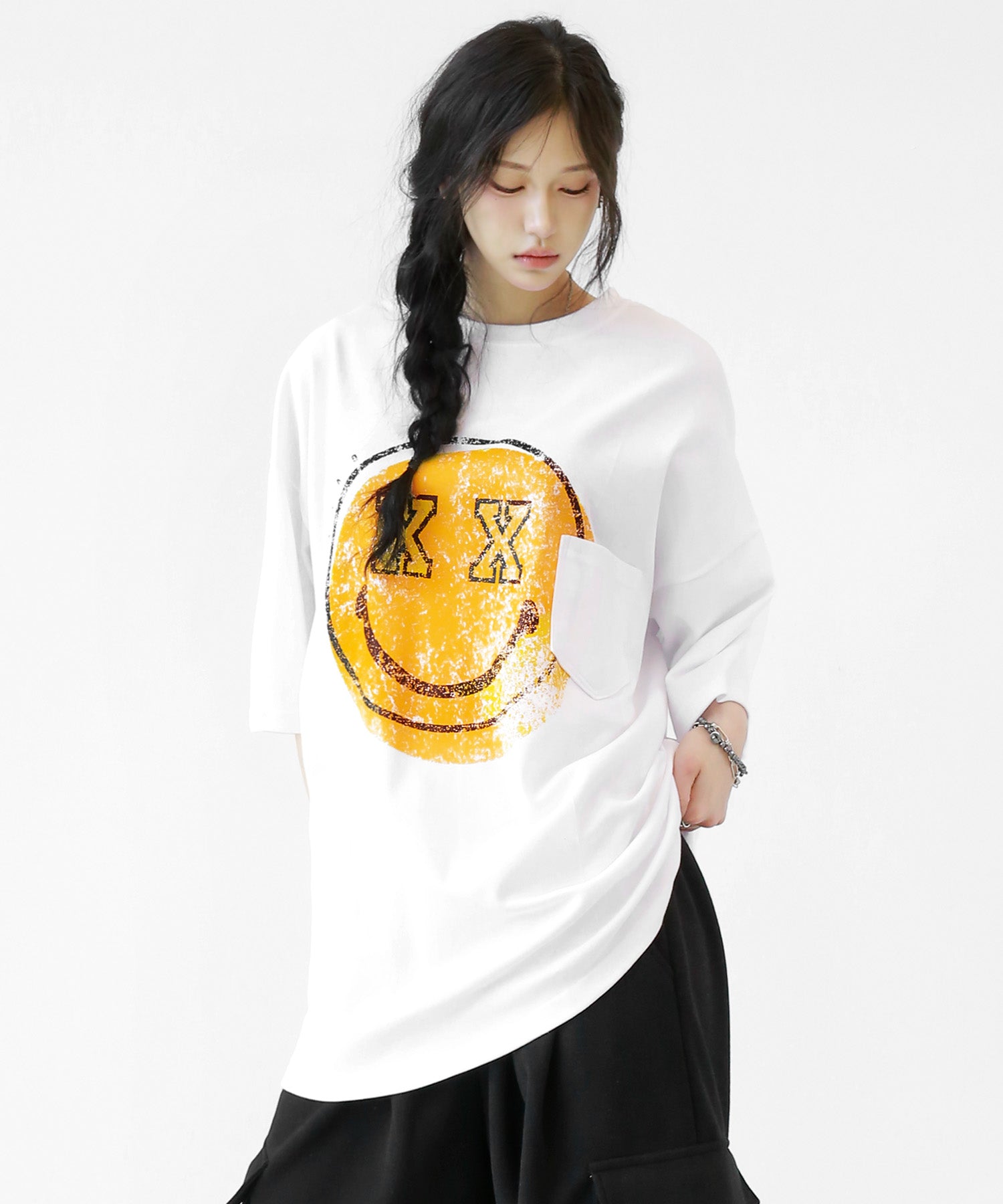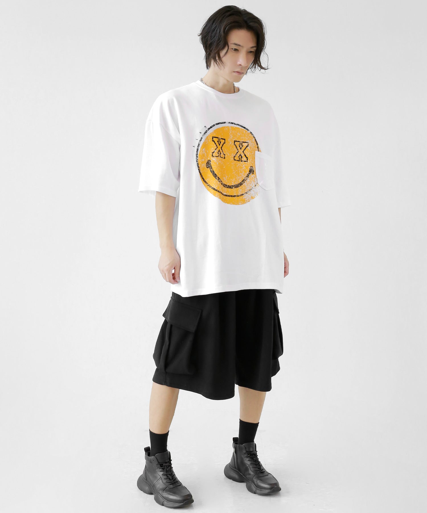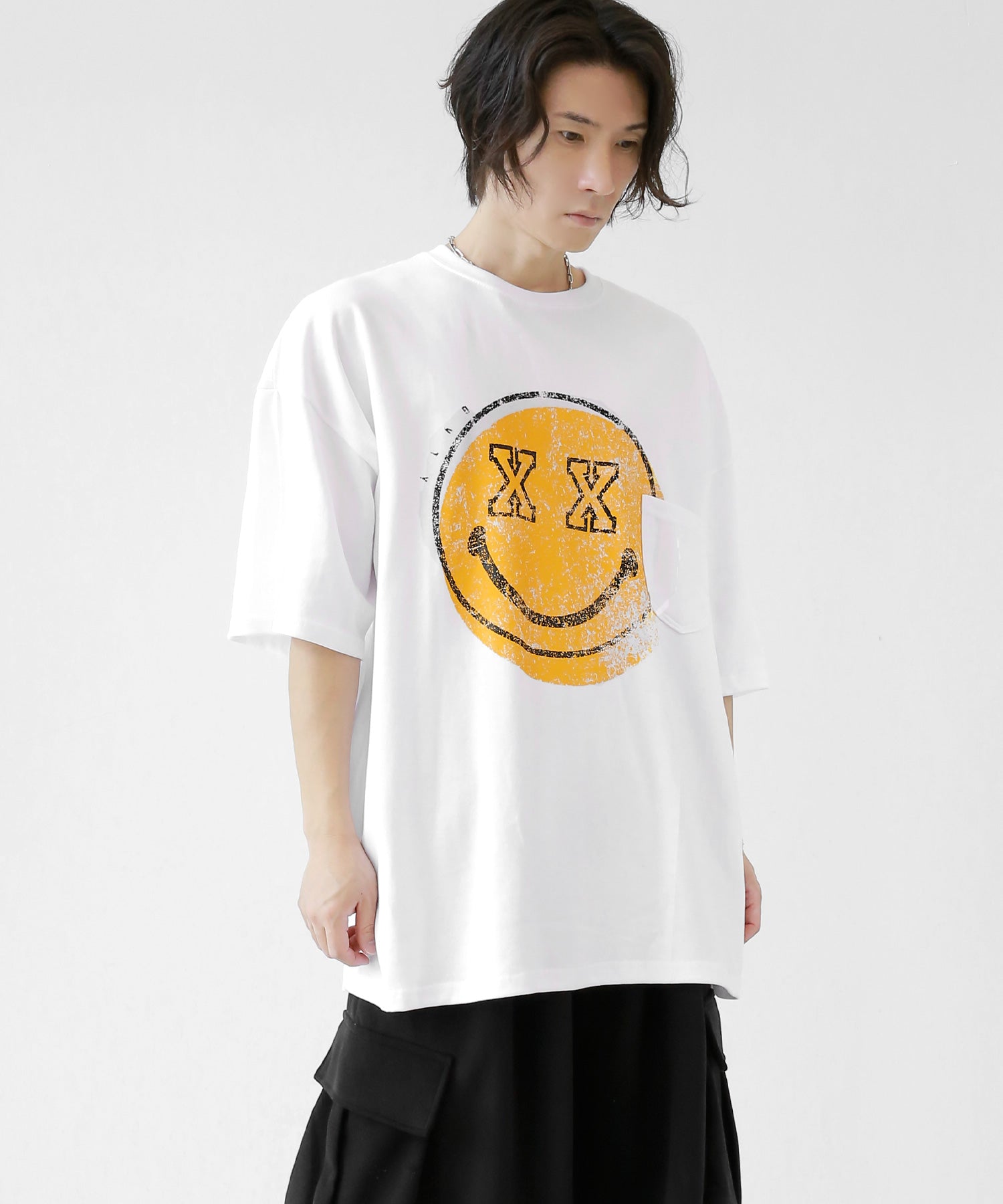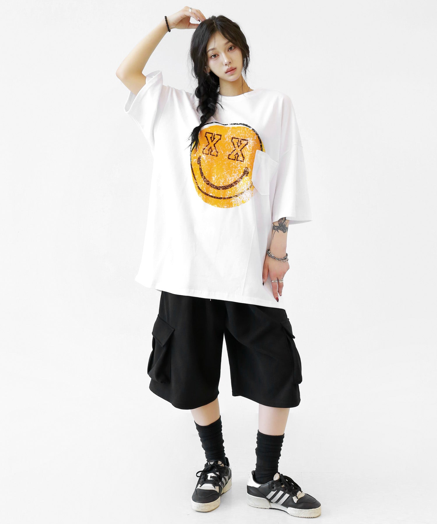 Vintage-style oversized tee with a faded smile graphic and front pocket.