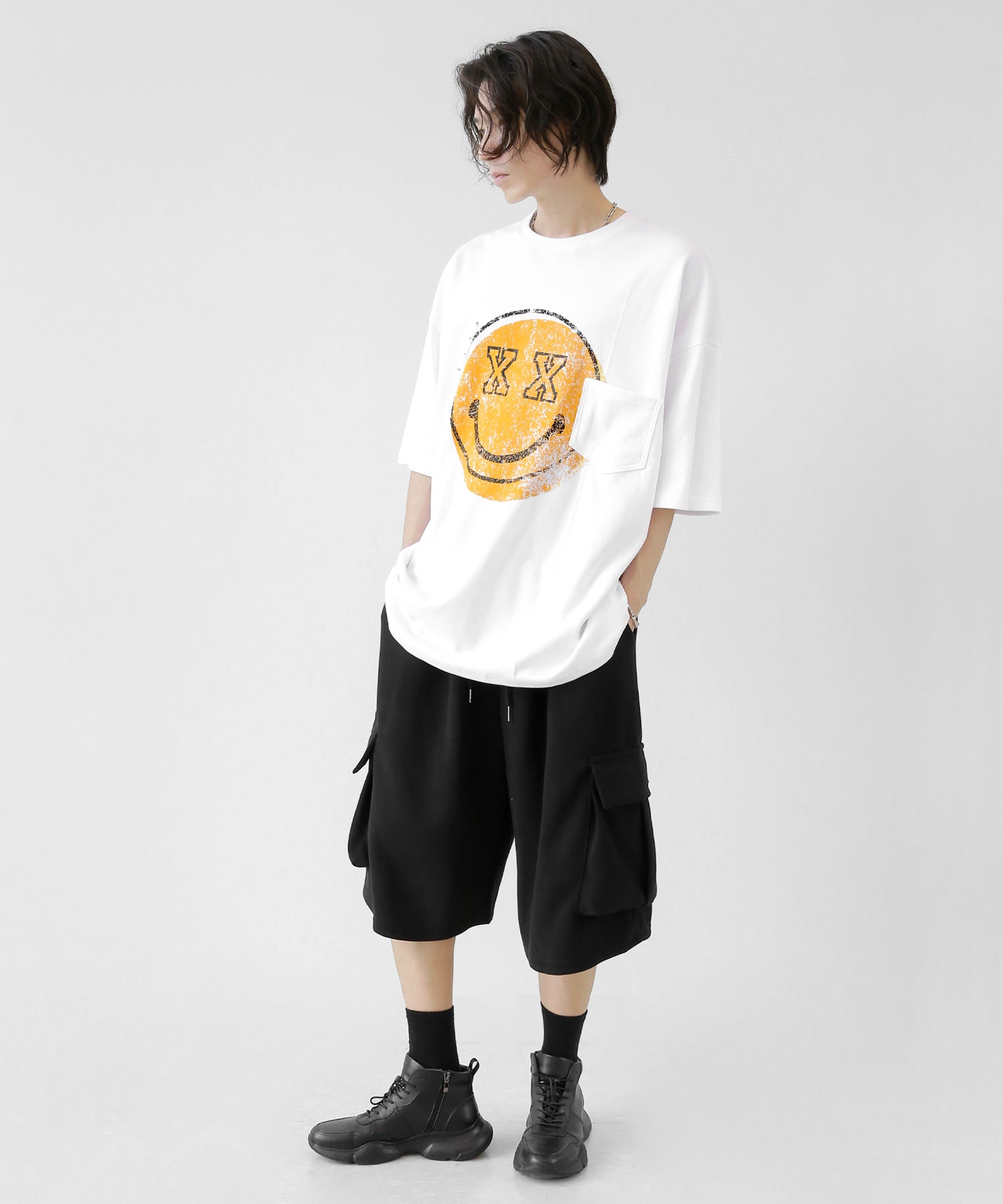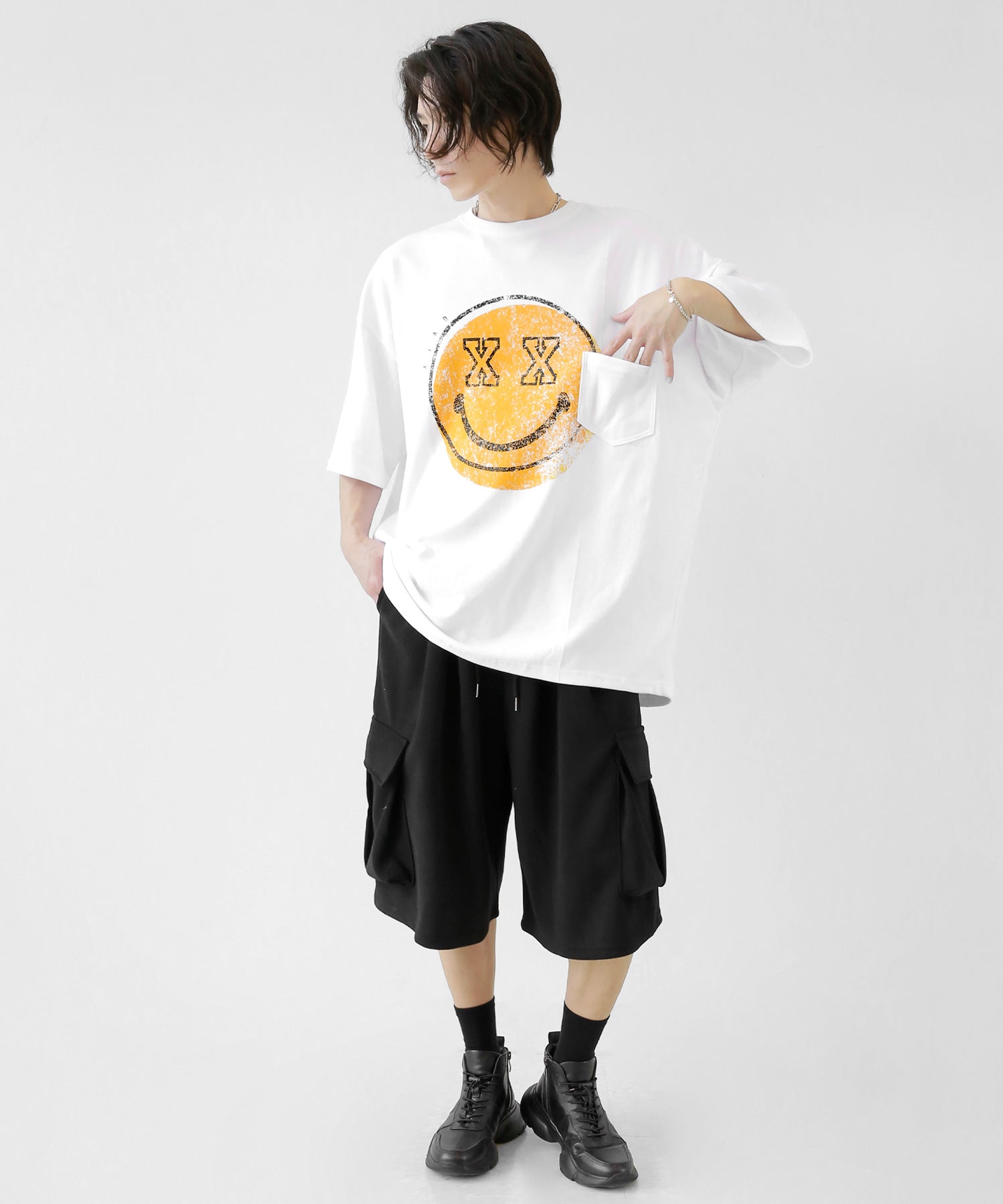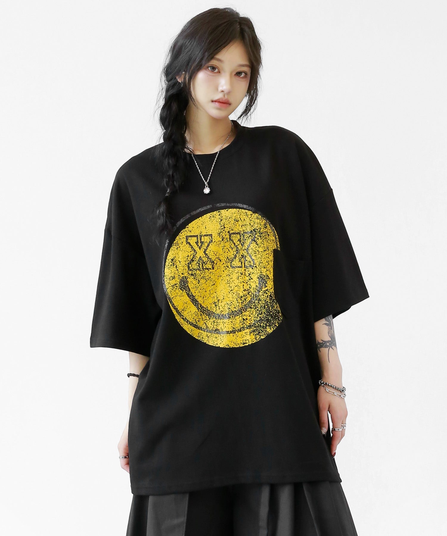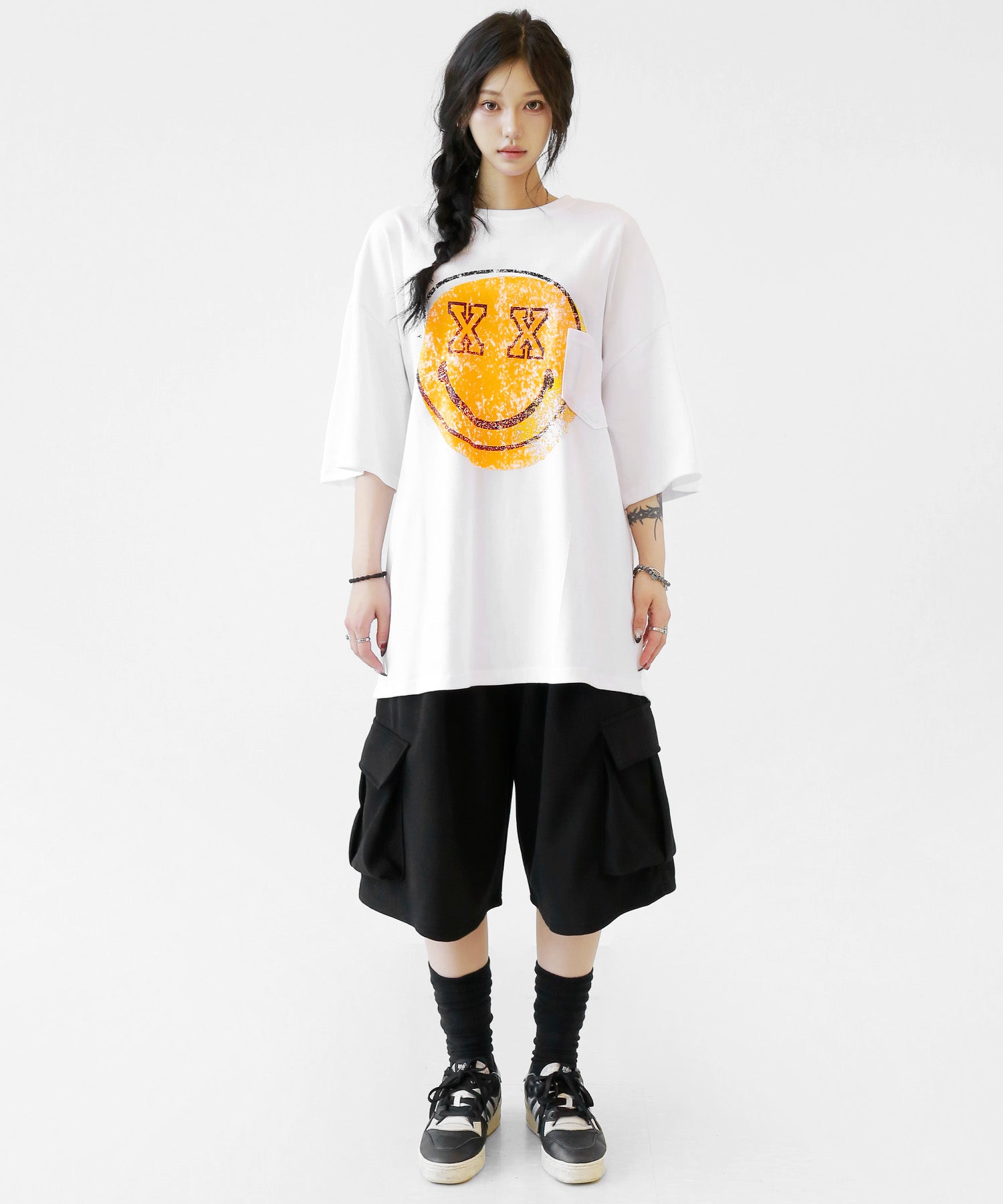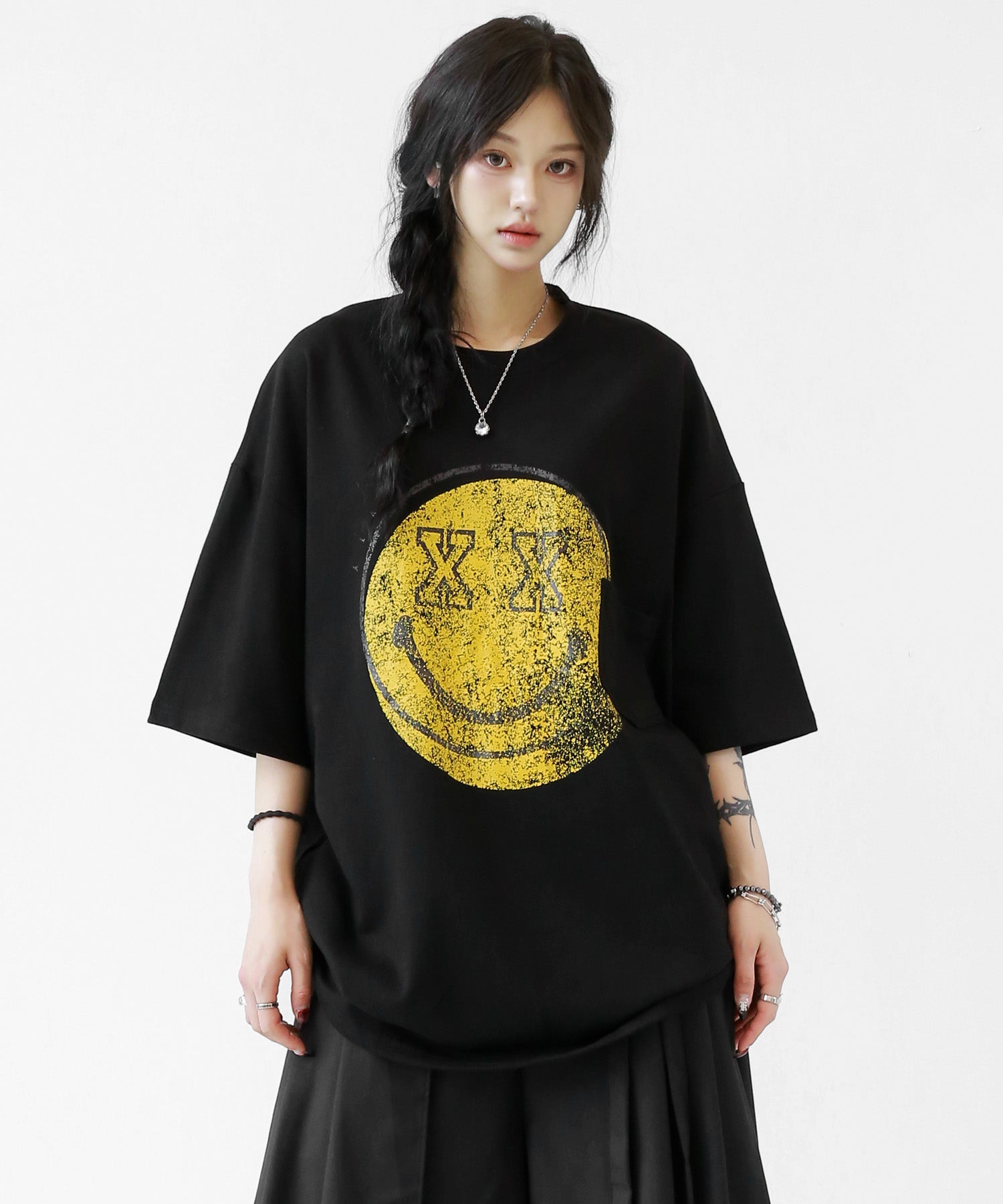 Vintage-style oversized tee with a faded smile graphic and front pocket.