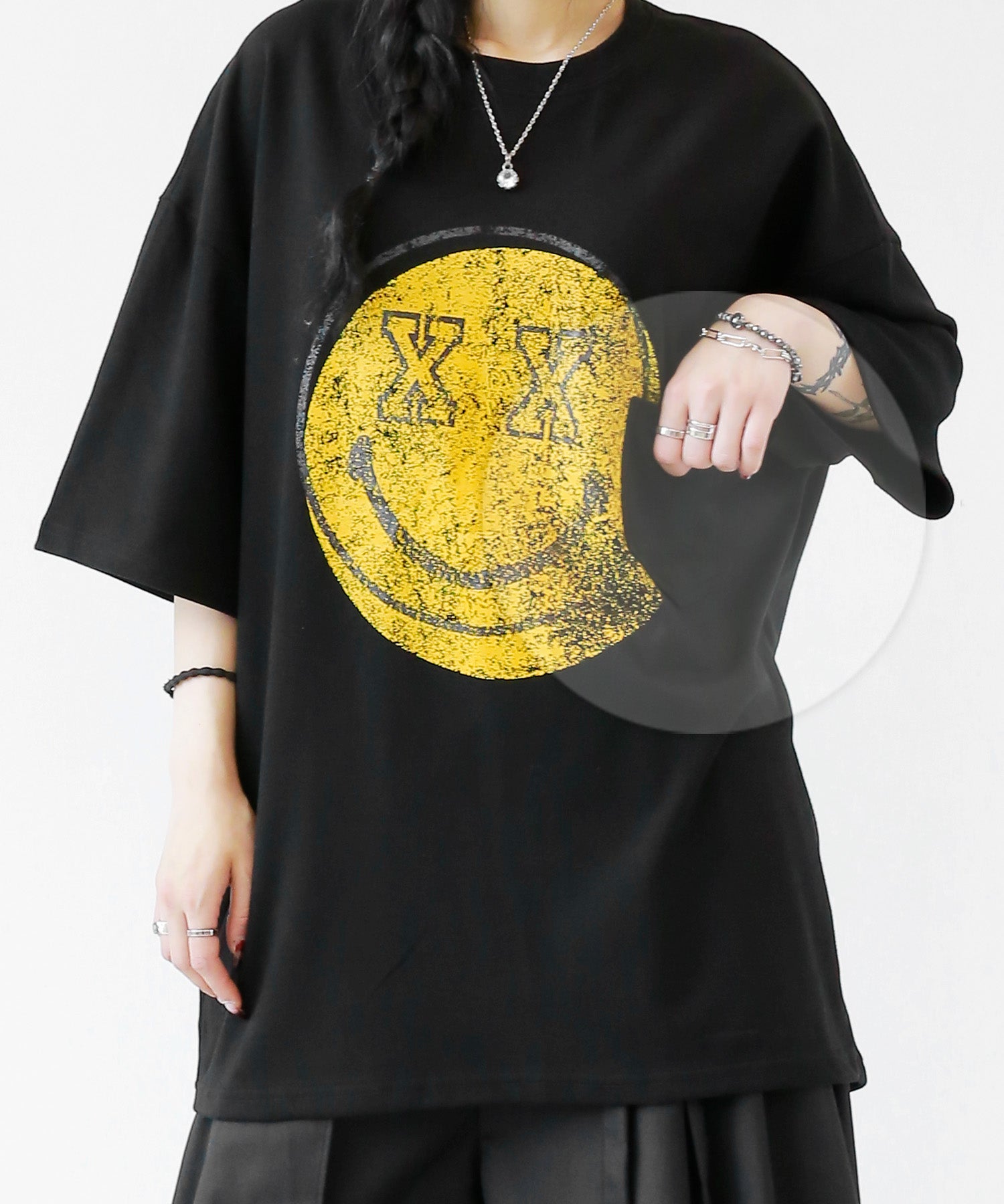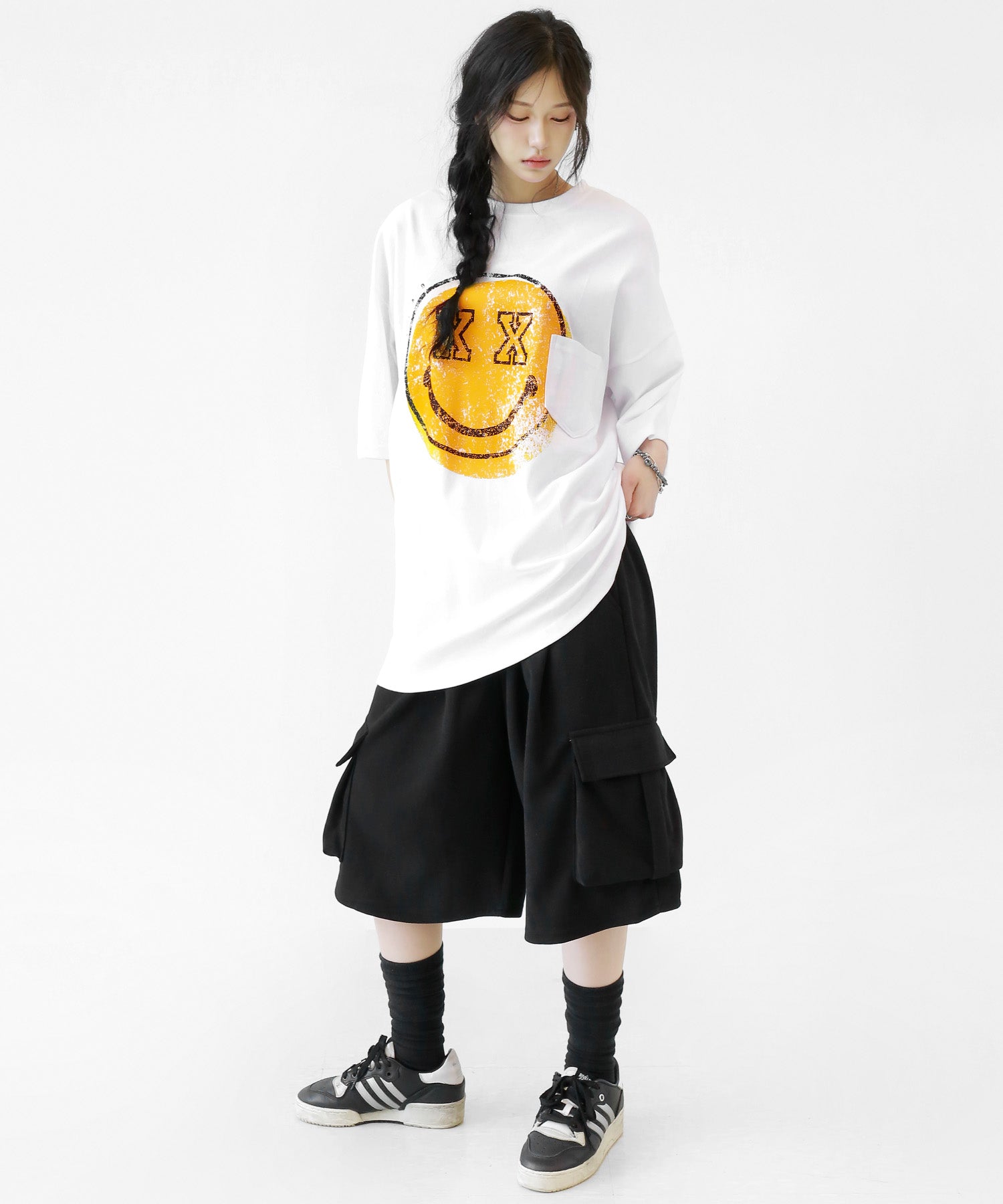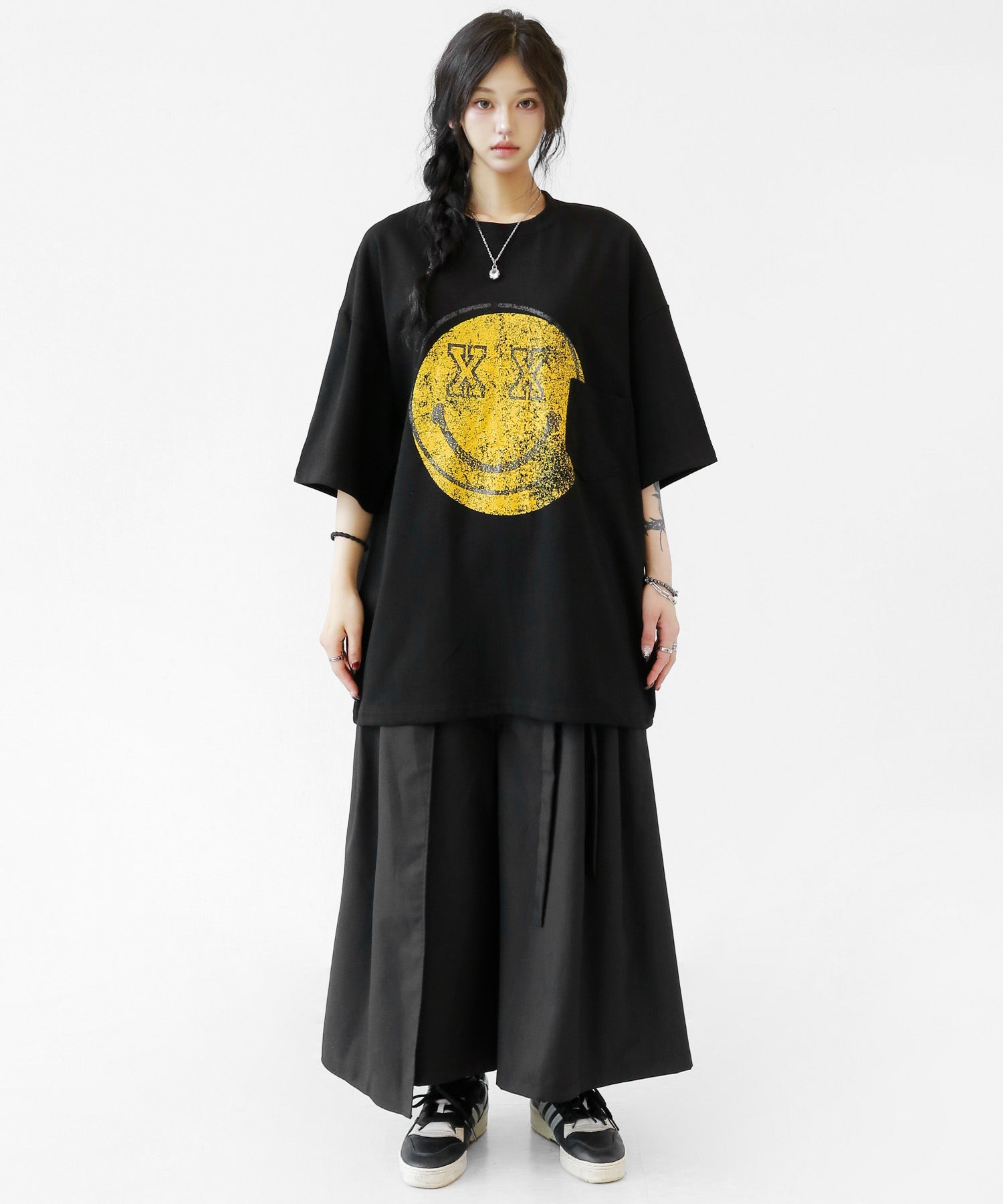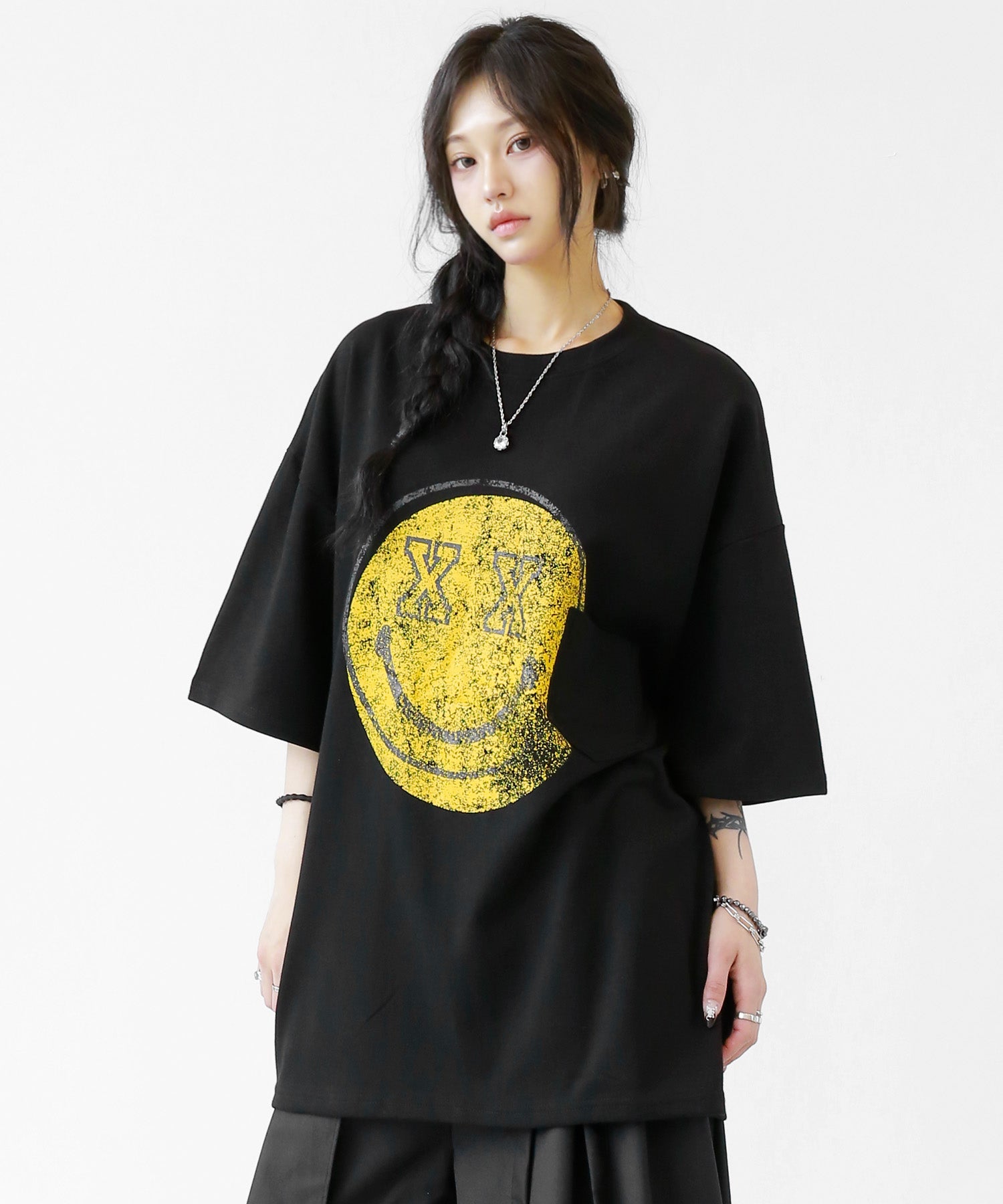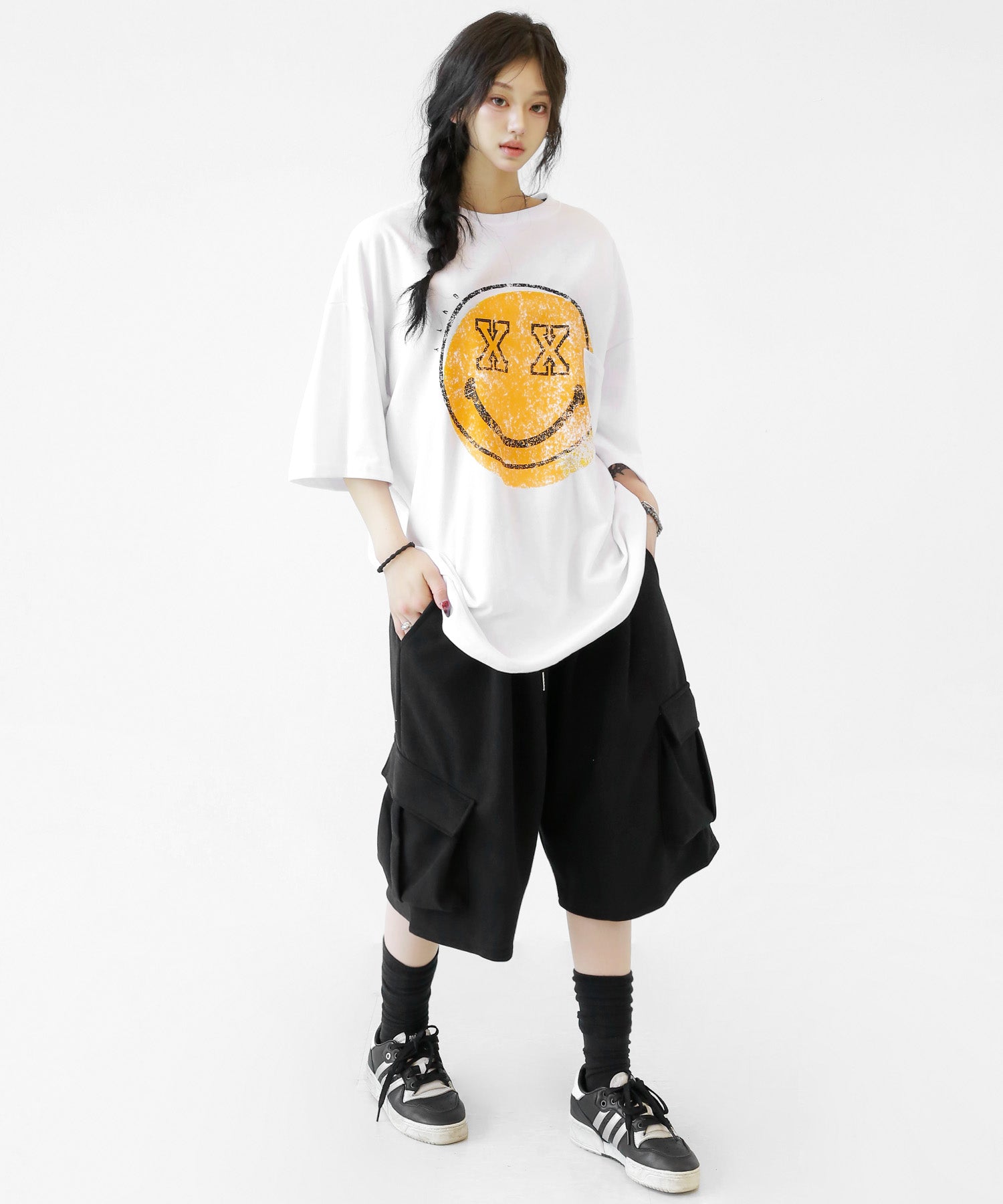 Vintage-style oversized tee with a faded smile graphic and front pocket.
