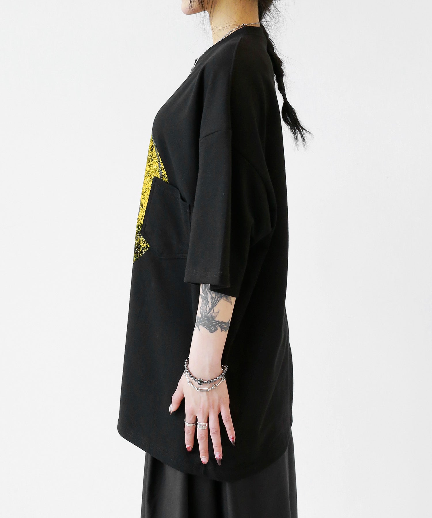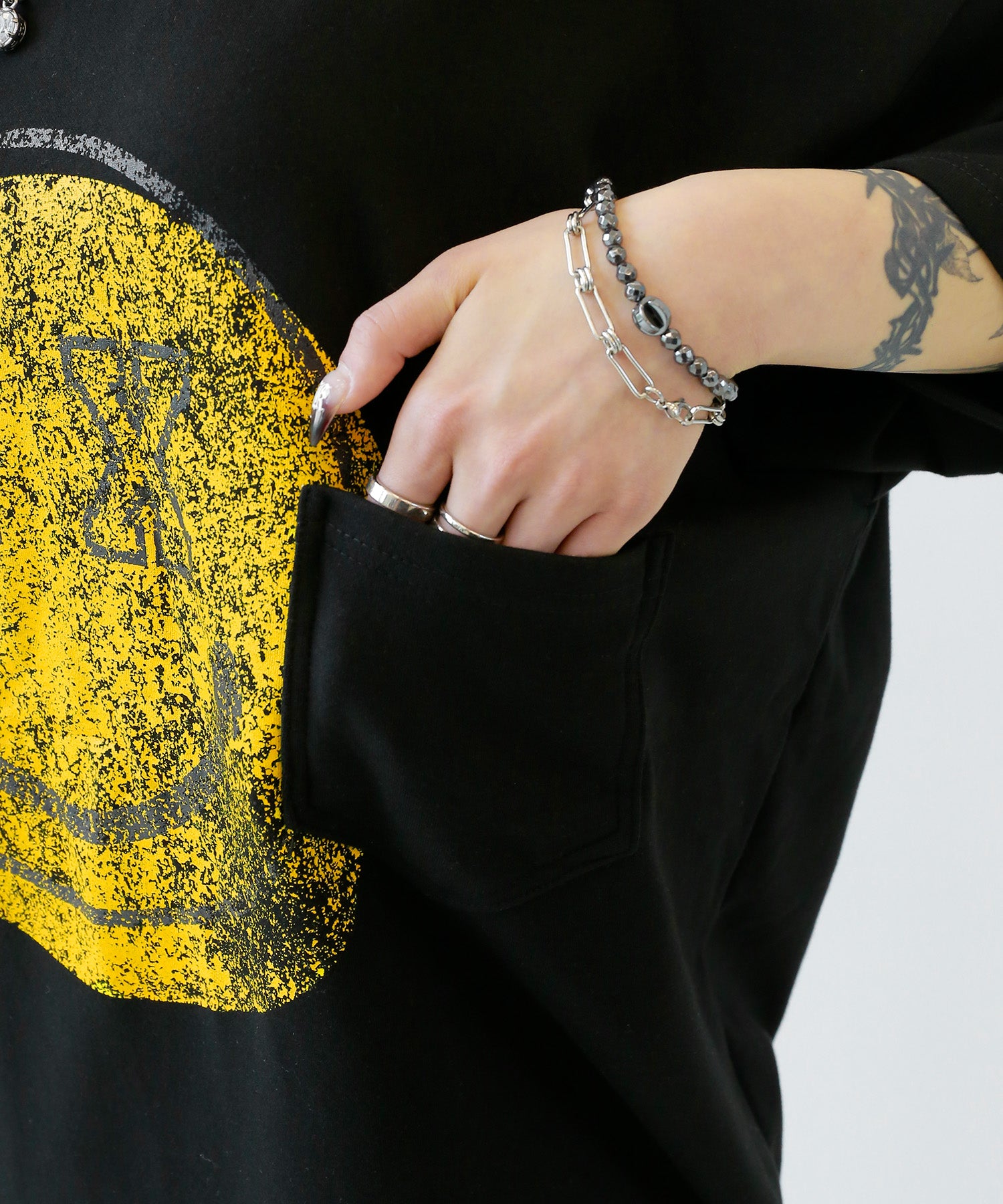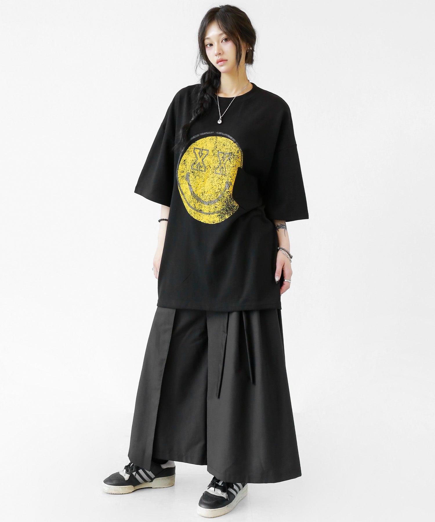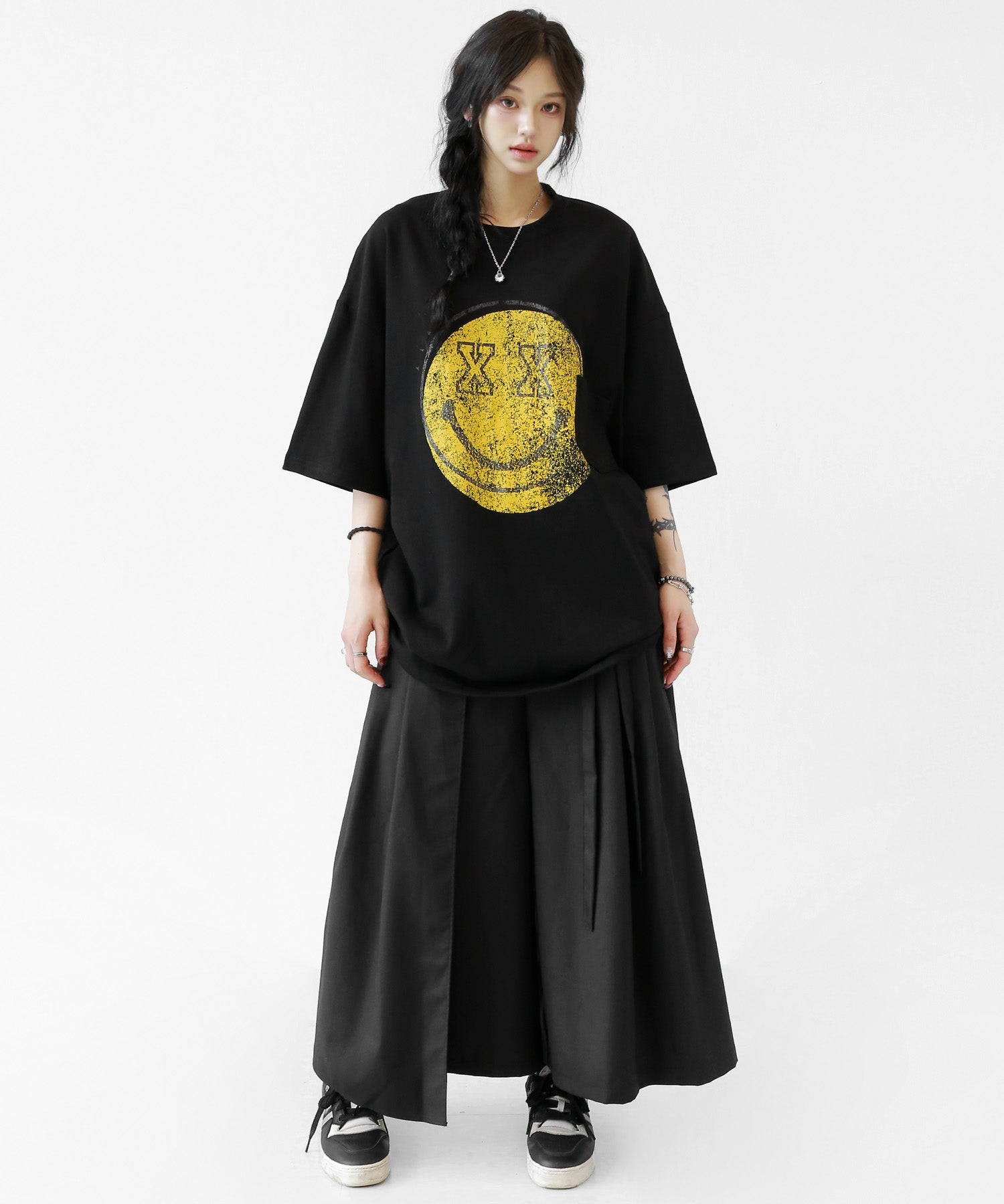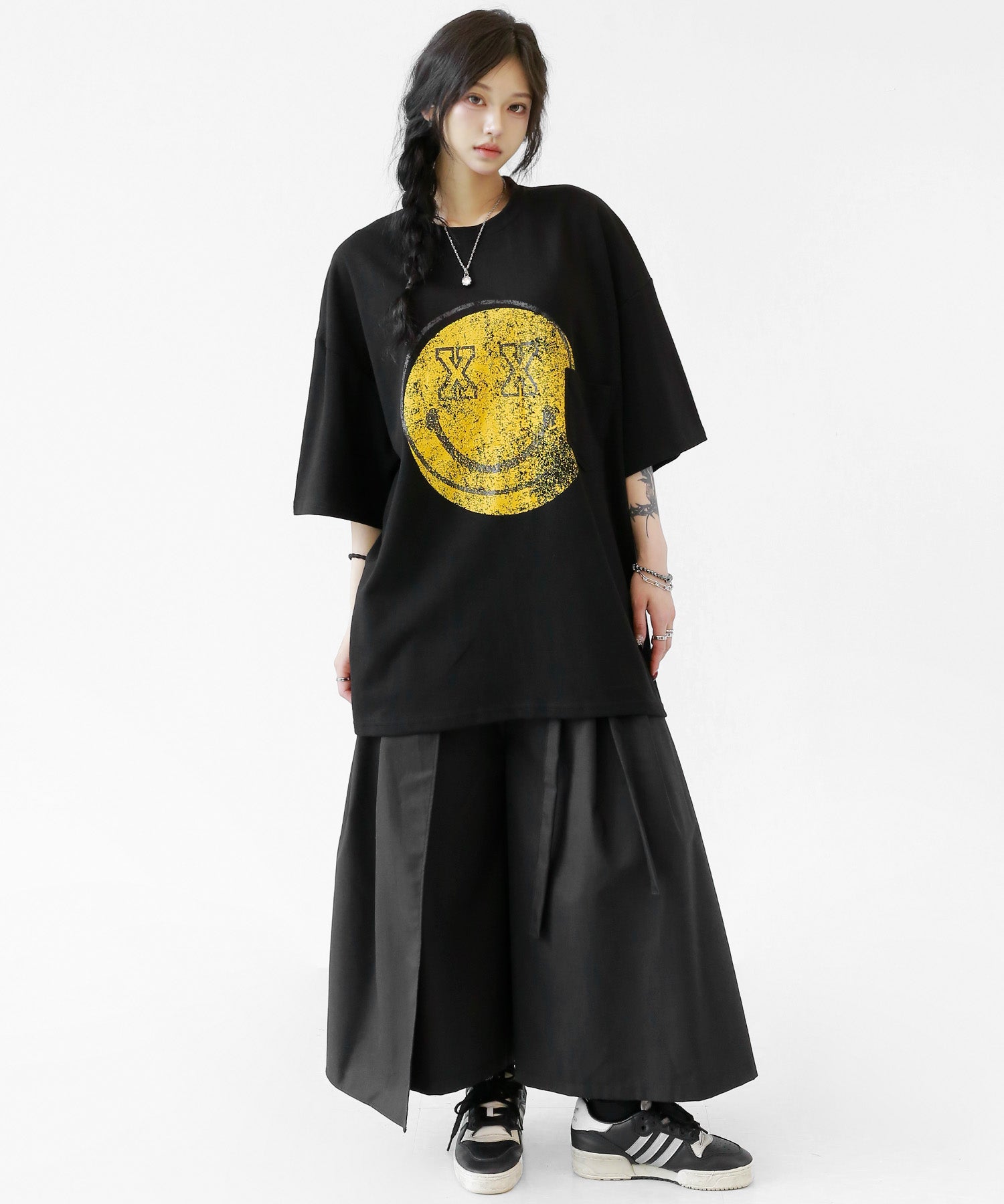 Vintage-style oversized tee with a faded smile graphic and front pocket.