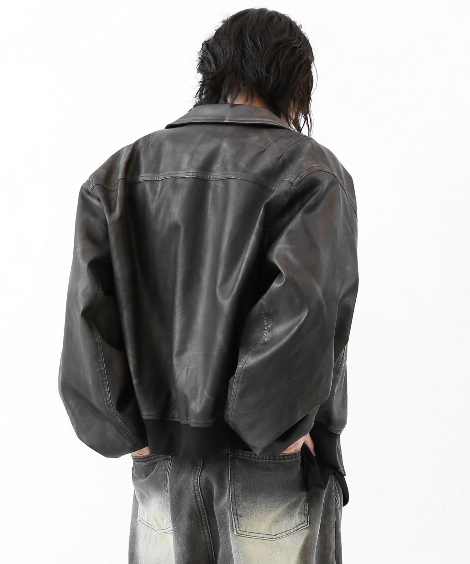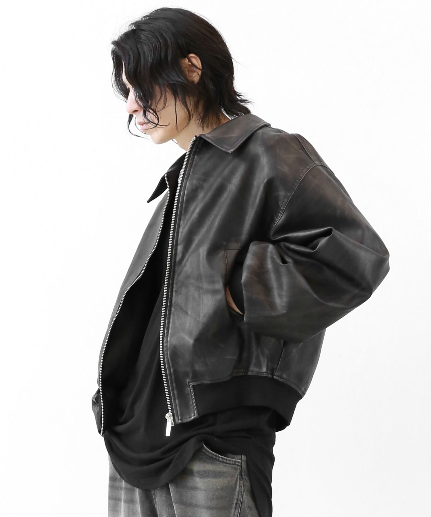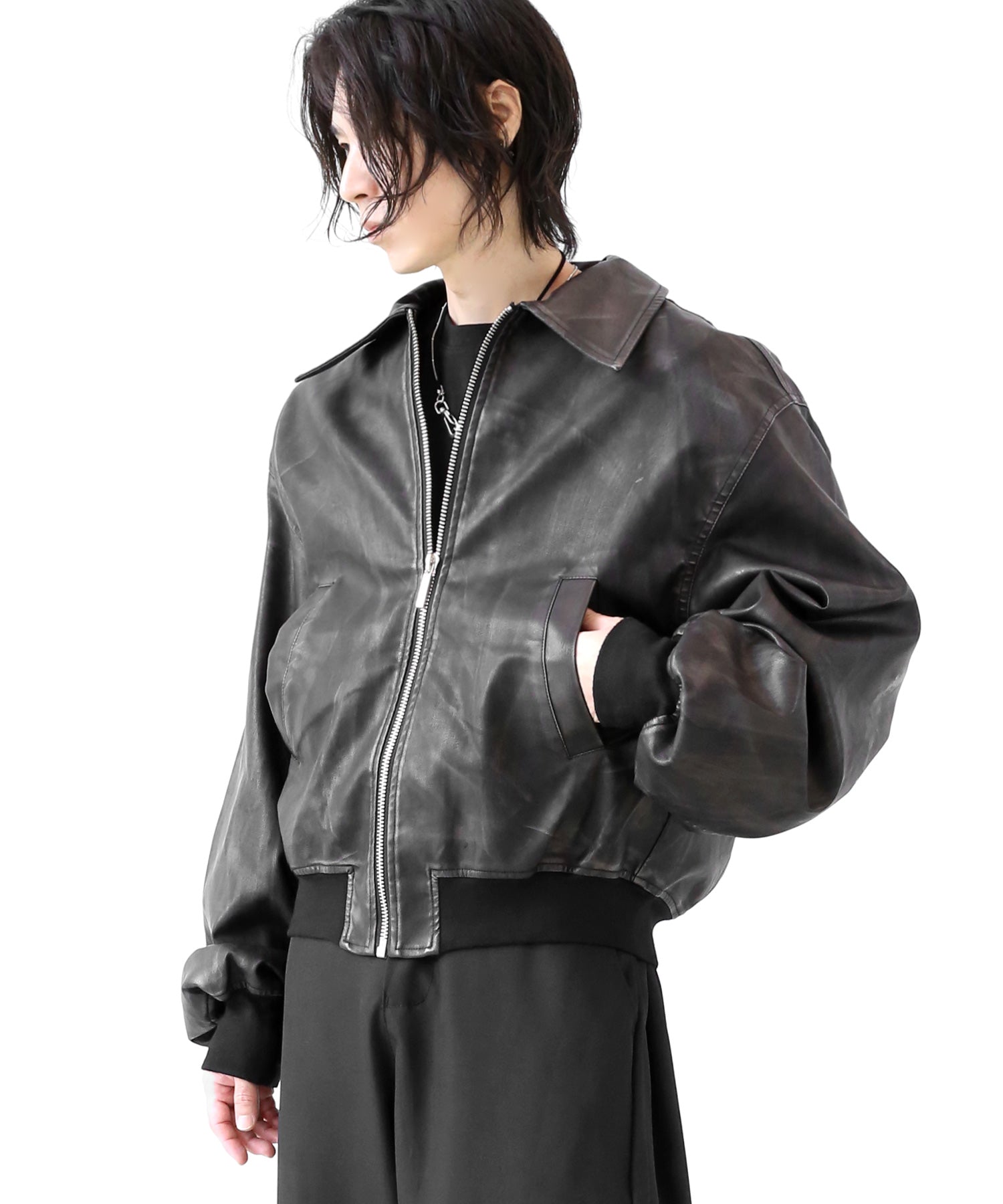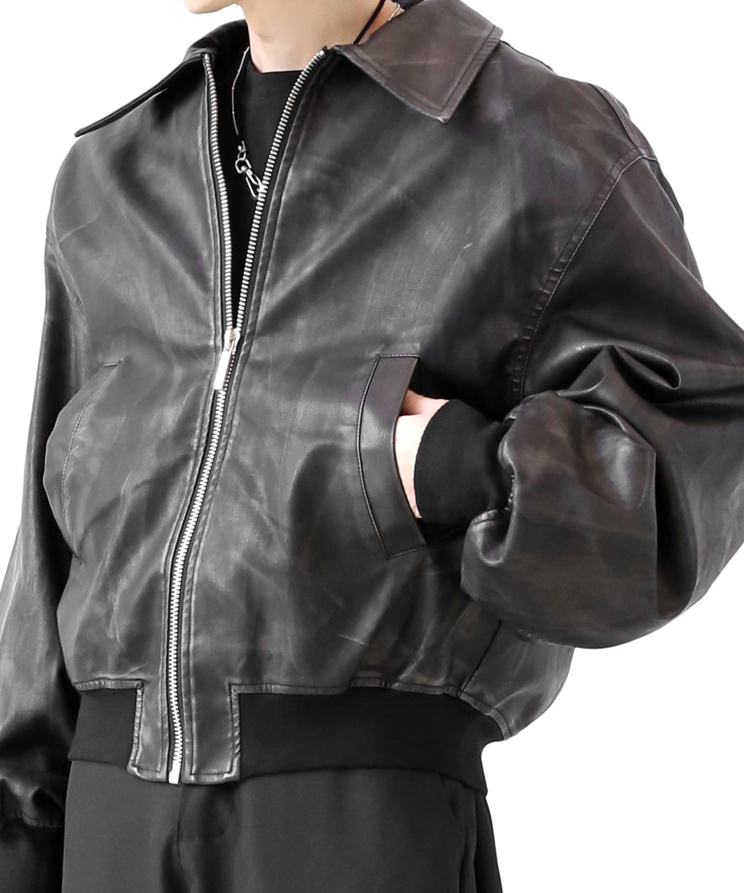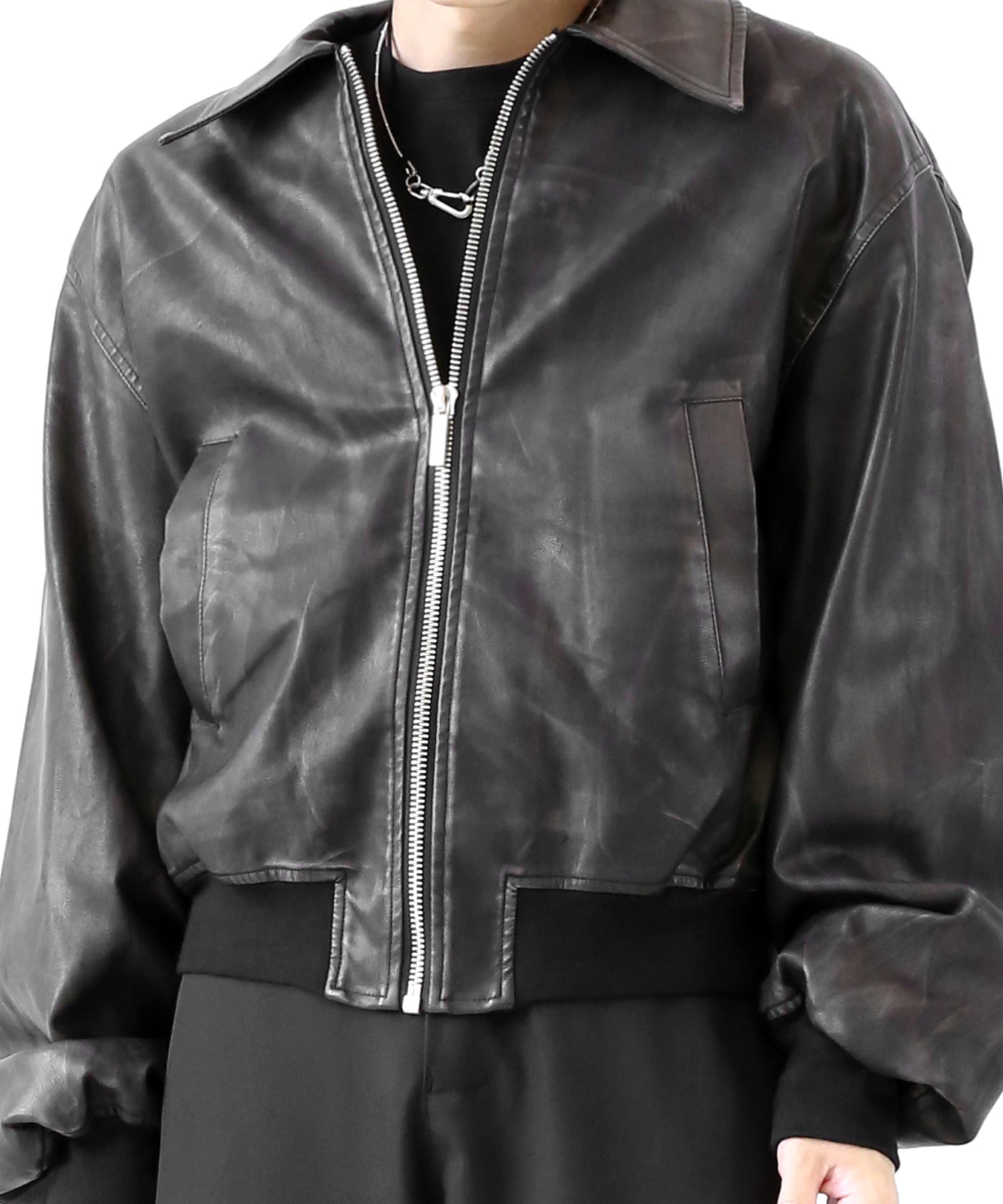 A washed faux leather blouson featuring subtle vintage texture and a compact short length.